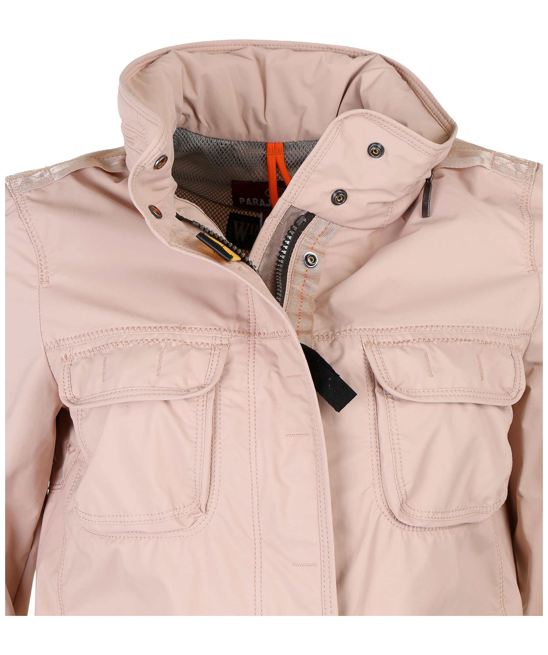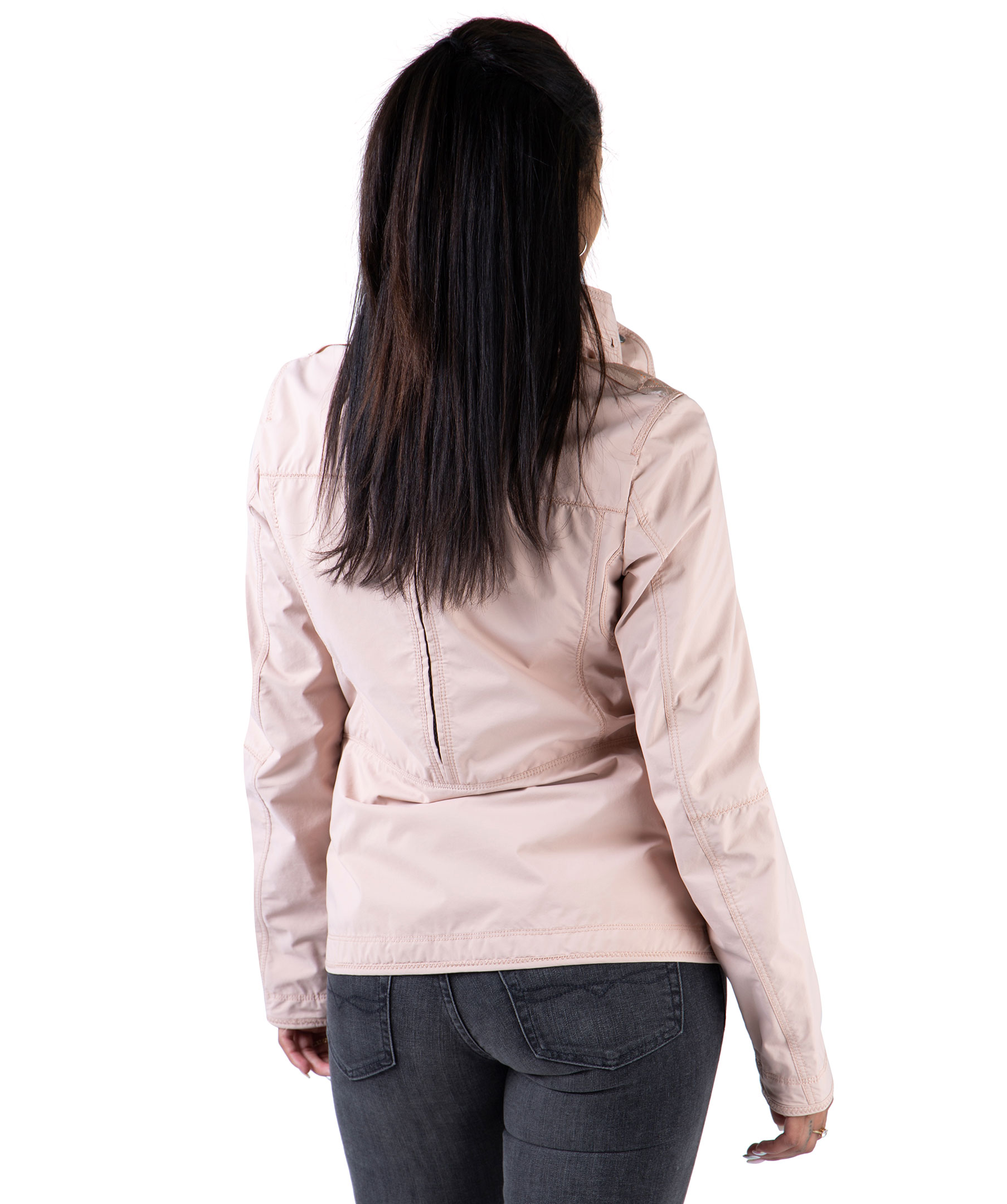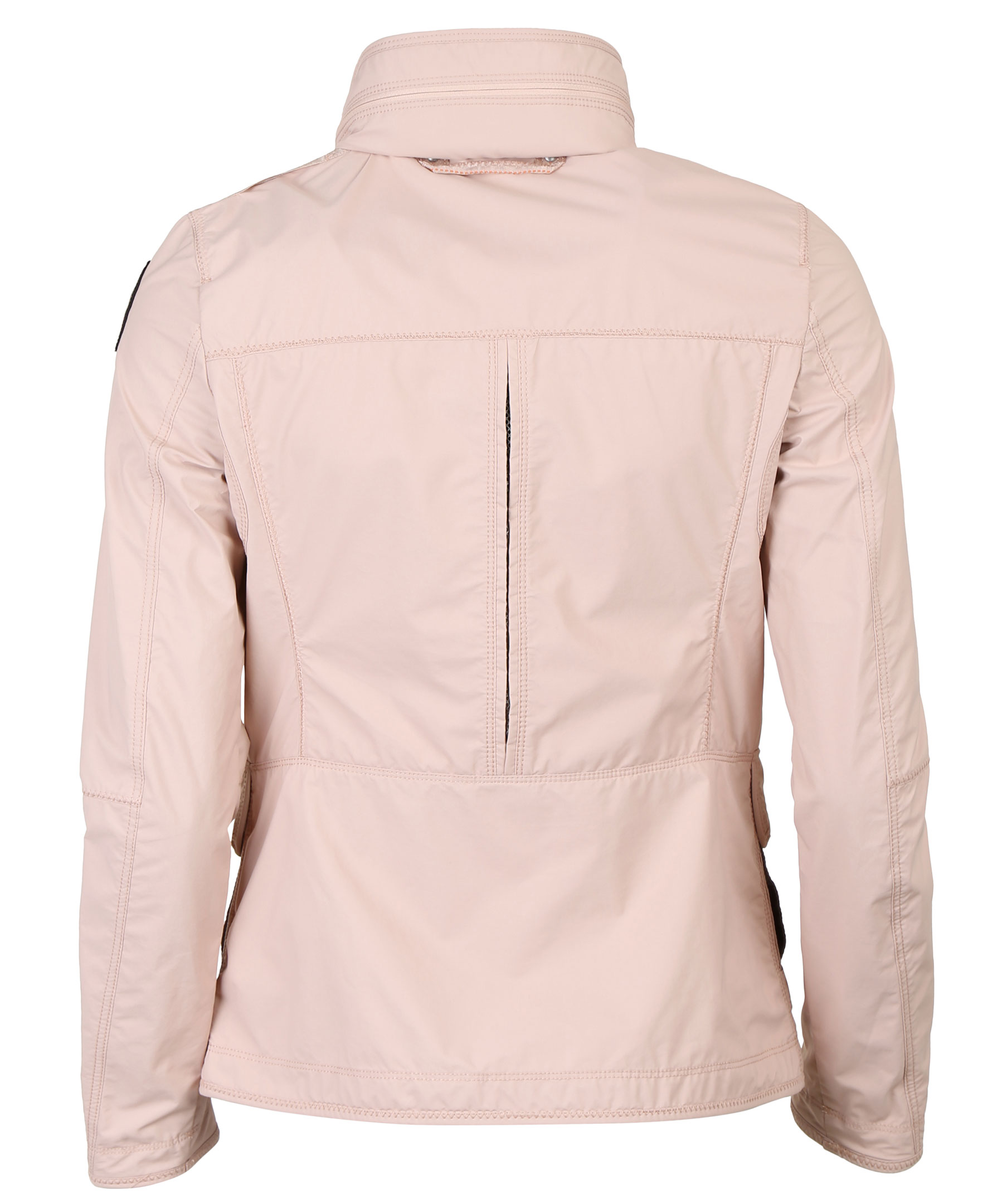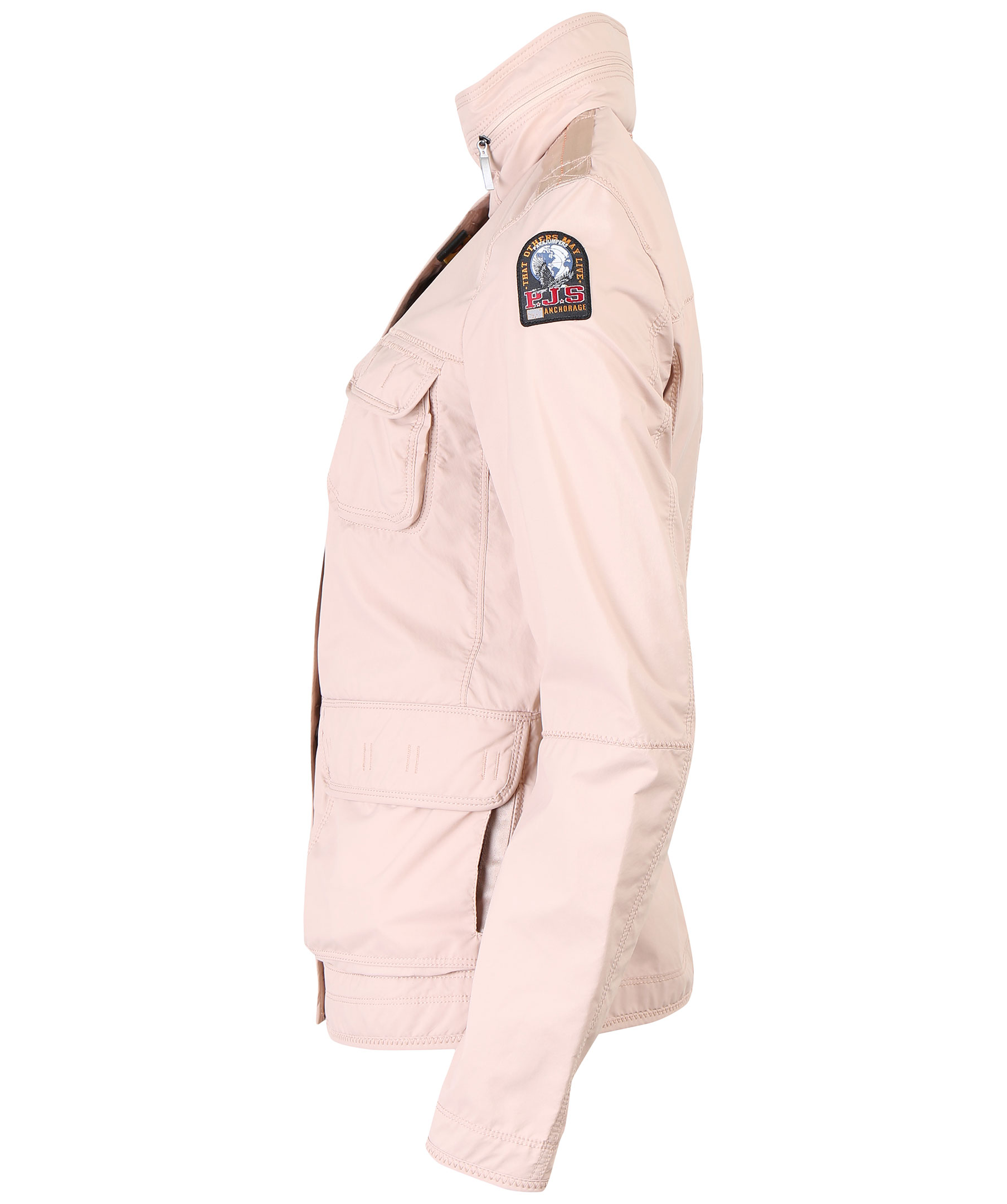 Rosa, tunn vårjacka från Parajumpers. Många praktiska fickor, dold luva i kragen, dragsko i midjan och patch på vänster ärm. Modellen är 164 cm lång och bär storlek S.