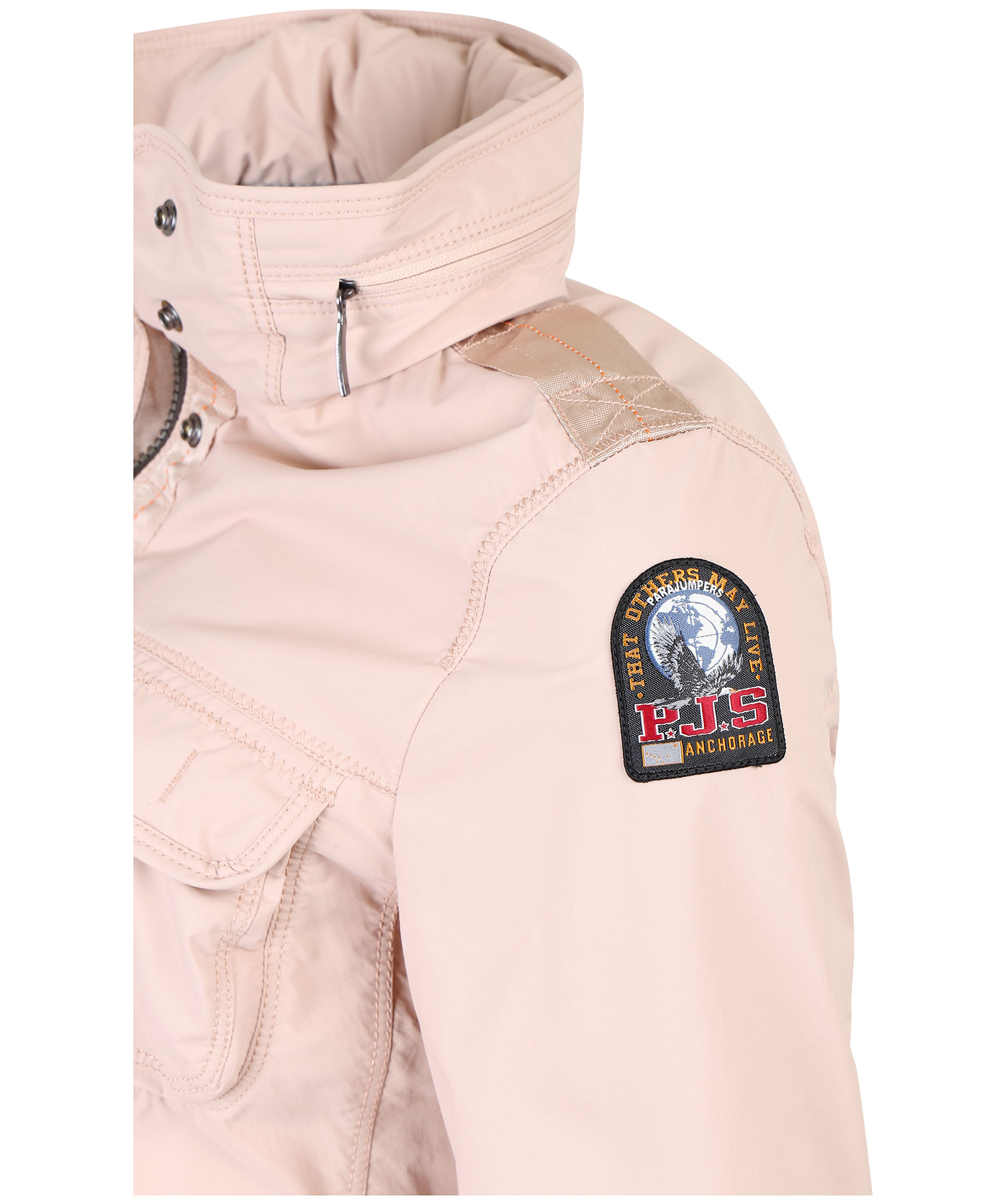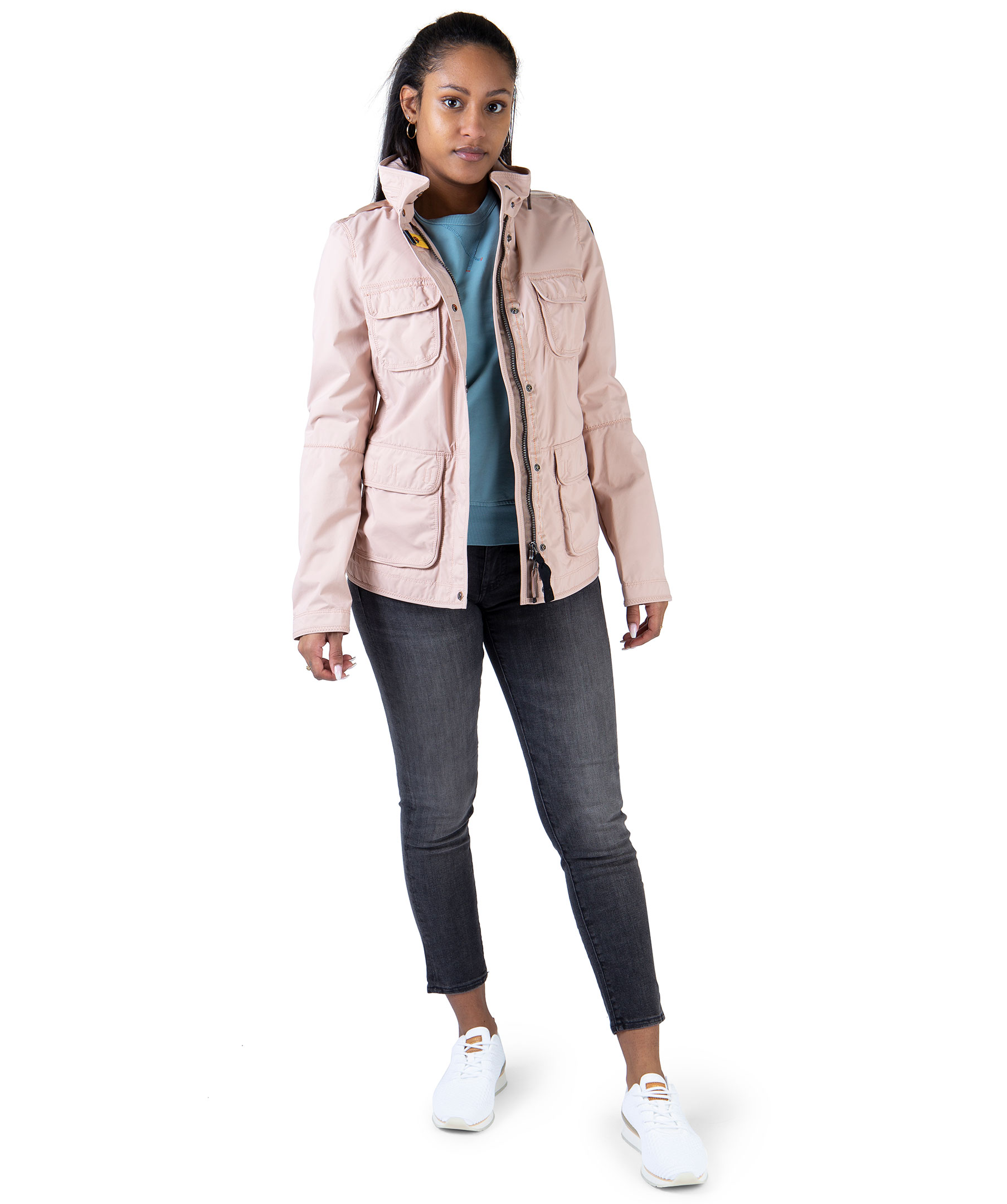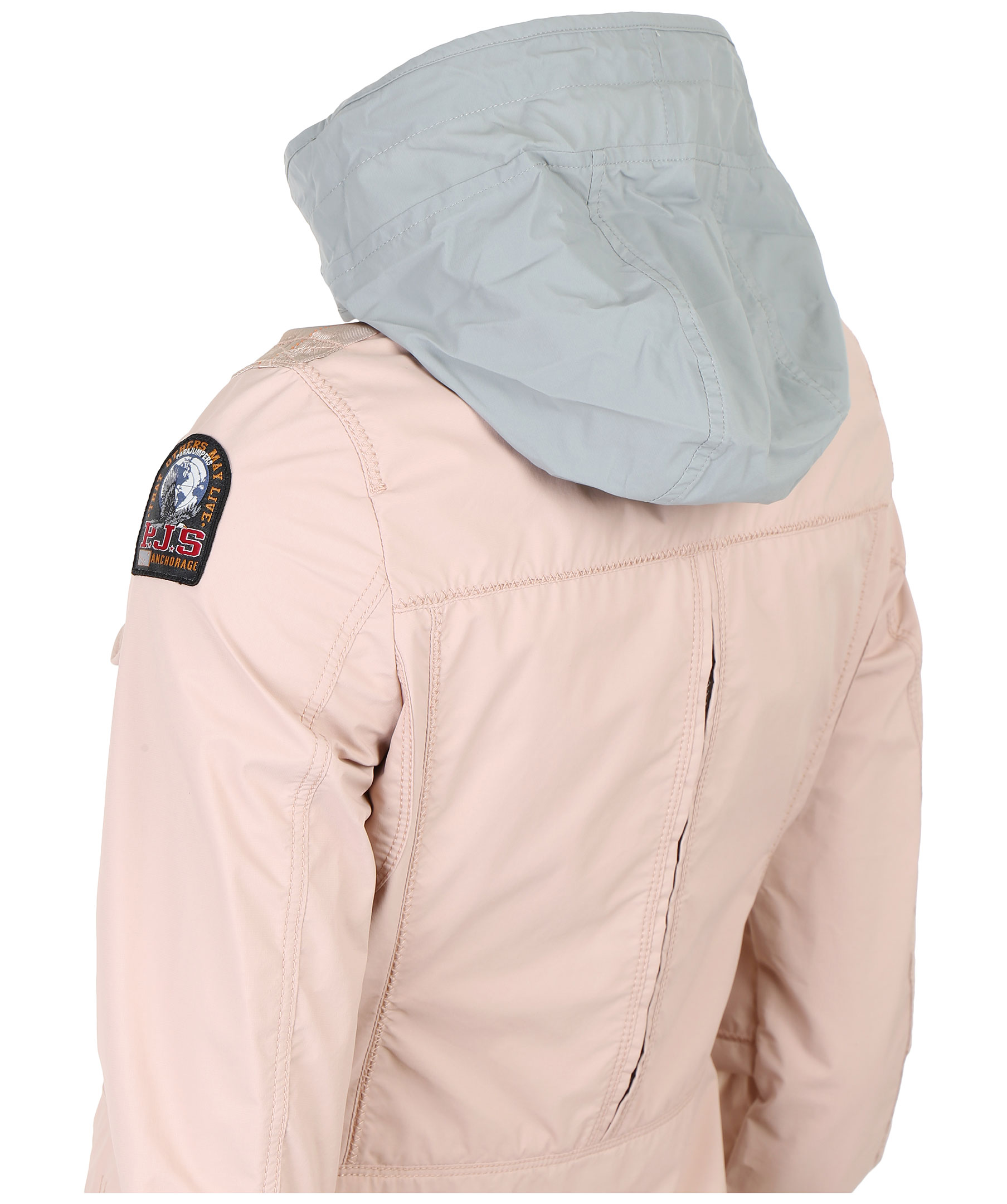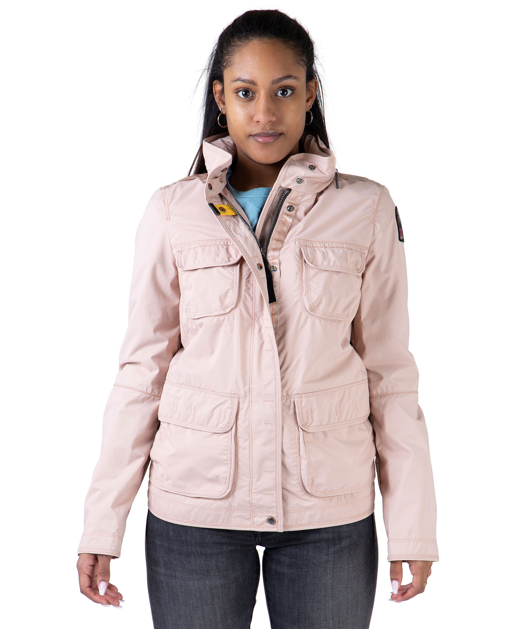 Rosa, tunn vårjacka från Parajumpers. Många praktiska fickor, dold luva i kragen, dragsko i midjan och patch på vänster ärm. Modellen är 164 cm lång och bär storlek S.