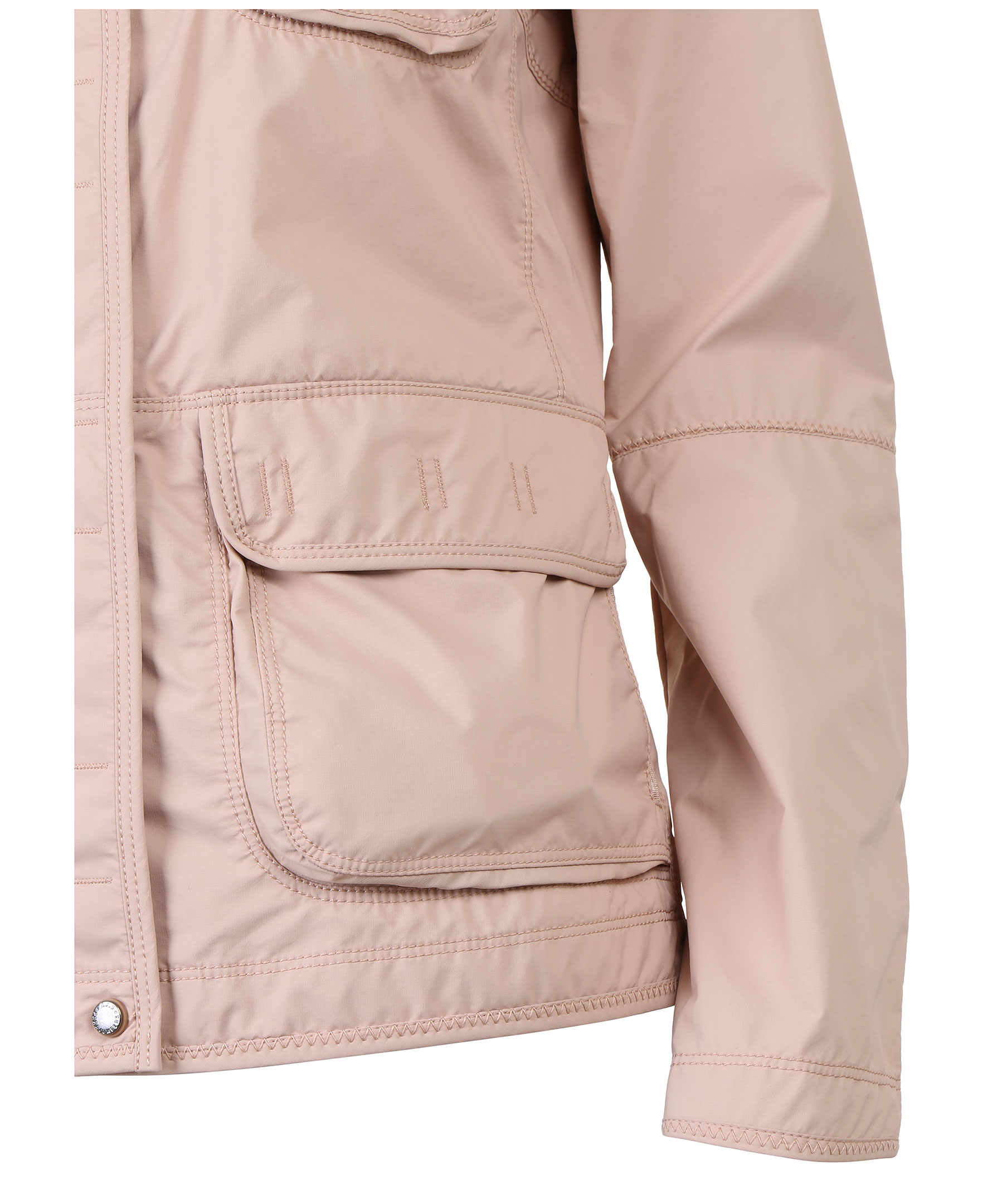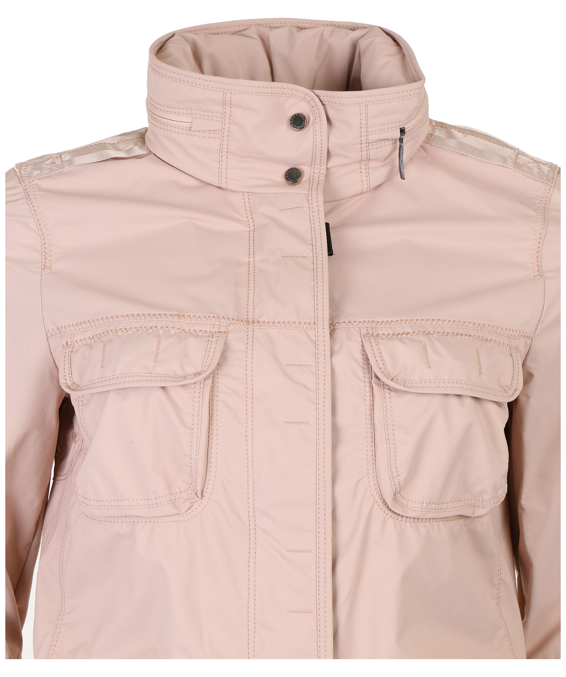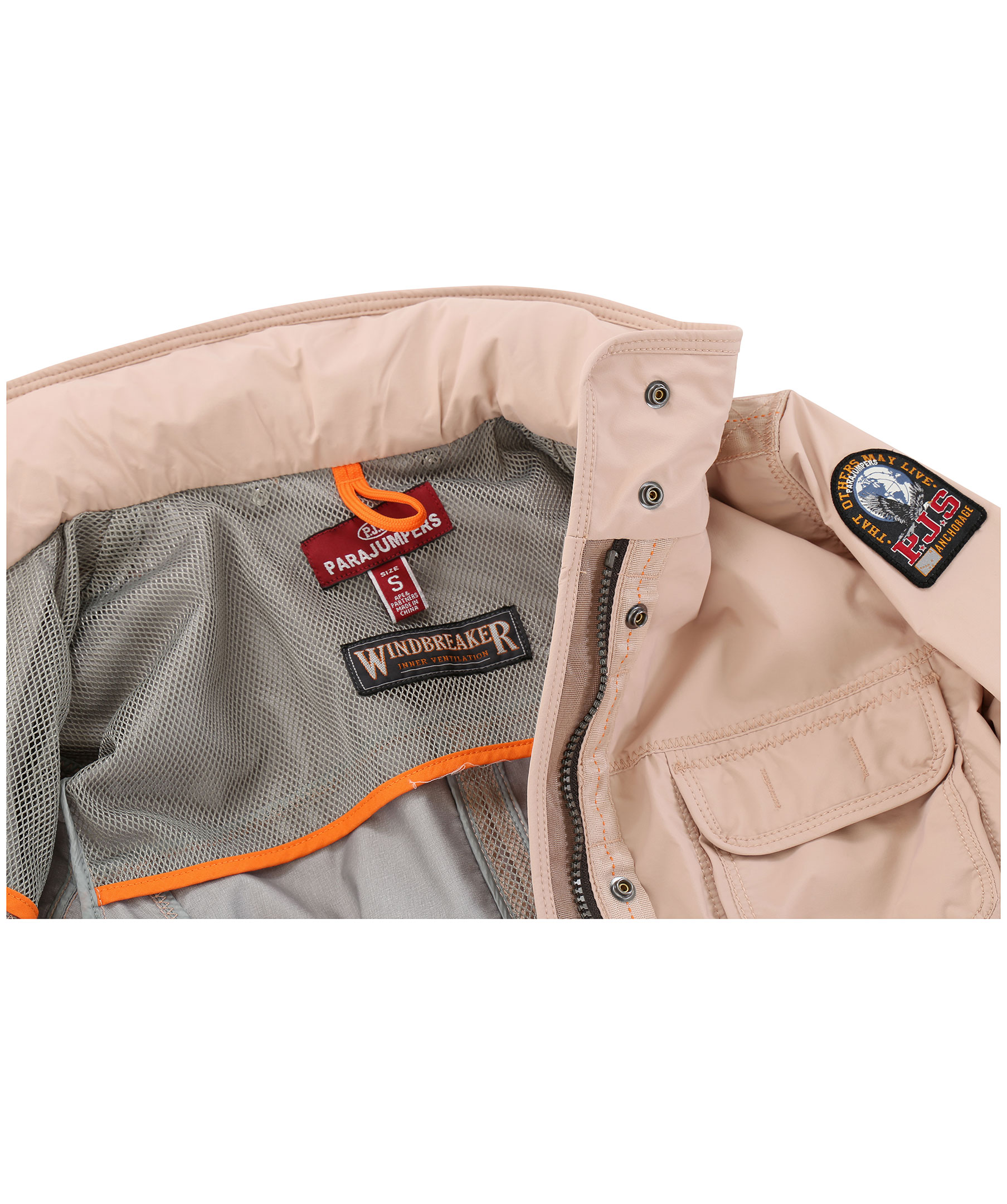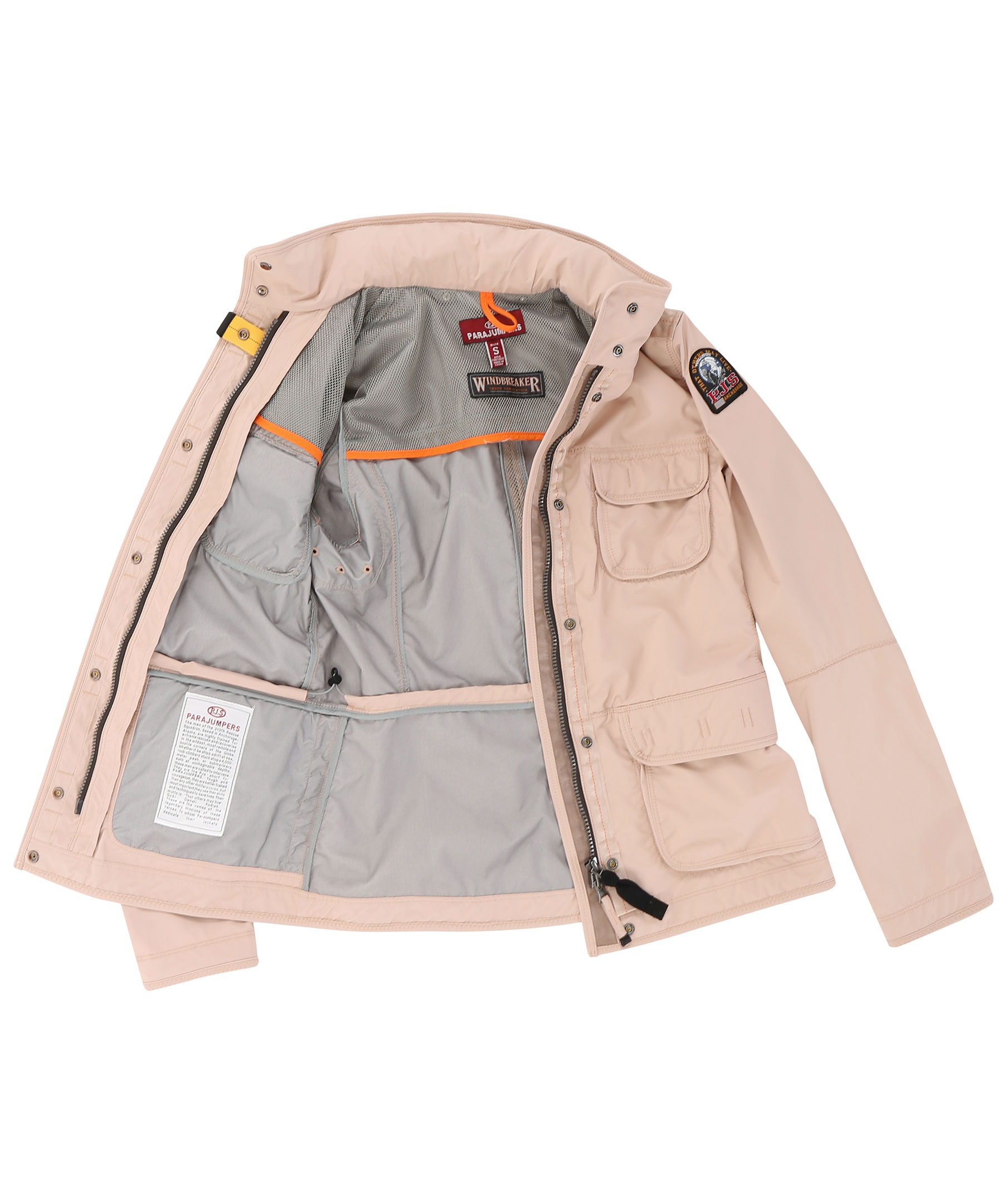 Rosa, tunn vårjacka från Parajumpers. Många praktiska fickor, dold luva i kragen, dragsko i midjan och patch på vänster ärm. Modellen är 164 cm lång och bär storlek S.