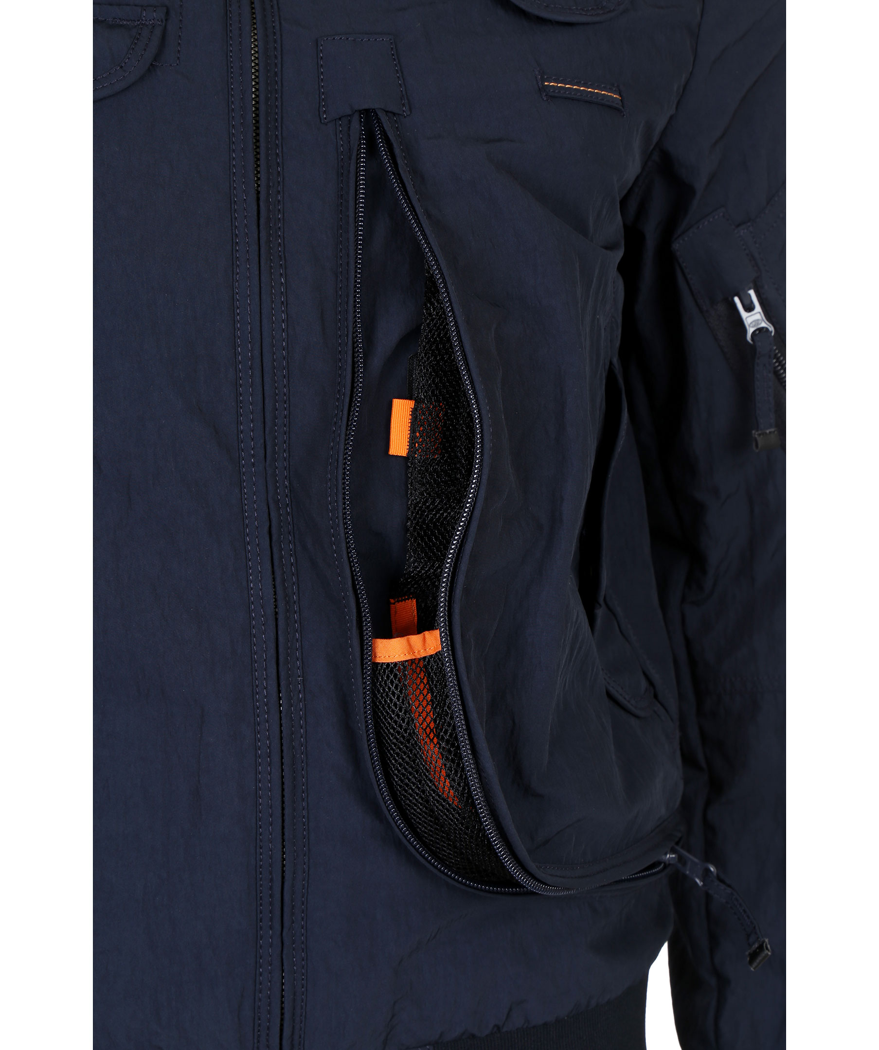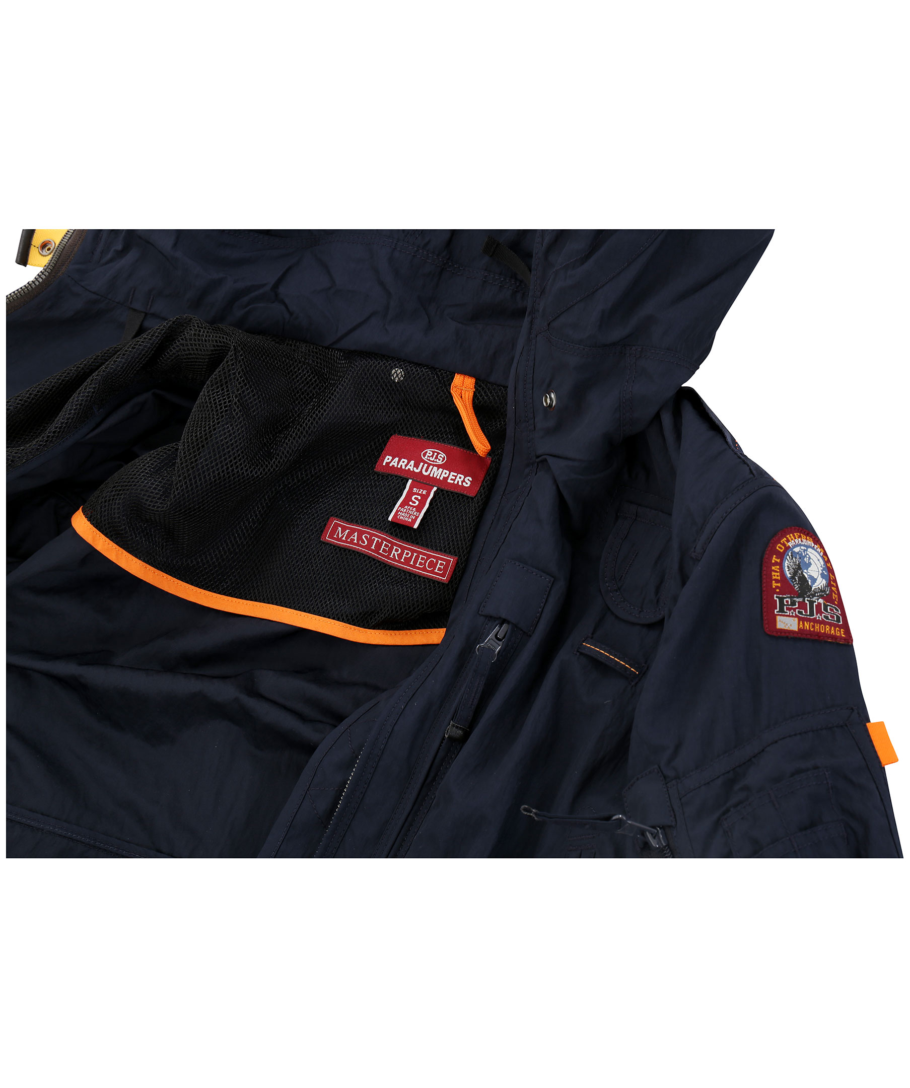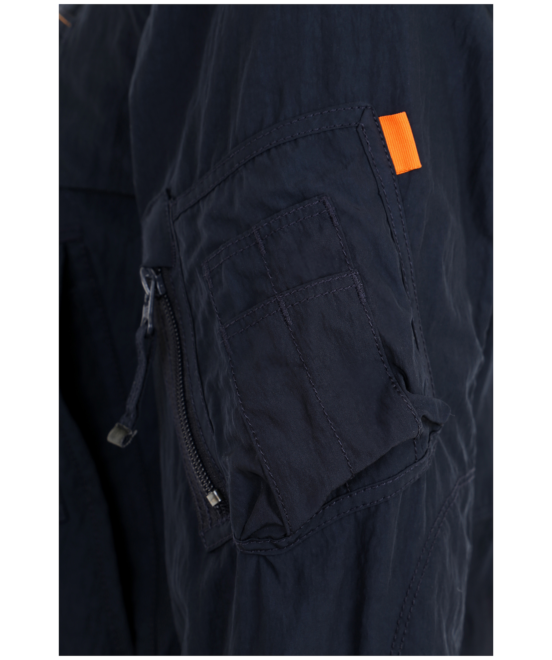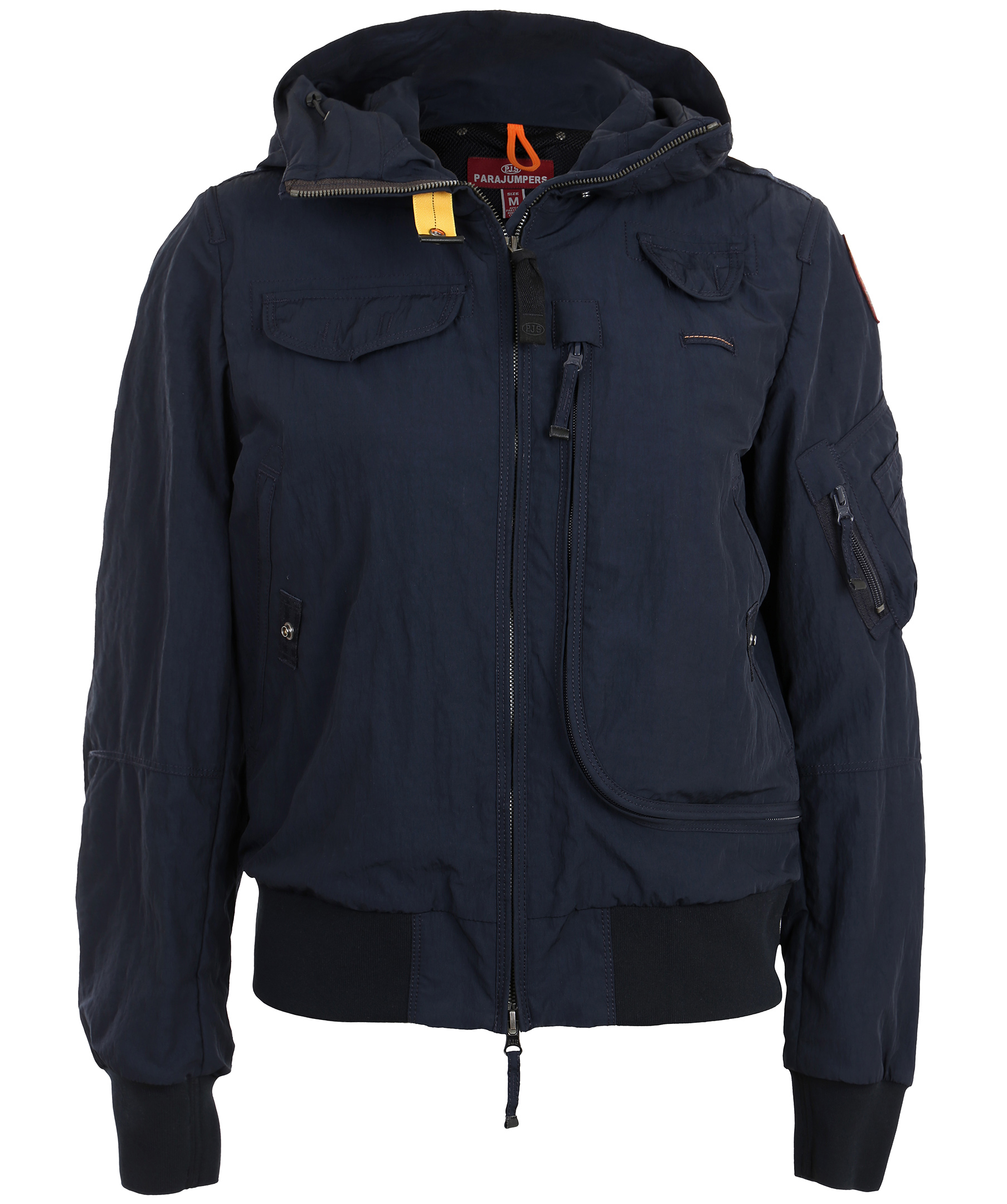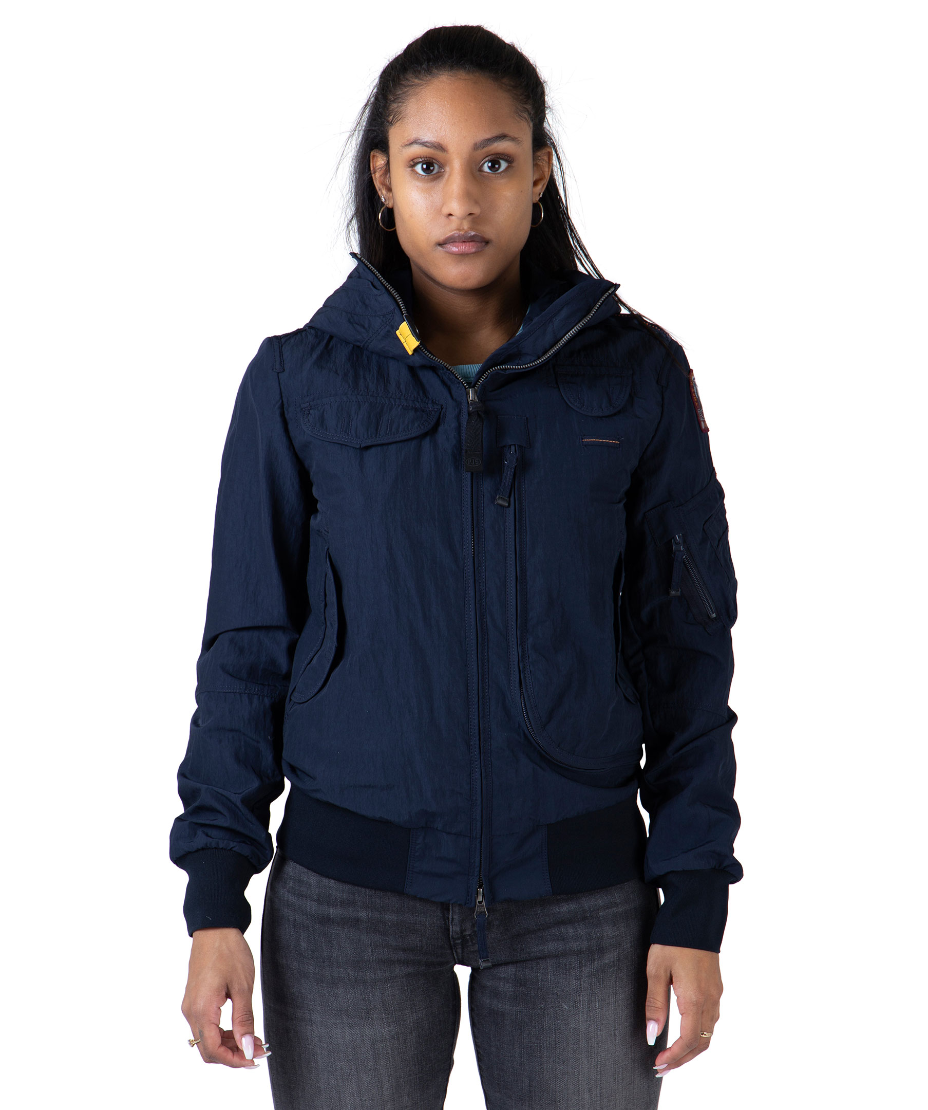 Marinblå vårjacka i tunt material, från Parajumpers. Jackan har många praktiska fickor, spänne i kragen samt patch på vänster ärm. Modellen är 164 cm lång och bär storlek S.