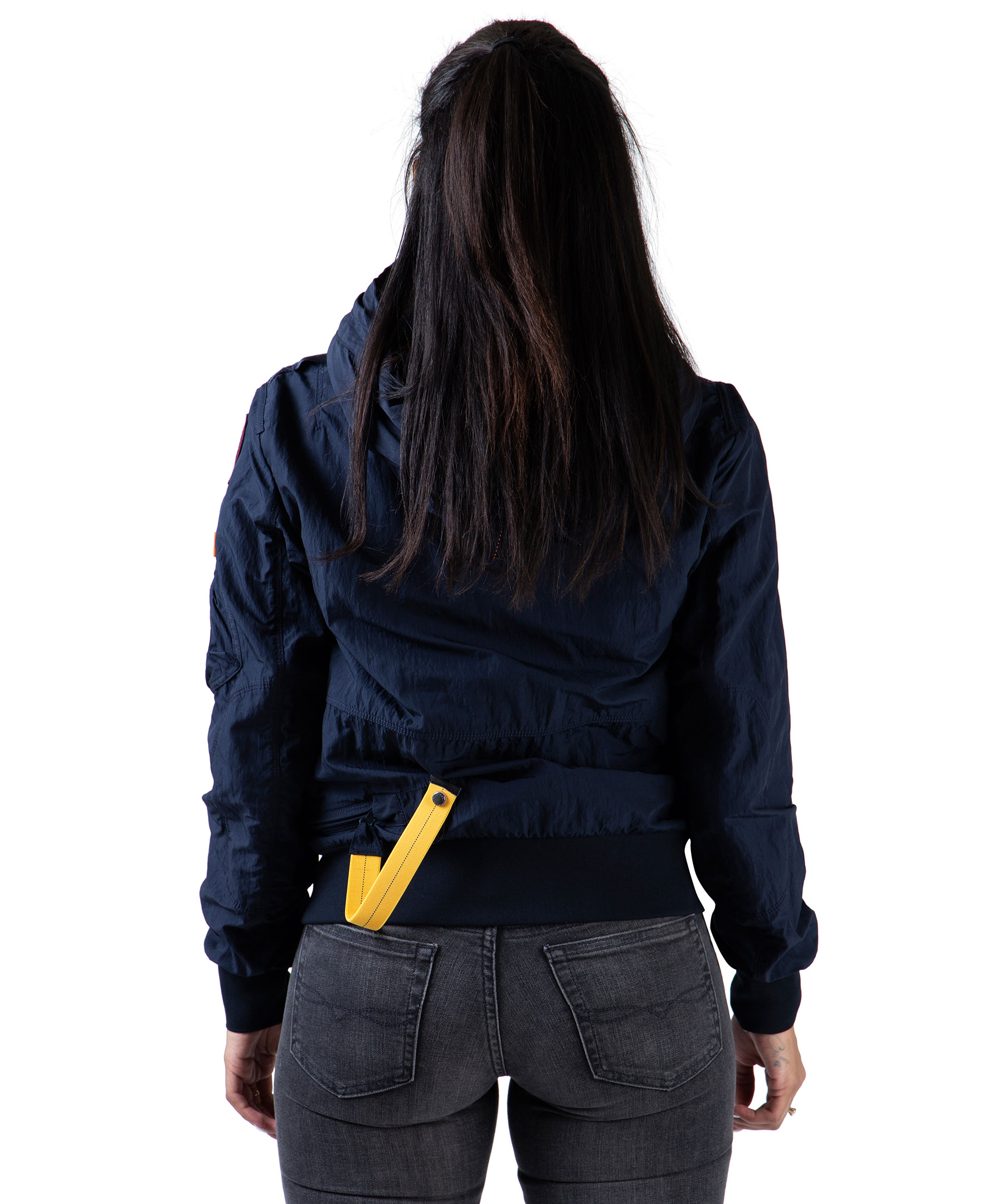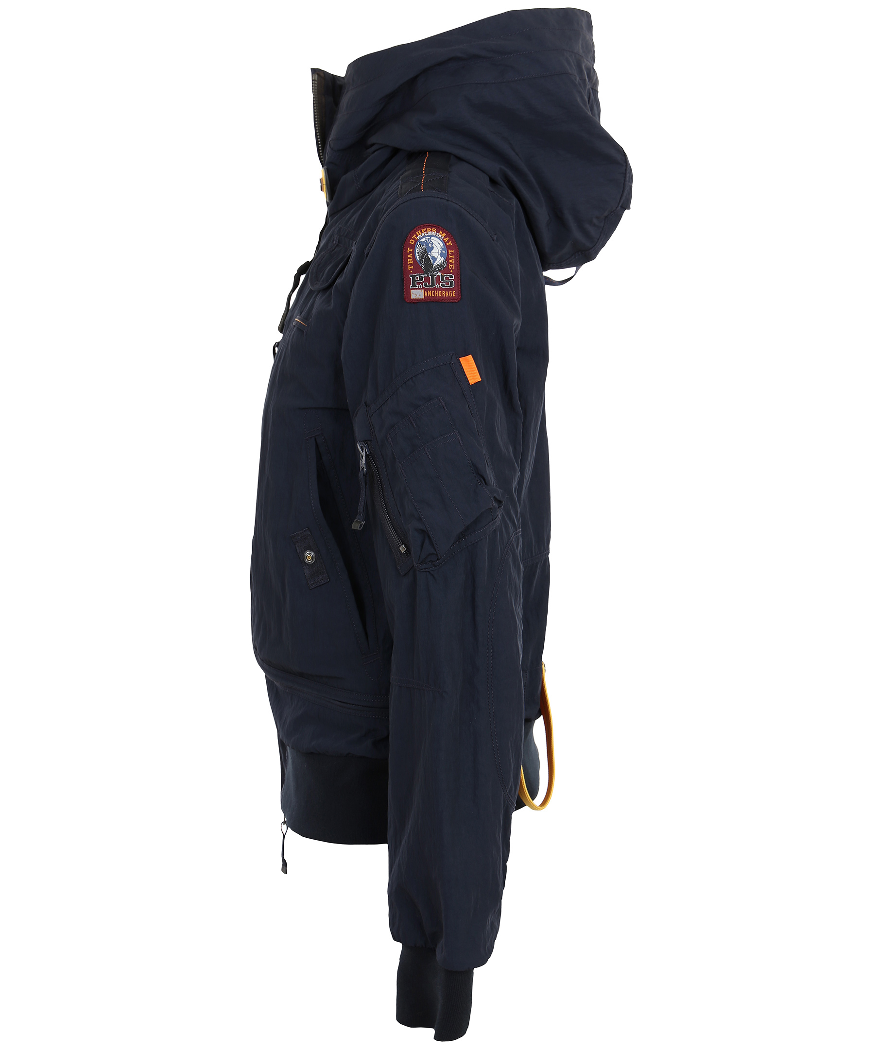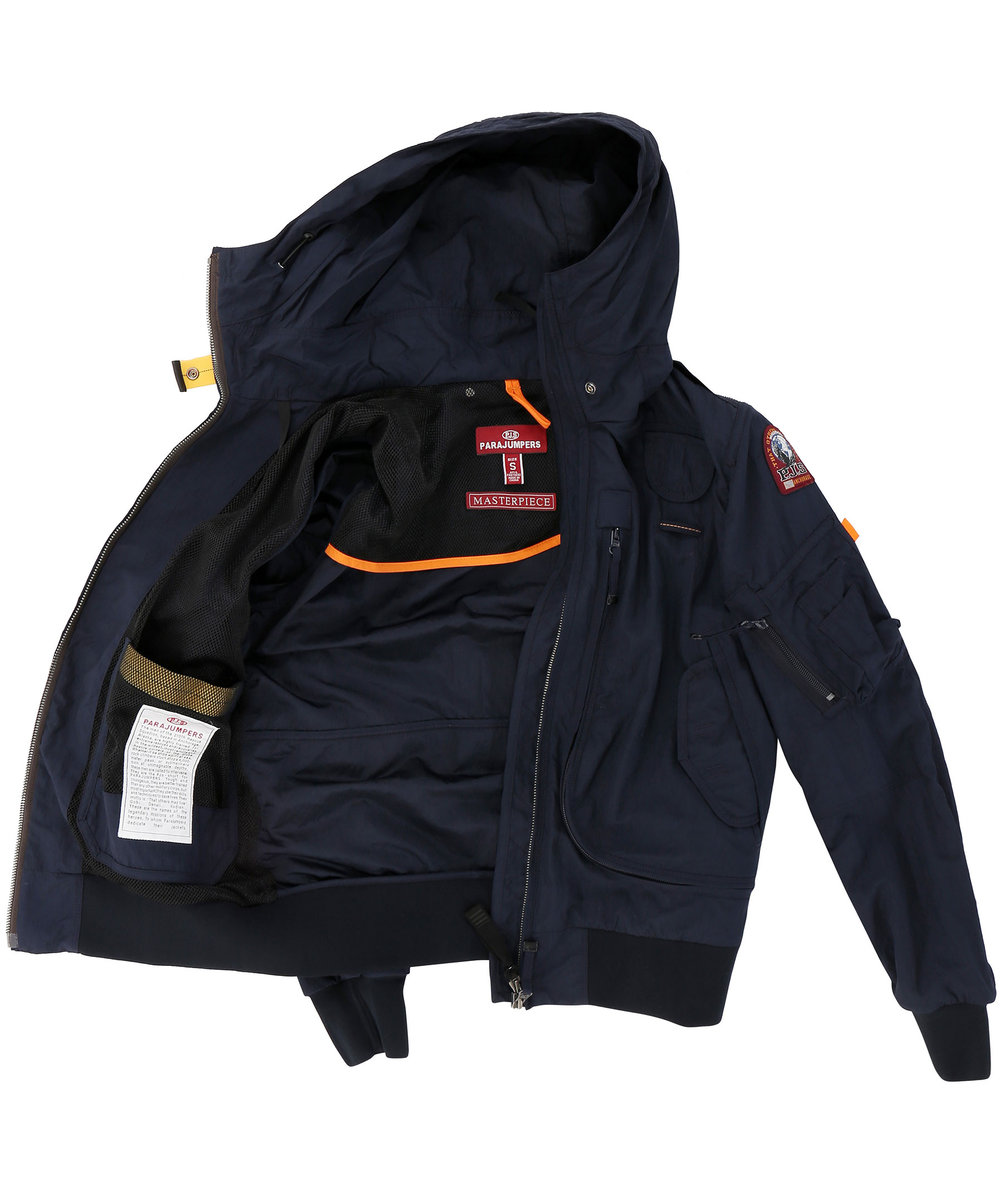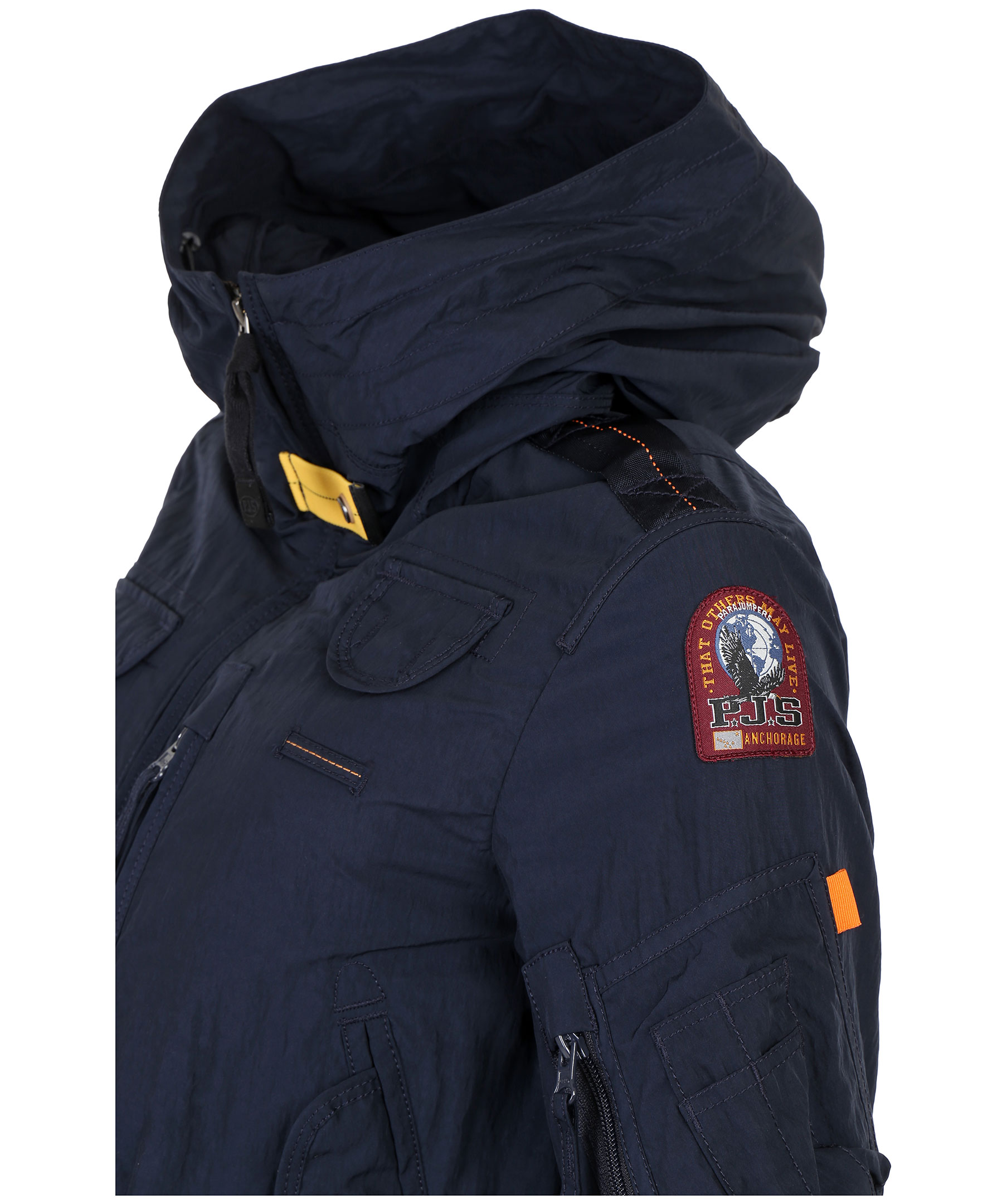 Marinblå vårjacka i tunt material, från Parajumpers. Jackan har många praktiska fickor, spänne i kragen samt patch på vänster ärm. Modellen är 164 cm lång och bär storlek S.