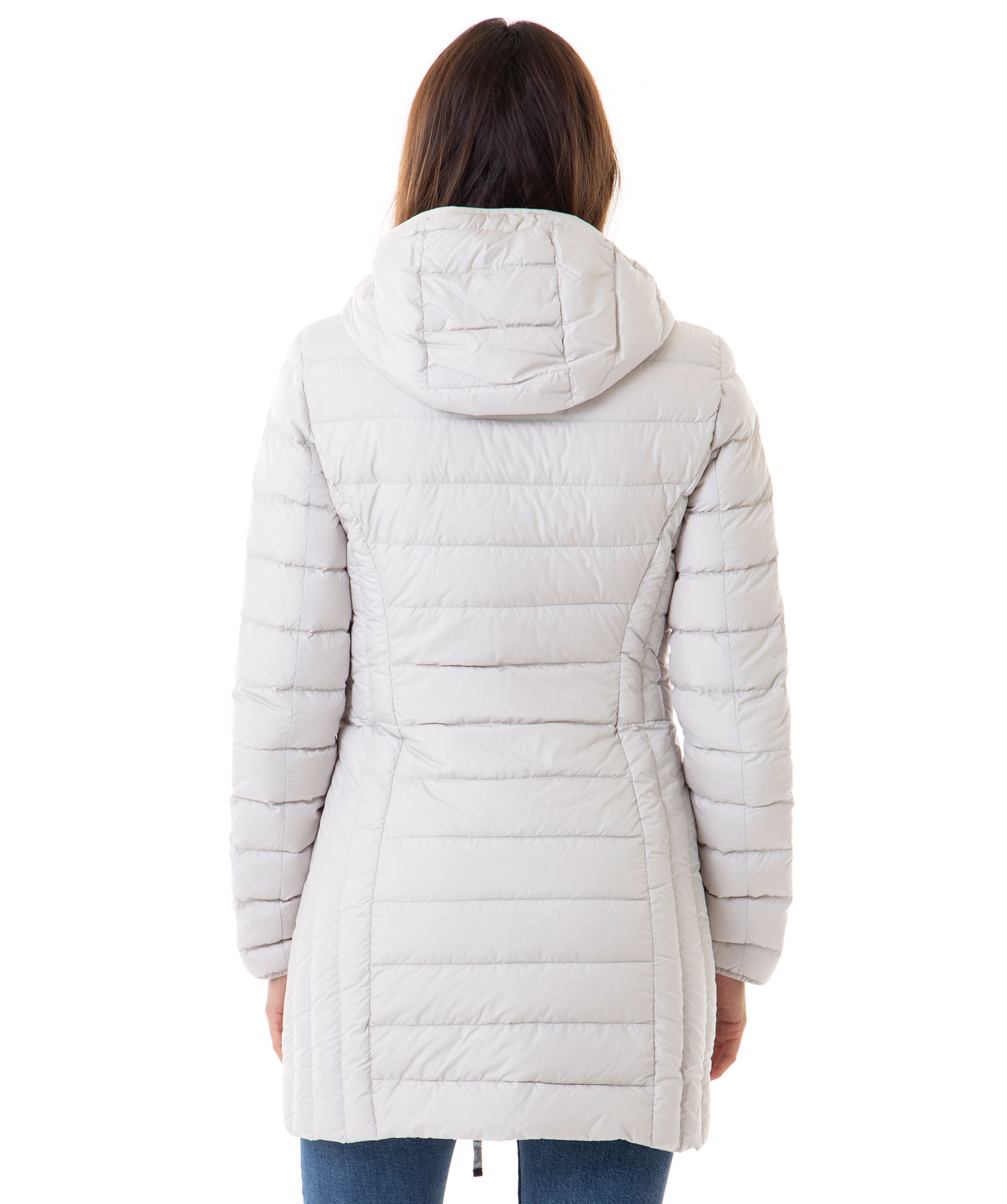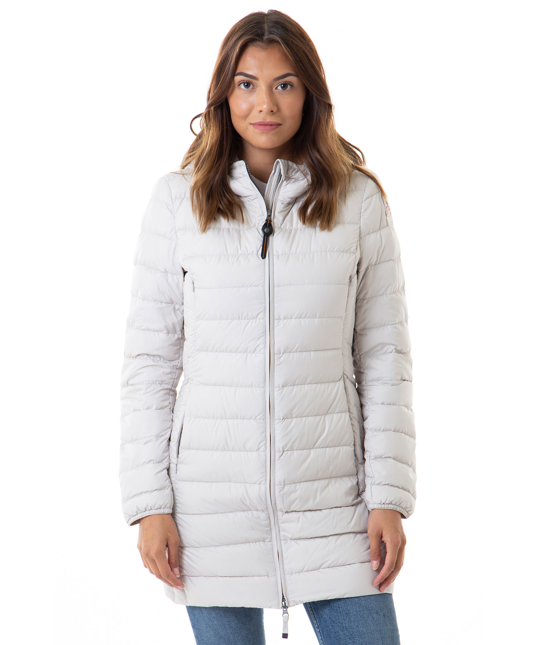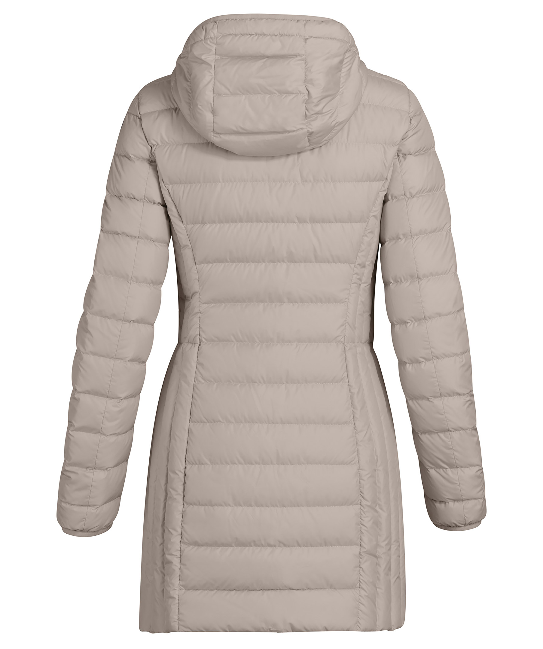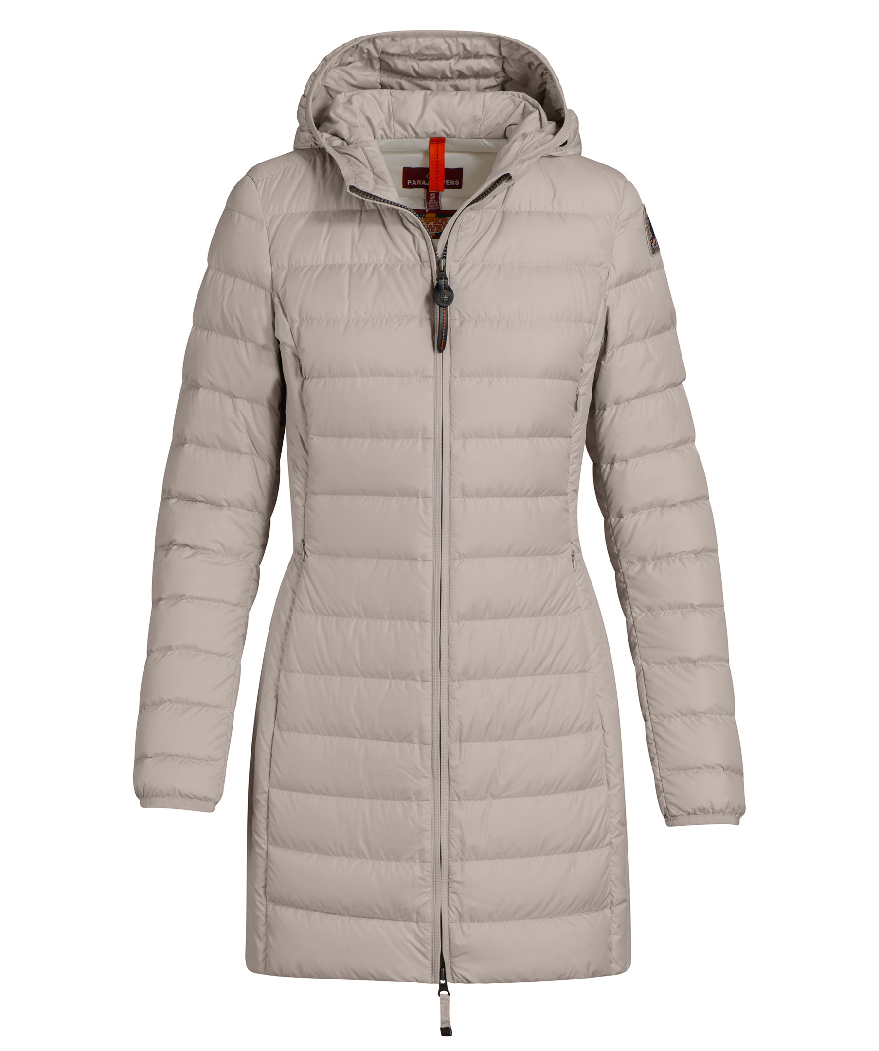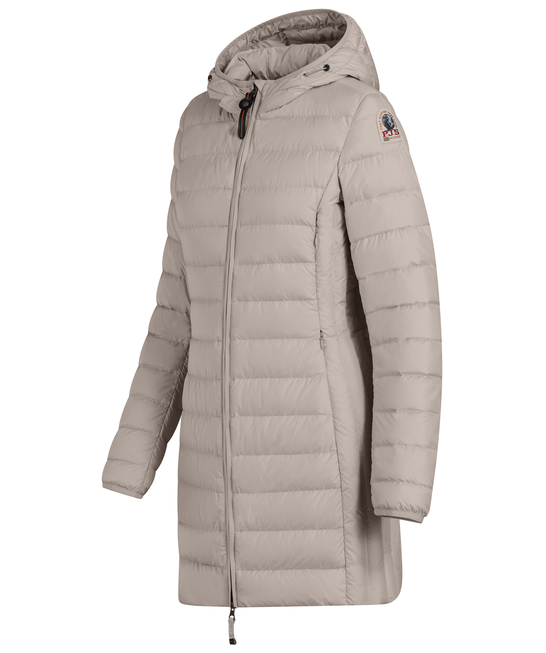 Beige, figursydd lättviktsdunjacka från Parajumpers i längre modell. Dolda fickor med dragkedja framtill, mysig luva samt broderad logotyp på vänster ärm. Perfekt jacka till hösten! Modellen är 174 cm lång och bär storlek S.