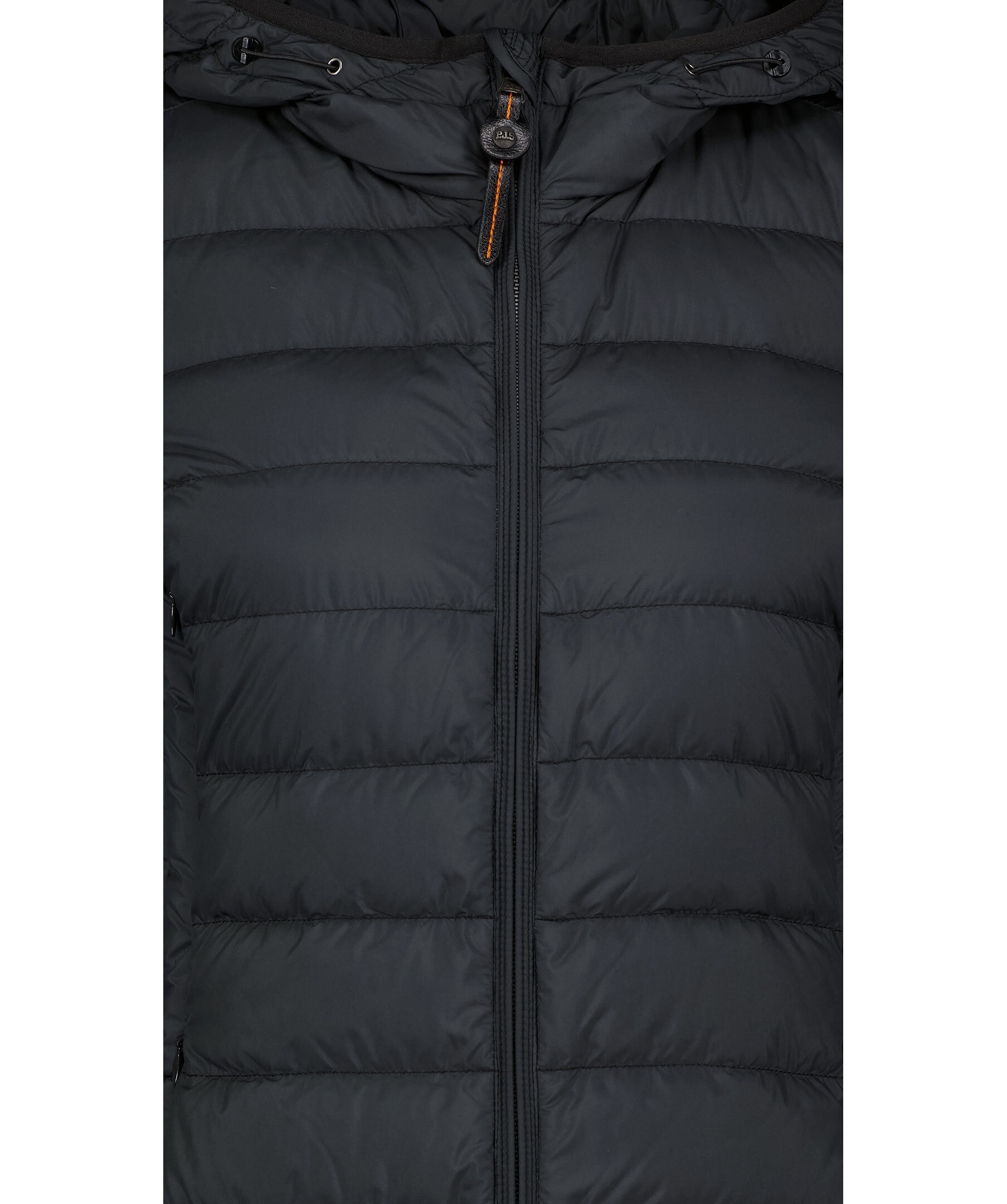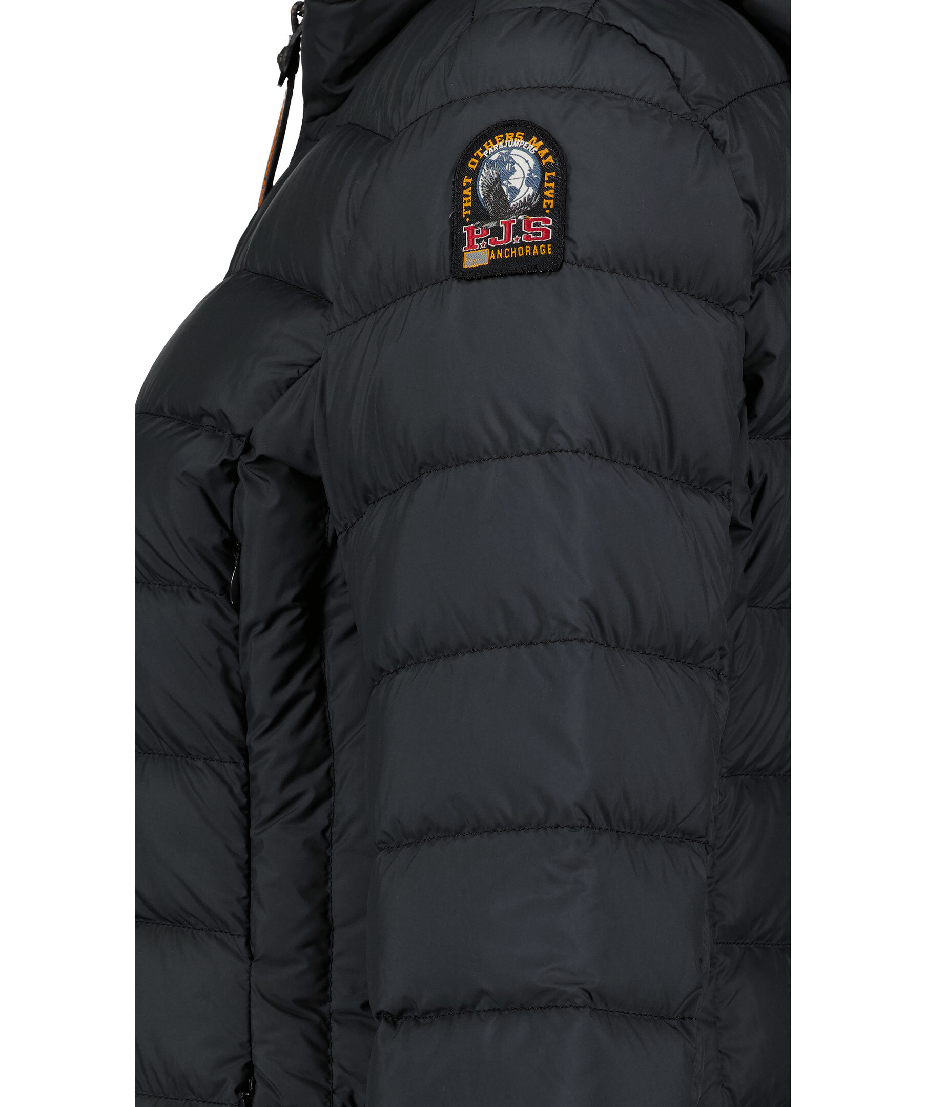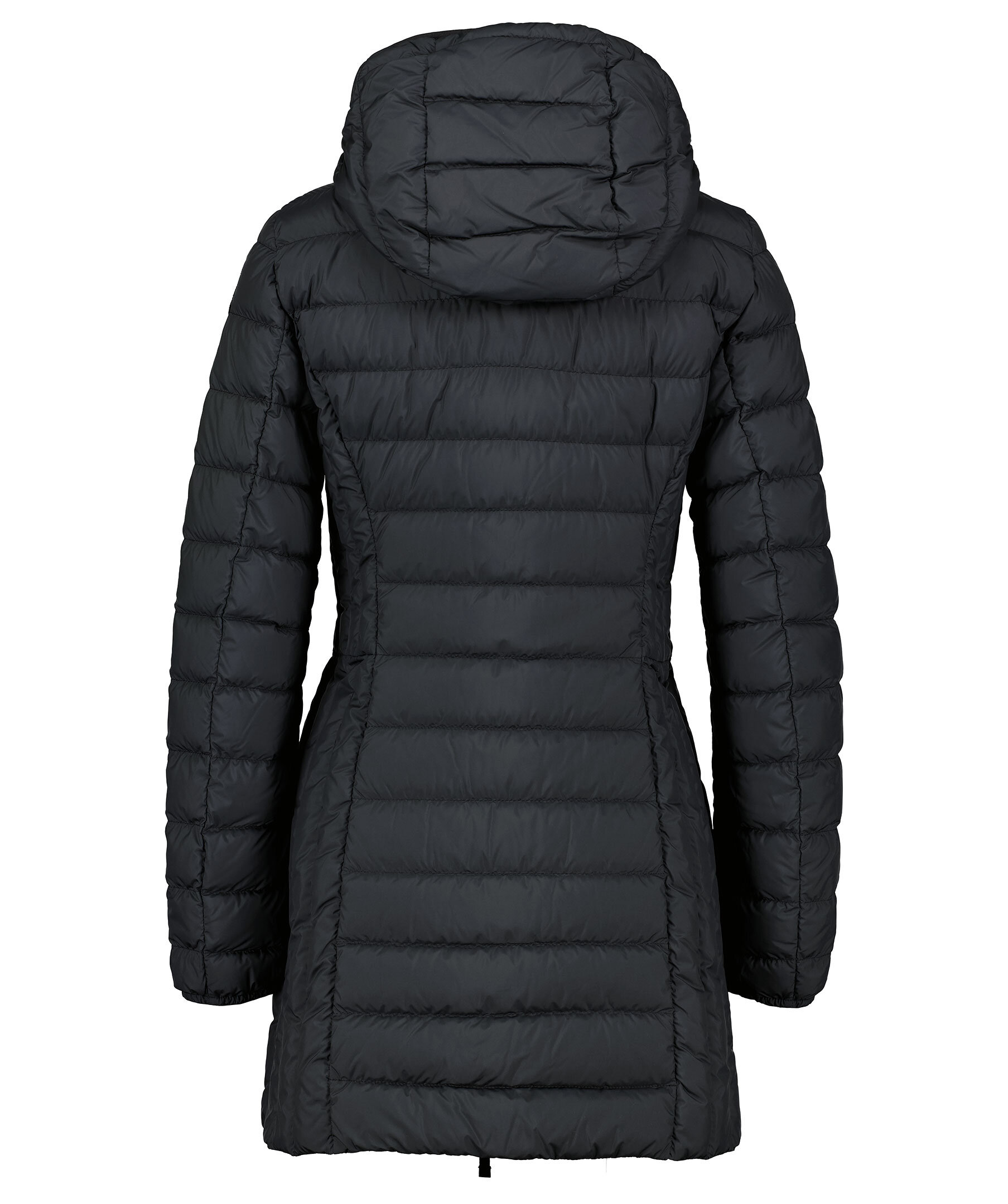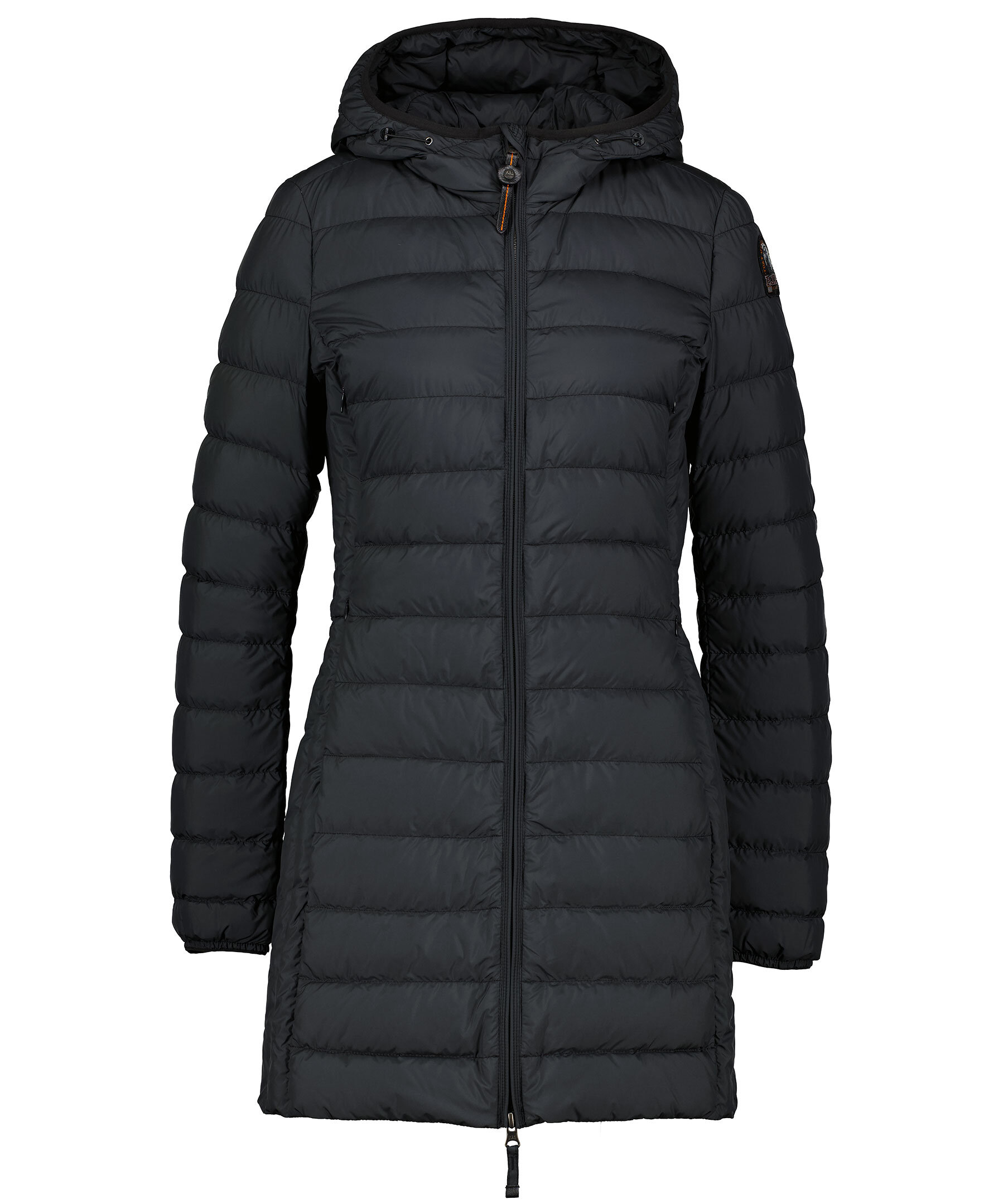 Svart, figursydd lättviktsdunjacka från Parajumpers i längre modell. Yttertyg i polyester. Två framfickor och två bröstfickor med dold dragkedja framtill och en innerficka. Luva med dragsko samt broderad ikonisk tygpatch på vänster ärm och ventilationshål vid armhålorna. Stängs med tvåvägsdragkedja.