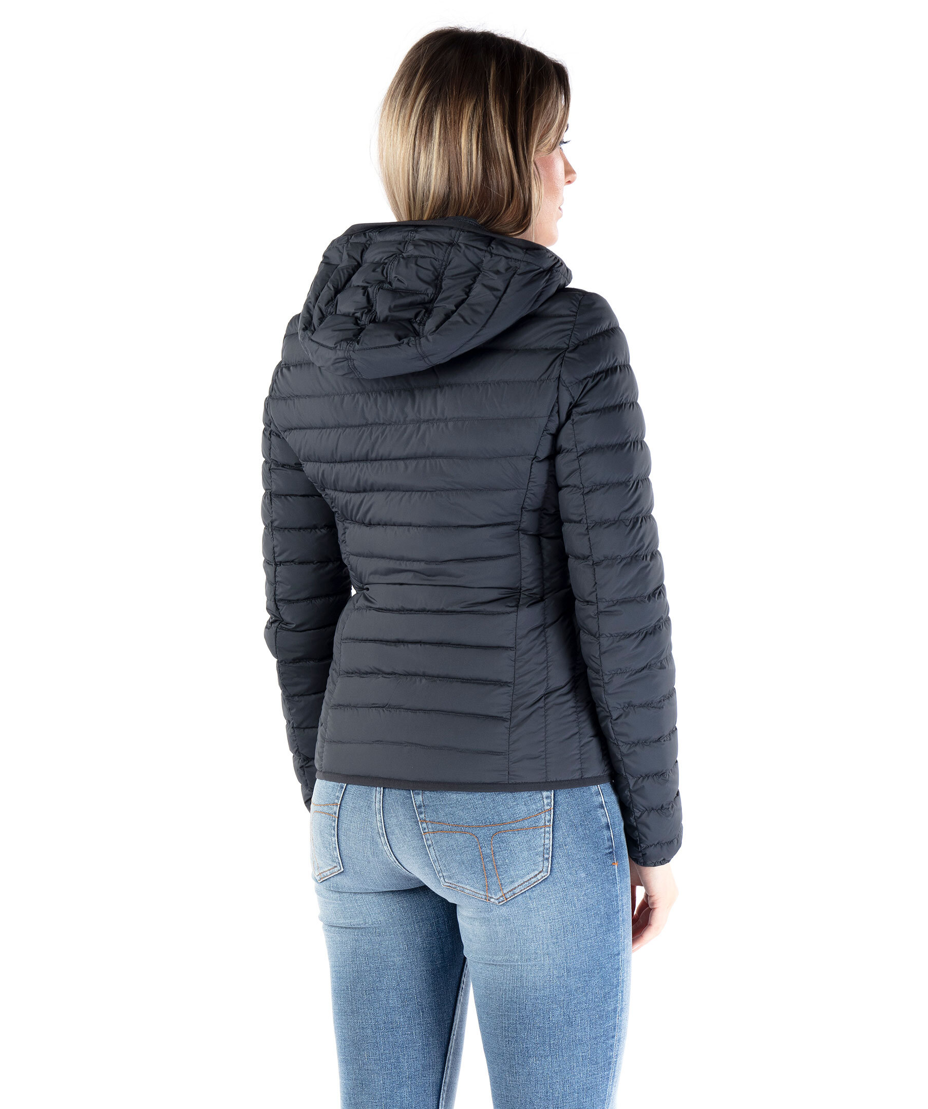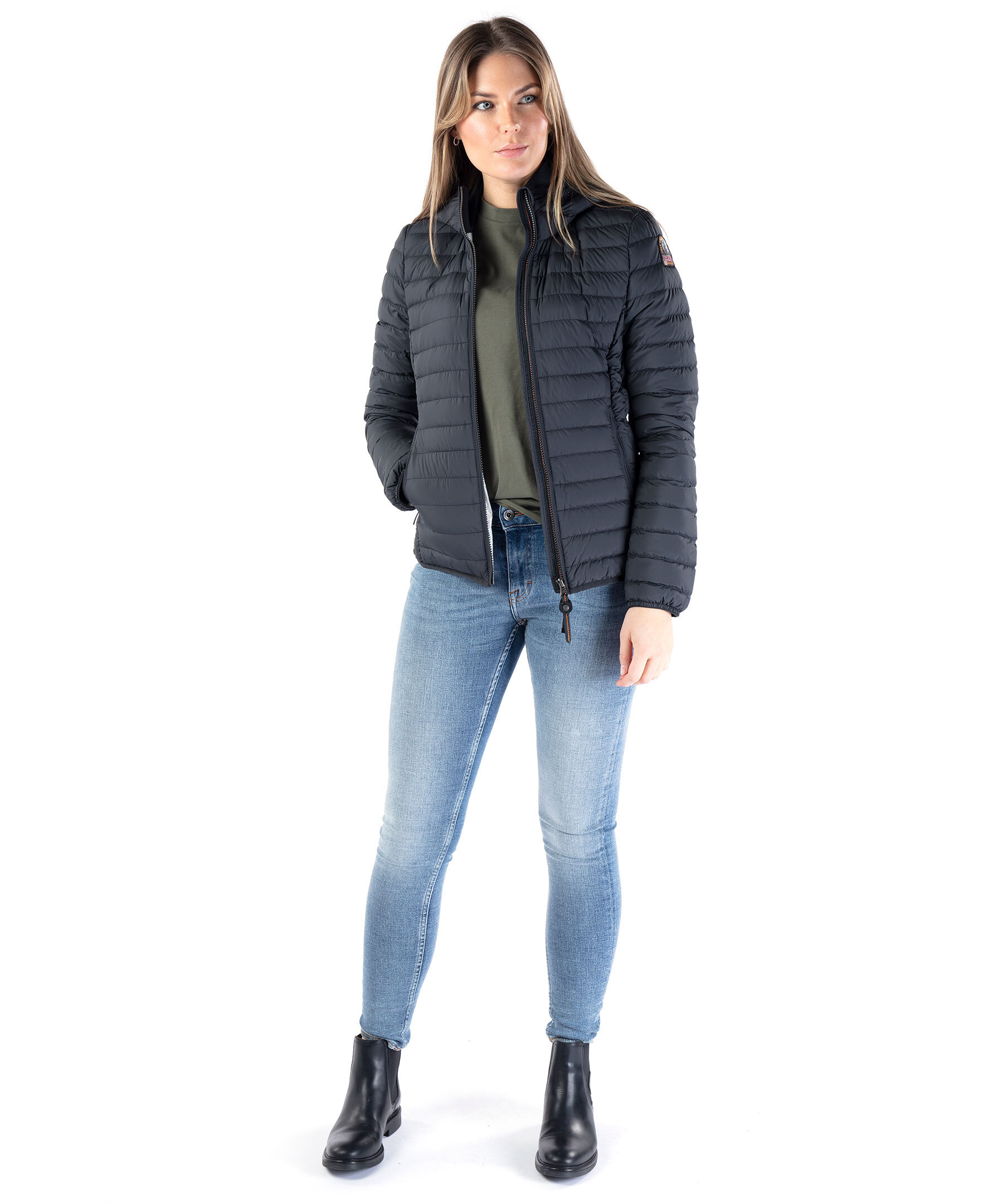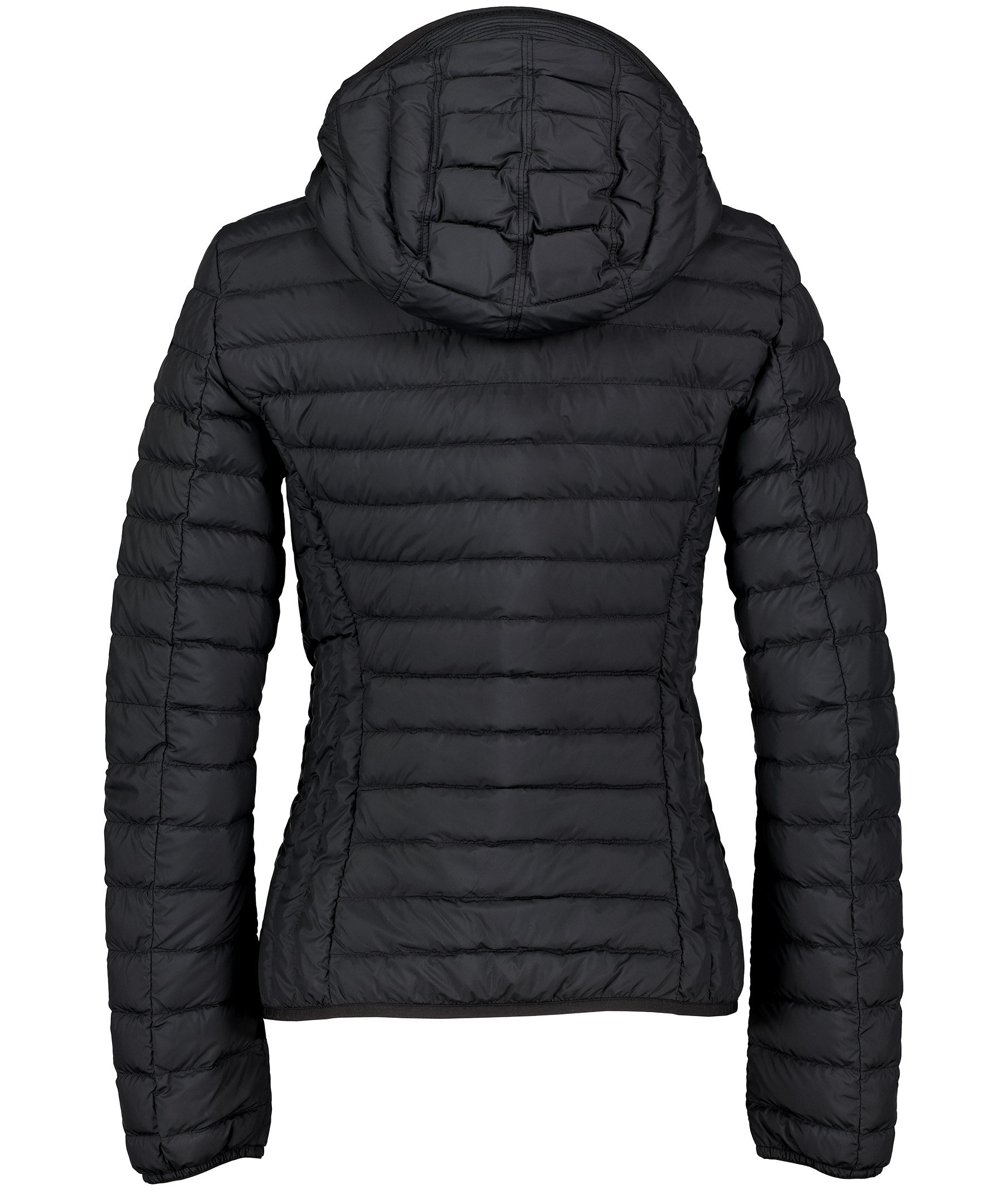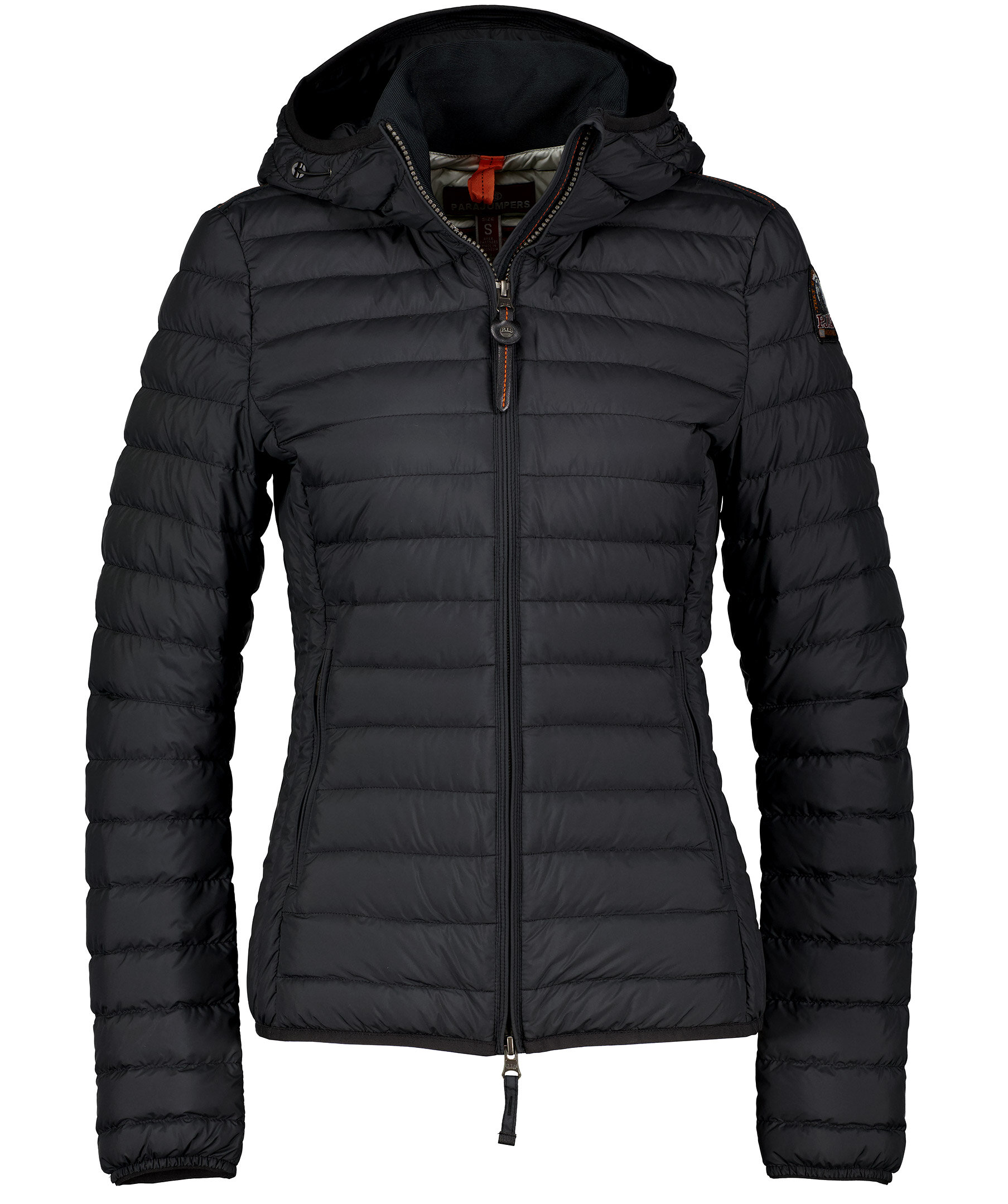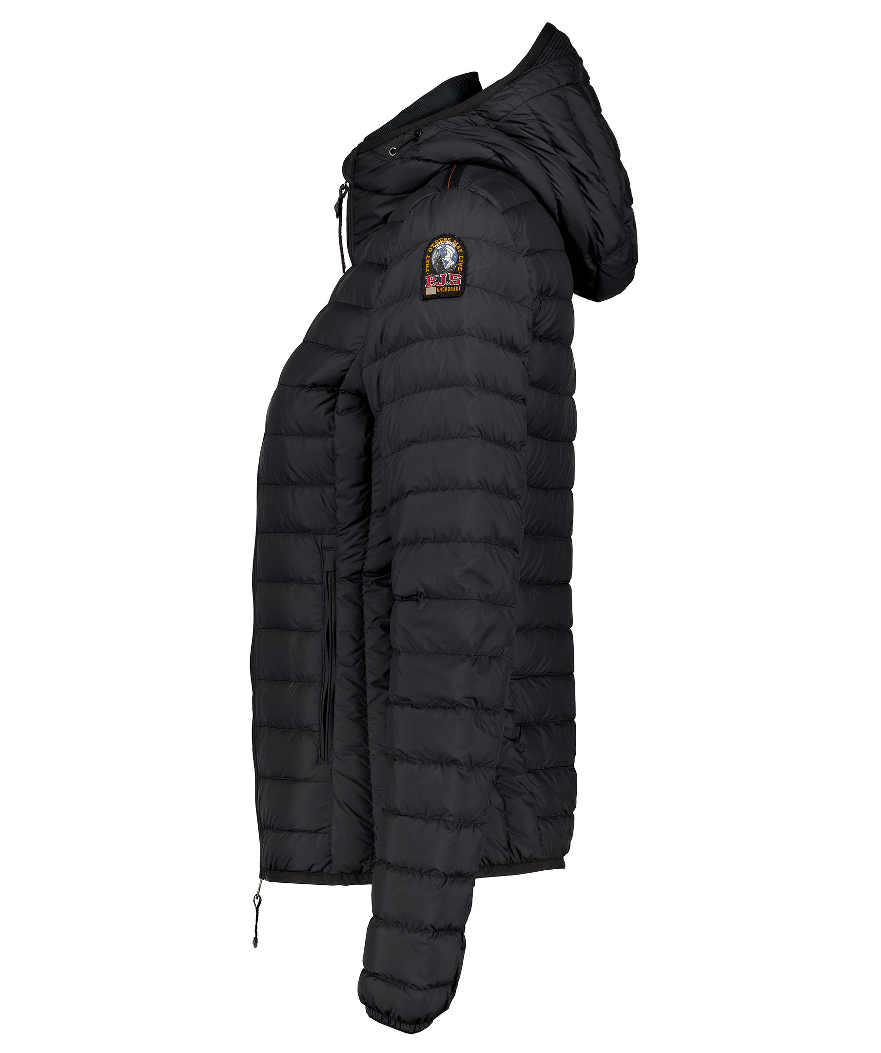 Svart, figursydd lättviktsdunjacka från Parajumpers i kortare modell. Yttertyg i polyester. Två framfickor med dold dragkedja framtill och en innerficka. Krage med mudd och luva med dragsko samt broderad ikonisk tygpatch på vänster ärm och ventilationshål vid armhålorna. Stängs med tvåvägsdragkedja. Modellen är 175 cm lång och bär storlek S.
