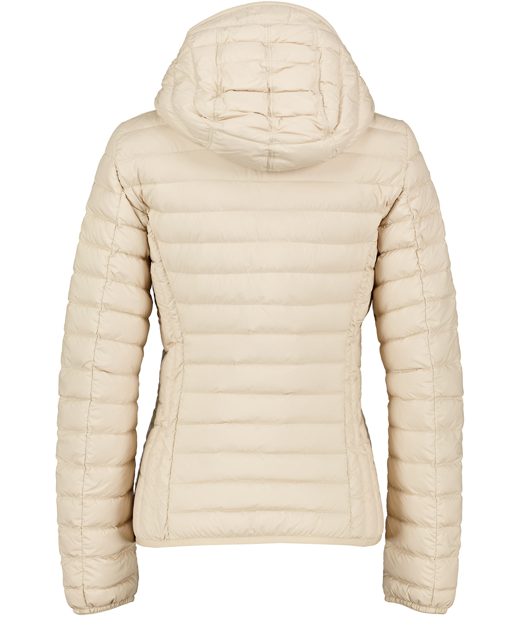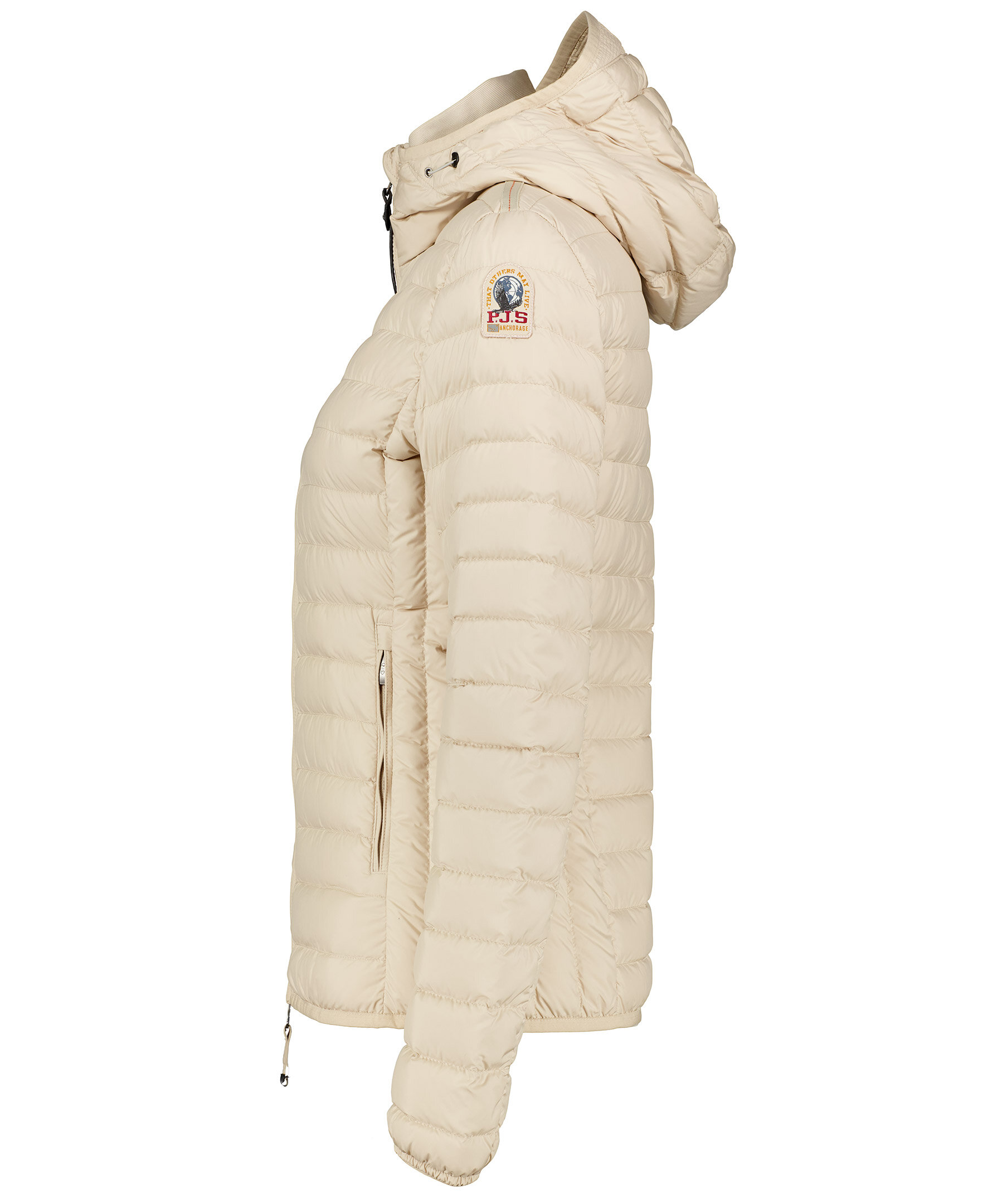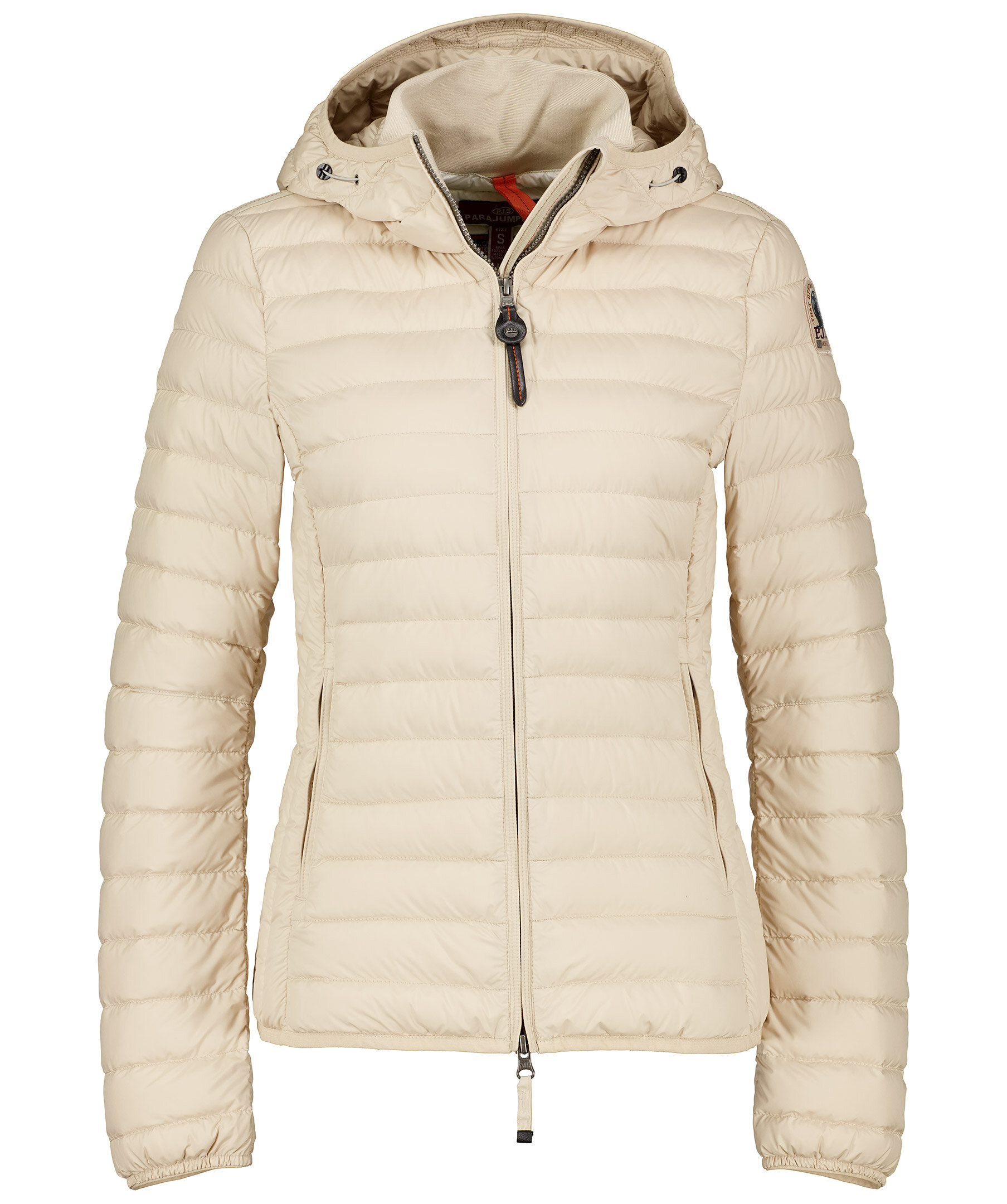 Beige, figursydd lättviktsdunjacka från Parajumpers i kortare modell. Yttertyg i polyester. Två framfickor med dold dragkedja framtill och en innerficka. Krage med mudd och luva med dragsko samt broderad ikonisk tygpatch på vänster ärm och ventilationshål vid armhålorna. Stängs med tvåvägsdragkedja. Modellen är 175 cm lång och bär storlek S.