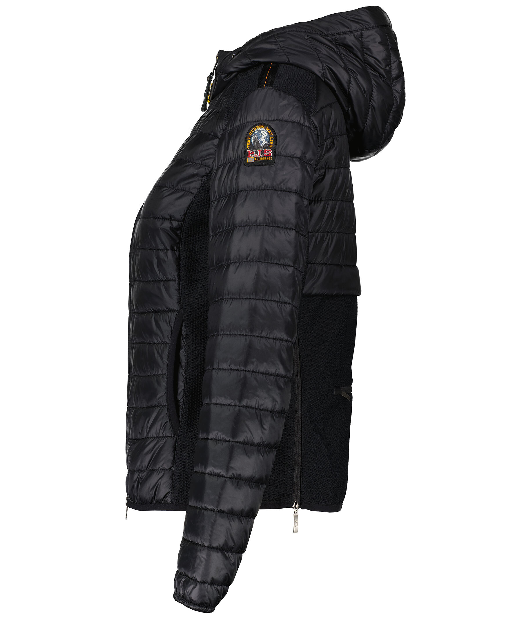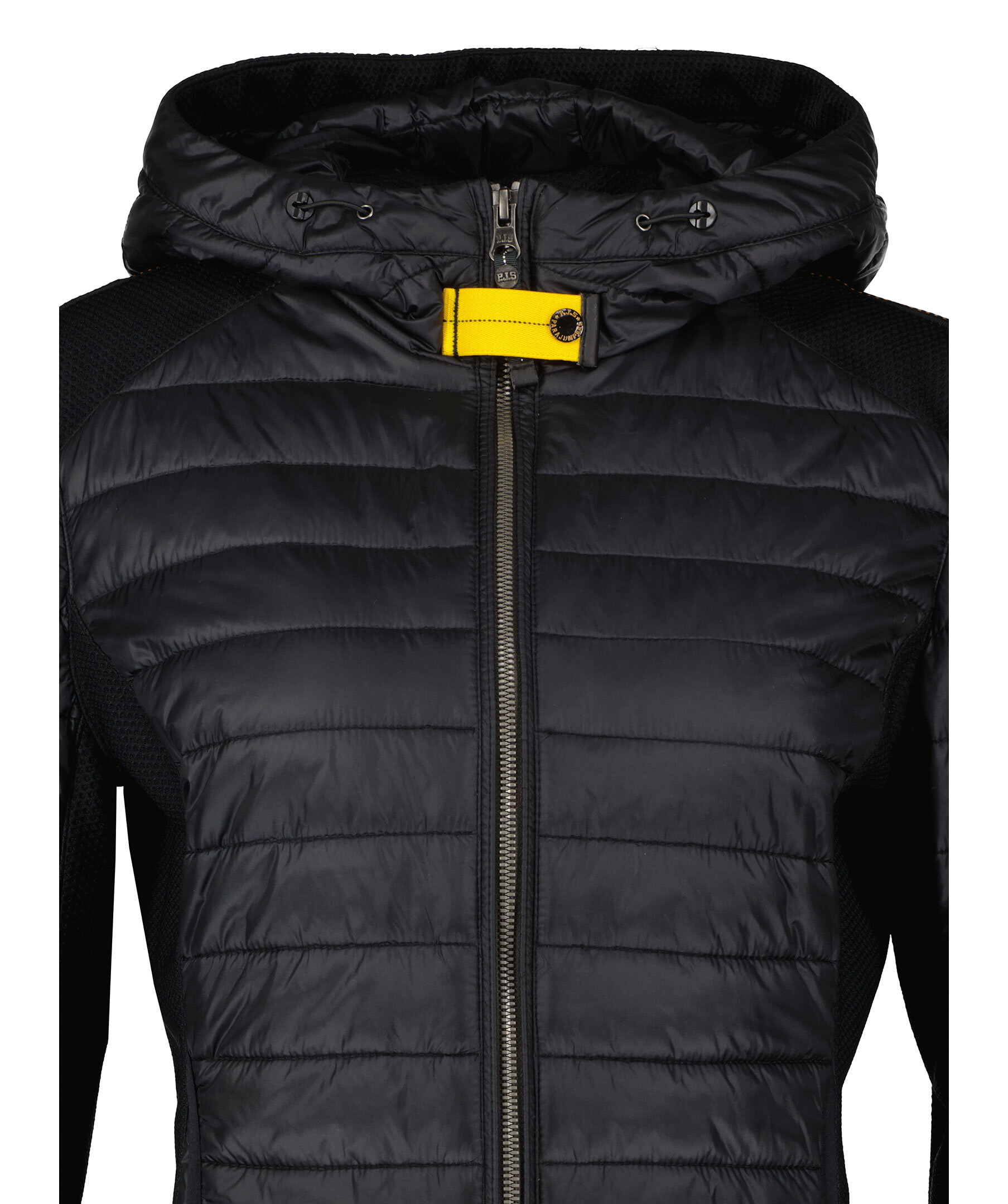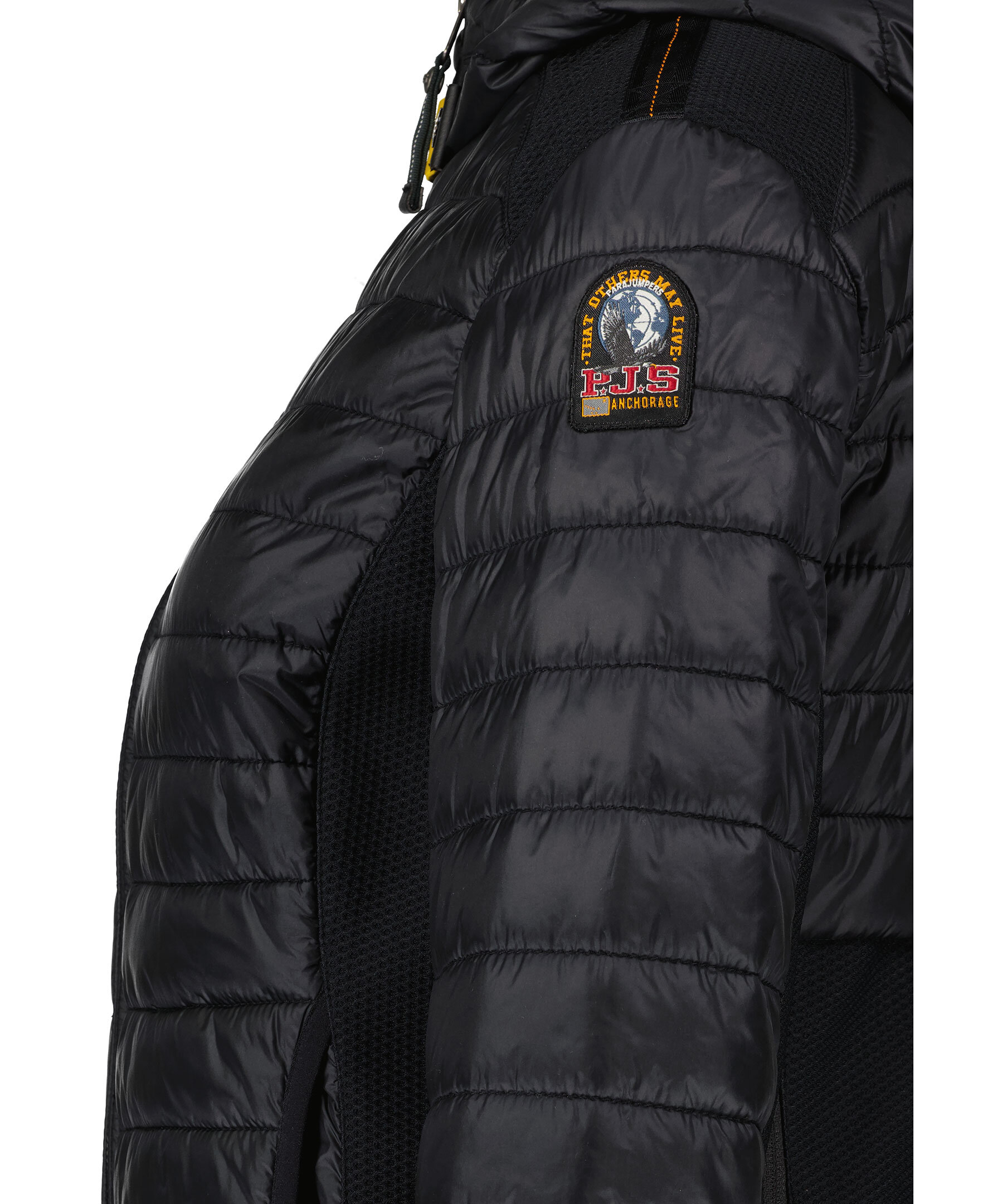 Svart hybridjacka från Parajumpers. Luva med dragsko Ärmarna delvis i mesh. Stängs med tvåvägsdragkedja. Två fickor framtill med smal elastiskmudd. Gult spänne vid kragen. Dragsko i luvan. Patch med logotyp på vänster ärm.