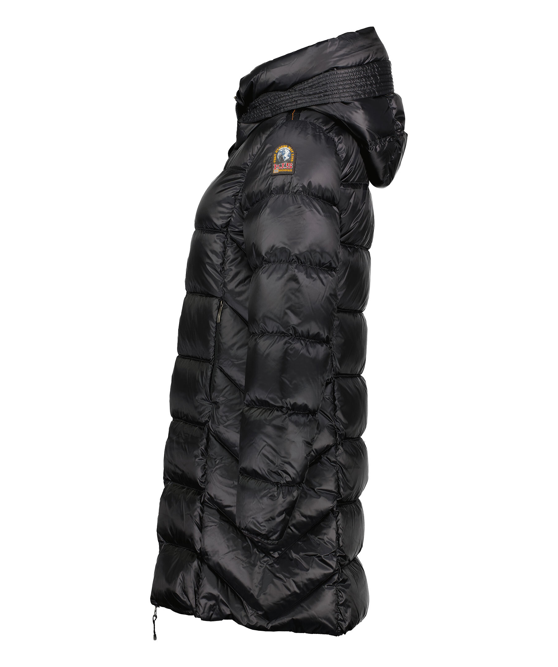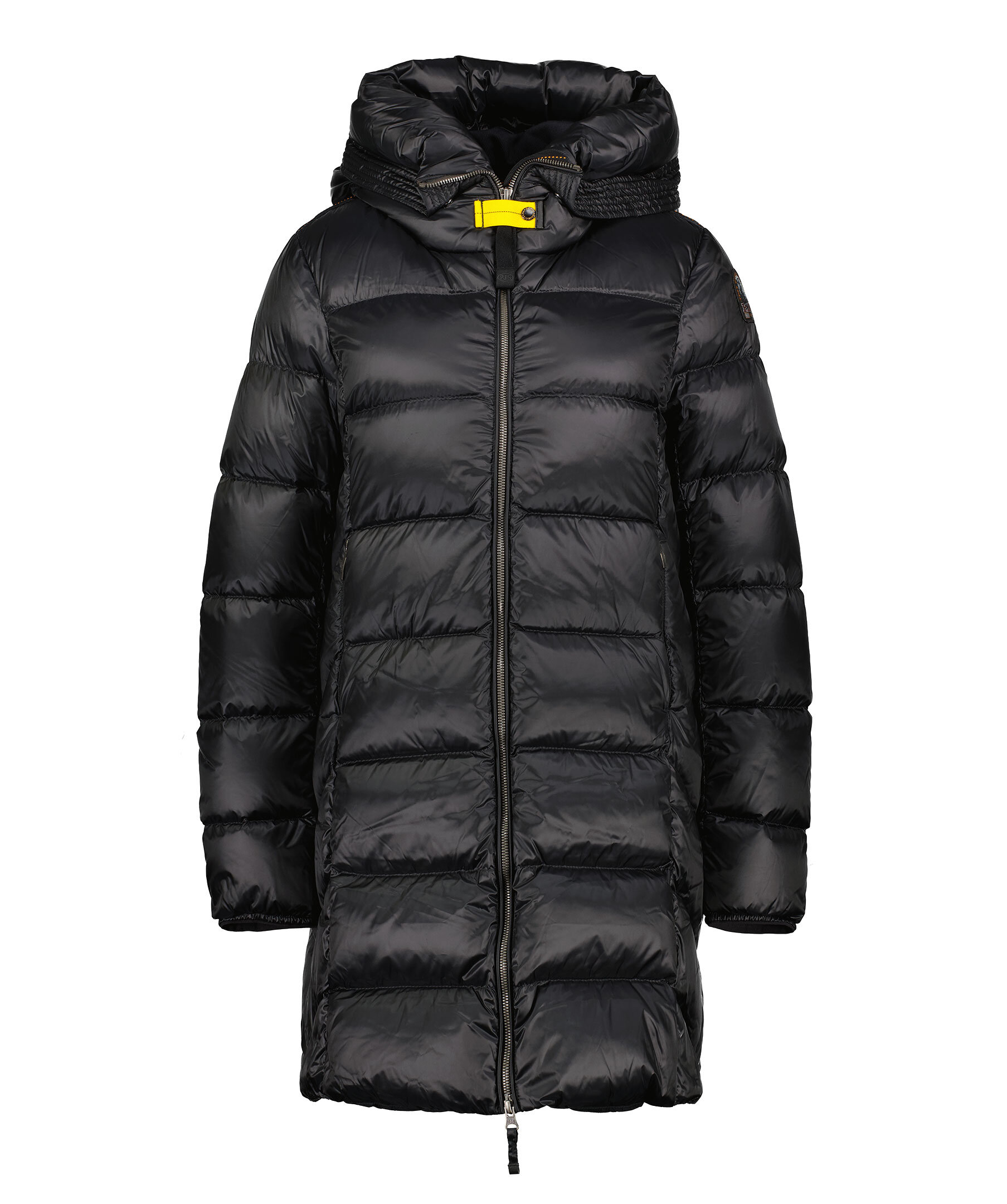 Svart, lång jacka med huva från Parajumpers. Marion är en klassisk pufferjacka med elegant design och i ett glänsande nylon-polyester twill. Stängs med tvåvägsdragkedja. Jackan har två sidfickor på utsidan samt en ficka på insidan. Patch-logotyp på vänster ärm.