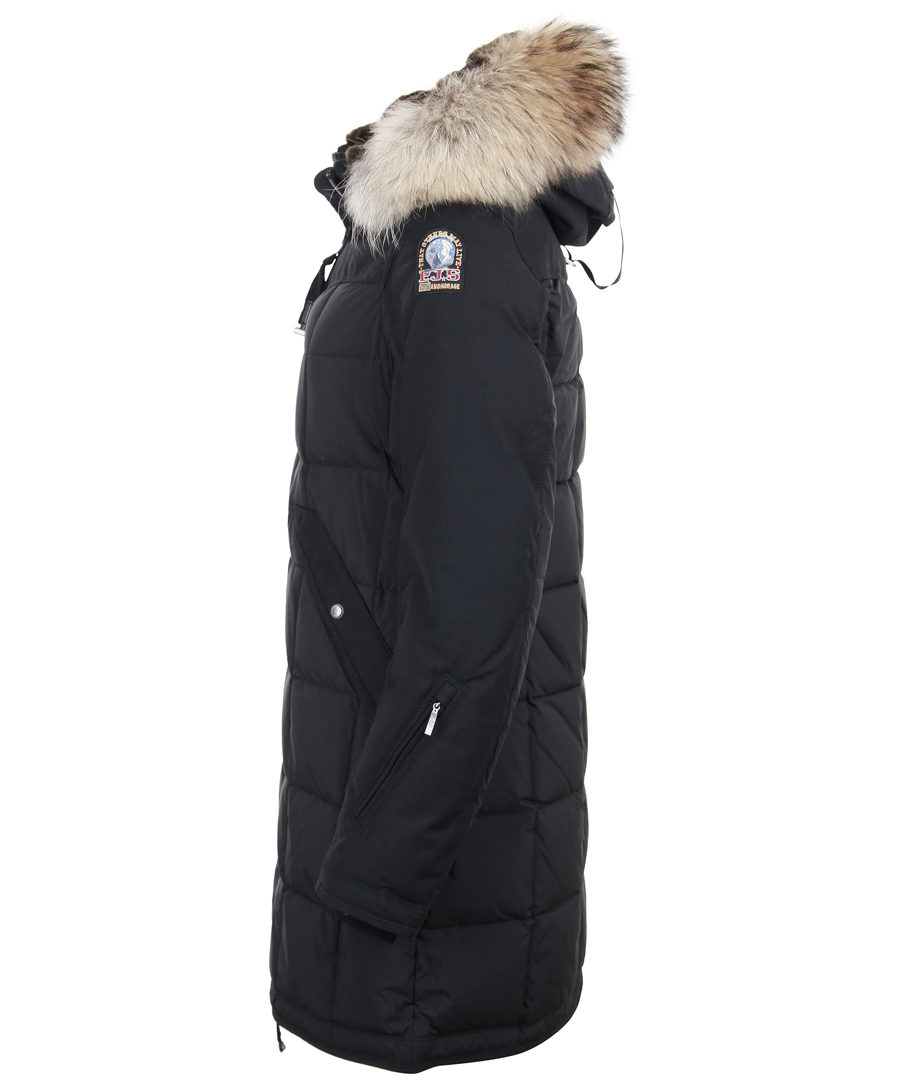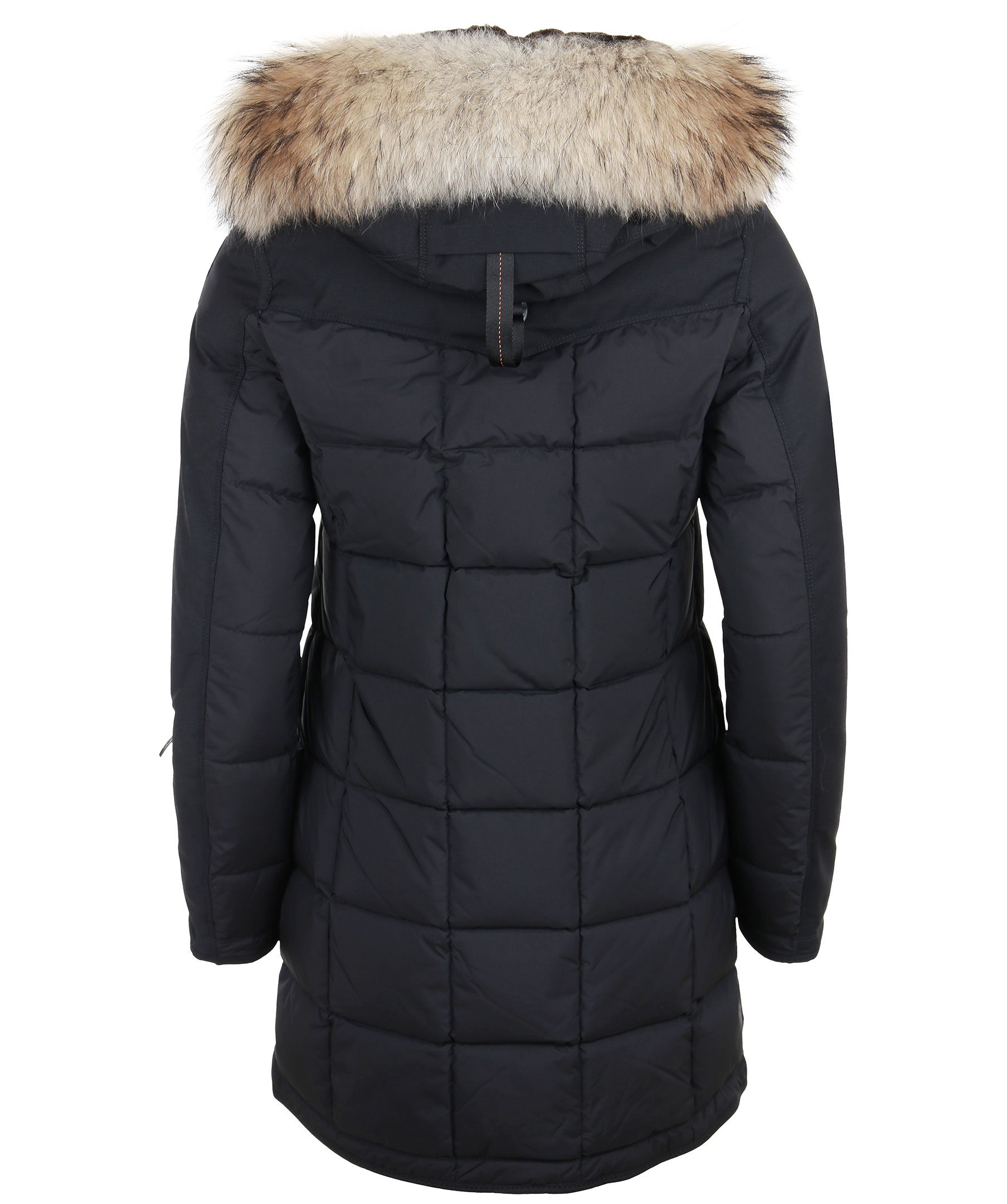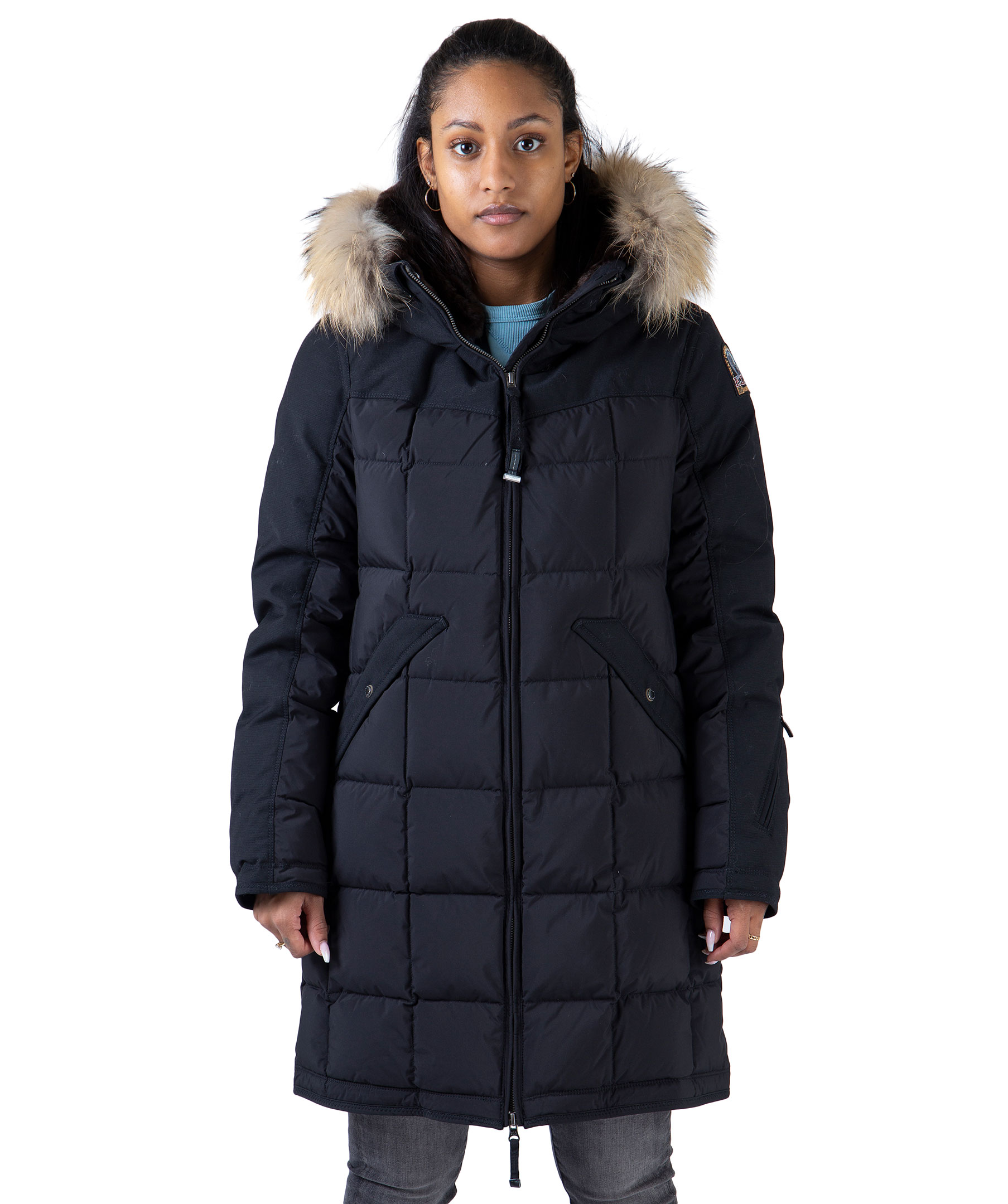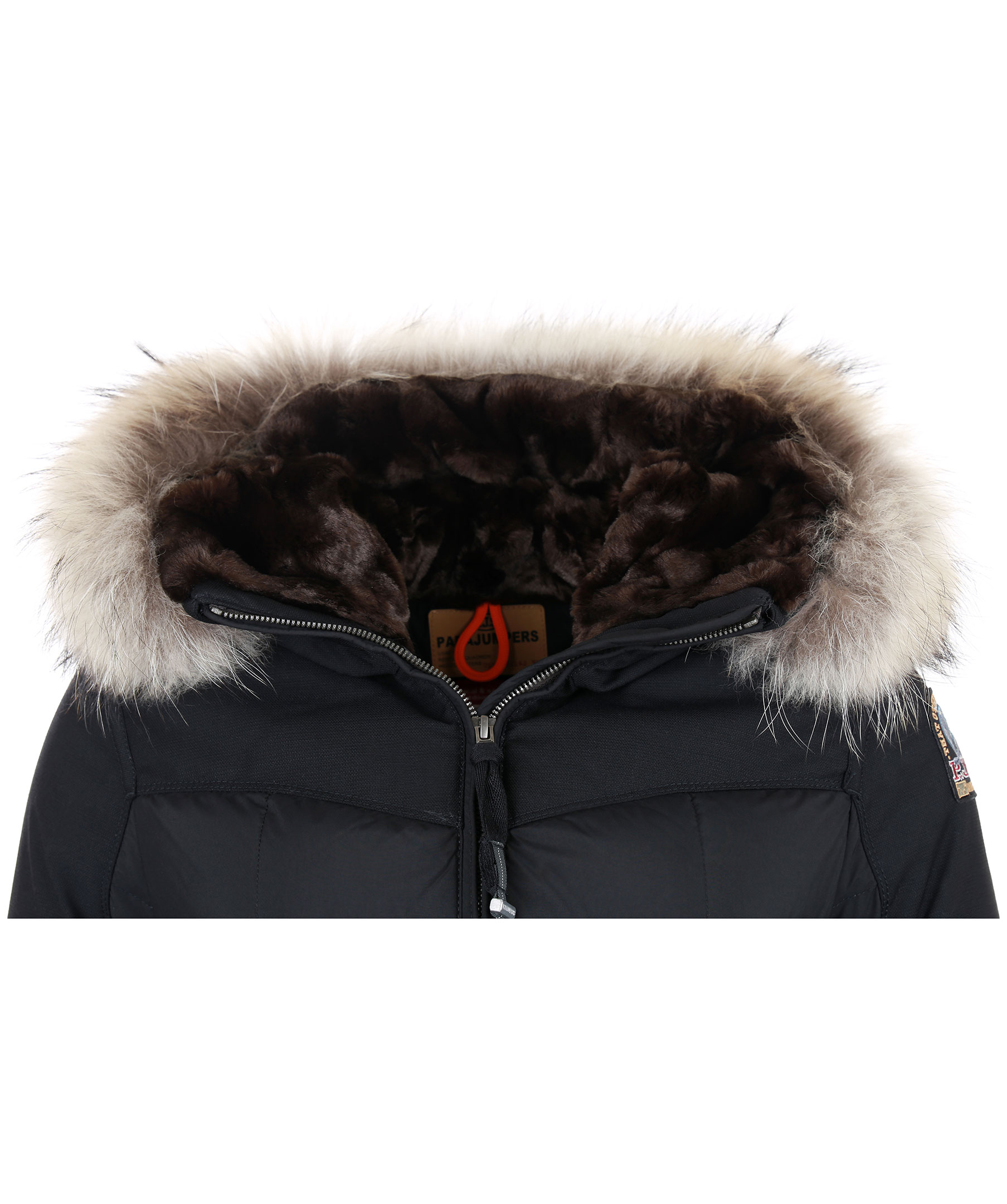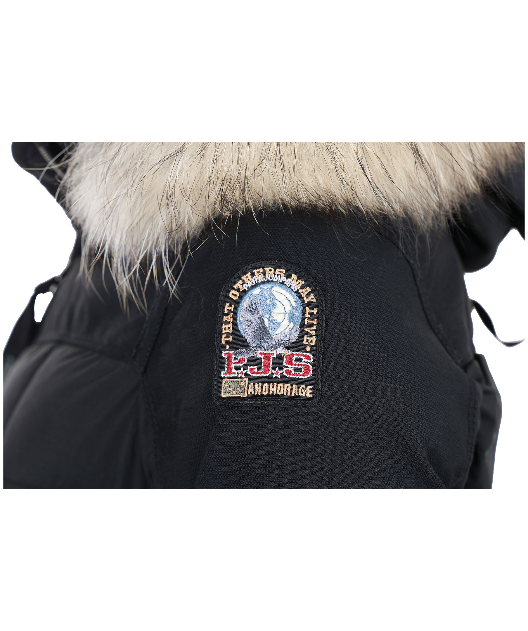 Svart dunjacka från Parajumpers i polyester- och ullblandning. Jackan är i en något längre modell och har luva med insida av faux fur och löstagbar krage i naturpäls. Praktiska fickor och patch med logotyp på vänster ärm. Modellen är 164 cm lång och bär storlek M.