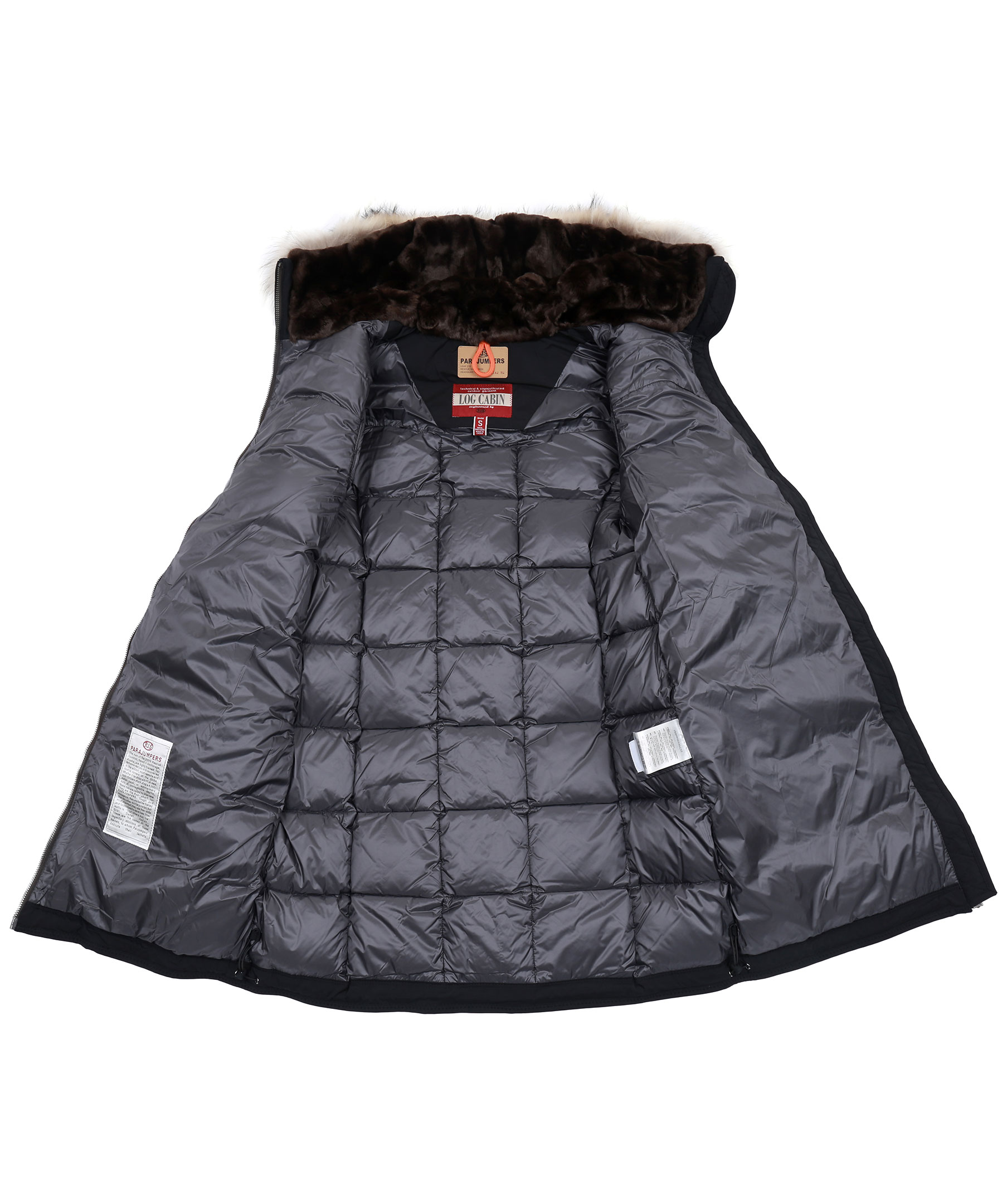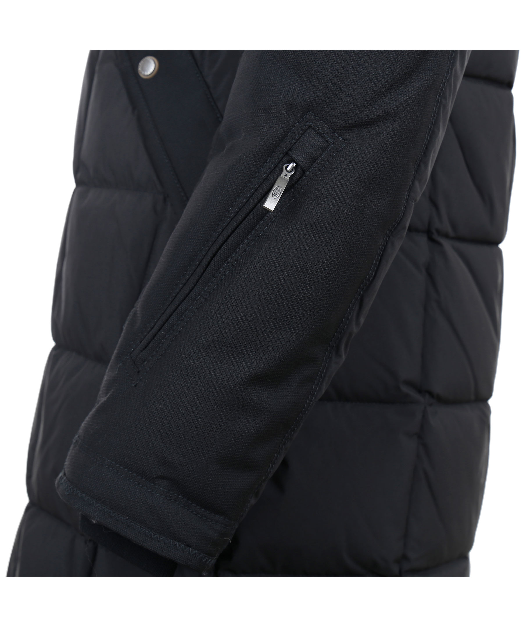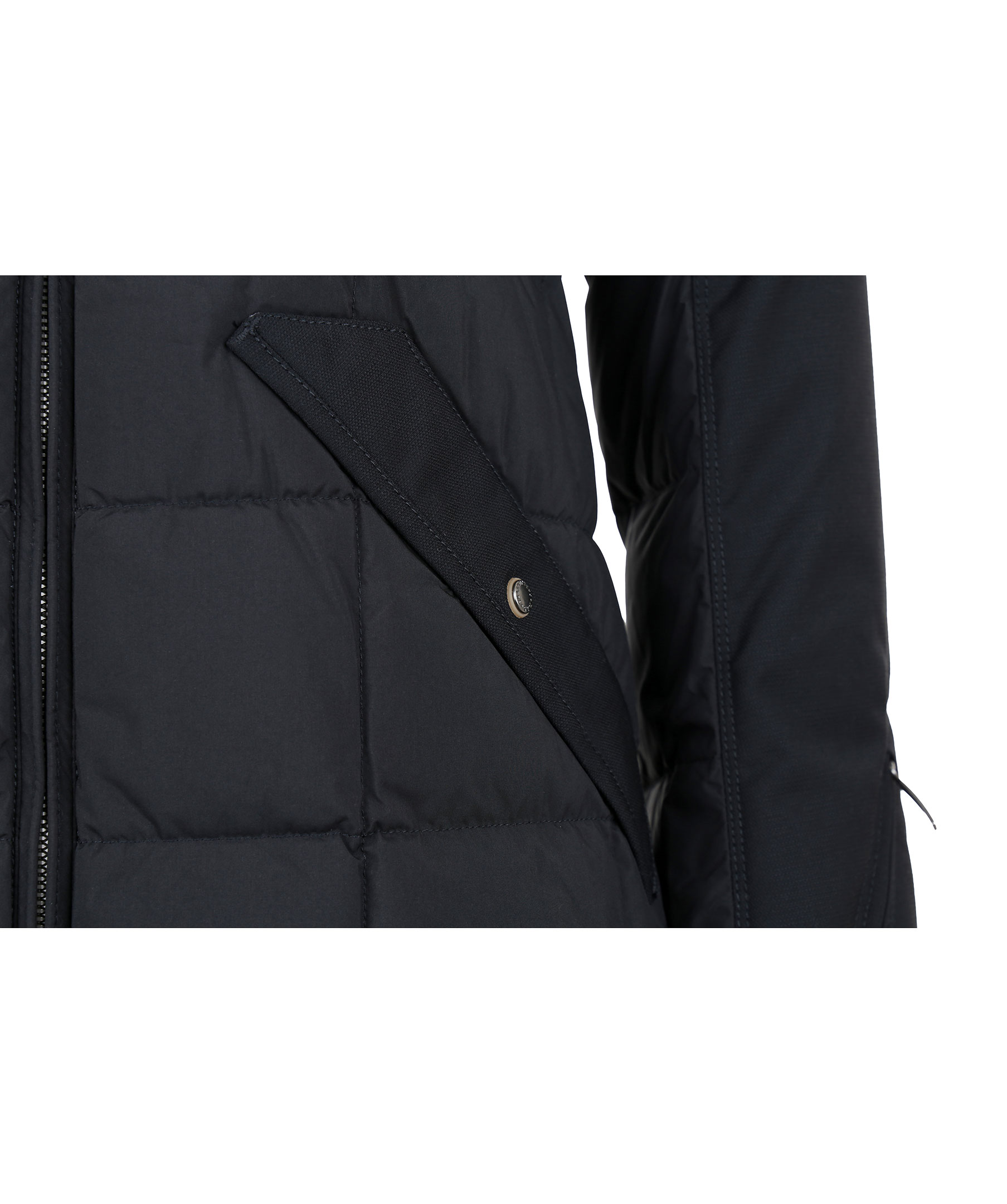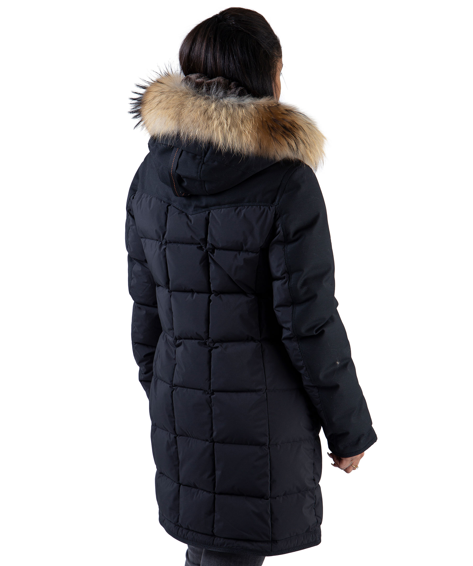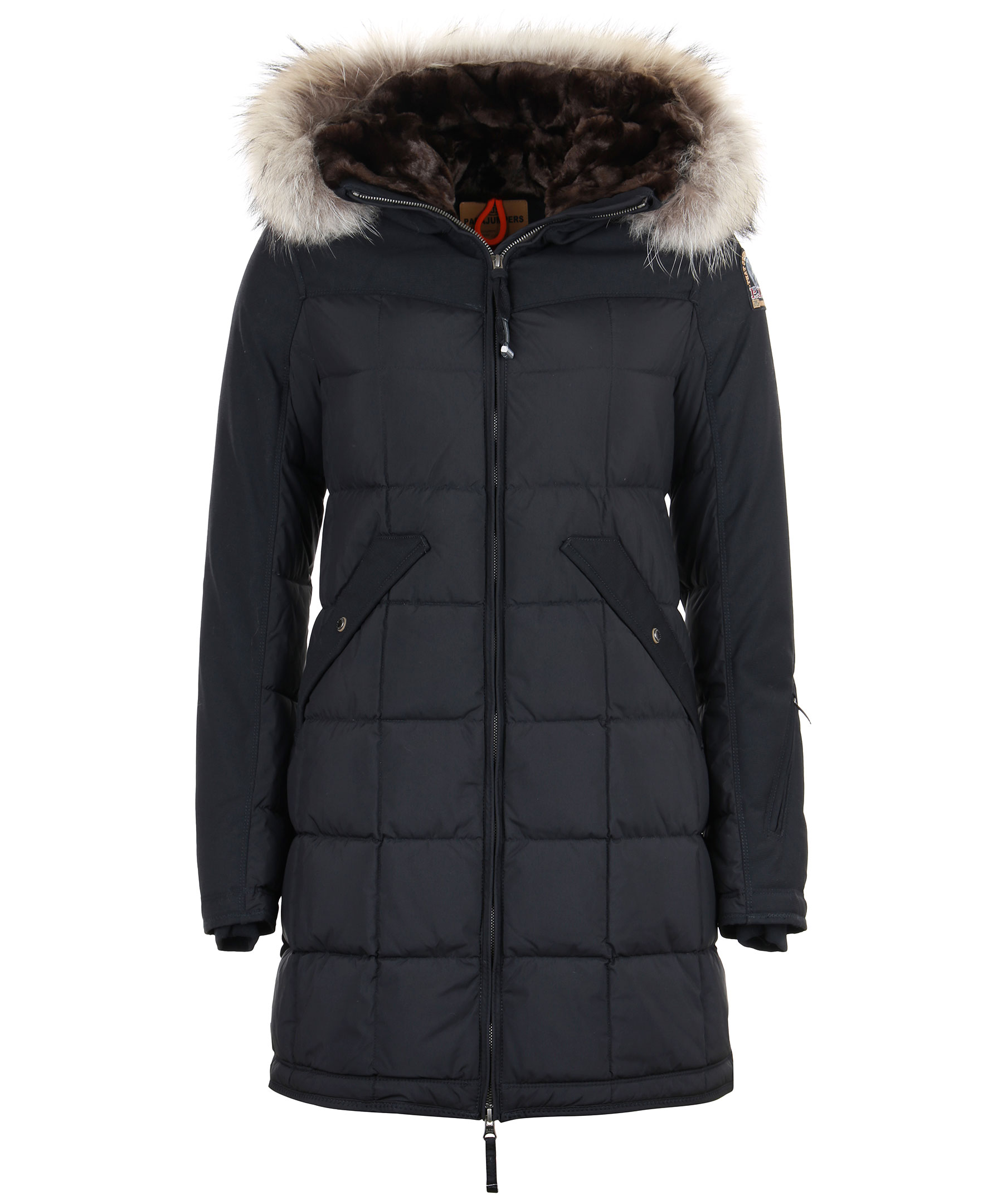 Svart dunjacka från Parajumpers i polyester- och ullblandning. Jackan är i en något längre modell och har luva med insida av faux fur och löstagbar krage i naturpäls. Praktiska fickor och patch med logotyp på vänster ärm. Modellen är 164 cm lång och bär storlek M.