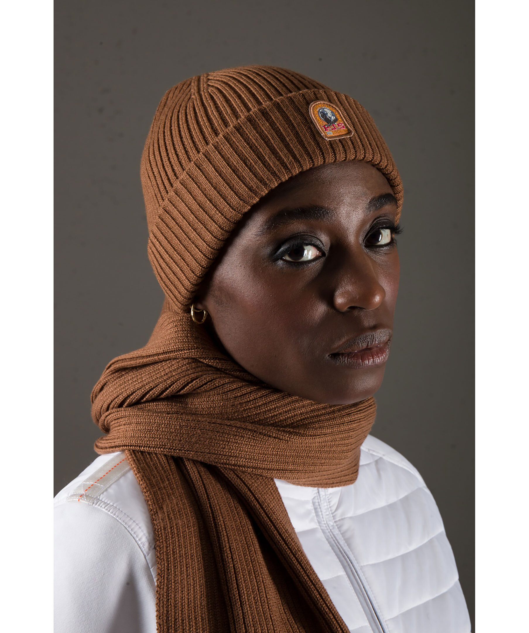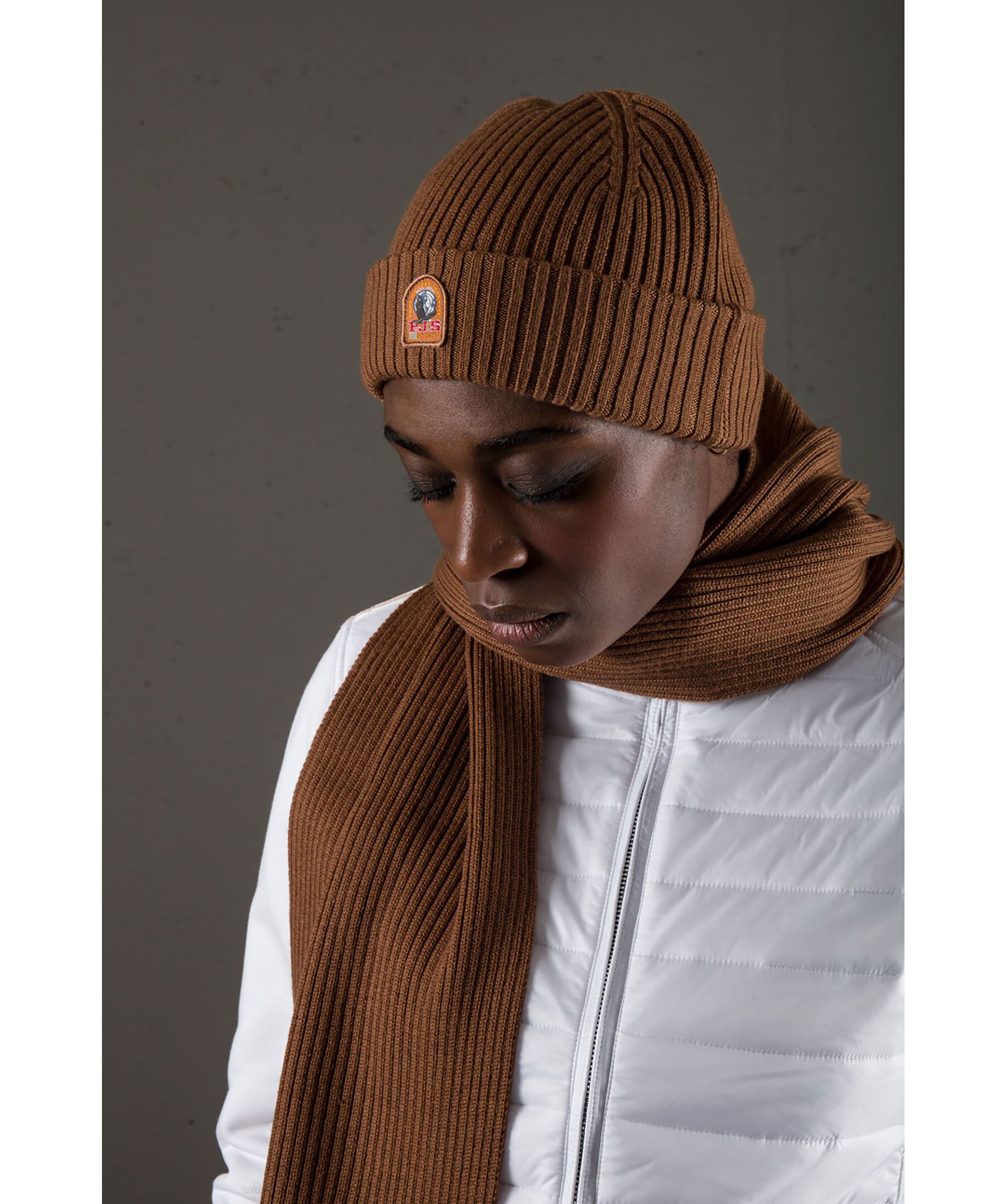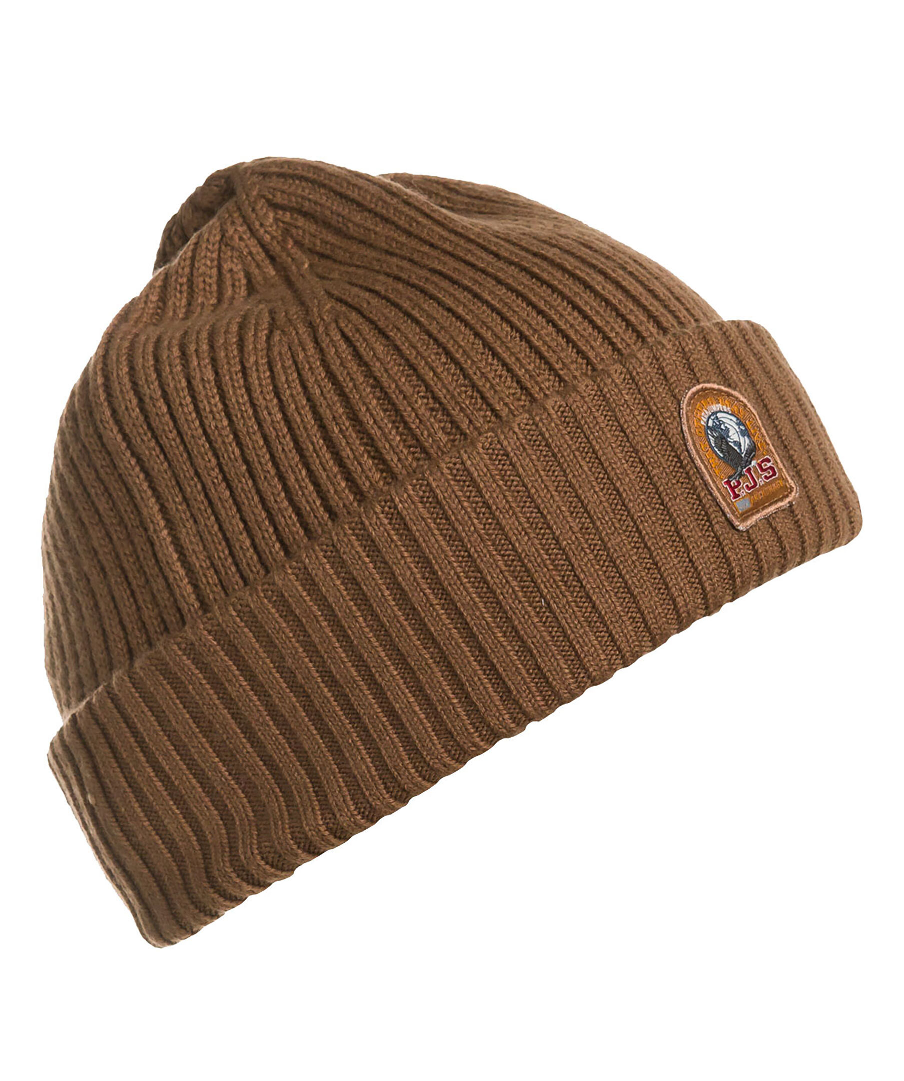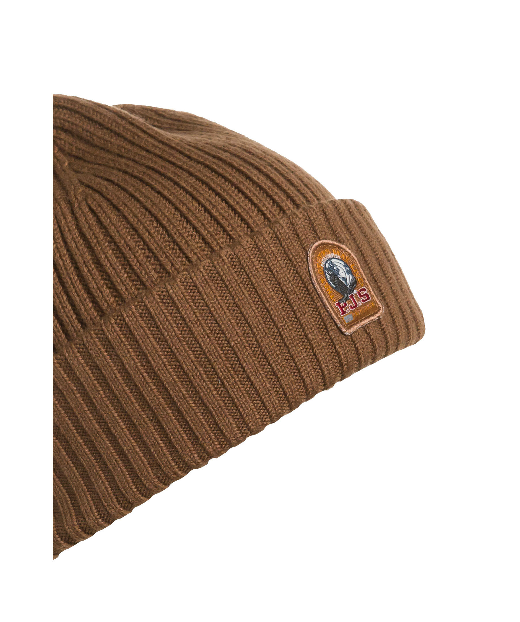 Brun ribbstickad mössa från Parajumpers. Liten broderad logga fram, uppvikt kant. Tillverkad i merinoullsblandning.