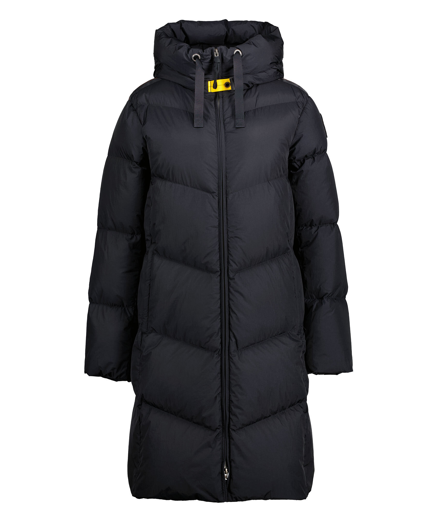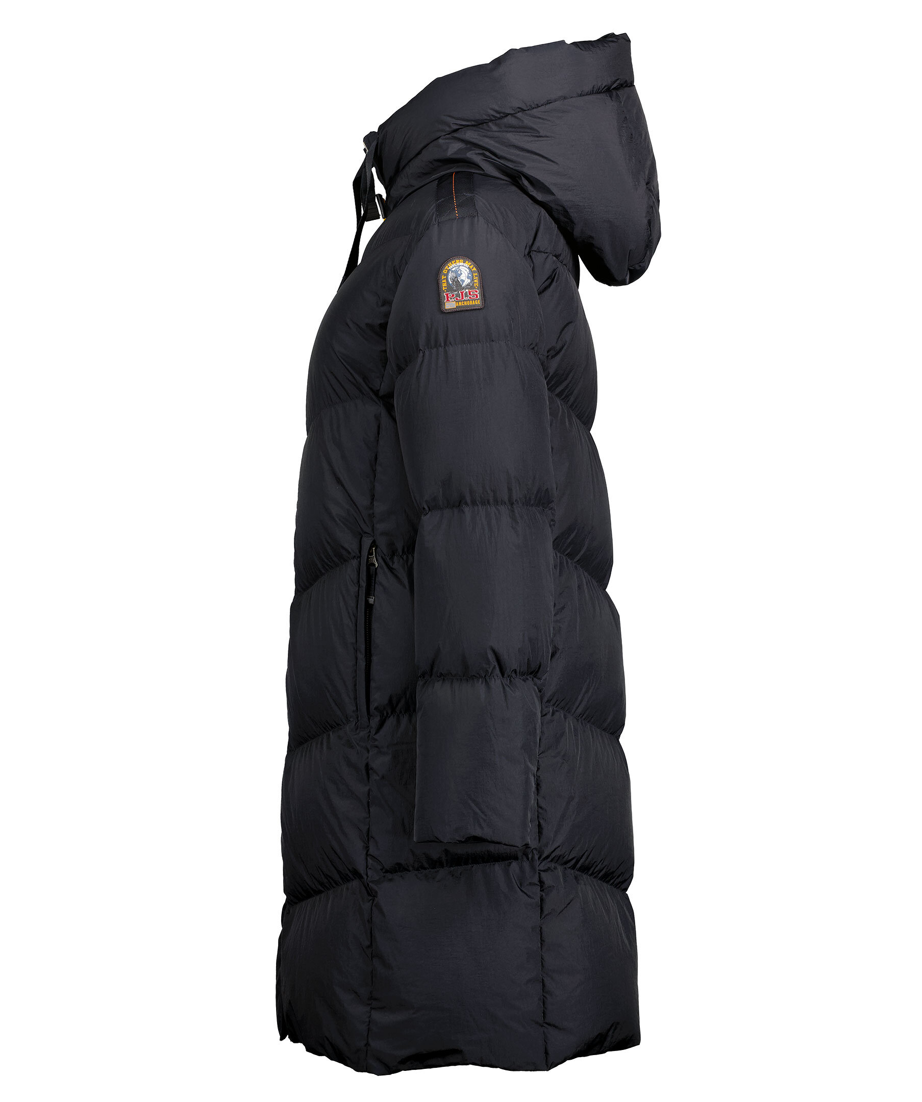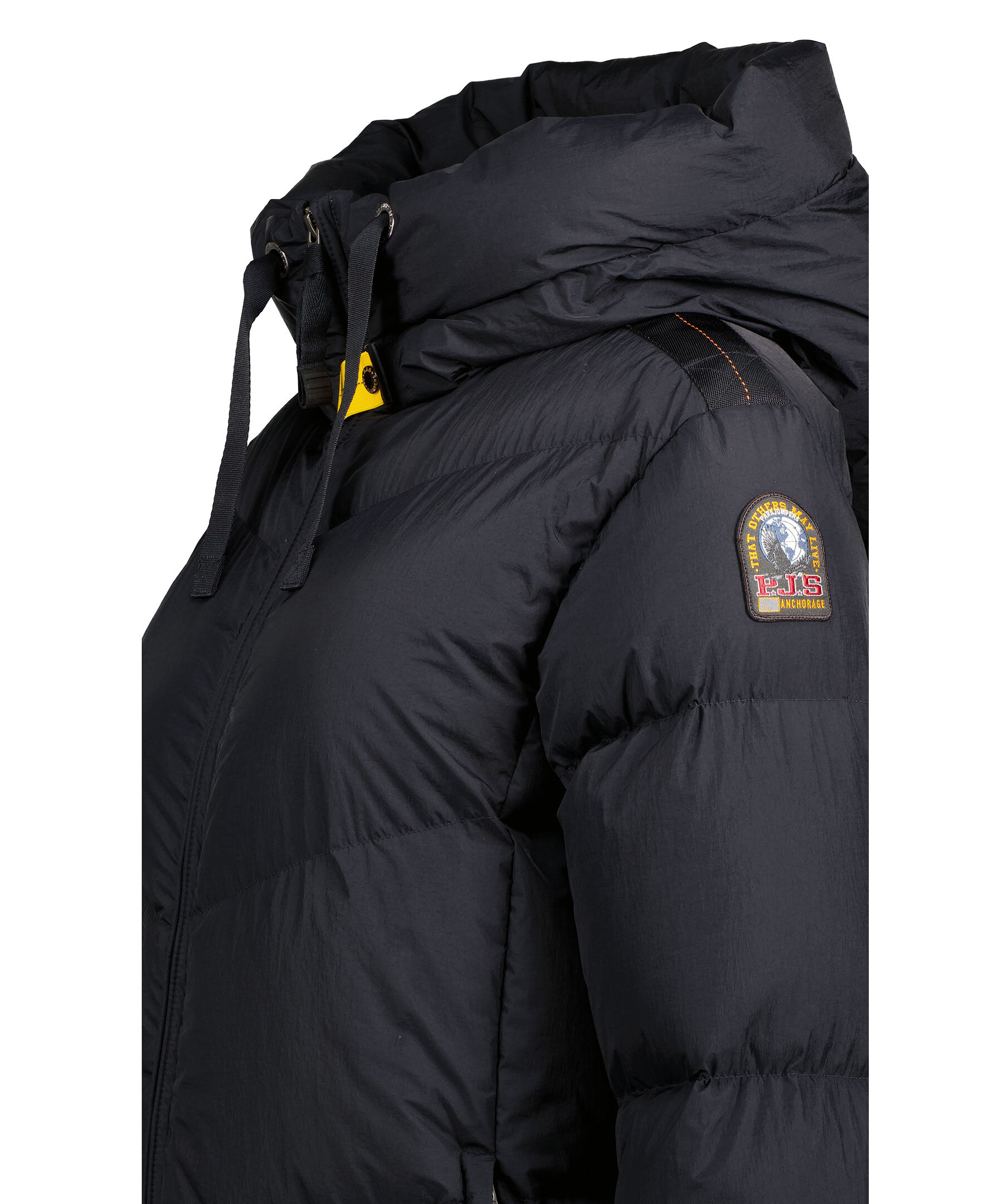 Svart jacka från Parajumpers. Skimrande tyg och extra mjuk fyllning för denna intressanta del av vinterkollektionen. Möt Rindou, en varm jacka för en självlysande look. Jackan har huva med dragsko, två sidfickor, patch logotyp på vänster ärm och stängs med tvåvägsdragkedja. Tillverkad i polyamide.
