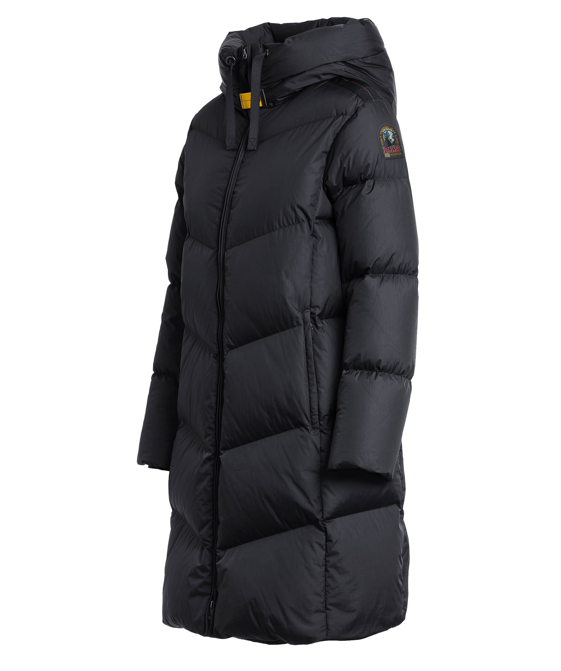 Svart, lång och quiltad pufferjacka från Parajumpers. Jacka stängs med tvåvägsdragkedja och har huva med dragsko, två sidfickor med dragkedja samt patch med logotyp på vänster ärm. Tillverkad i polyamid med dunfyllning. ■ OBS! Modellbilderna visar endast passform