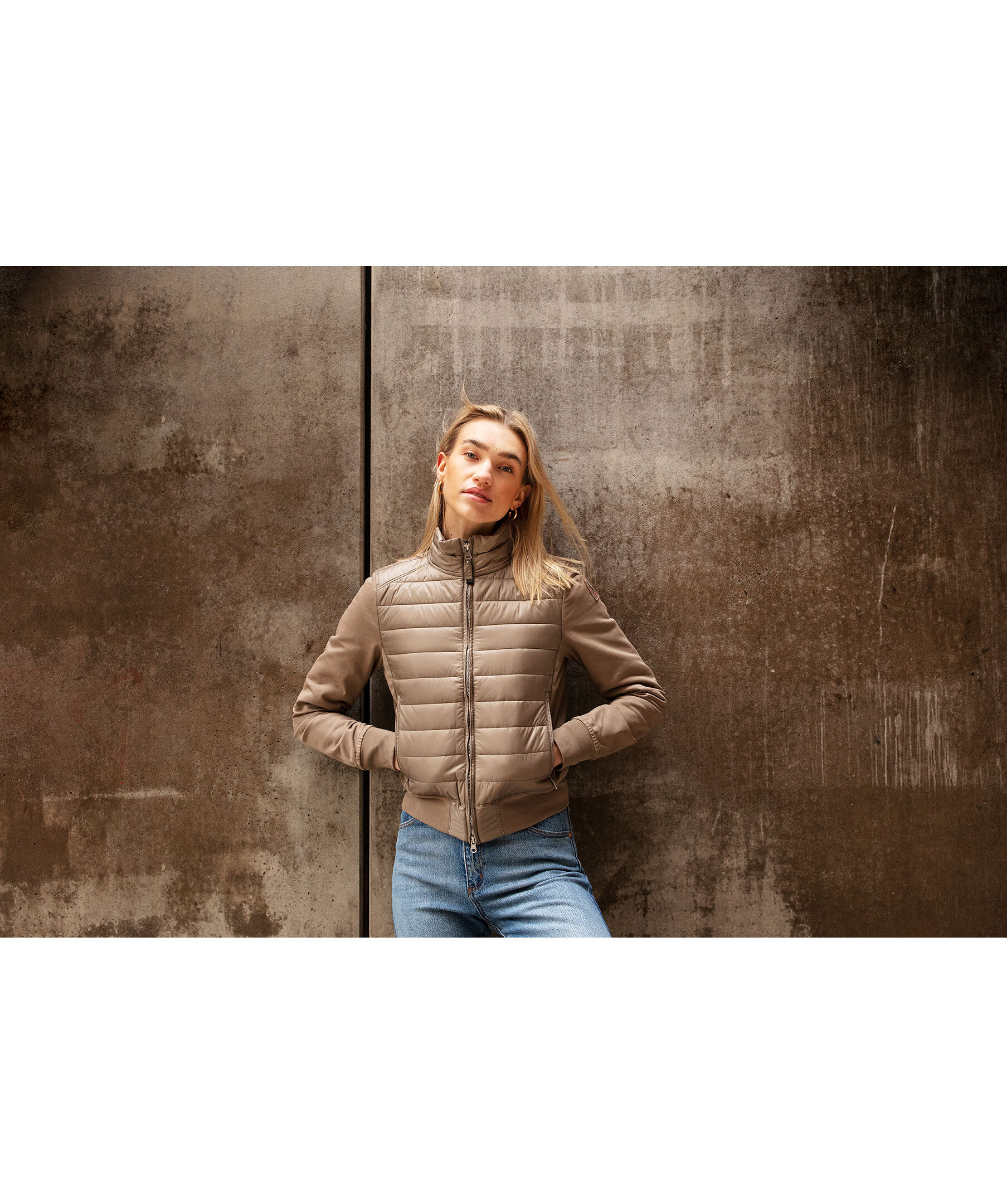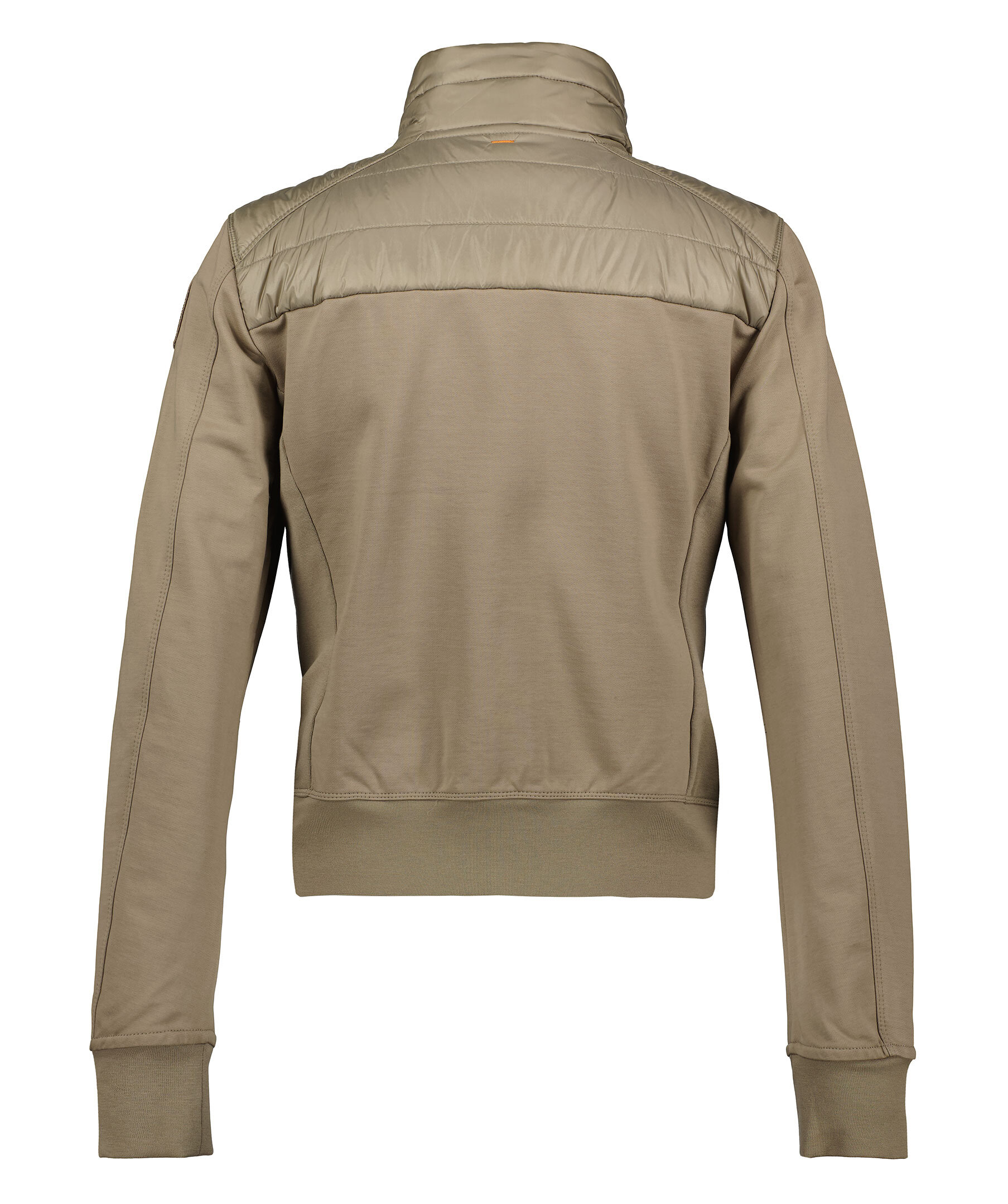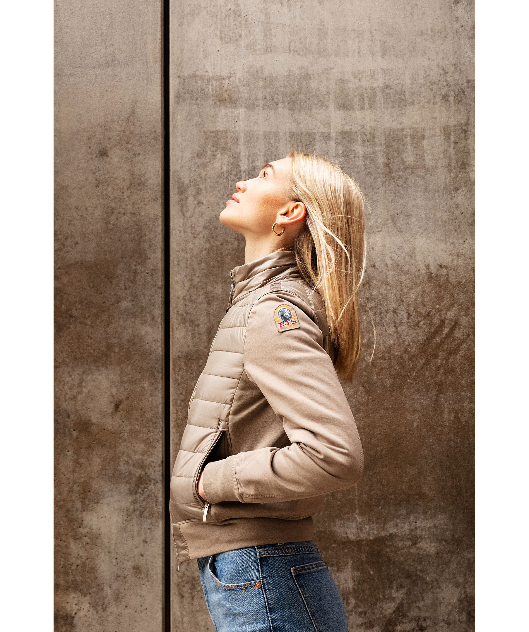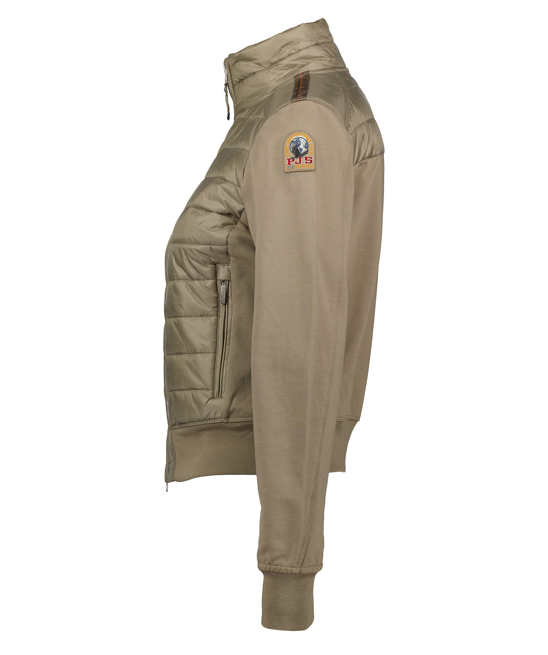 Beige hybridjacka från Parajumpers. Quiltad vadderad panel från Parajumpers på jackans framsida och nacken. Ärmar i bomullsblandning. Bröstficka på vänster sida som stängs med dragkedja. två fickor framtill som stängs med dragkedja. Ribbstickade muddar i ärm-, plaggslut och i sidan av jackan. Patch med logotyp på vänster ärm. Modellen är 179 cm lång och har på sig storlek S.