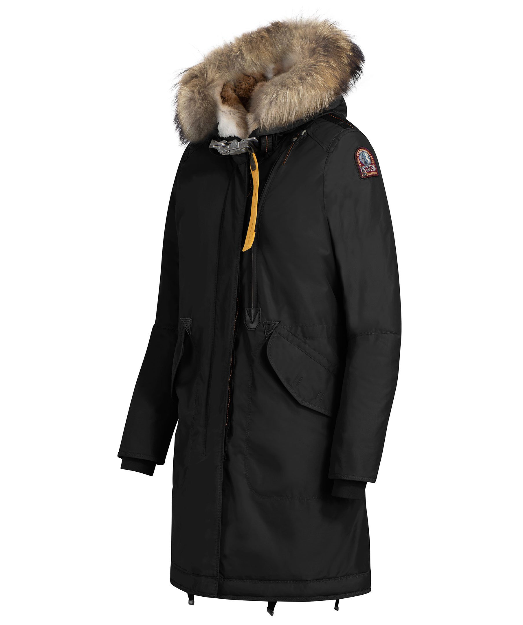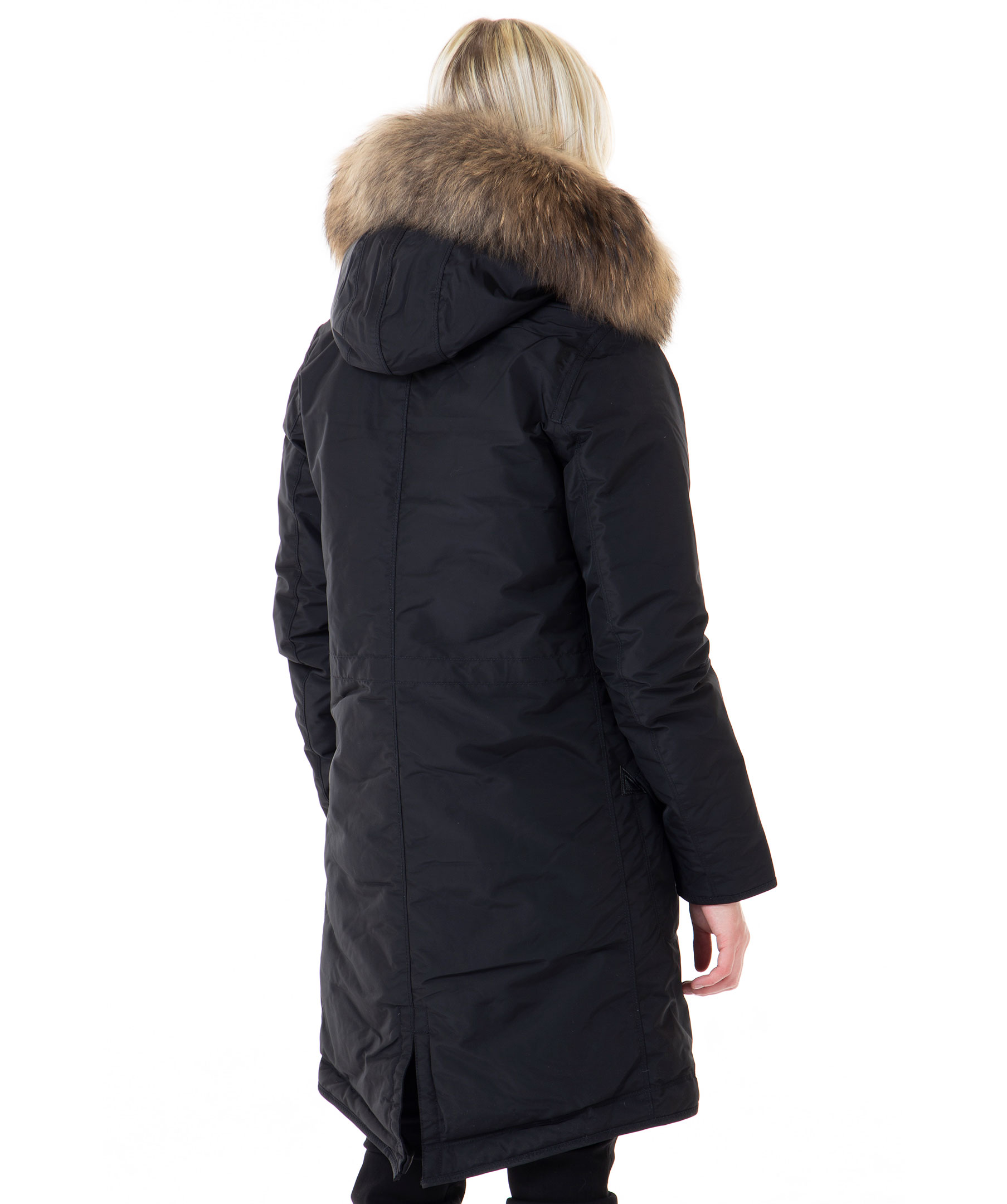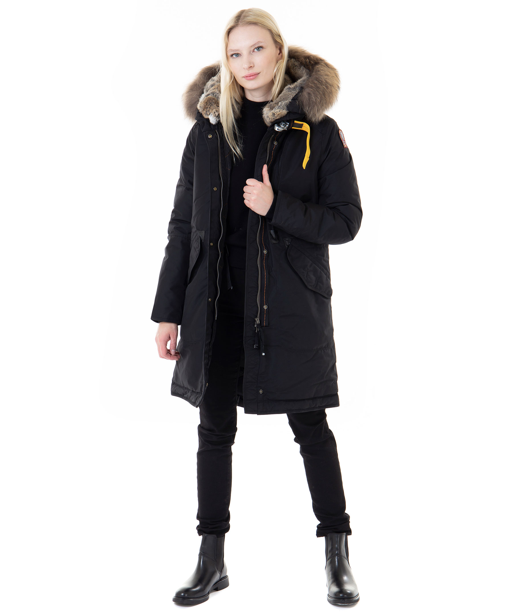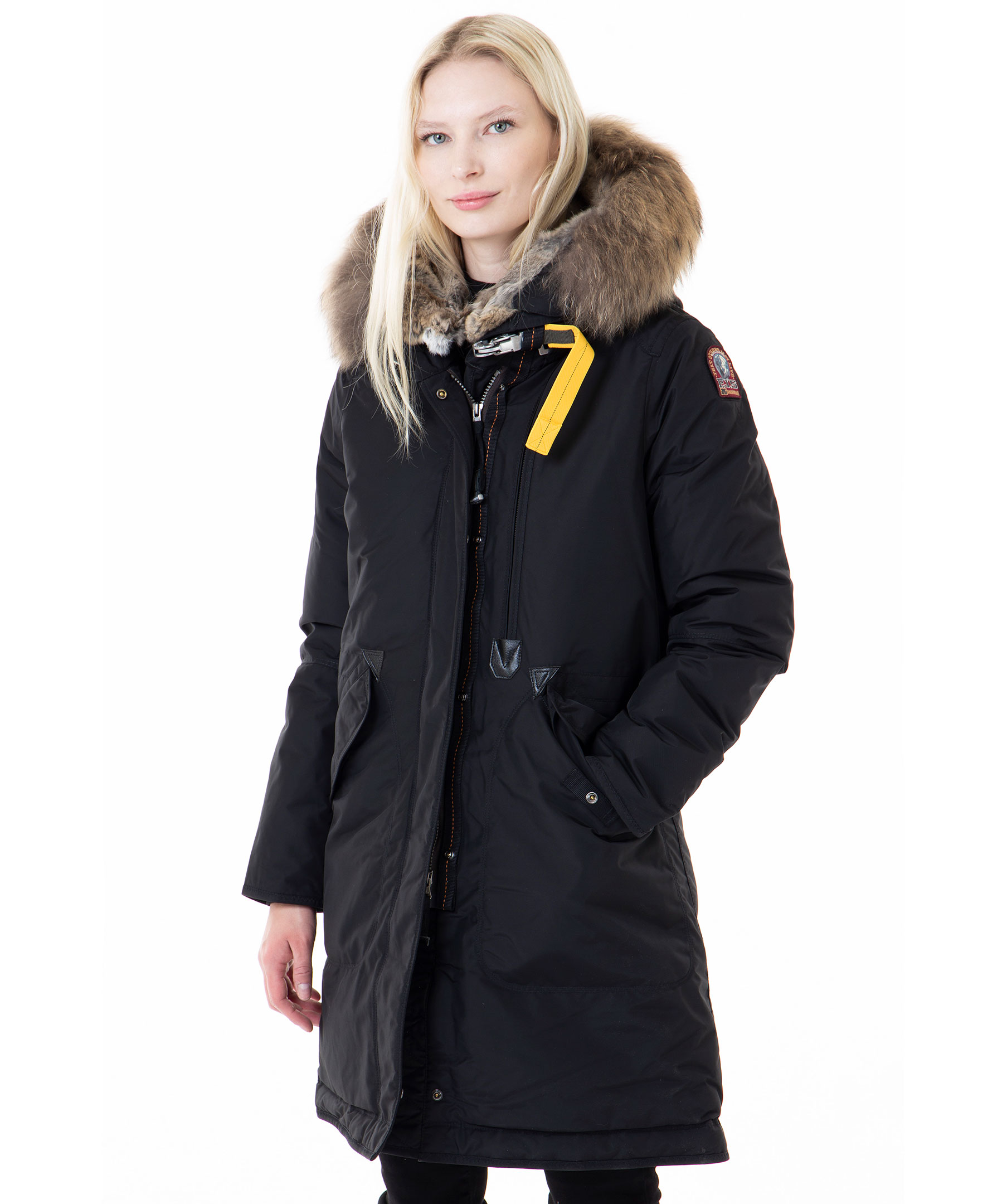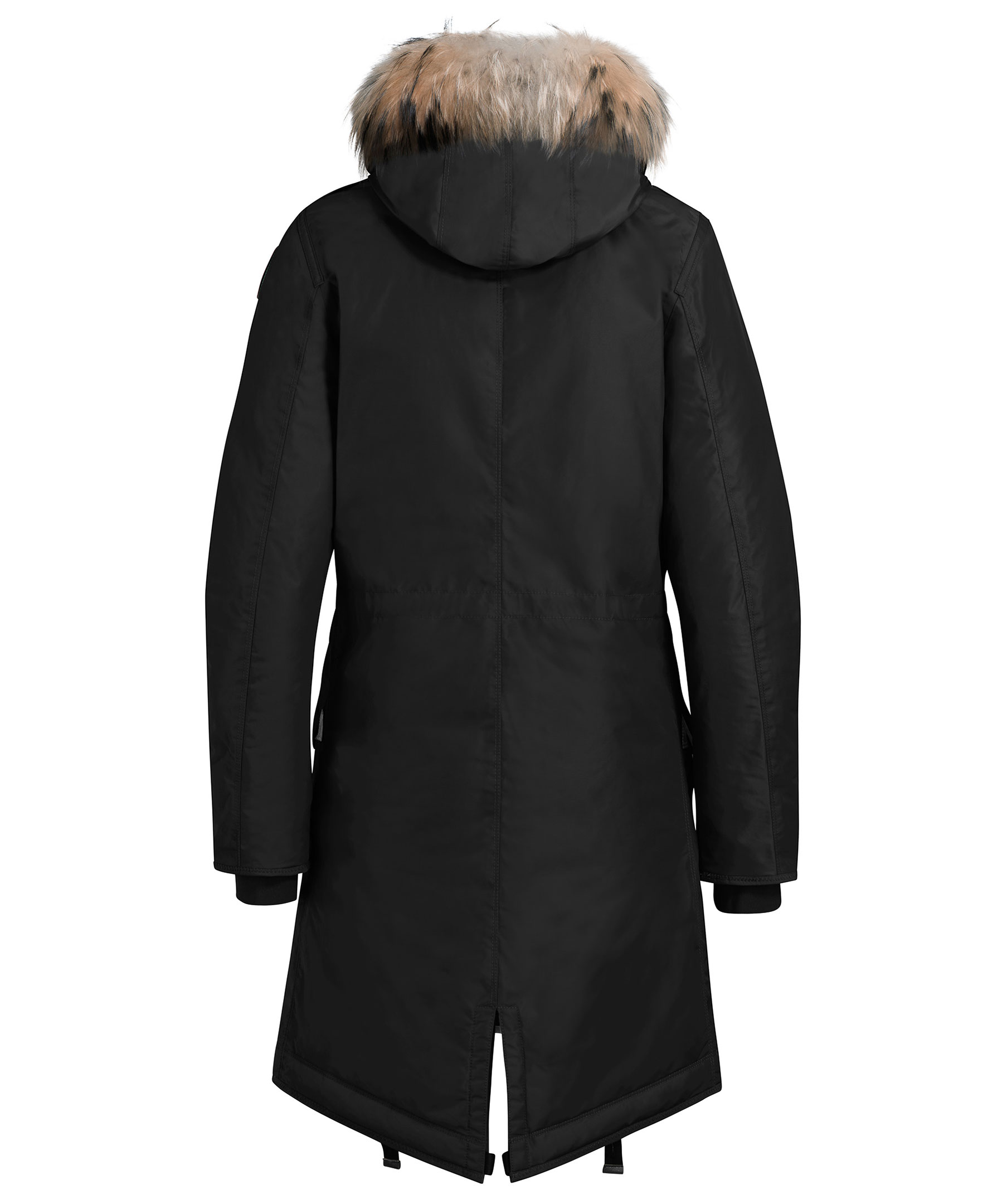 Svart, lång dunjacka från Parajumpers. Två framfickor som stängs med knapp och en bröstficka som stängs med dragkedja. Stort löstagbart spänne i halsen och päls på och i luvan. Stängs med dragkedja och tryckknappar. Midjan är justerbar med ett band och det finns en dragsko längst ner. Tvåvägsdragkedja och ribbade muddar på ärmslut och broderad logotyp på ärmen. Ingår i Parajumpers Masterpiece Series bestående av deras exklusivaste modeller. Modellen är 173 cm lång och bär storlek S. TIPS! Ånga pälsen för att få den stor och fluffig. OBS! Naturpälsar är unika och kan skilja sig från bilden.