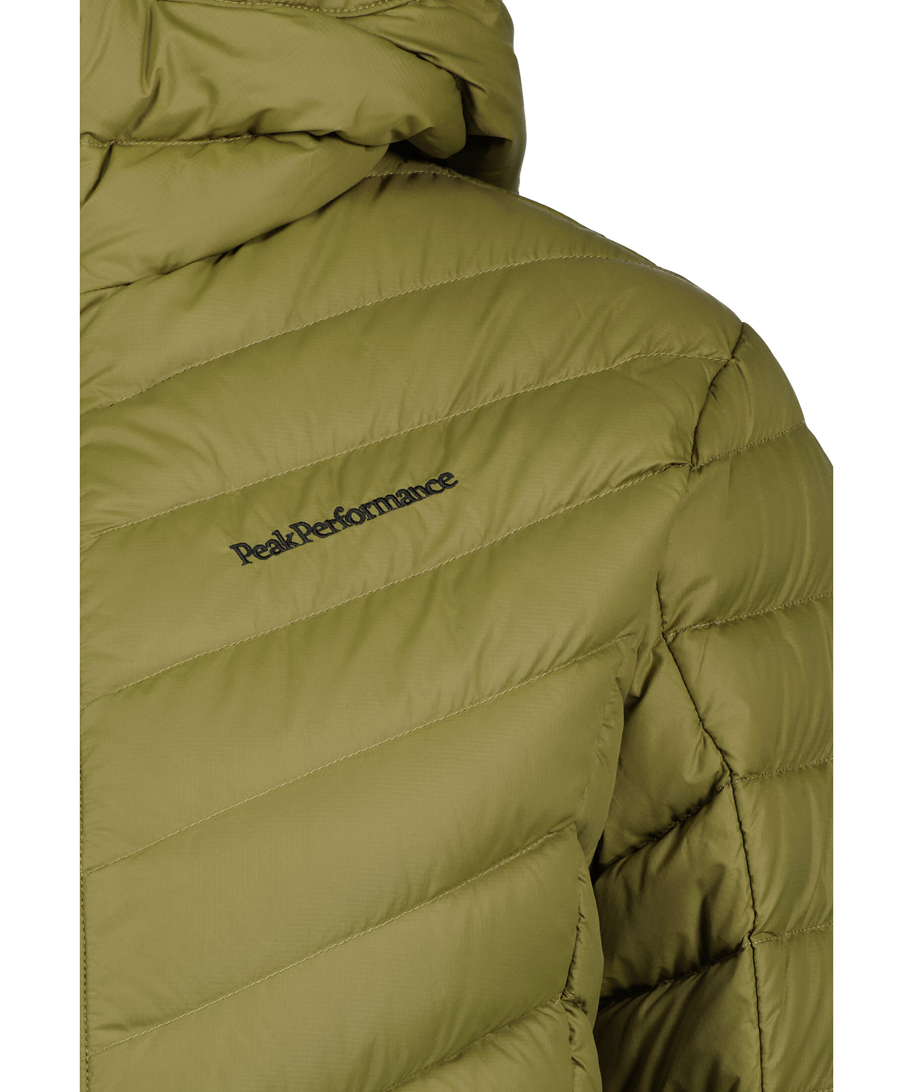 Olivgrön jacka från Peak Performance. Den här lätta packningsbara liner-jackan fungerar lika bra som ytterlager som under en skaljacka för extra vaddering. Den är tillverkad av återvunnen polyamid och är fylld med förstklassigt 90/10 ankdun/fjädrar för exceptionell värme. Elastiska ärmslut, fickor med dragkedja och en tättslutande huva ger maximalt skydd. Peak Performance-brodyr på bröstet och P-logotyp brodyr på ärmen.