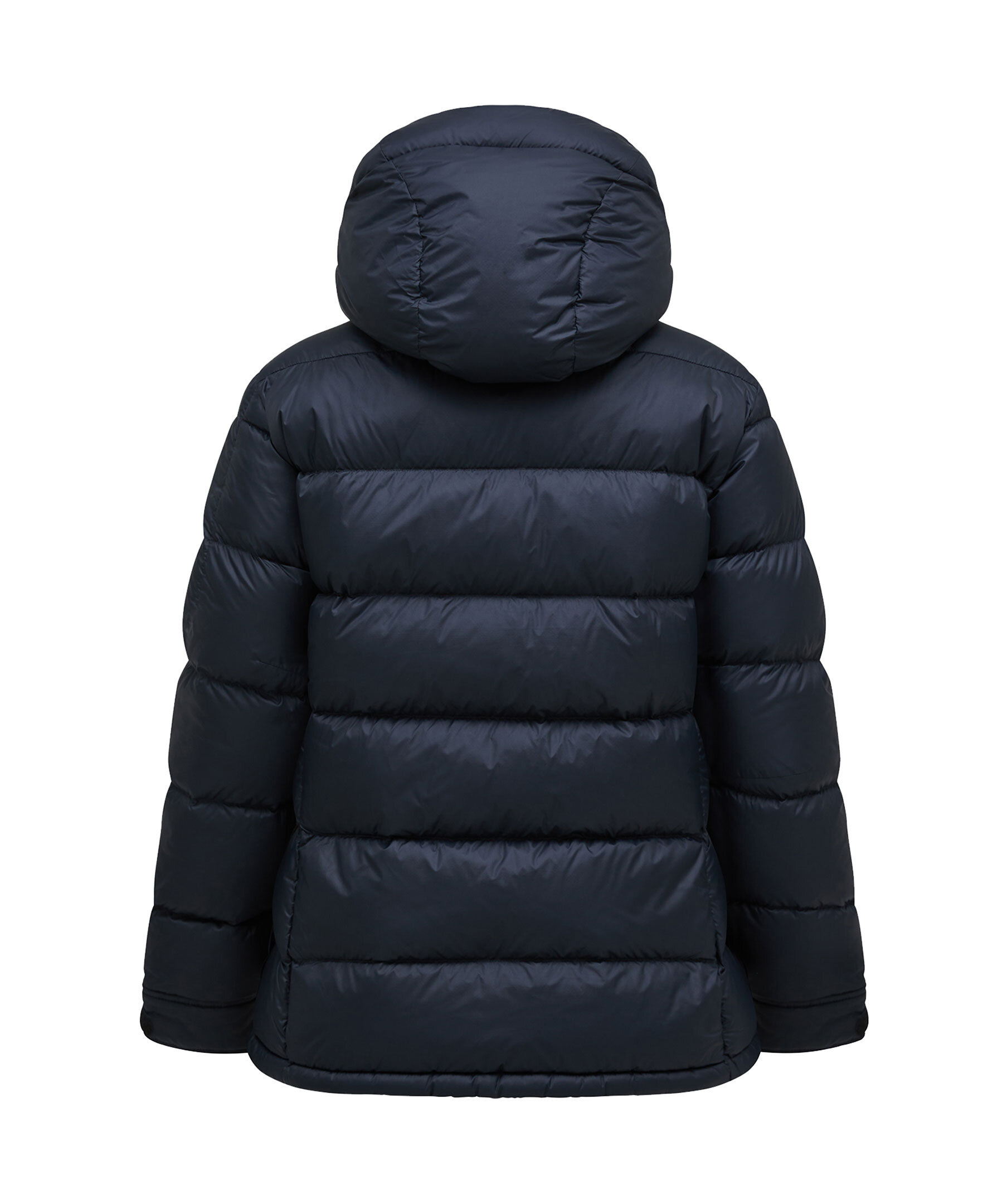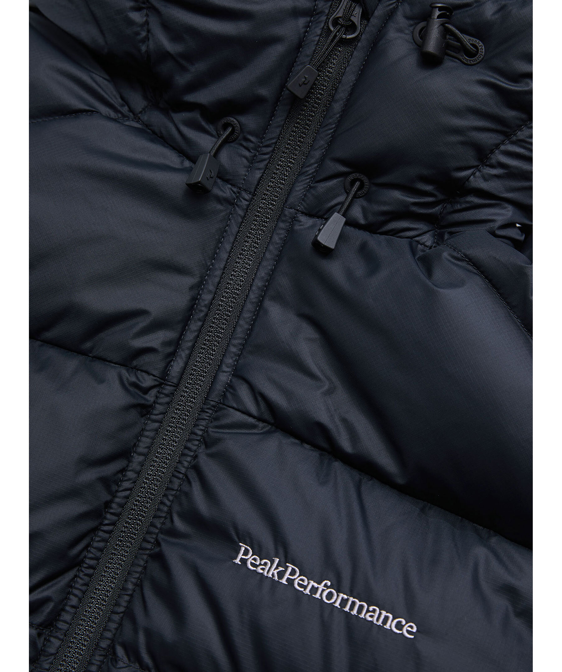 Svart, dunjacka i puffermodell med luva från Peak Performance. Jackan kombinerar värme och mjukhet med en lätt, packningsbar konstruktion. En mångsidig jacka, både när det kommer till funktion och stil. Justerbart ärmslut med kardborreband, yttre upphängningsögla i nacken, Peak Performance-brodyr på bröstet och P-logotyp brodyr på ärmen. Fast och tvåvägs (höjd och bredd) justerbar huva, hellång YKK reversed coil dragkedja fram och fleecefodrat hakskydd. Handfickor med dragkedja, inre förvaringsficka i mesh, liftkortficka med dragkedja och innerficka med dragkedja. Tillverkad av återvunnen polyamid och fylld med premium 90/10 ankdun/fjädervaddering som ger exceptionell värme.