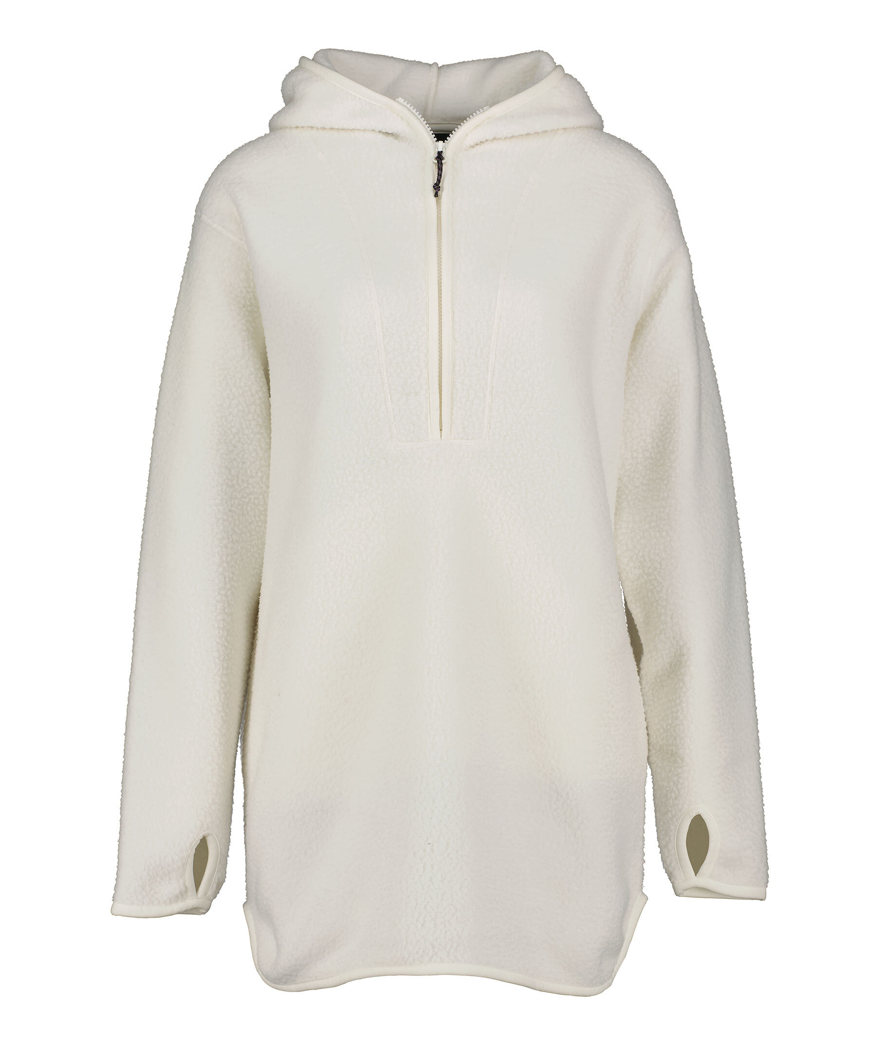 Vit dubbelsidig Pile med half-zip och luva från Peak Performance. Tumhål vid ärmslut. Smal elastisk mudd i krage, ärm- och plaggslut. Broderad logotyp i vitt vid halsen.