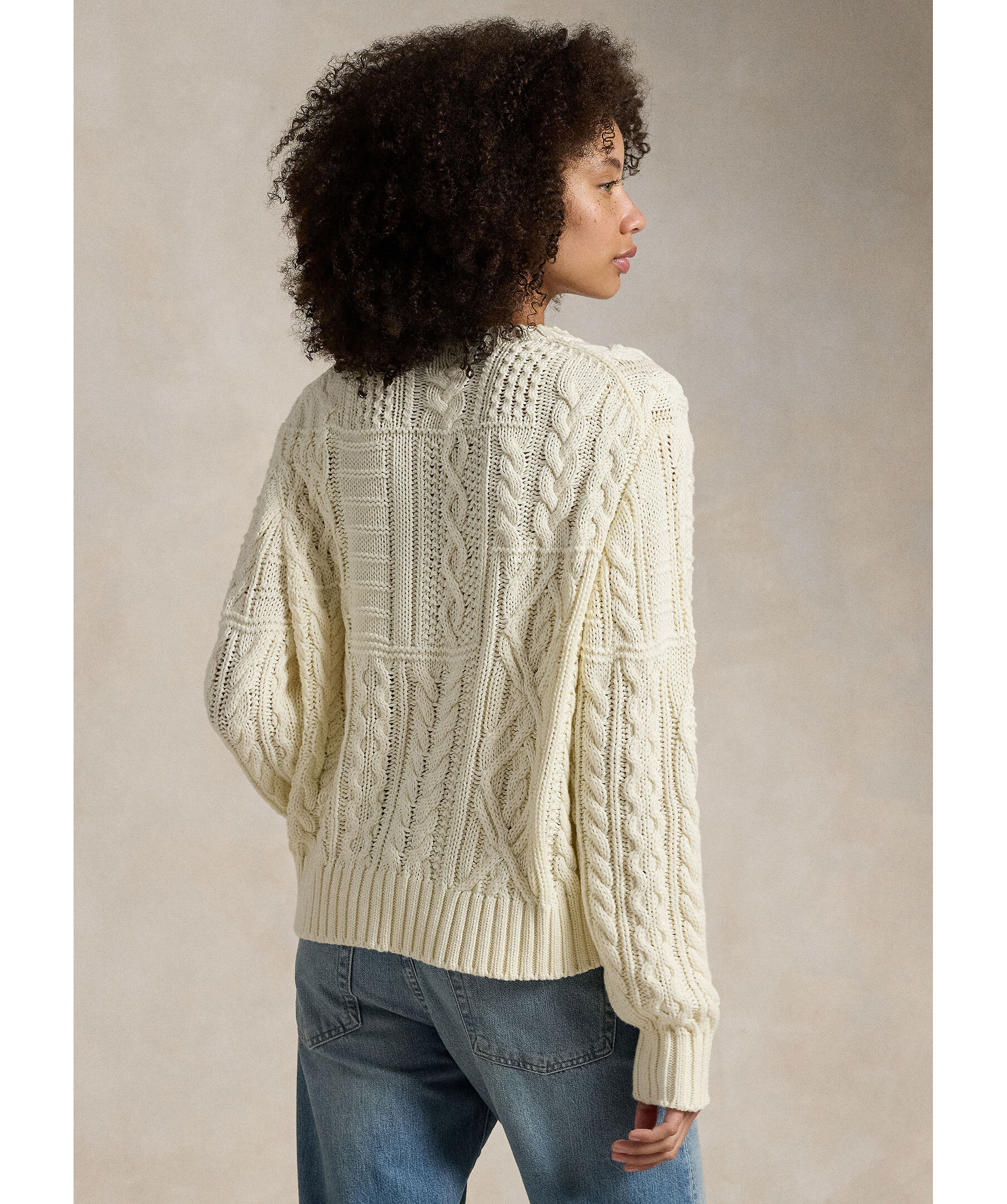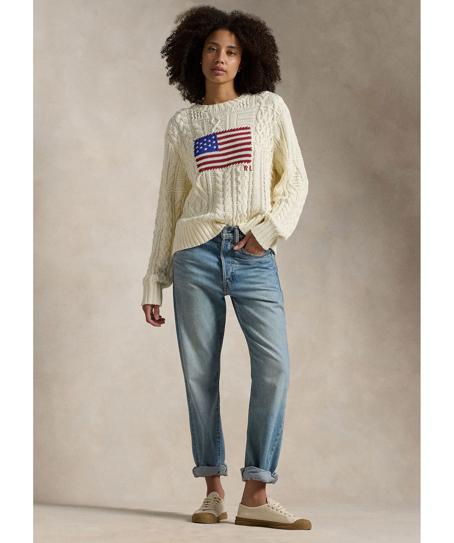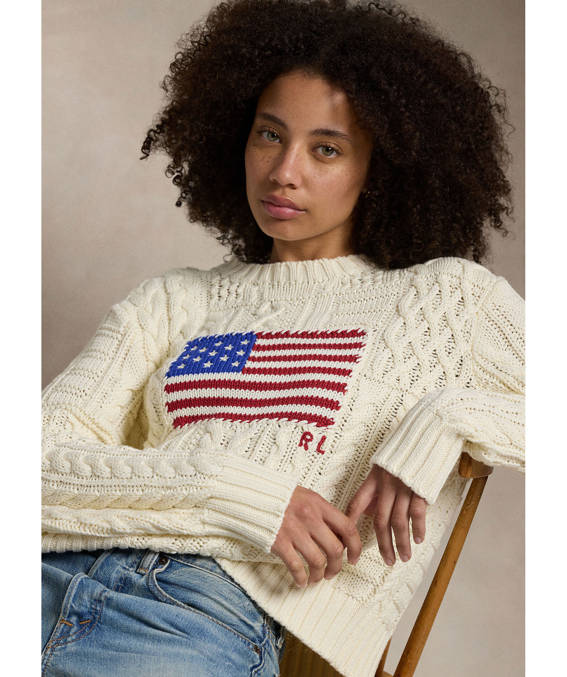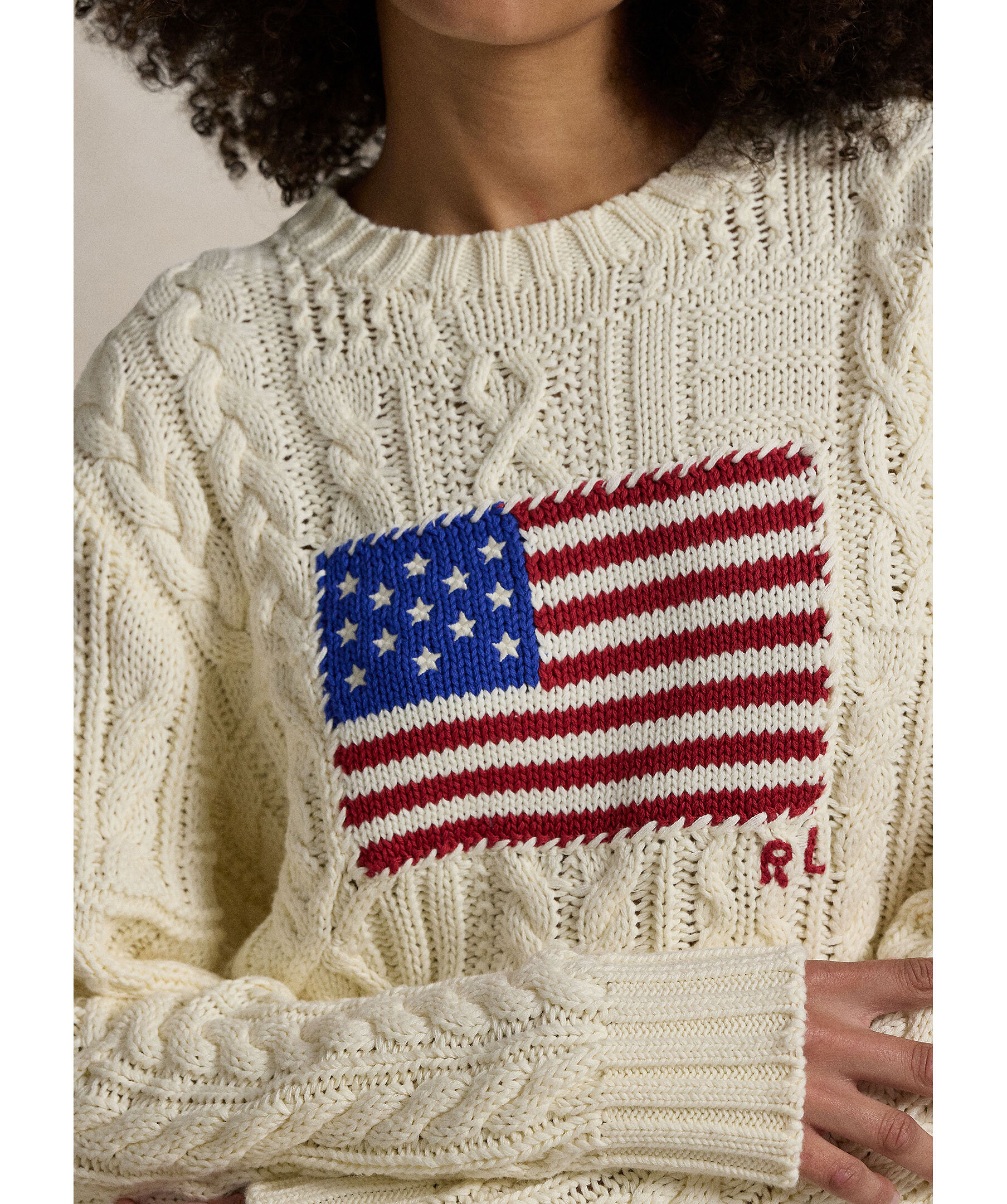Krämvit, kabelstickad tröja från Polo Ralph Lauren. Tröjan har den amerikanska flaggan broderad över bröstet, rund och ribbstickad halsringning samt ribbstickade muddar vid ärm- och plaggslut. Tillverkad i bomull.