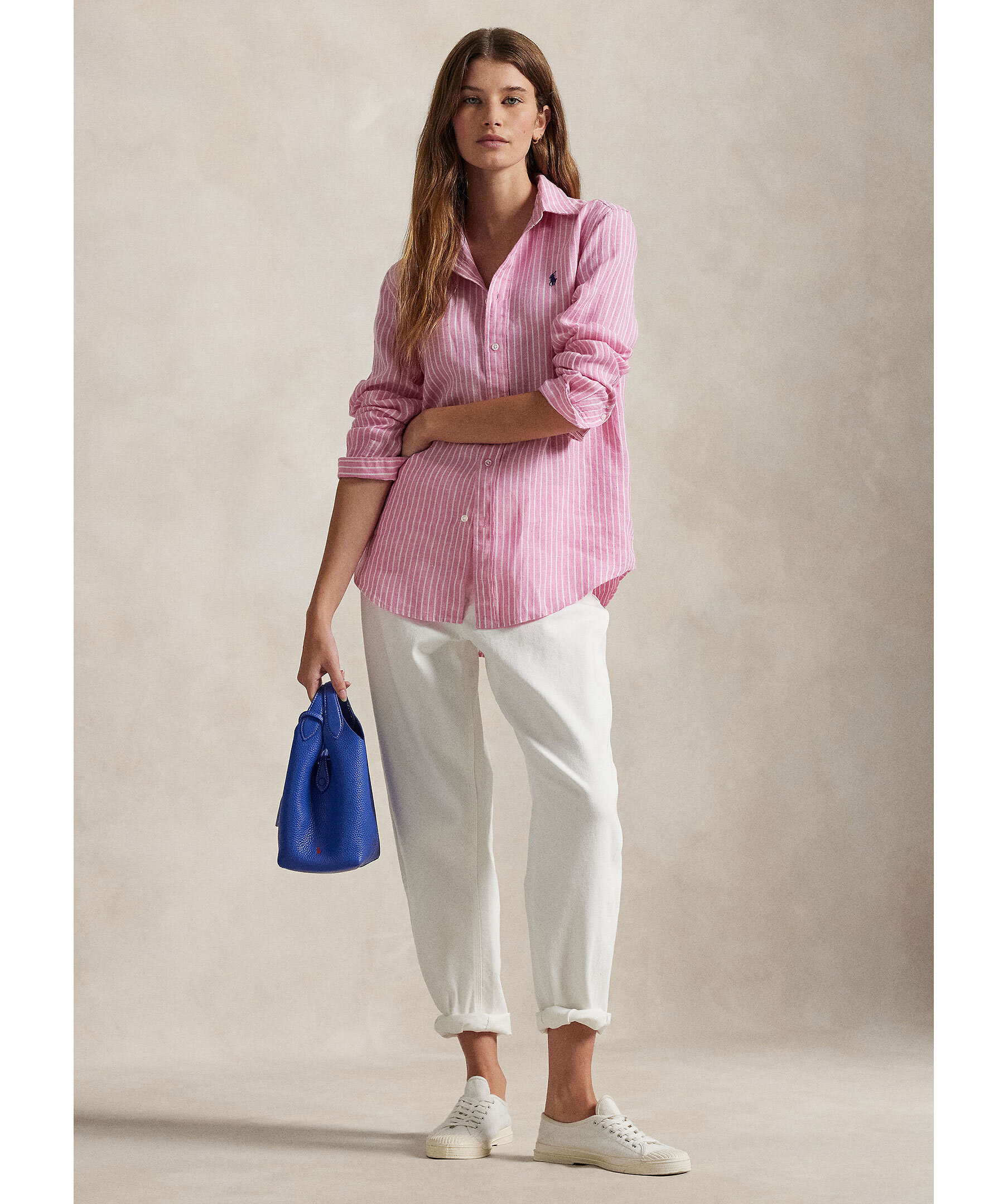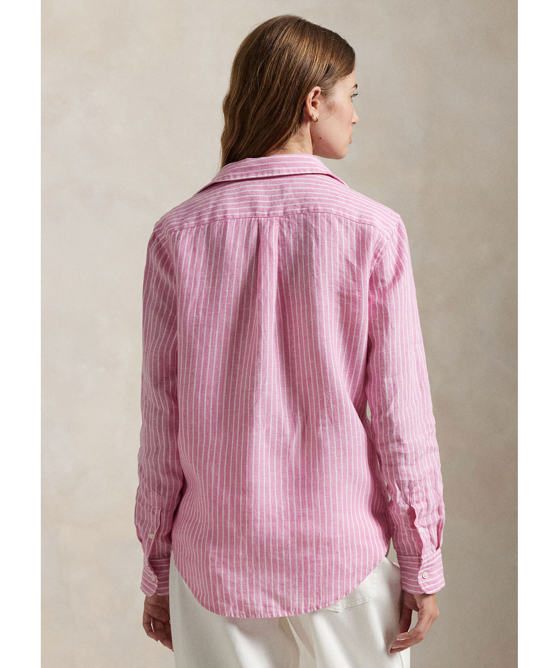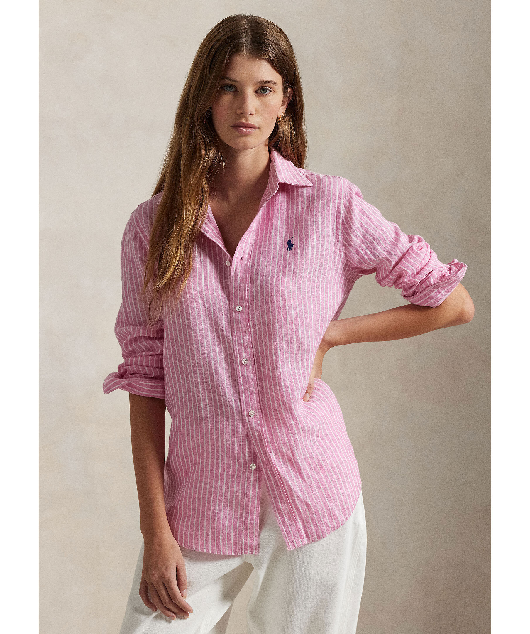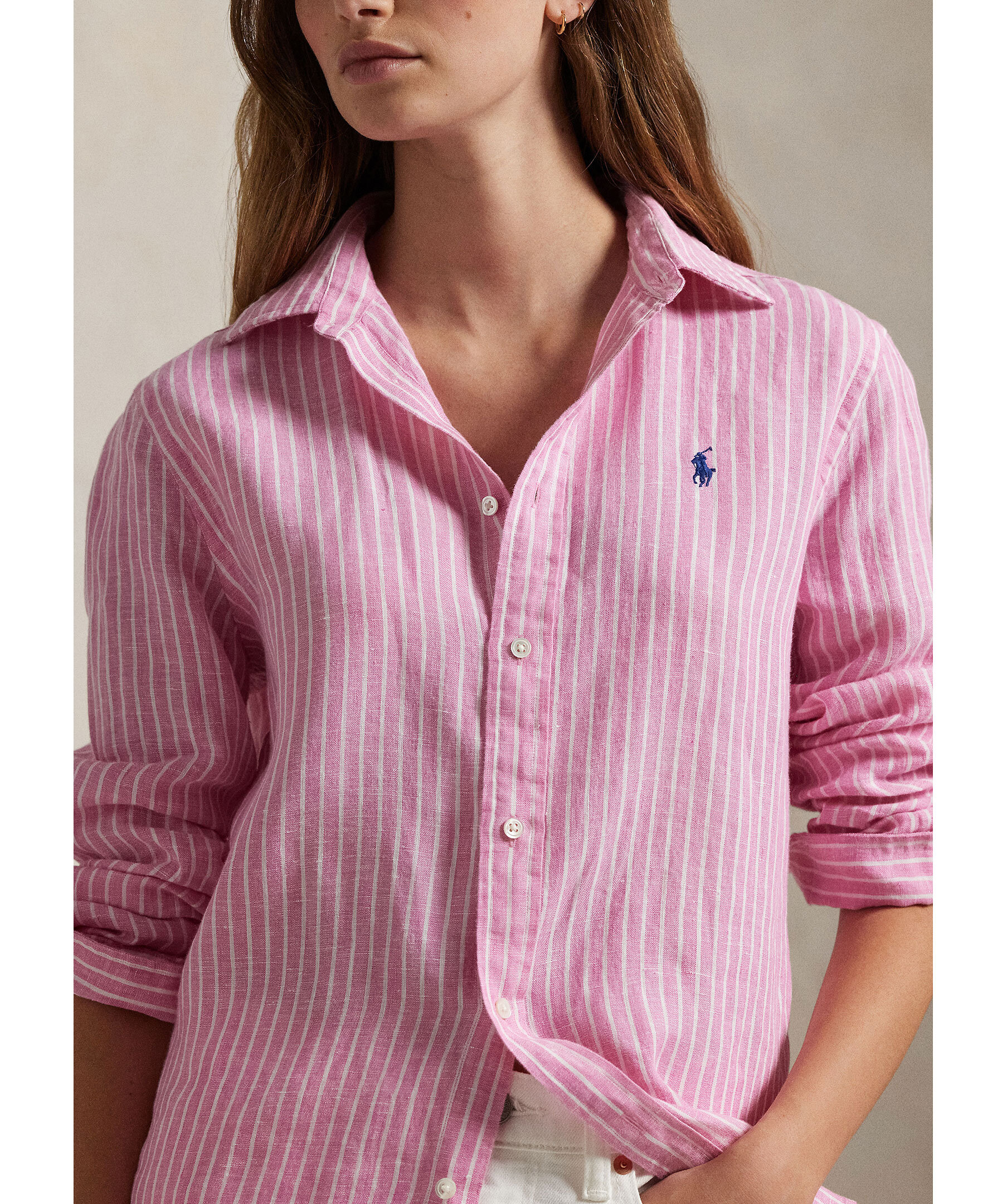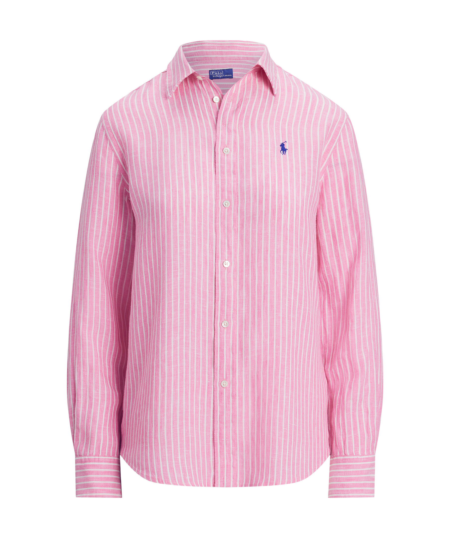 Rosa och vitrandig skjorta från Polo Ralph Lauren. Skjortan stängs med knappar och har broderad logotyp på bröstet. Tillverkad i 100% linne.