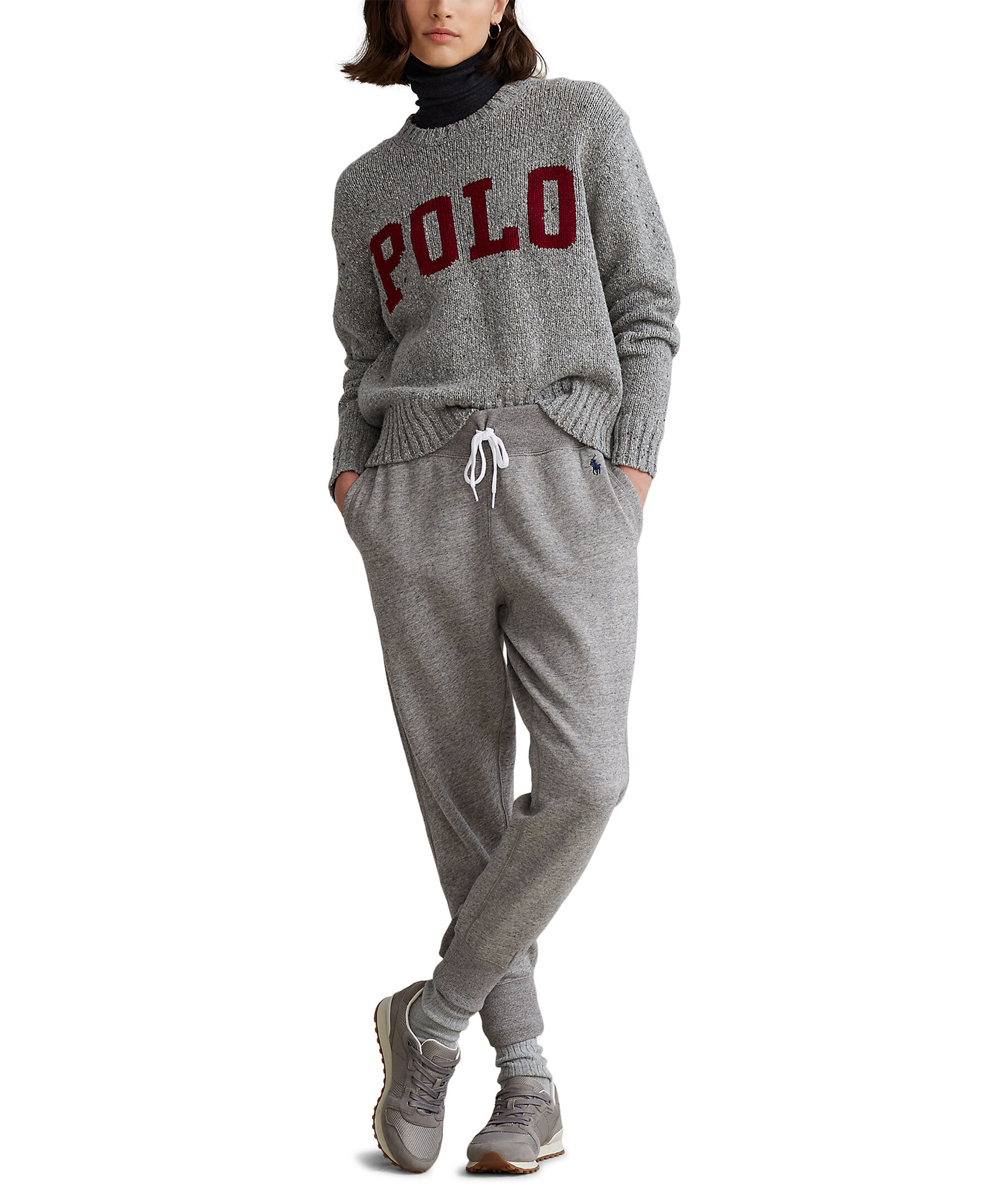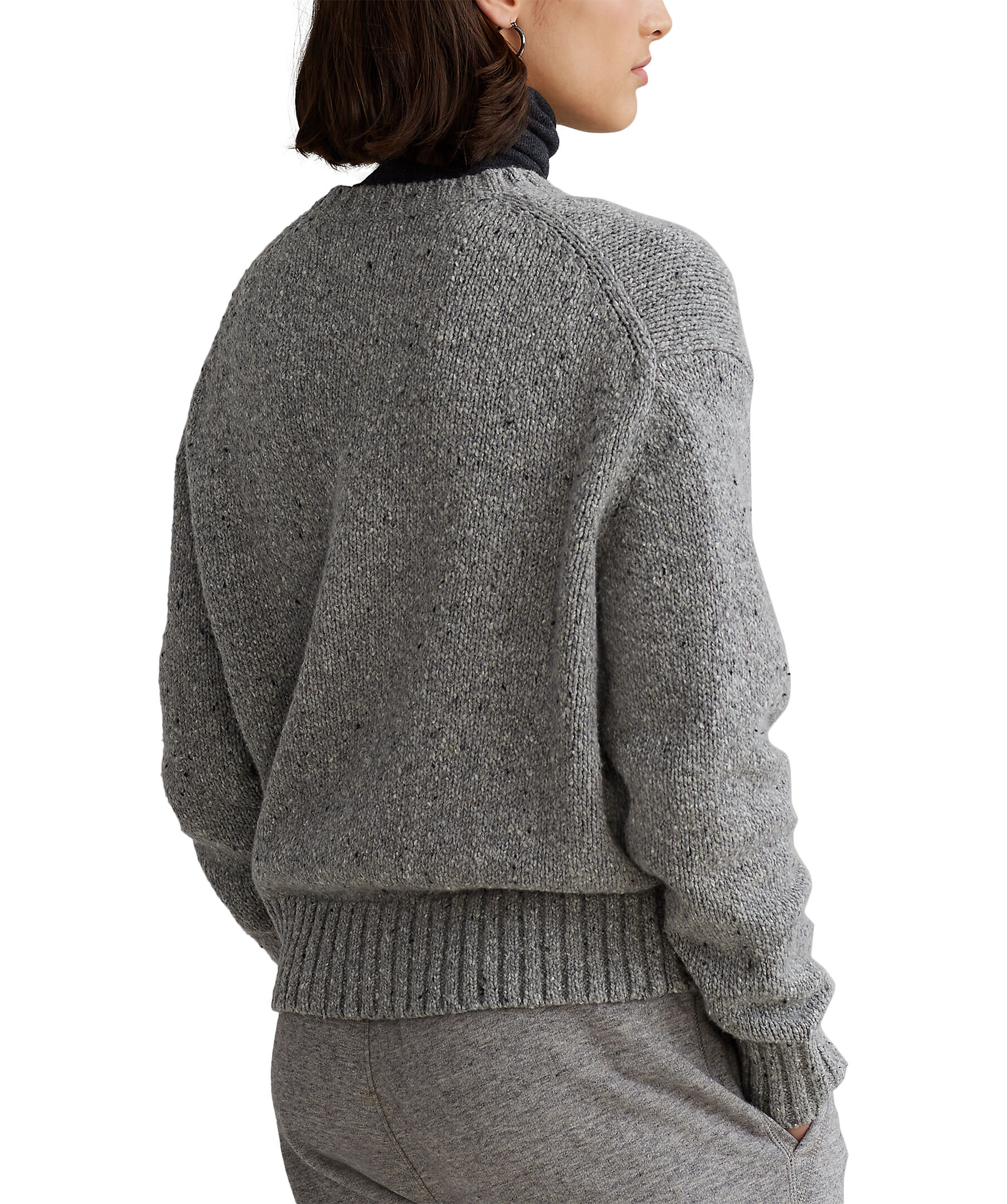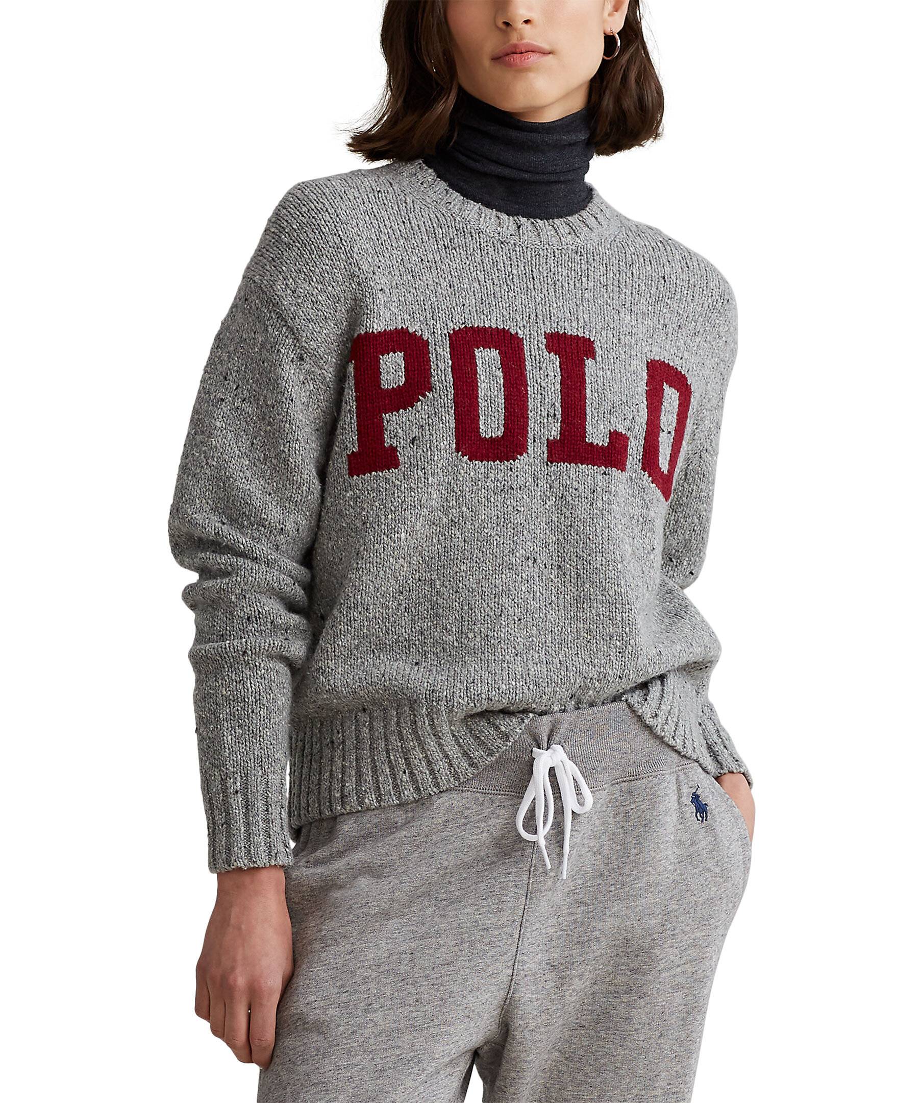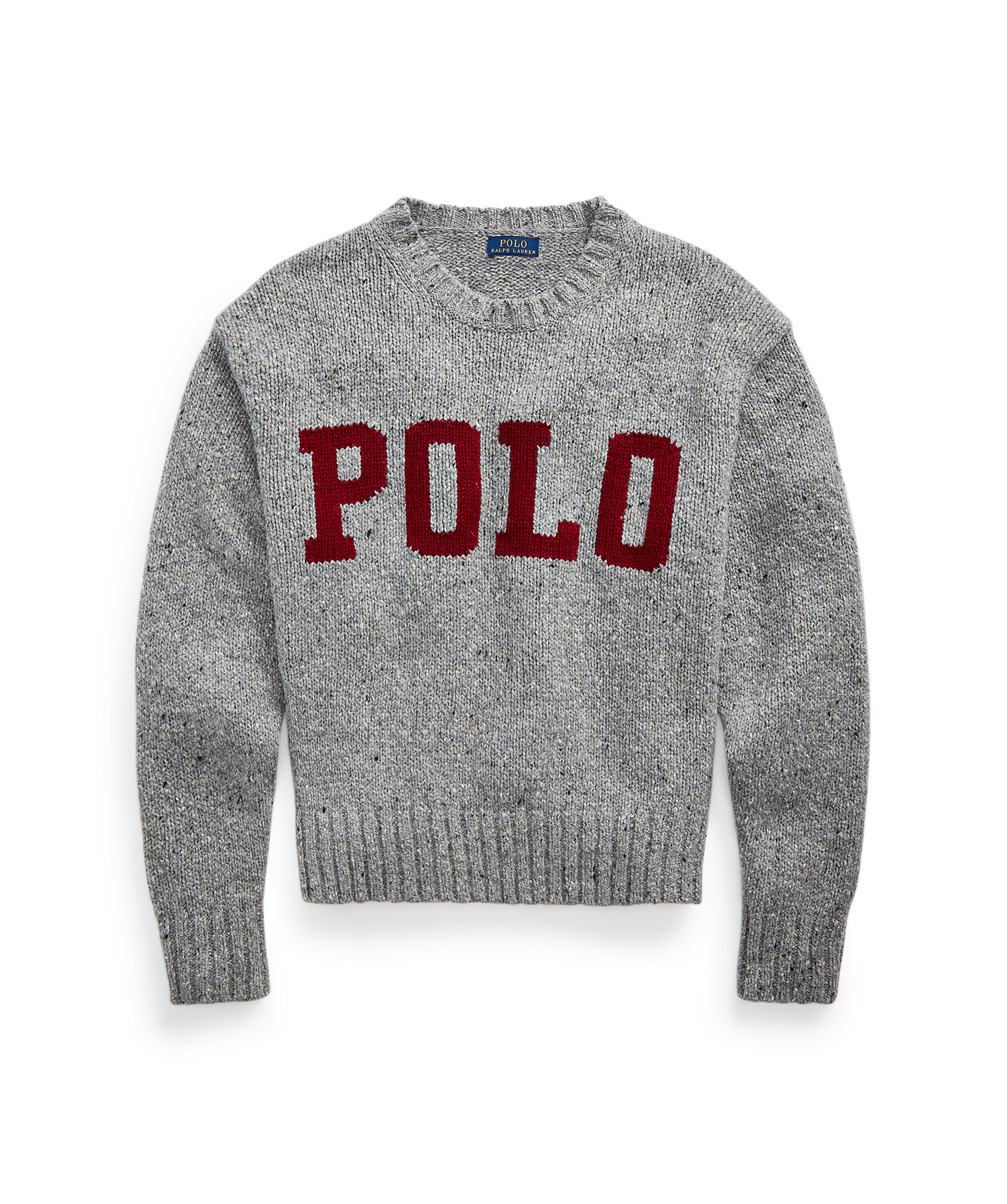 Gråmelerad, grovstickad tröja från Polo Ralph Lauren. Stor, instickad logotyp i vinrött på bröstet. Rund halsringning med ribbad kant samt ribbade muddar i ärmslut och plaggslut. Tillverkad i ullblandning.