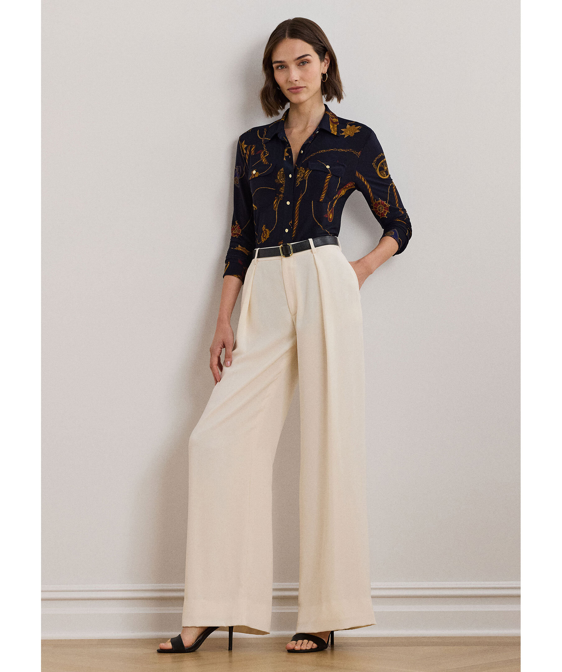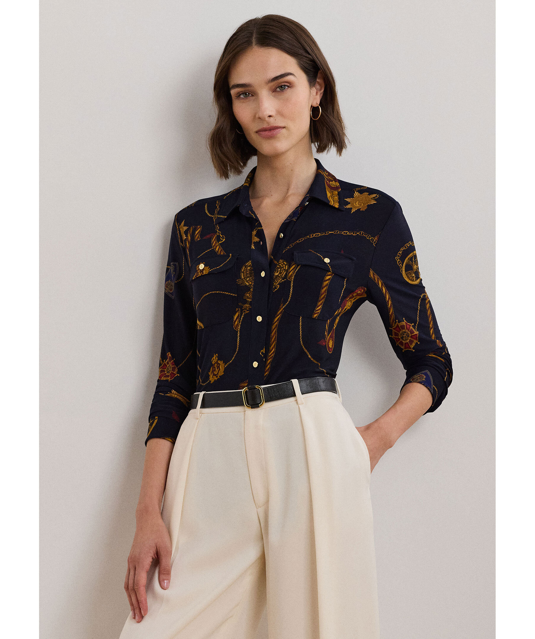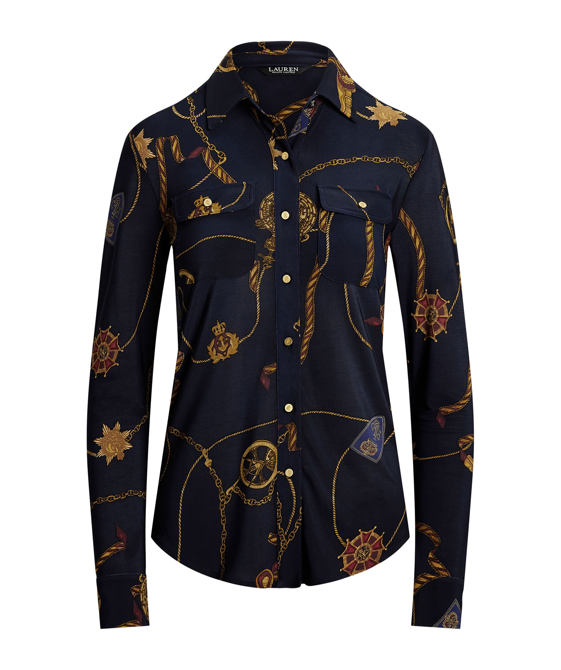 Mörkblå mönstrad blus från Lauren Ralph Lauren. Blusen har krage och stängs framtill med guldfärgade knappar med logotyp, har två bröstfickor med knapp. Blusen har guldfärgade manschett knappar och är längre baktill.