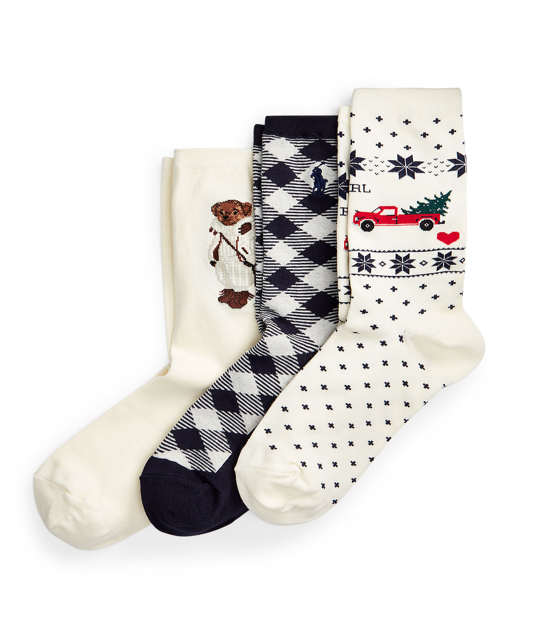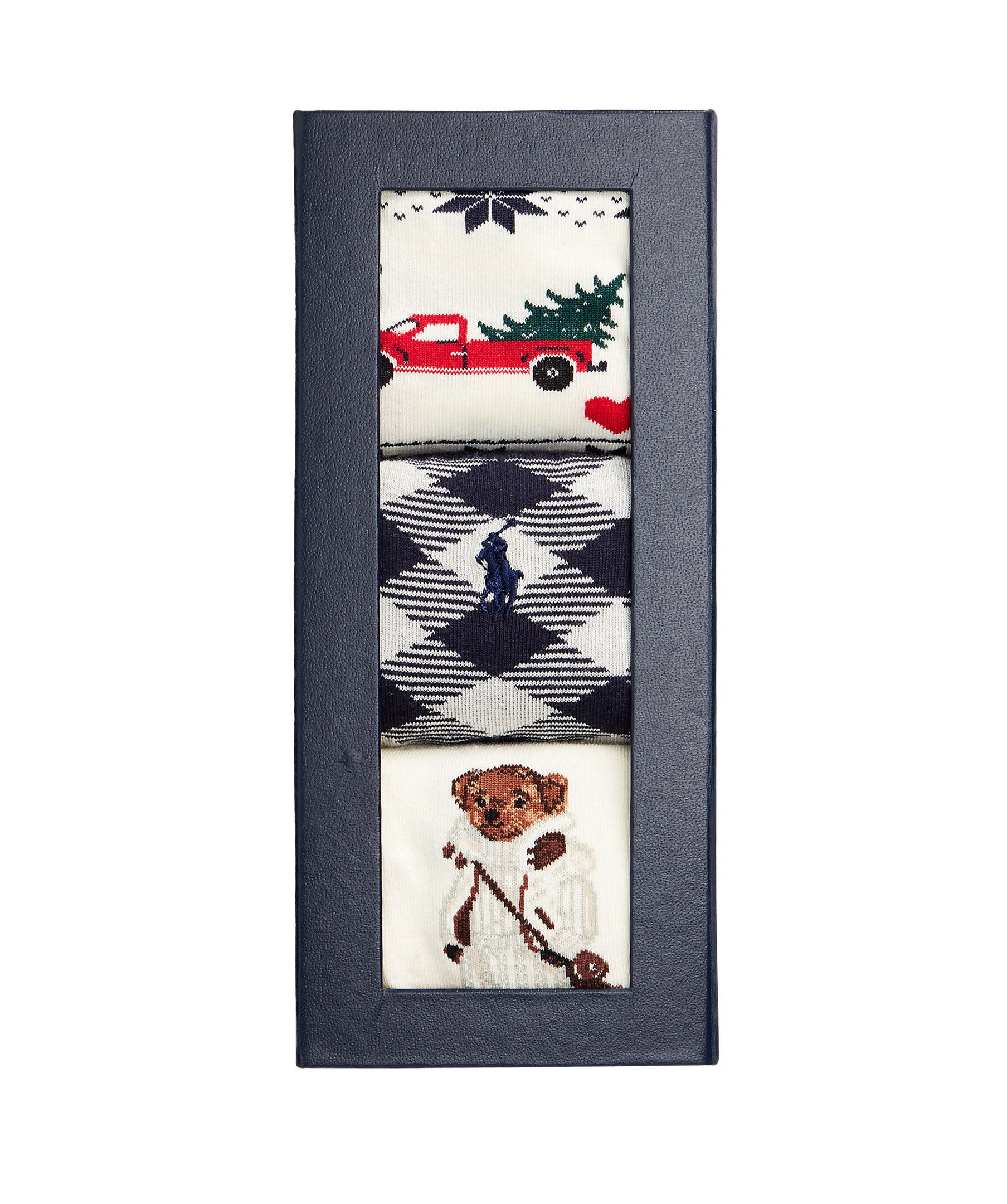 Mönstrade sockar från Polo Ralph Lauren. 3-pack gift box. Strumpor med ikoniska teddybjörnen, rutiga i blått och grått med broderad logotyp samt en strumpa i vitt, rött och svart med julmotiv.
