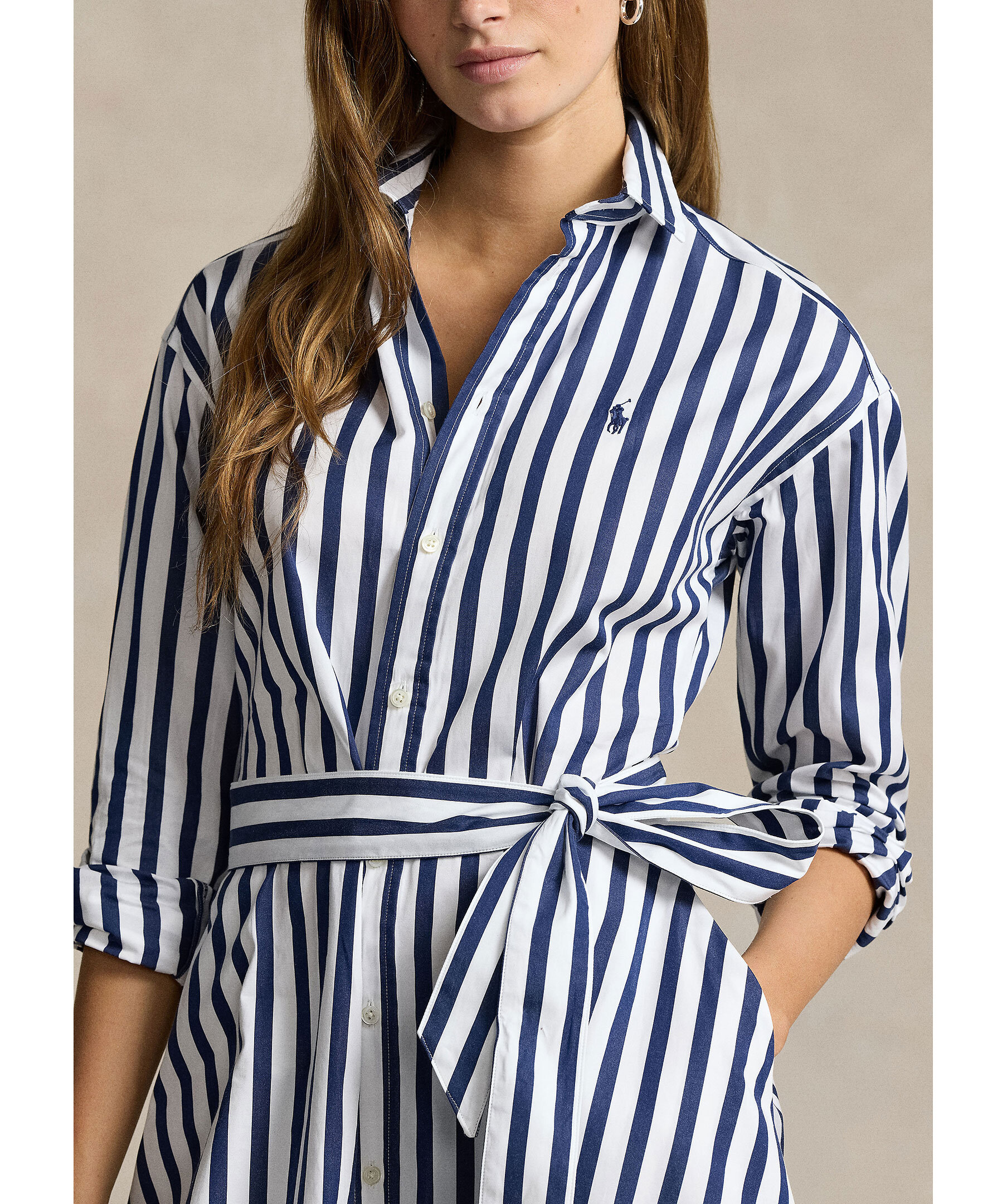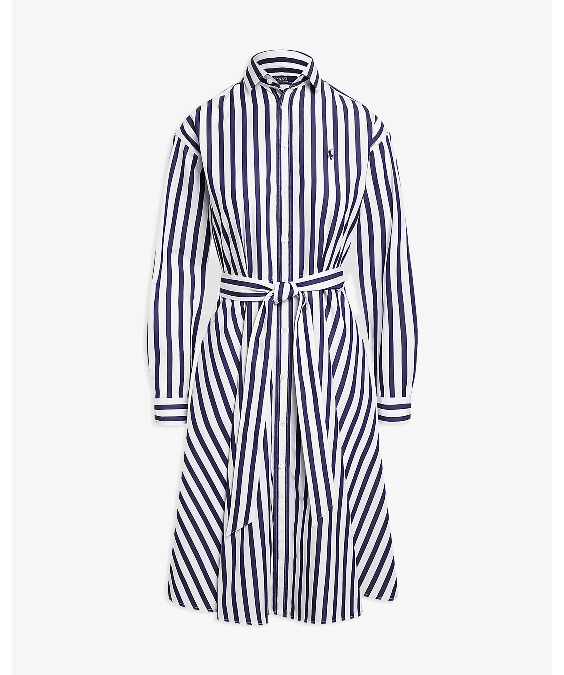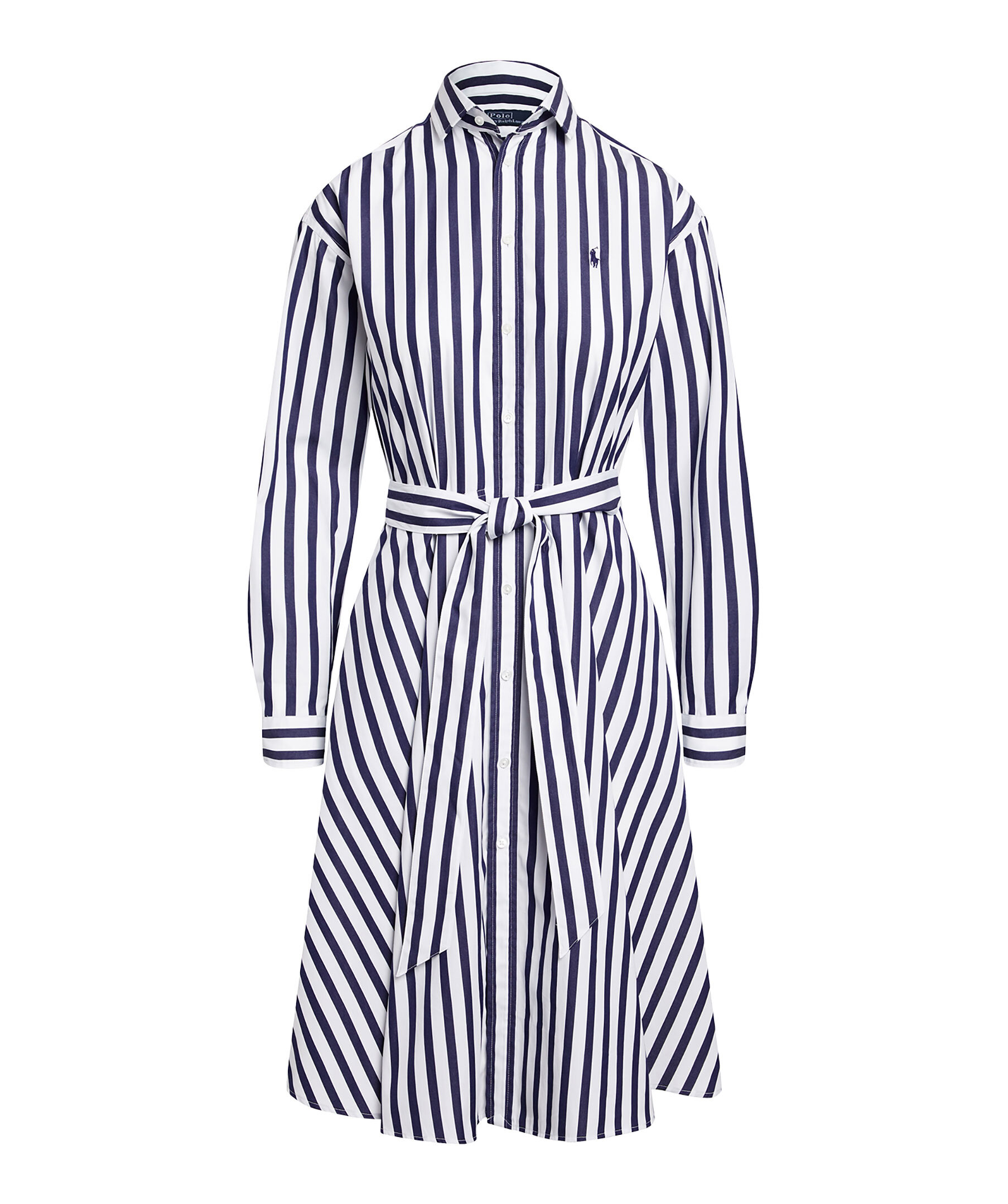 Vit och mörkblå randig skjortklänning från Polo Ralph Lauren. Knyt i midjan. Enkla manschetter. Spetsig krage. Broderad logotyp på vänster bröst. Klänningen slutar strax nedanför knät. Tillverkad i bomull.