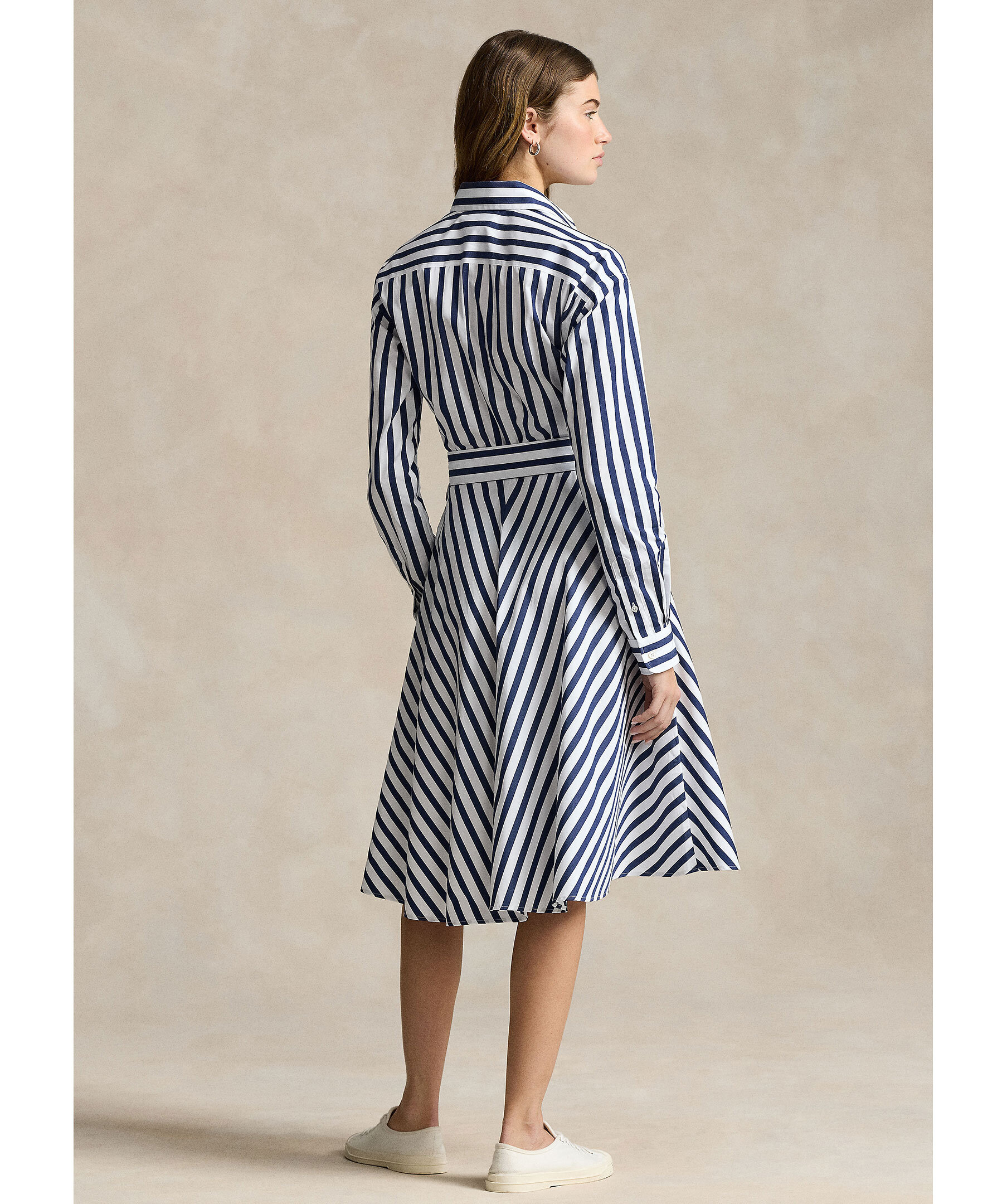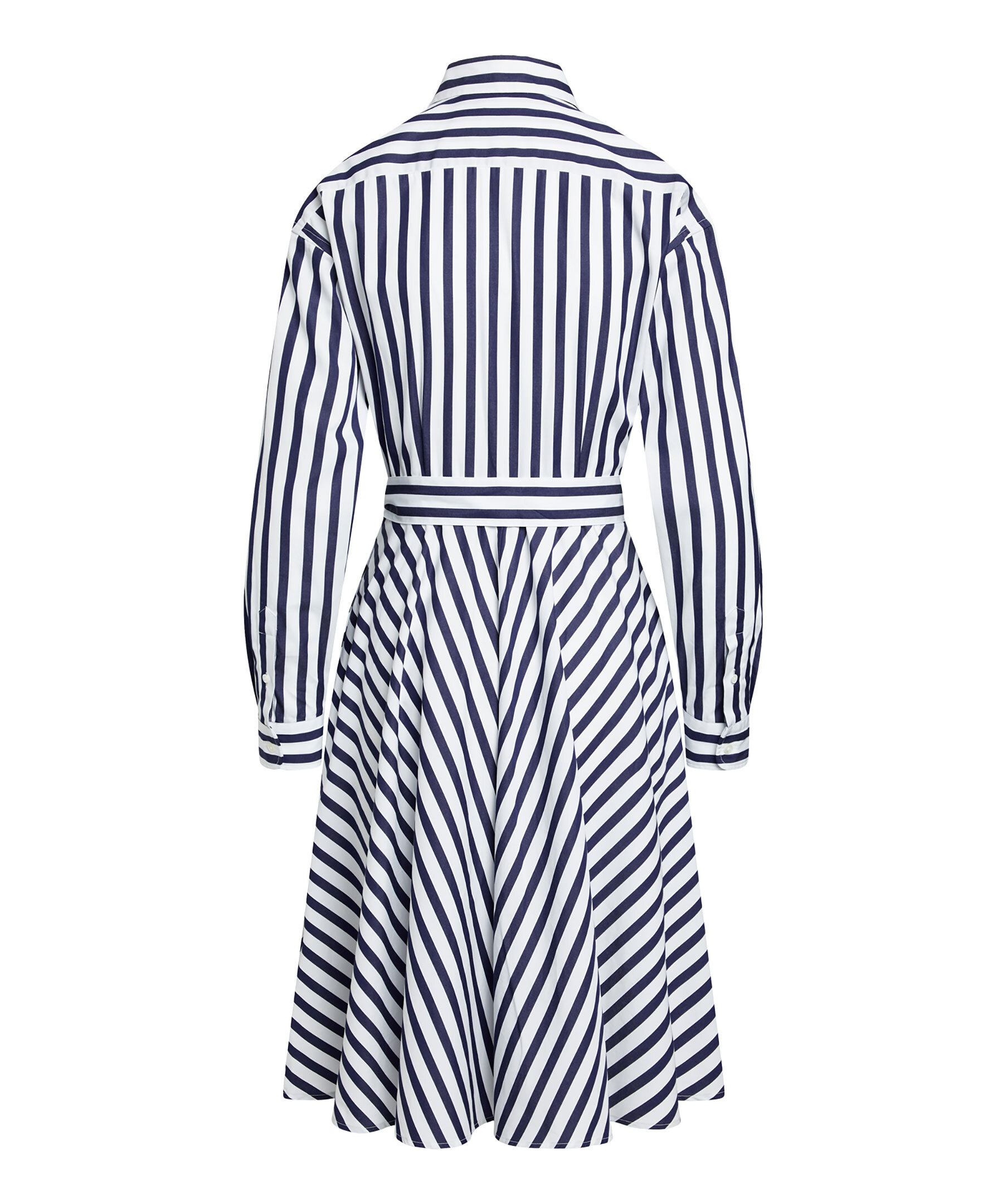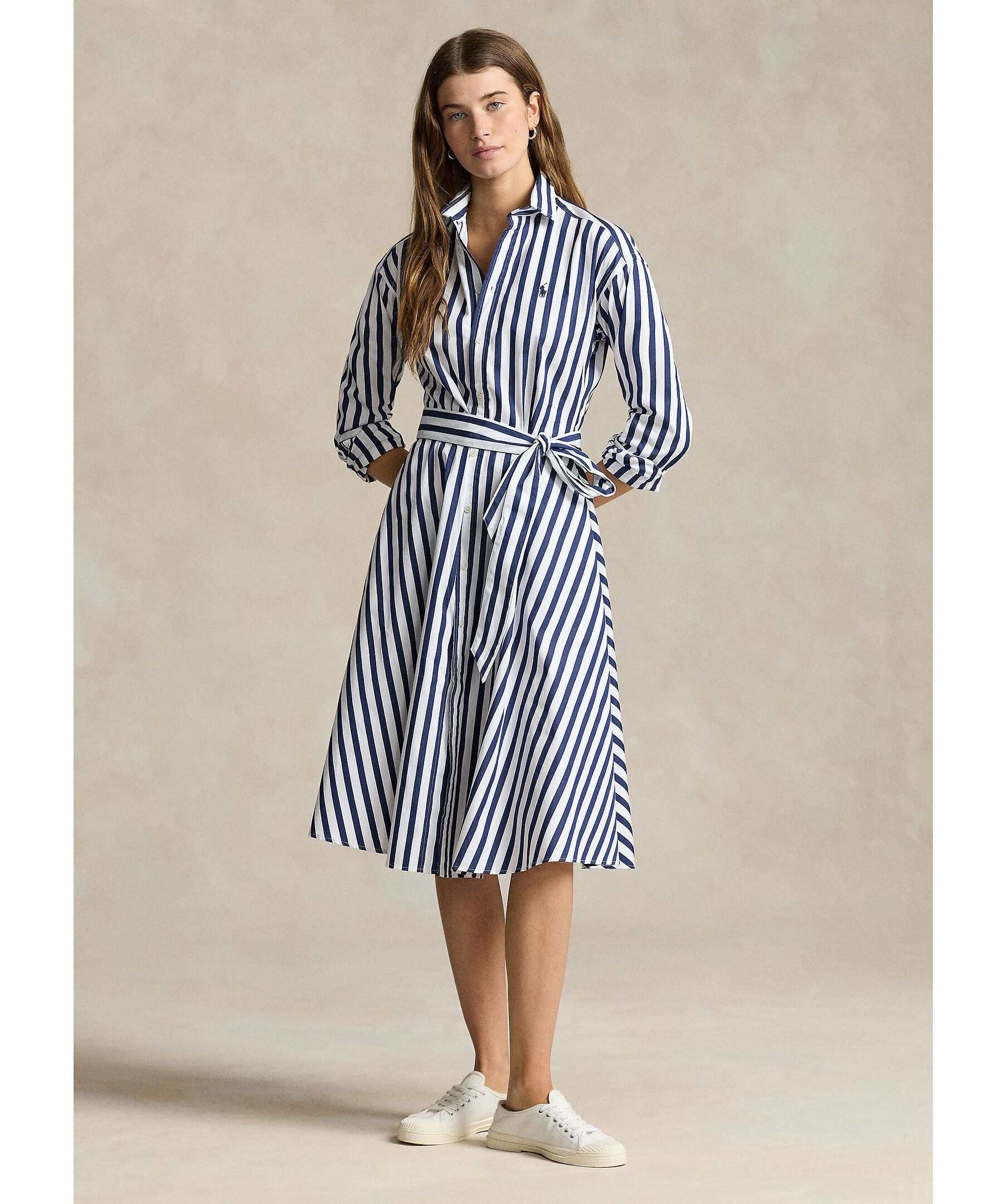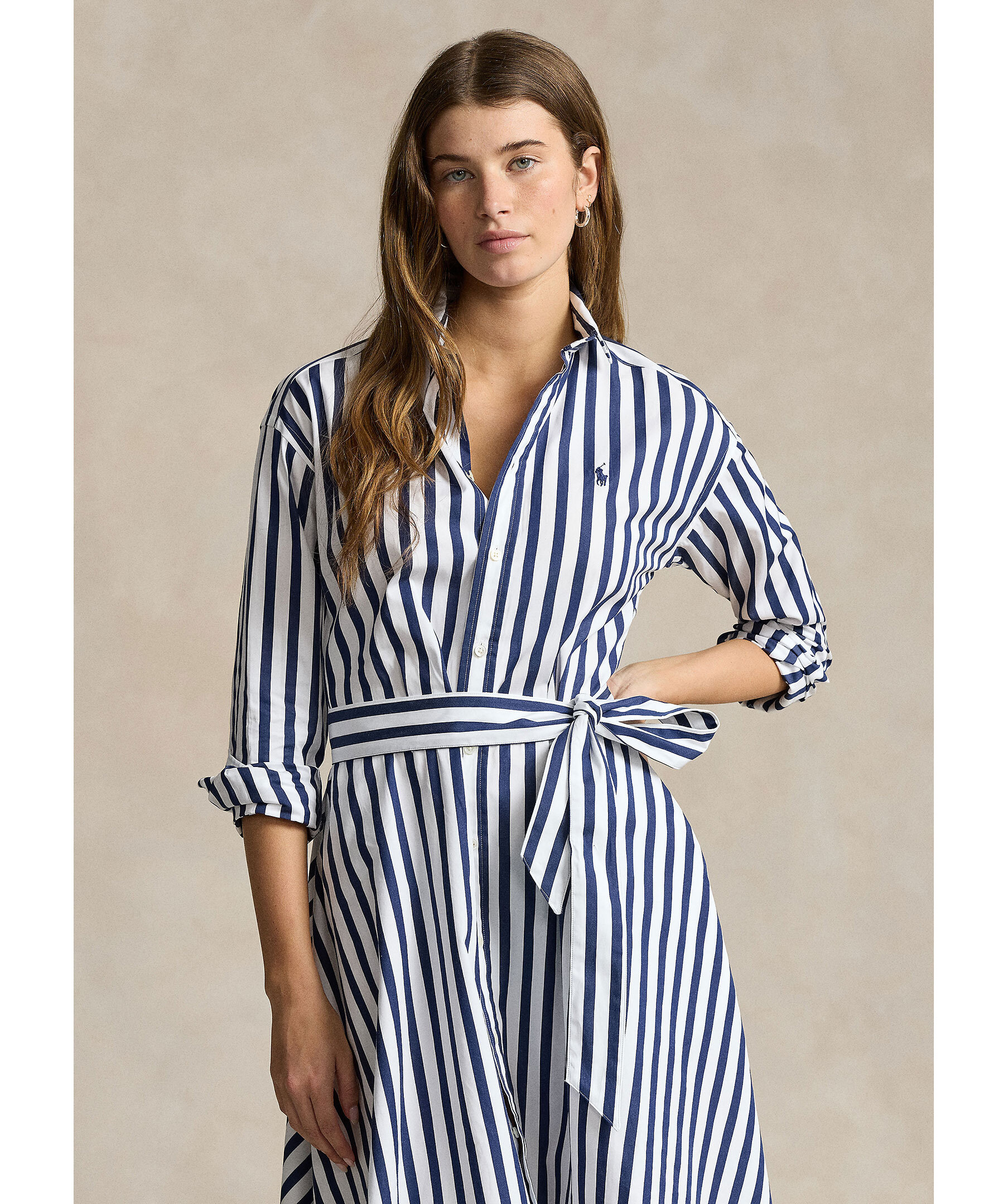 Vit och mörkblå randig skjortklänning från Polo Ralph Lauren. Knyt i midjan. Enkla manschetter. Spetsig krage. Broderad logotyp på vänster bröst. Klänningen slutar strax nedanför knät. Tillverkad i bomull.