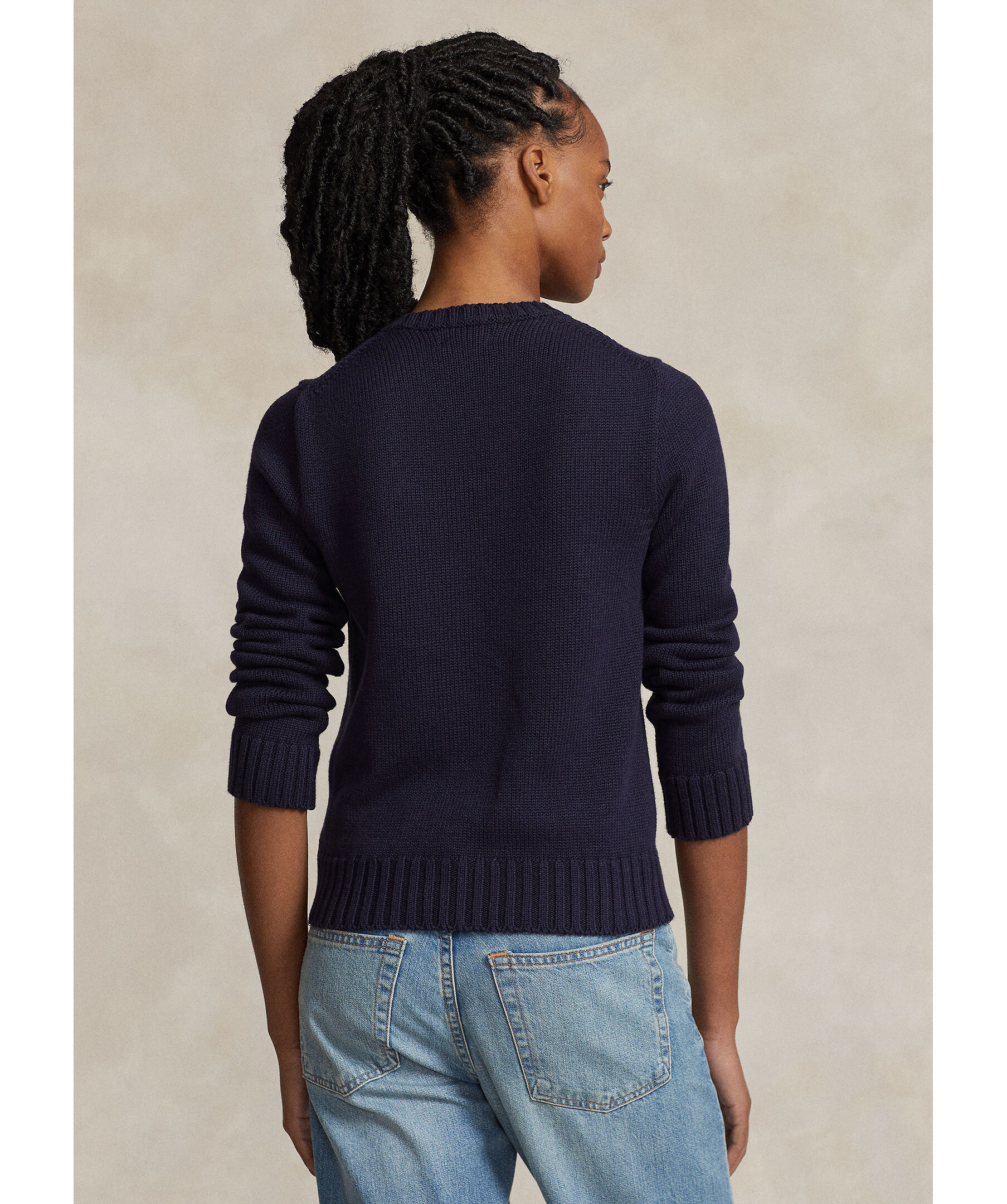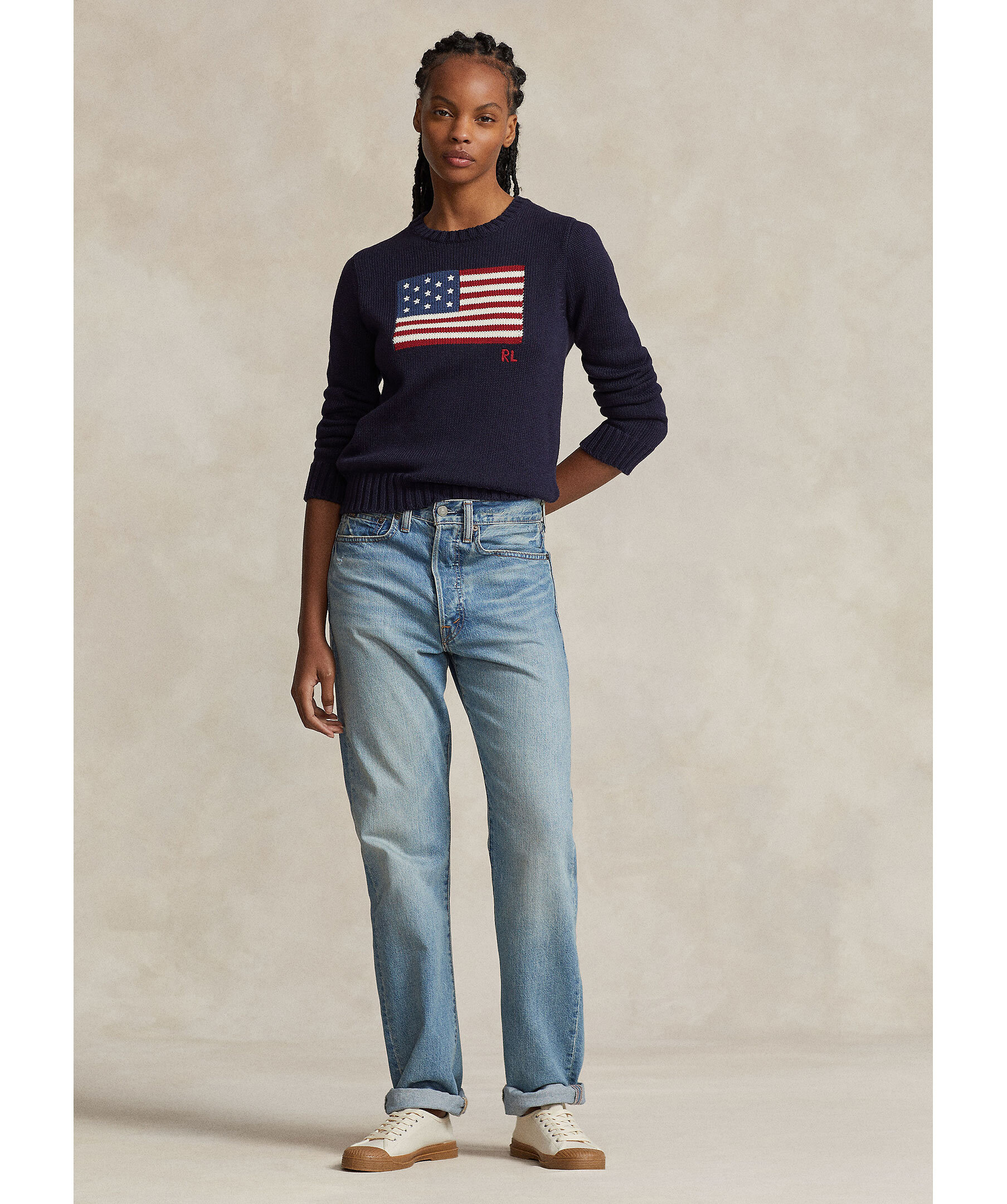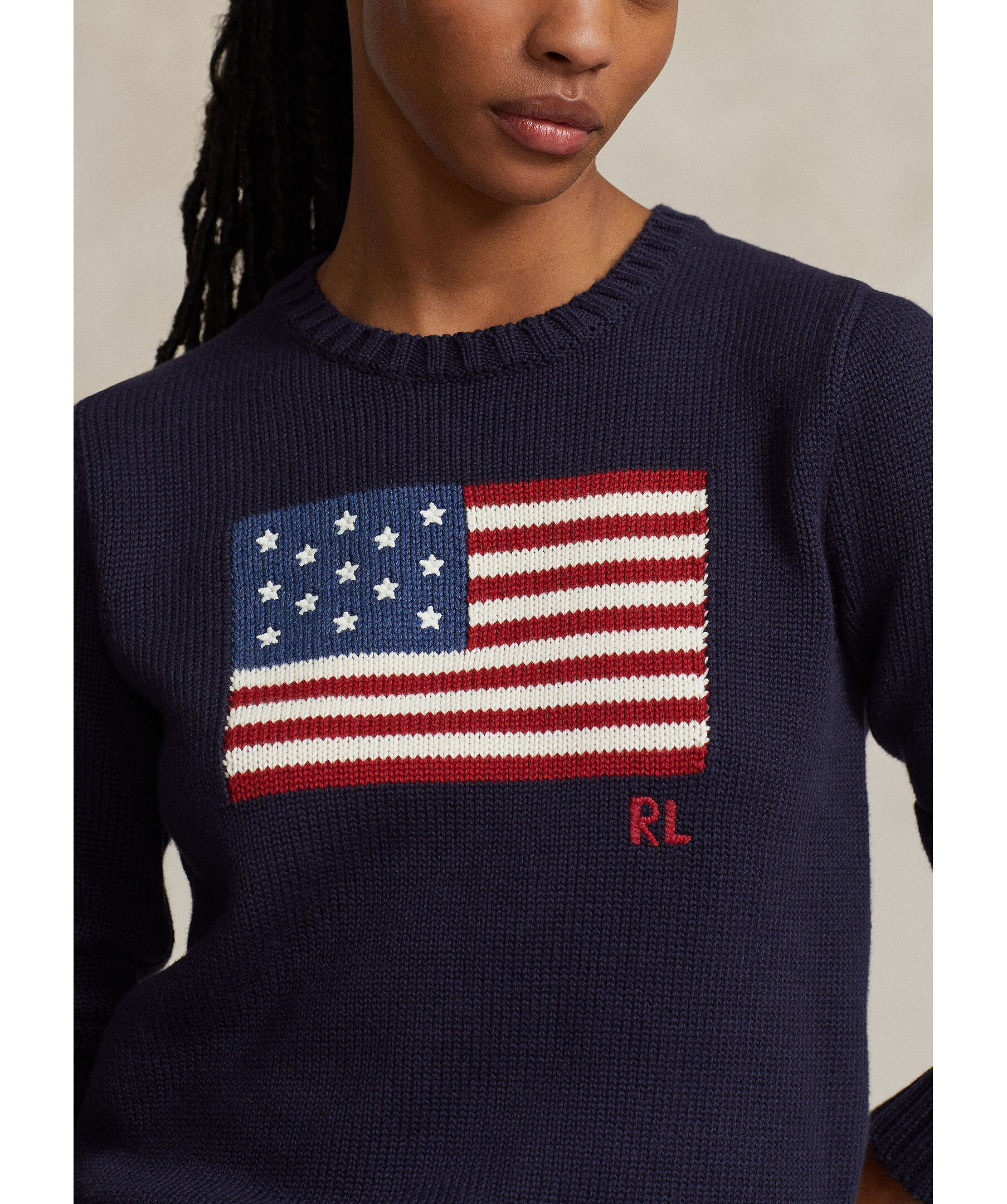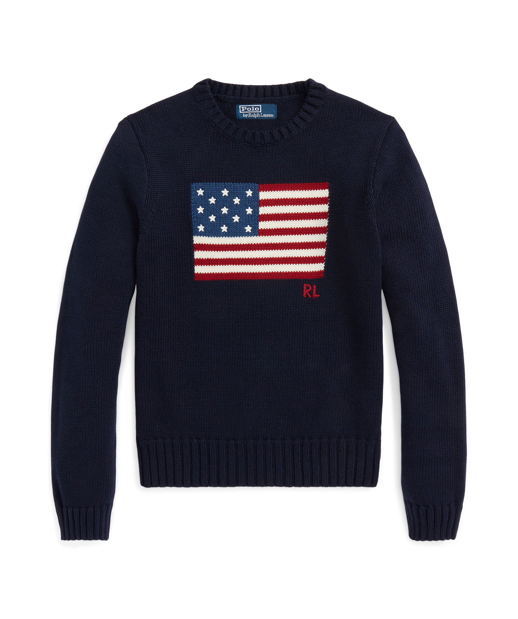 Mörkblå tröja med rund hals i bomull från Polo Ralph Lauren. Designad med ett amerikanskt flaggmotiv på bröstet och ribbstickade muddar vid ärmslut och fåll.