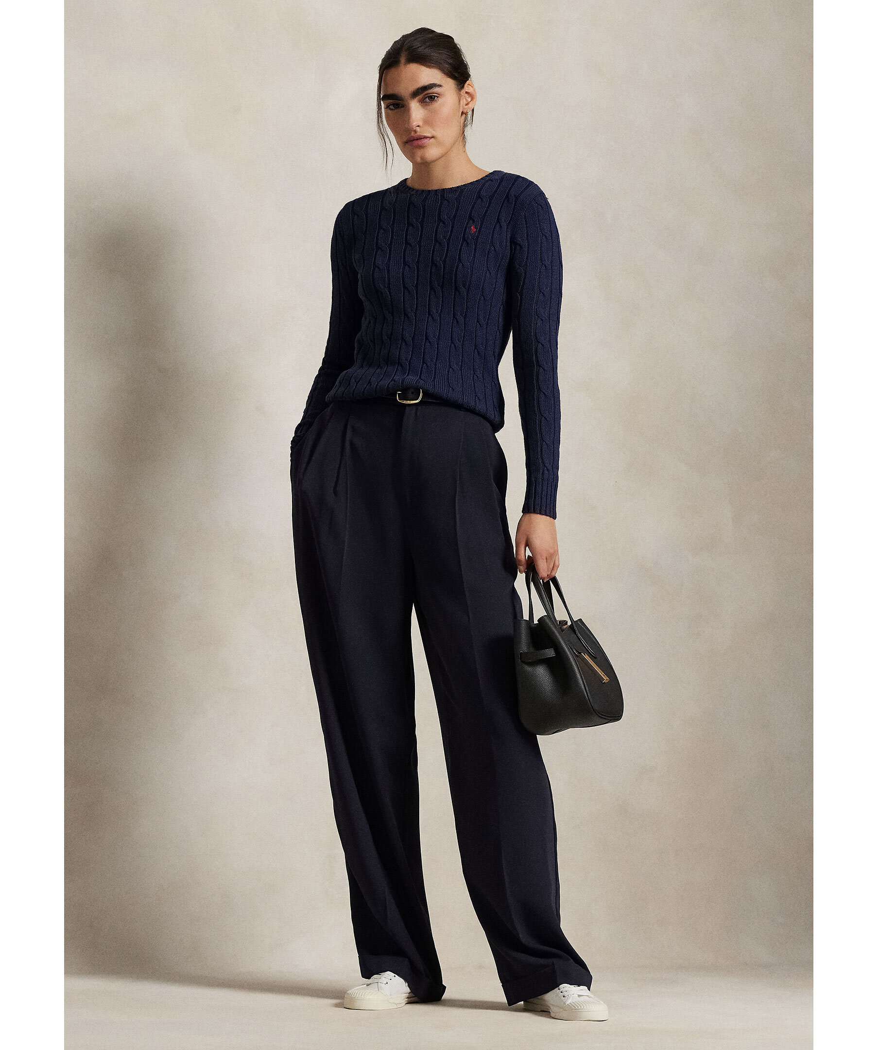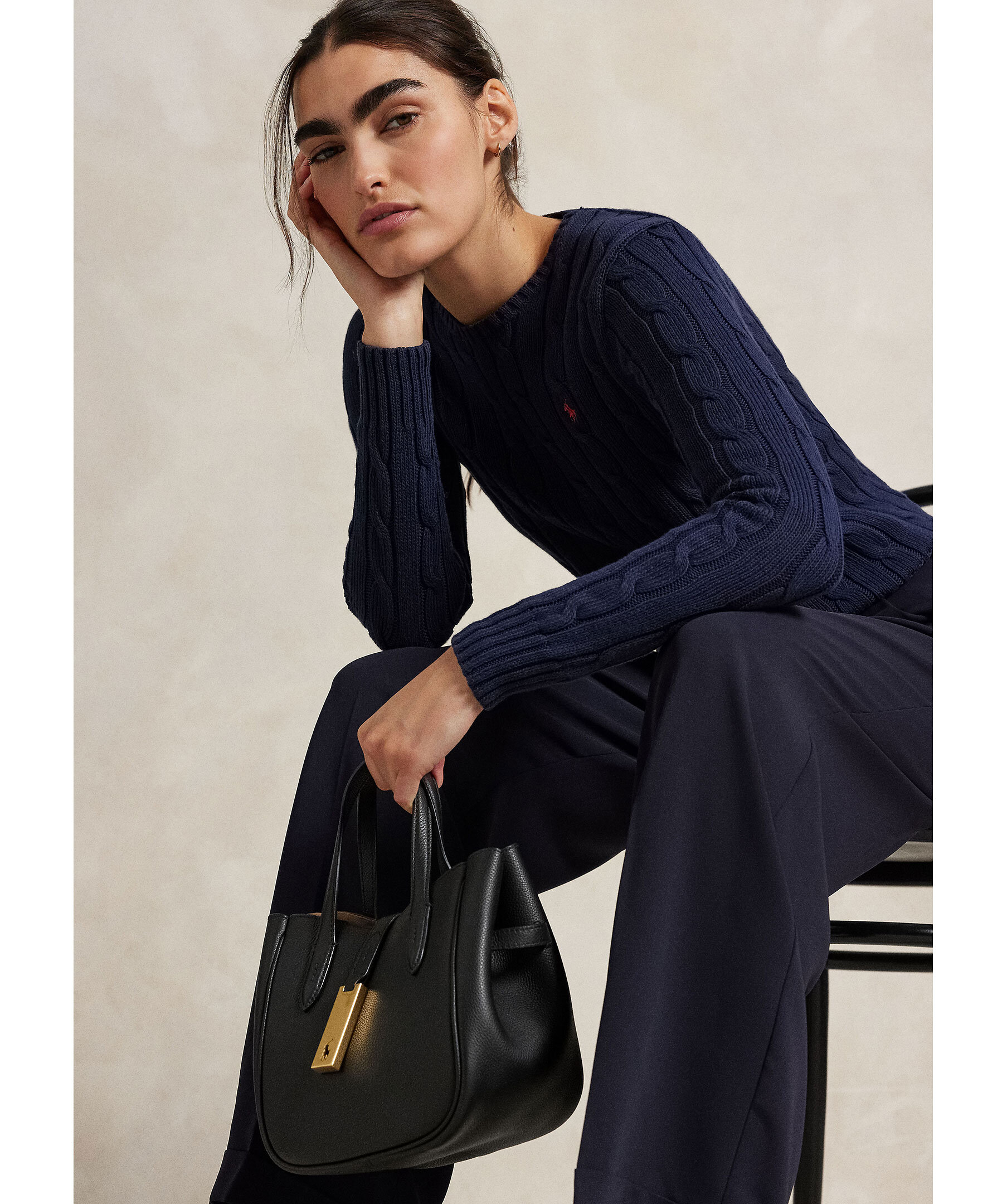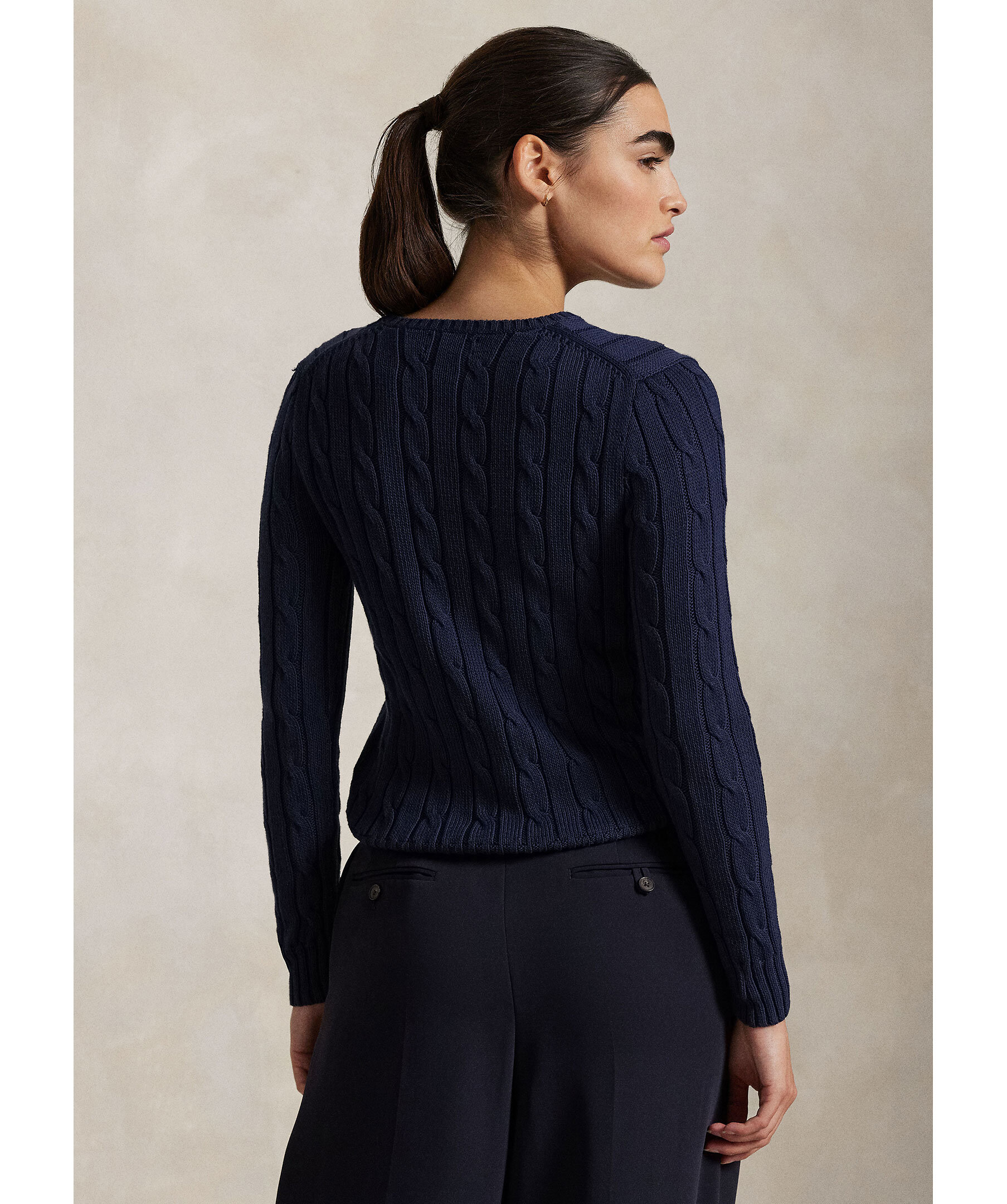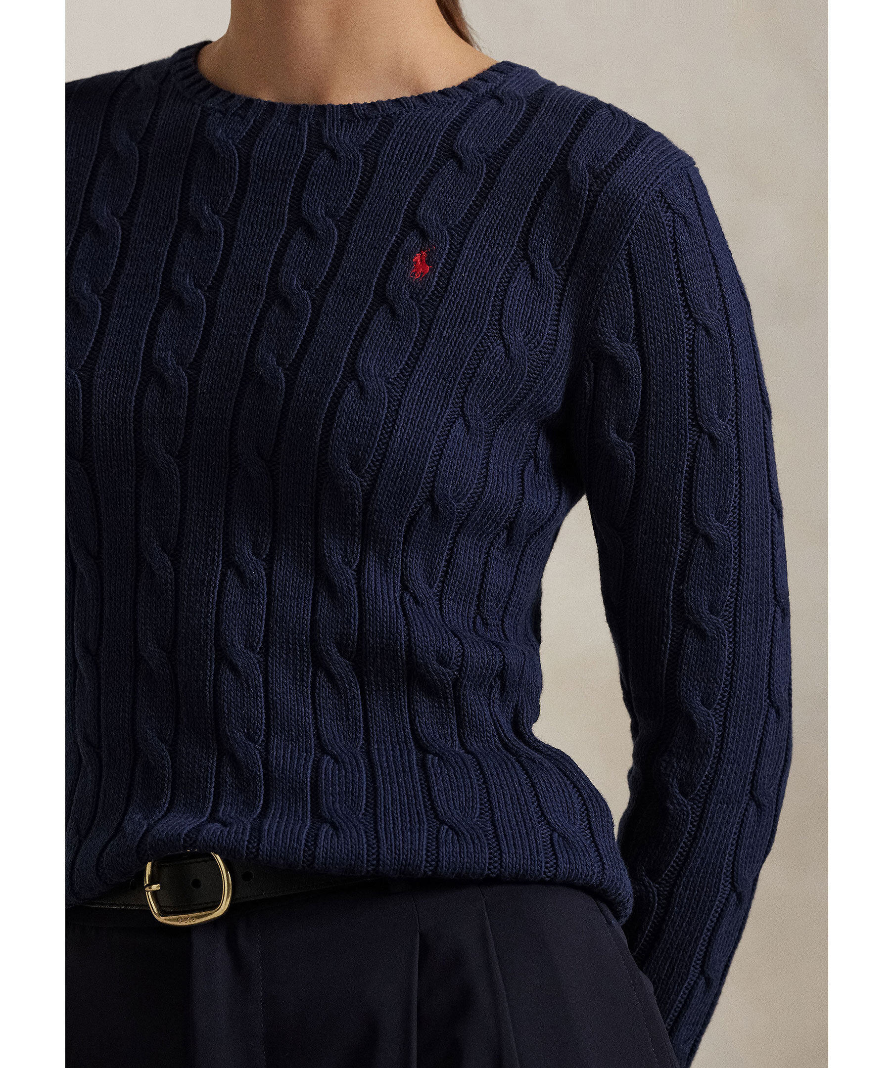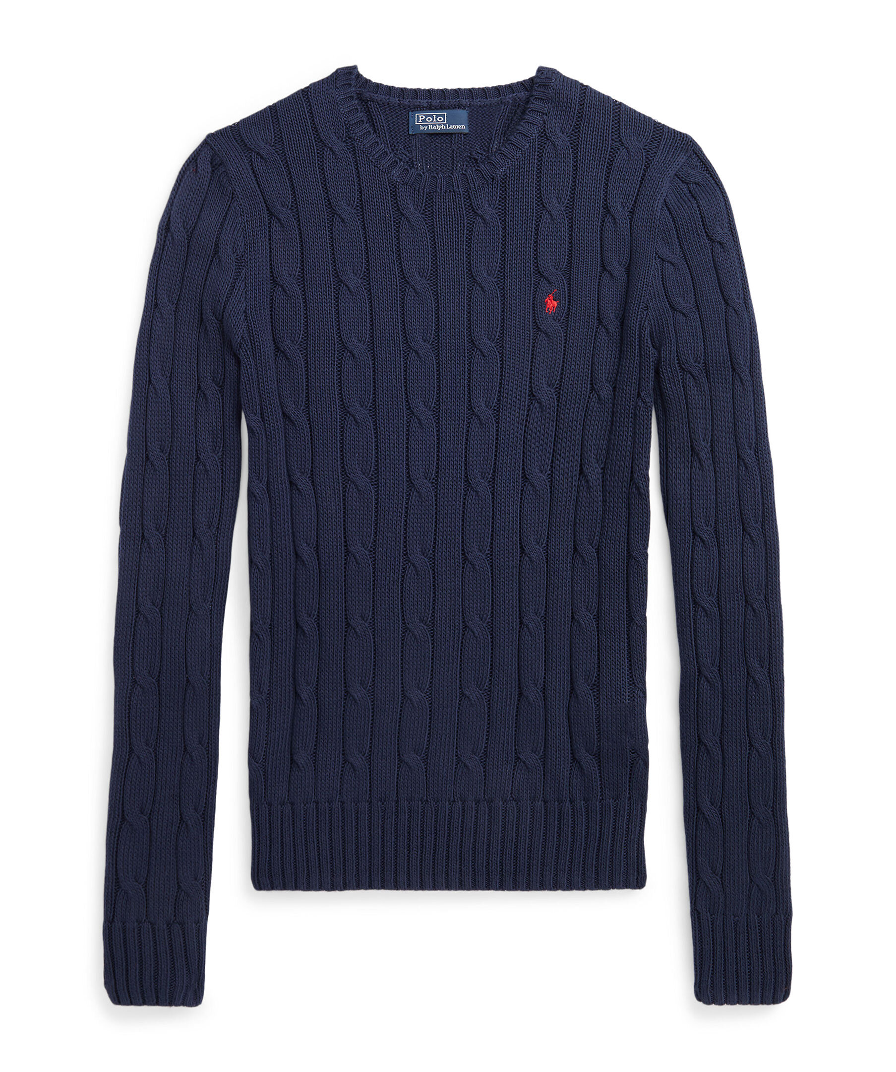 Mörkblå kabelstickad tröja från Polo Ralph Lauren. Broderad logotyp i rött på vänster bröst. Rundad halsringning. Ribbstickade muddar vid ärm- och plaggslut. Tillverkad i 100% Bomull.