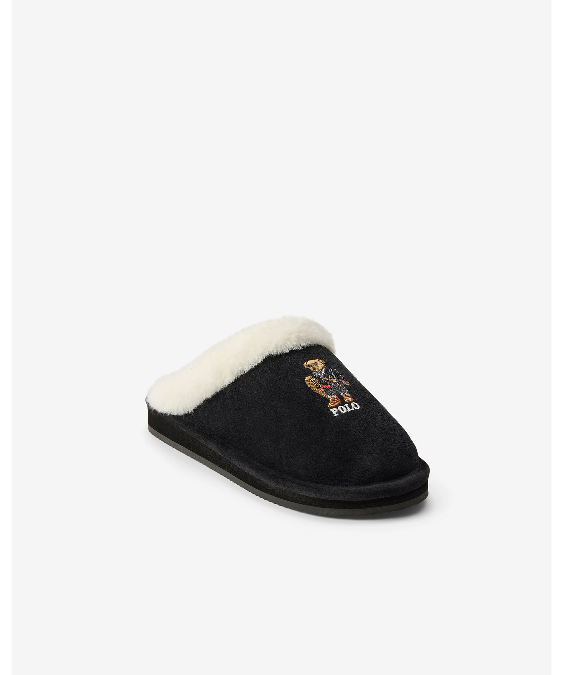 Mjuka tofflor från Polo Ralph Lauren är tillverkade i svart mockaliknande material med en värmande vit fuskpälskant. På ovansidan pryds tofflan av det ikoniska Polo Bear-broderiet, klädd i vintrig outfit. Perfekt för kalla dagar hemma.