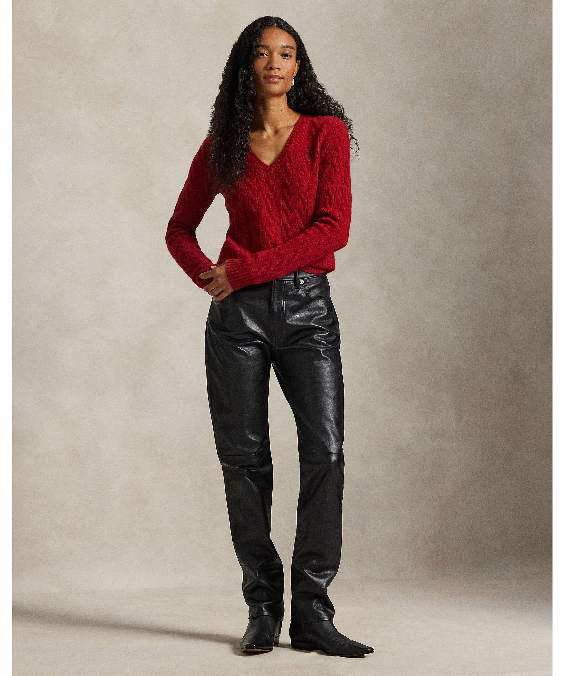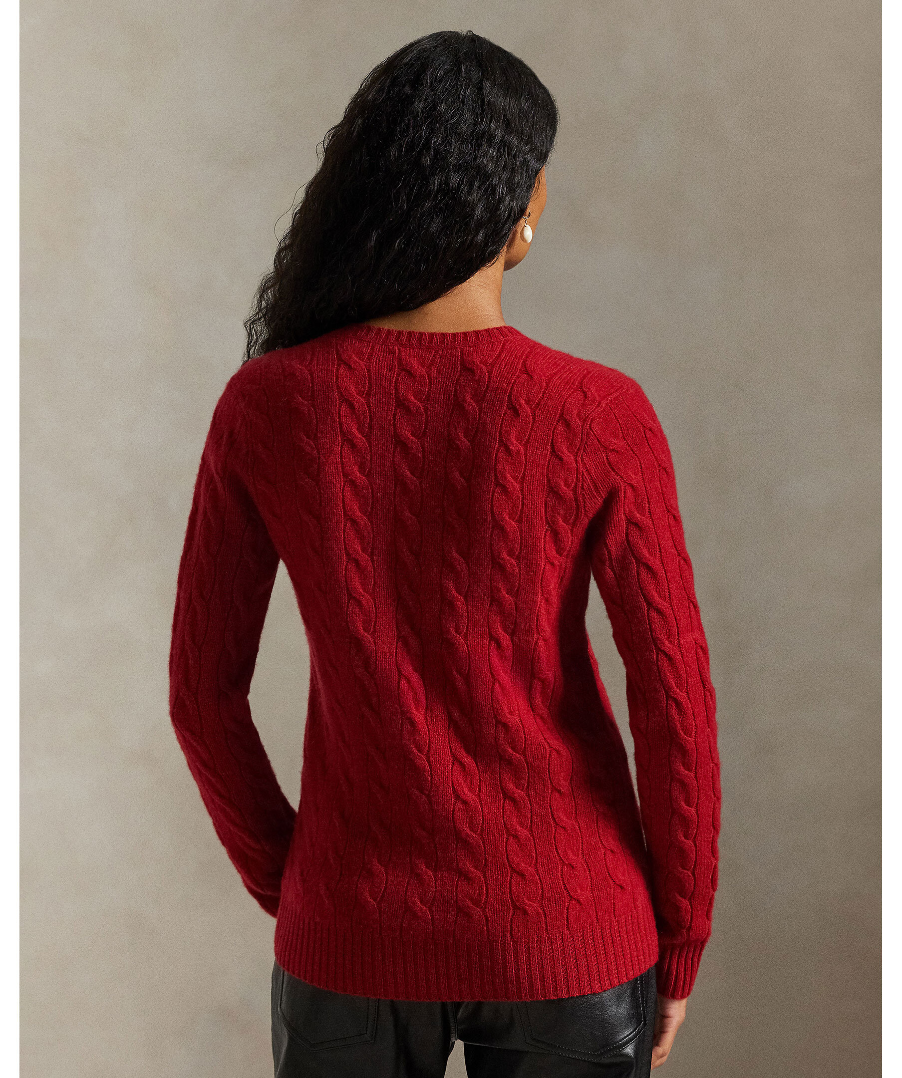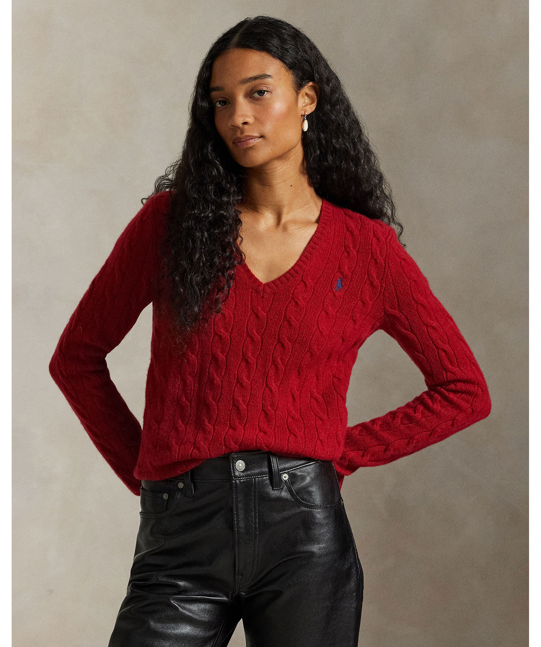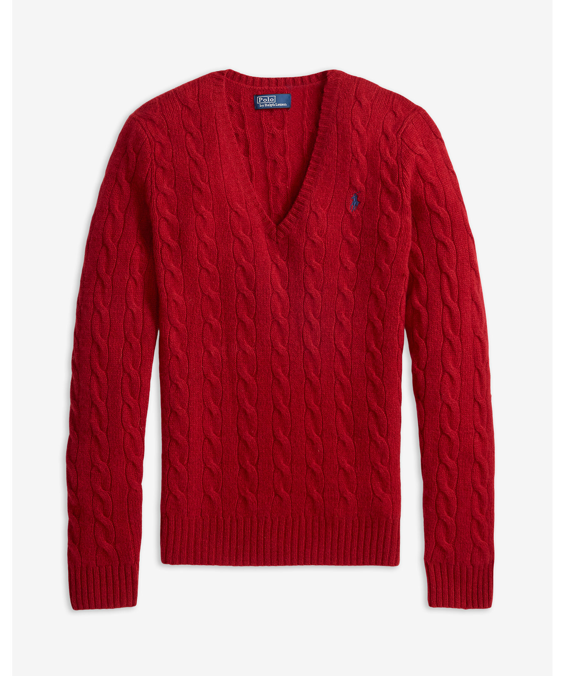 Röd, v-ringad kabelstickad tröja från Polo Ralph Lauren. Gjord i en mjuk ull och kashmirblandning. Ribbstickade muddar och en broderad polohäst på bröstet.