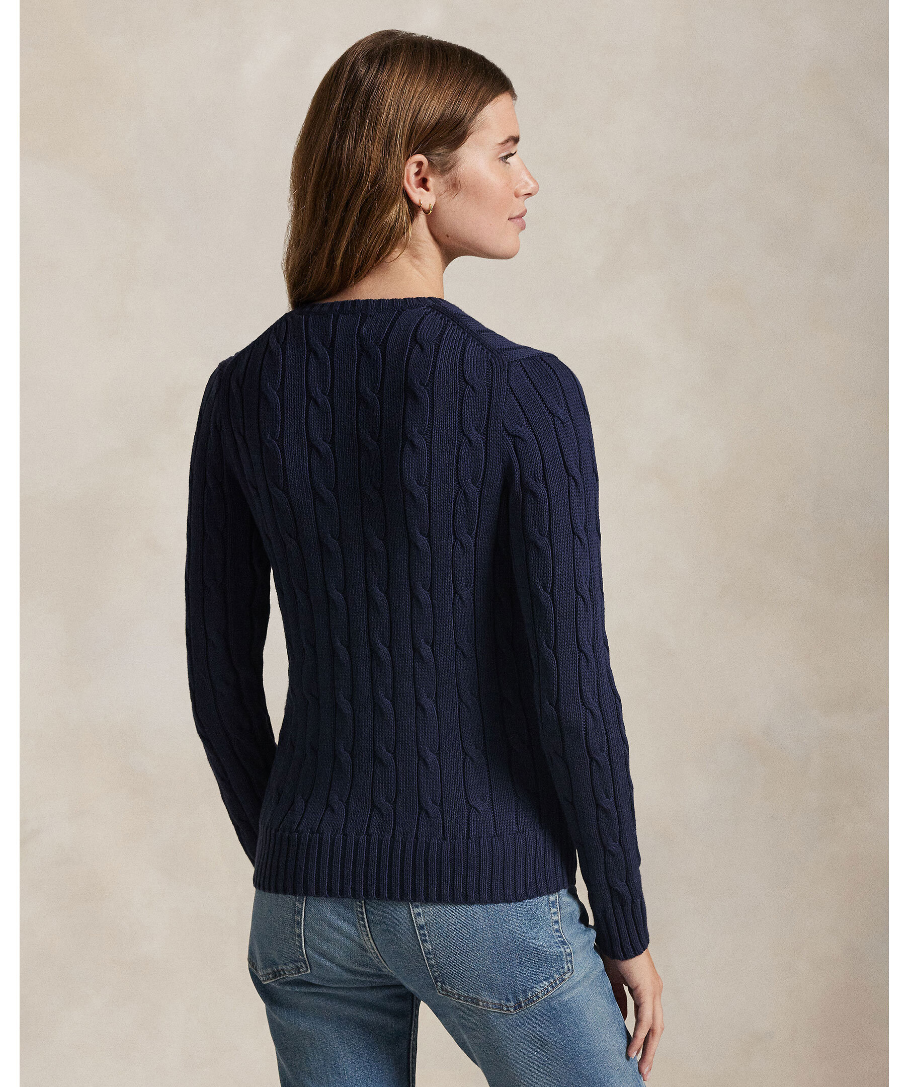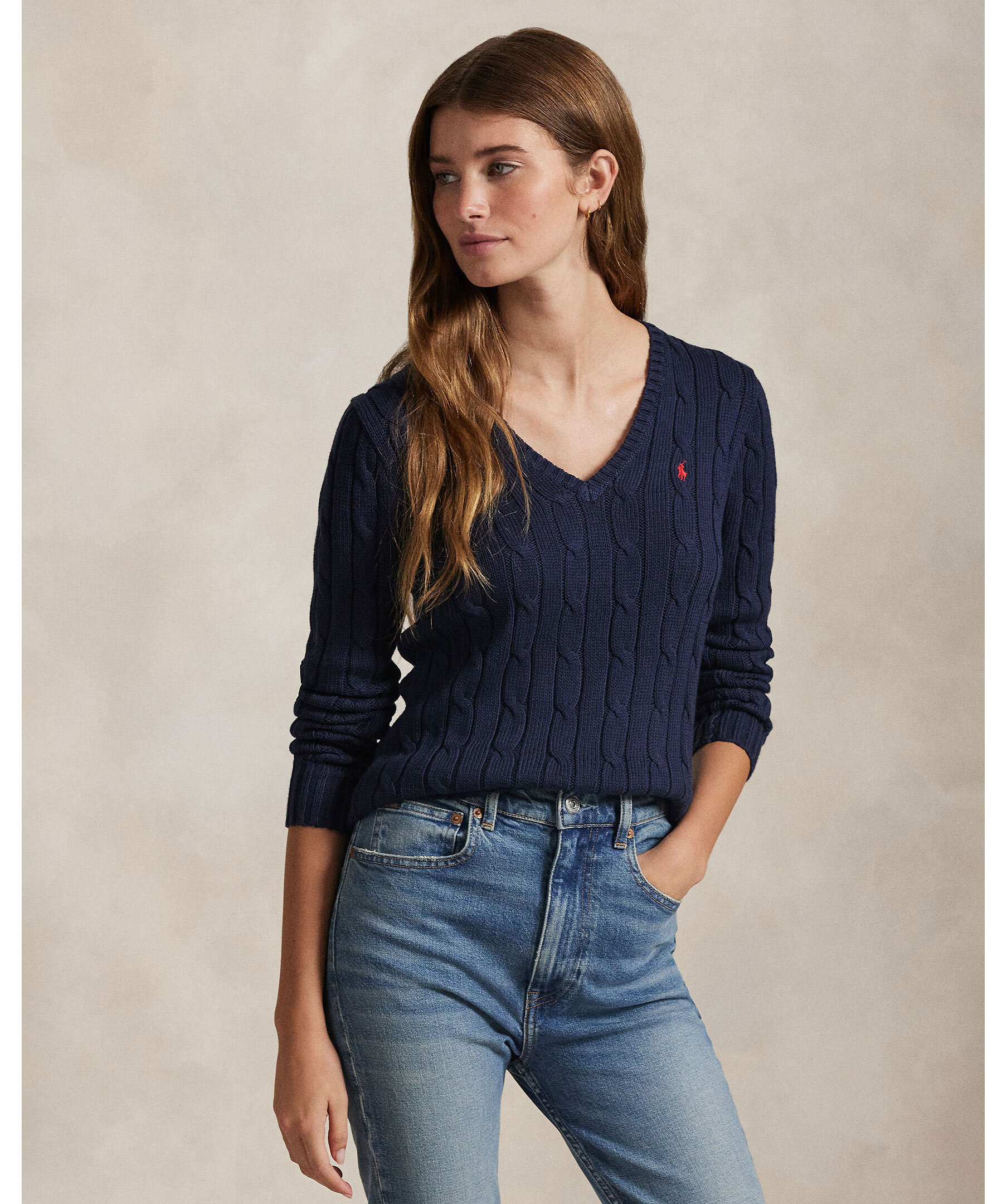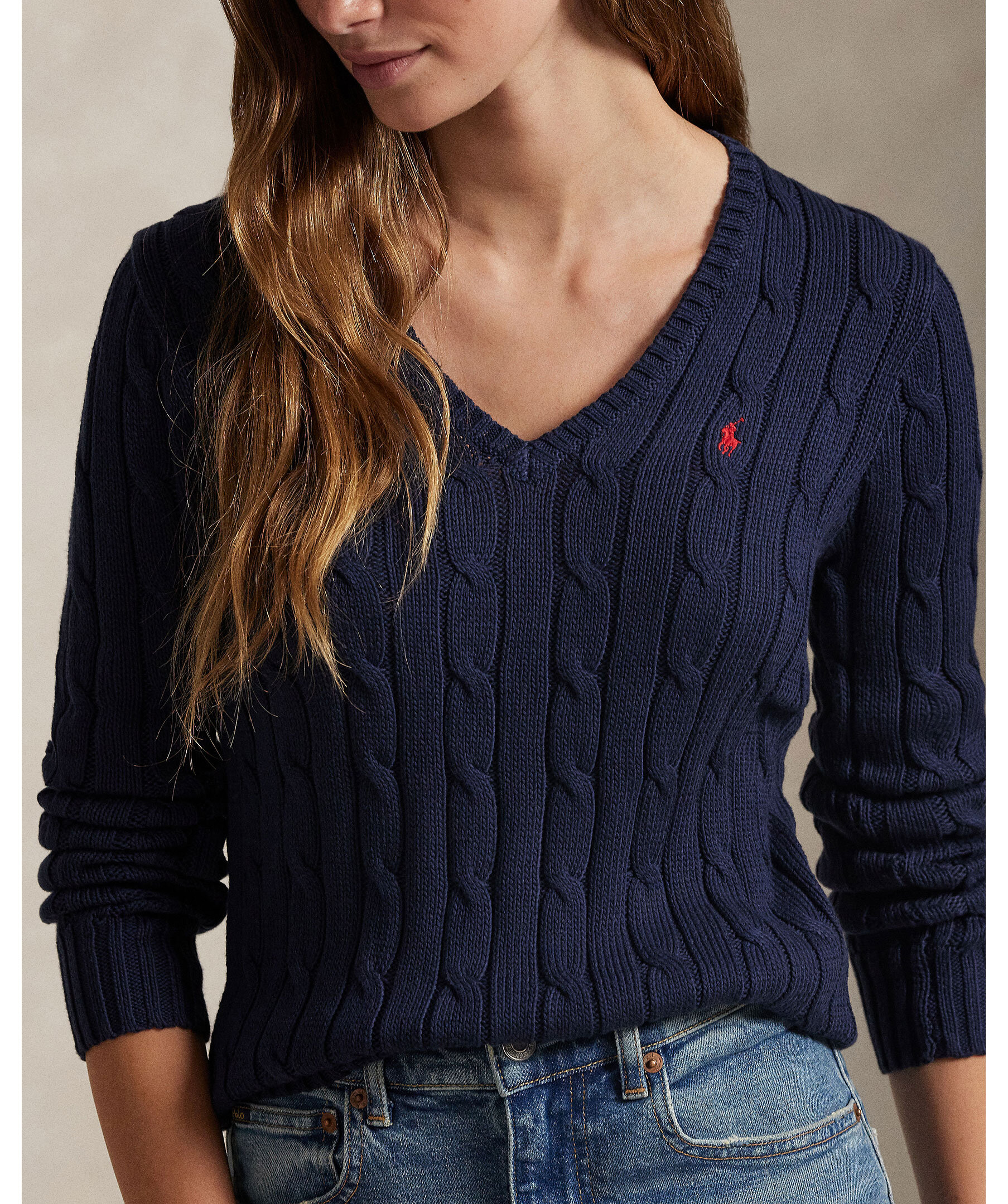 Marinblå kabelstickad tröja från Polo Ralph Lauren. V-ringad hals och broderad polohäst på bröstet. Smal passform. Gjord i mjuk bomull.