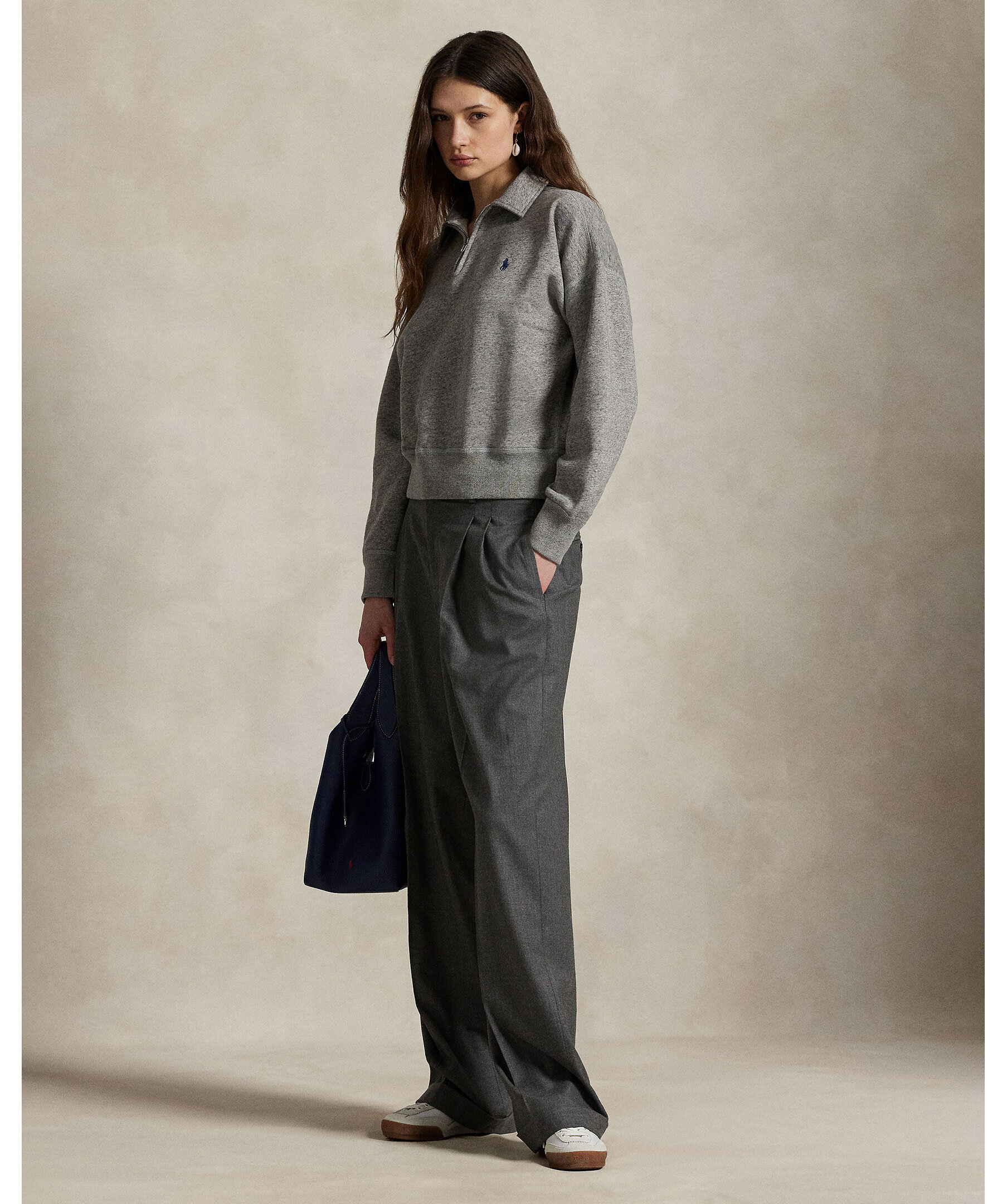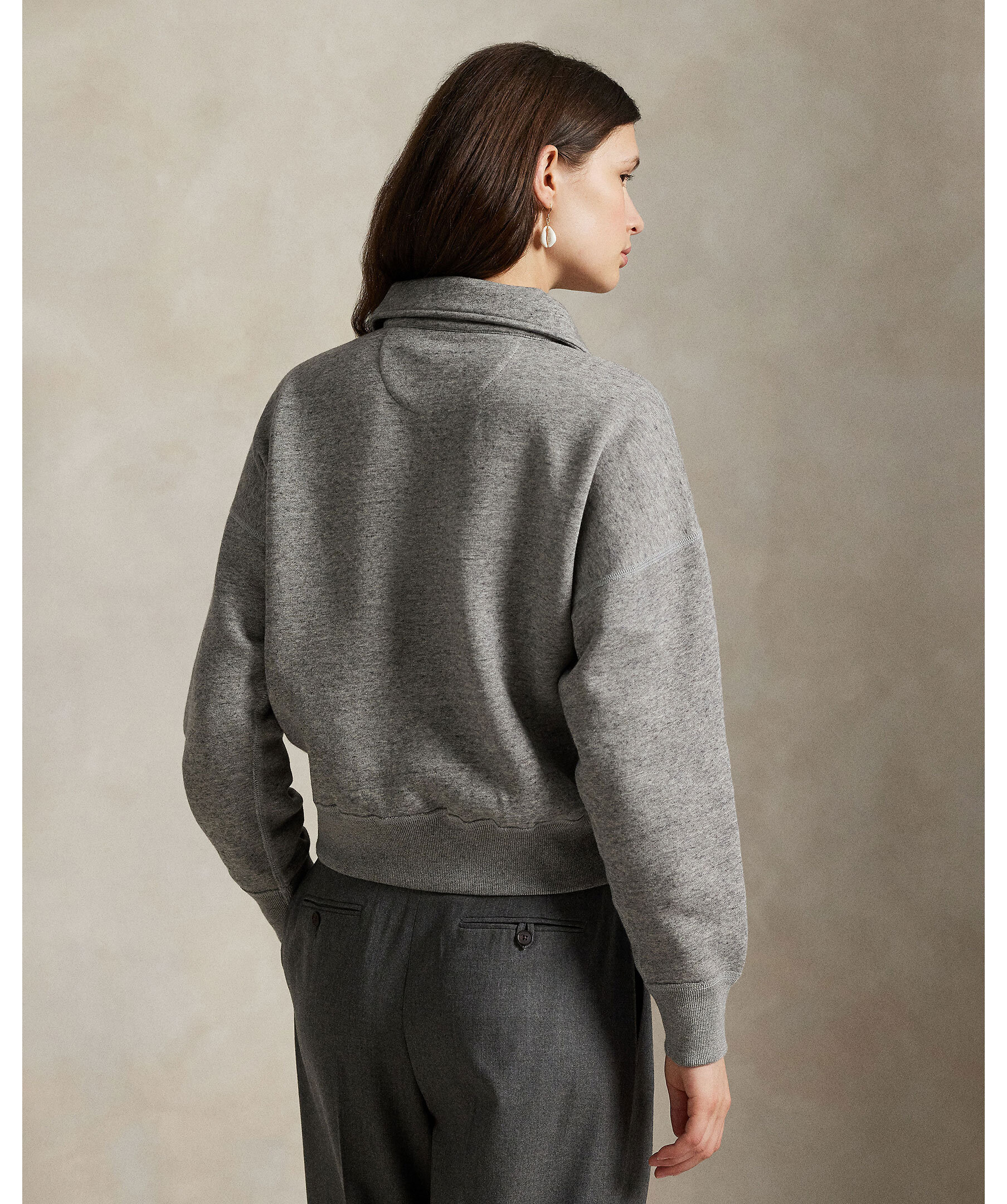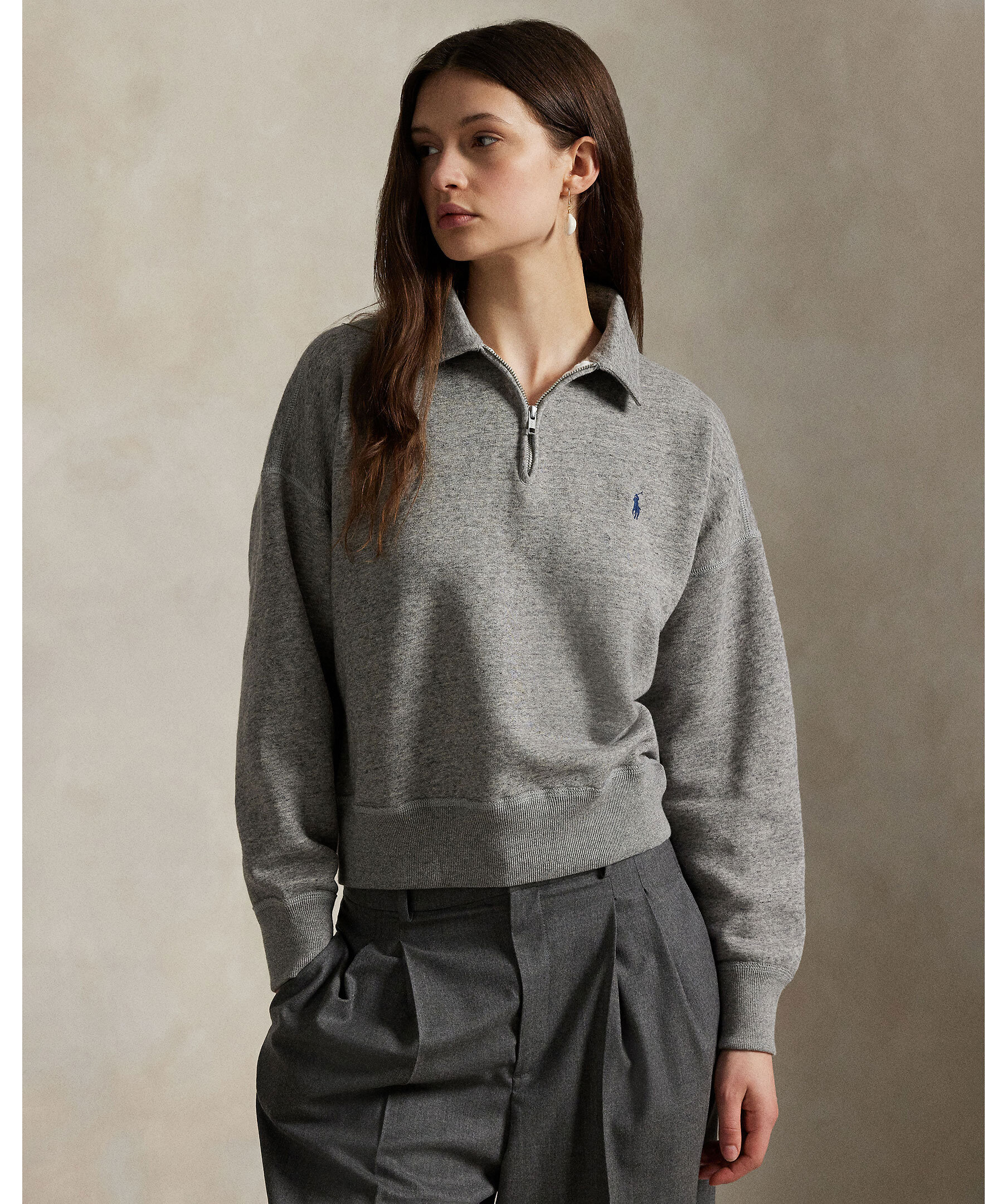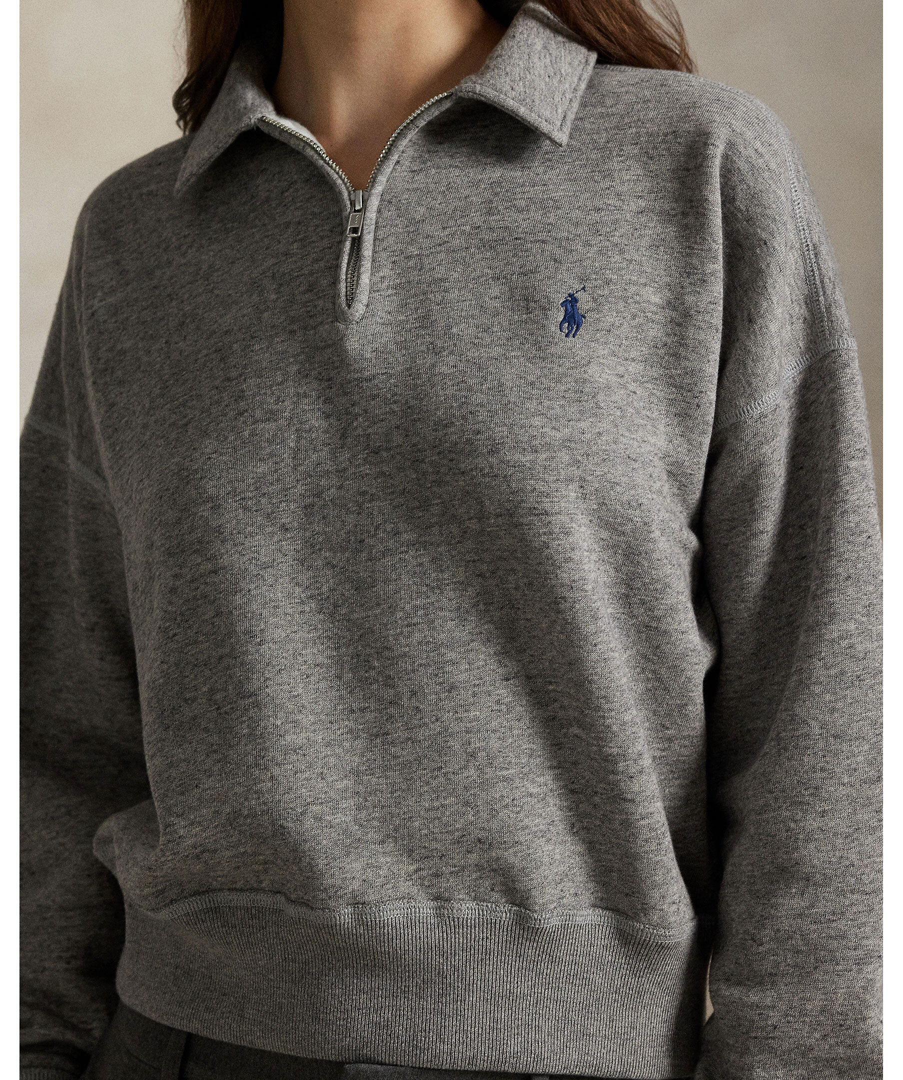 Grå zip tröja från Polo Ralph Lauren. Gjord i en mjuk bomullsblandning, ribbad muddar och krage med dragkedja. Broderad logotyp på bröstet.