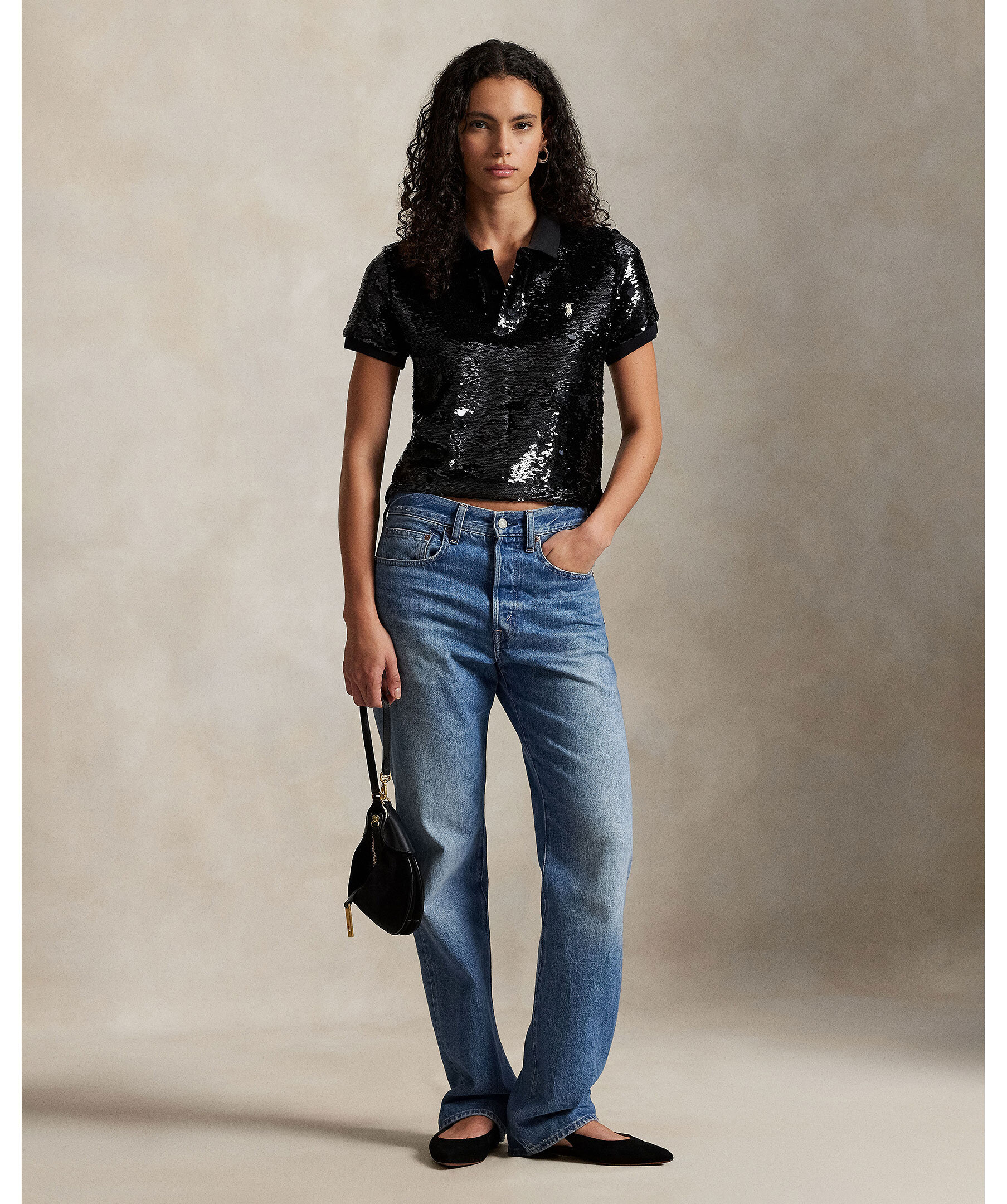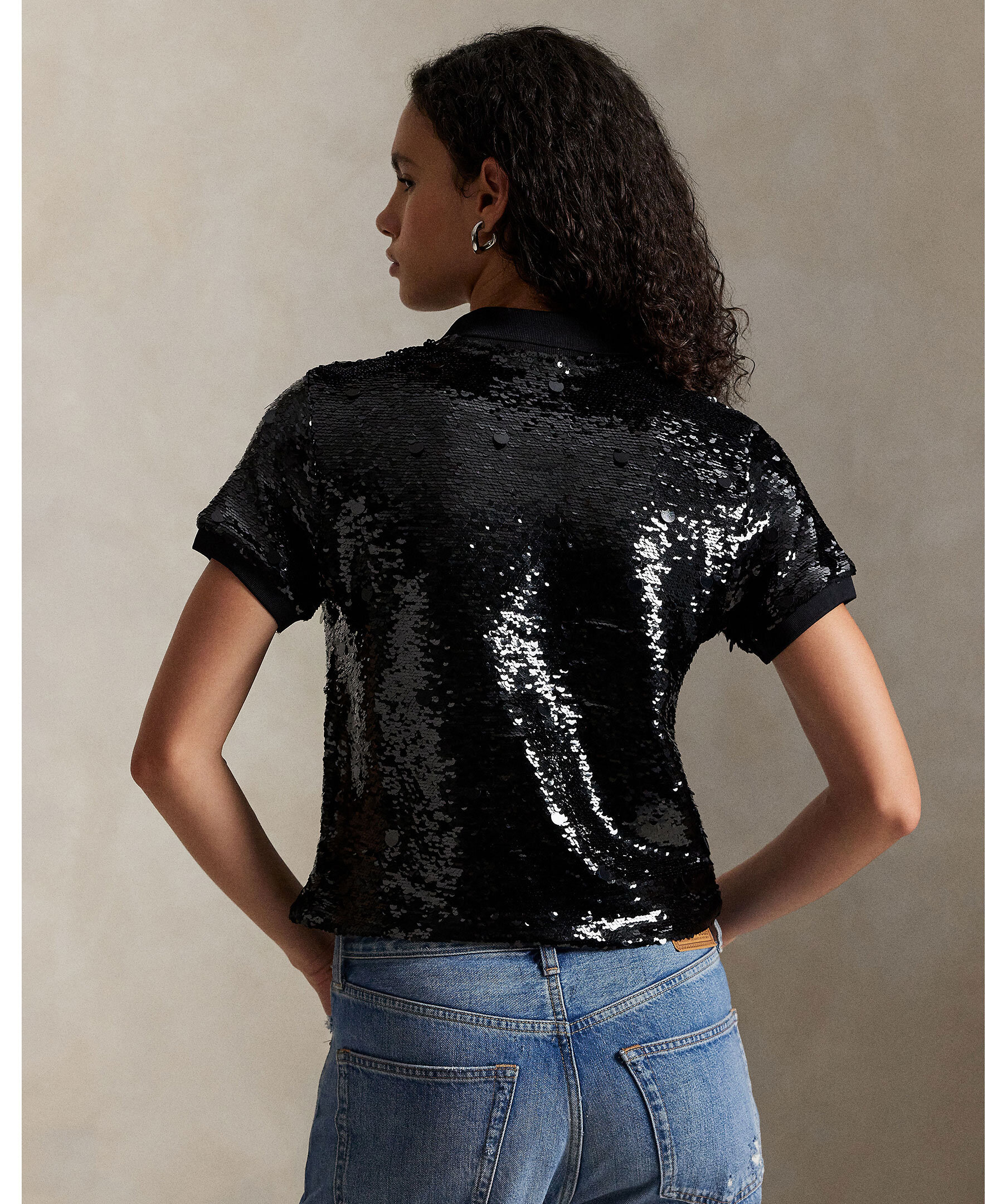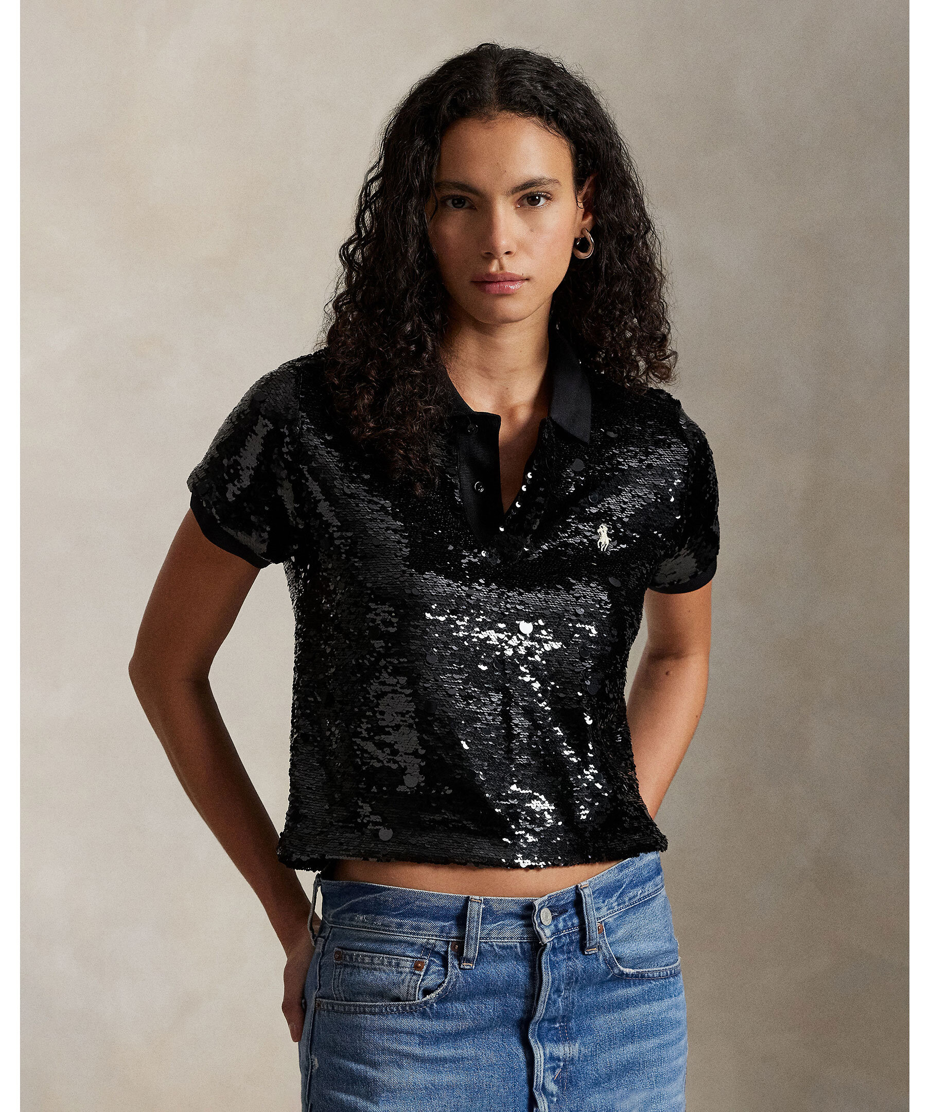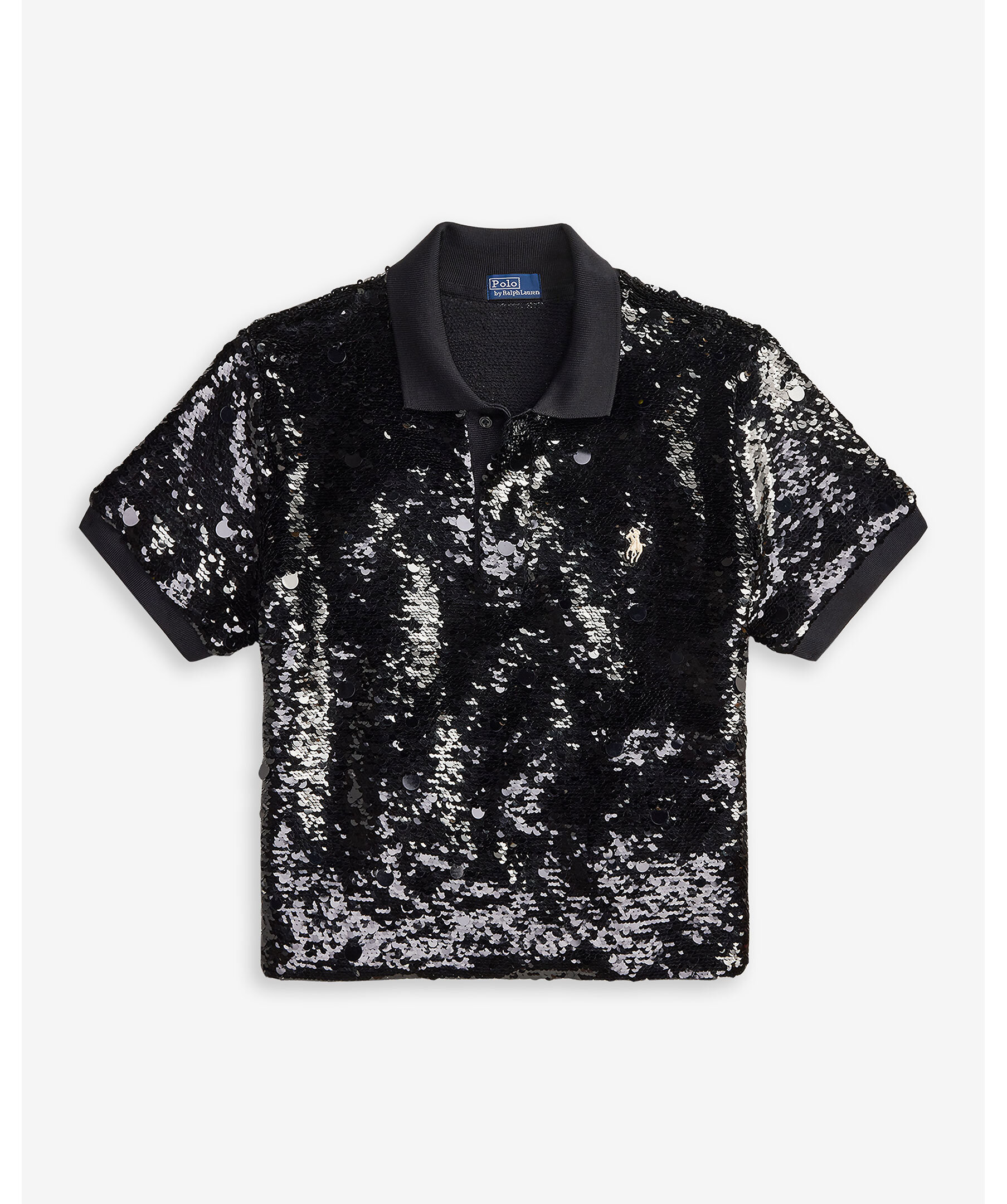 Croppad, kortärmad pikétröja från Polo Ralph Lauren. Slim fit. Tröjan är dekorerad med svarta, glansiga paljetter. Broderad polohäst på bröstet. Modellen är 178 cm lång och har på sig strl S.