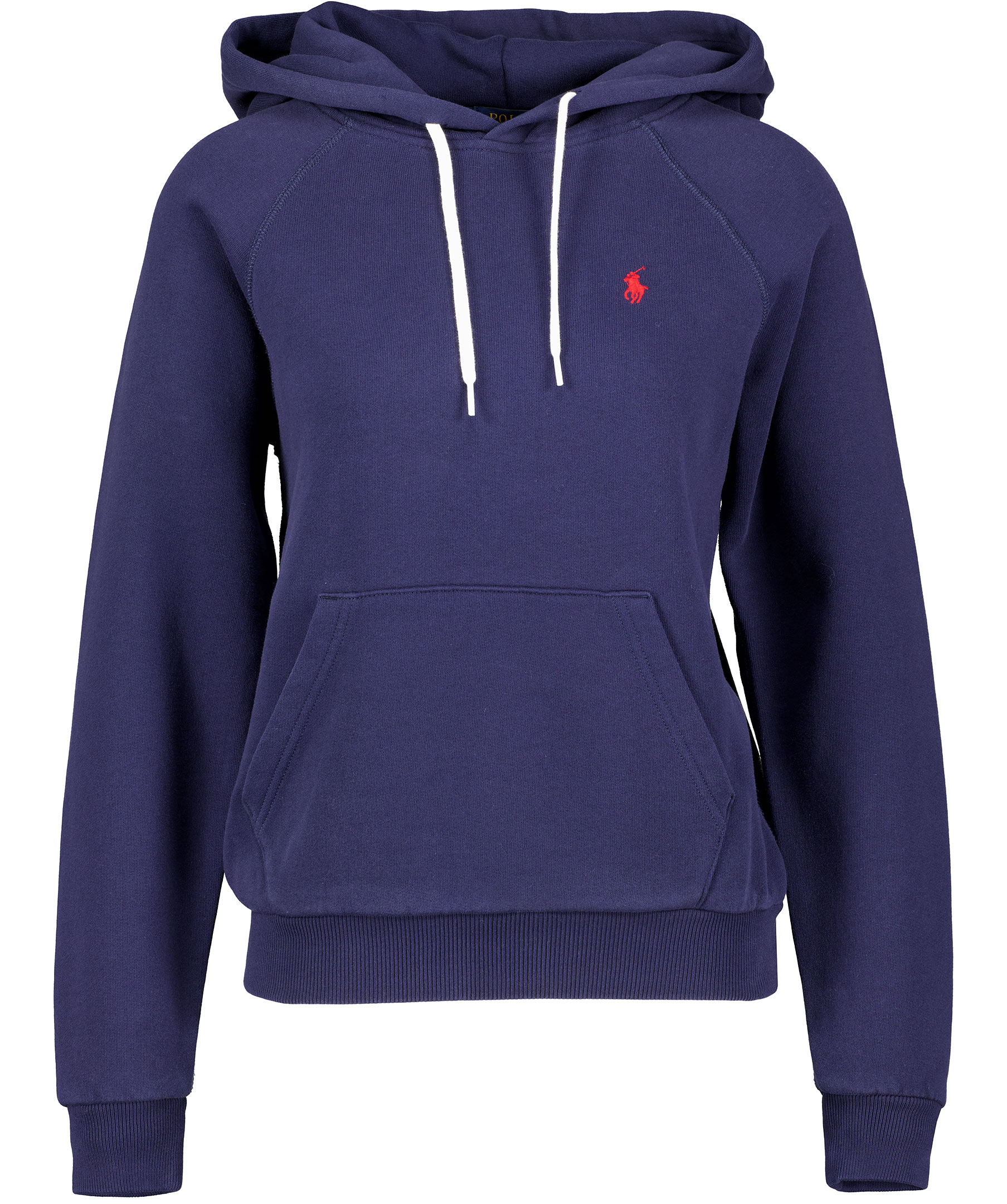 Marinblå hoodie från Polo Ralph Lauren. Broderad, röd logga på bröstet, avslappnad passform, och vit snörning i luvan. Ficka på magen och muddar i ärmslut och plaggslut.