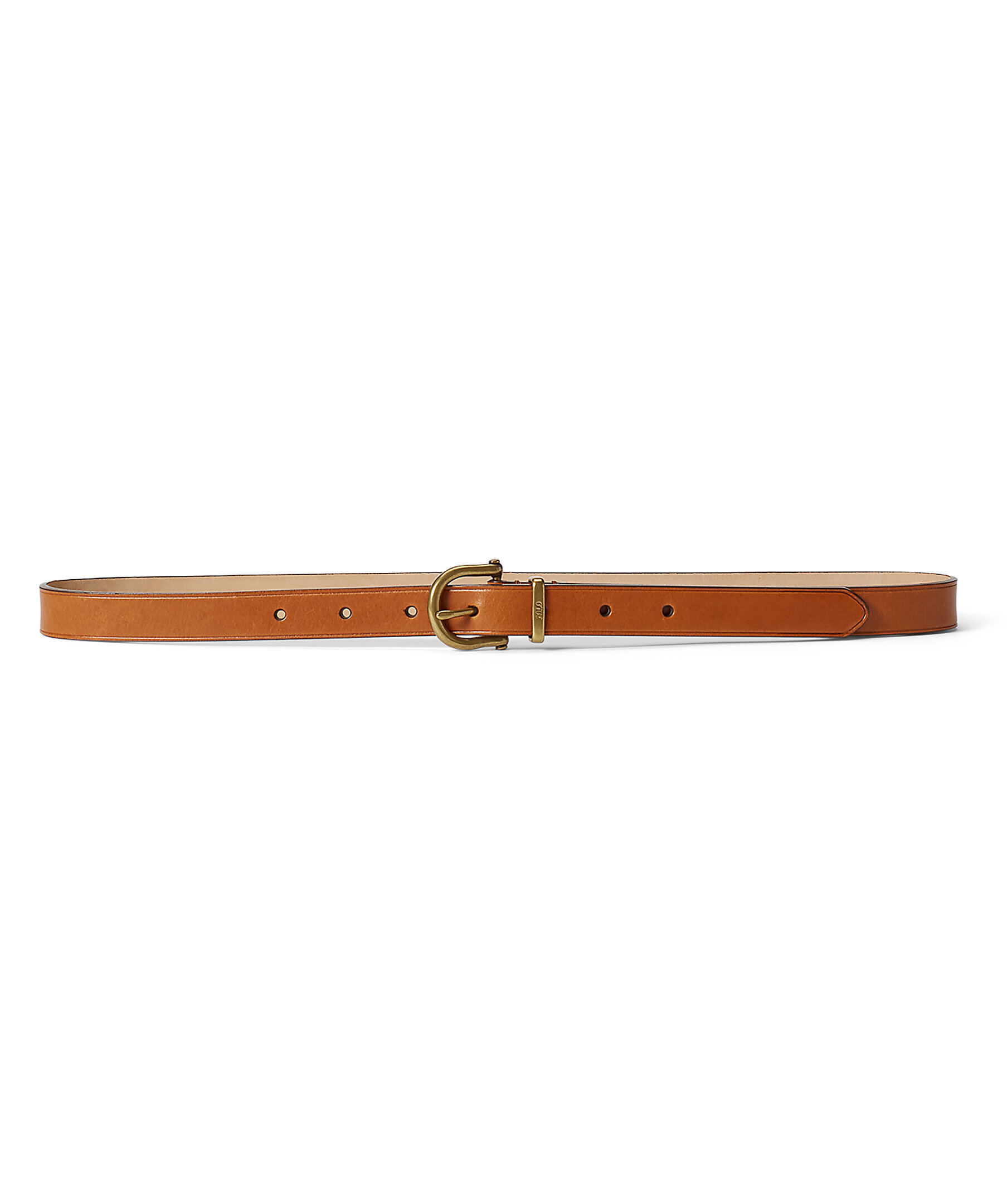 Konjaksfärgat, smalt läderbälte från Polo Ralph Lauren. Guldfärgat spänne med liten logotyp på som man justerar storleken på bältet med. 2 cm brett.