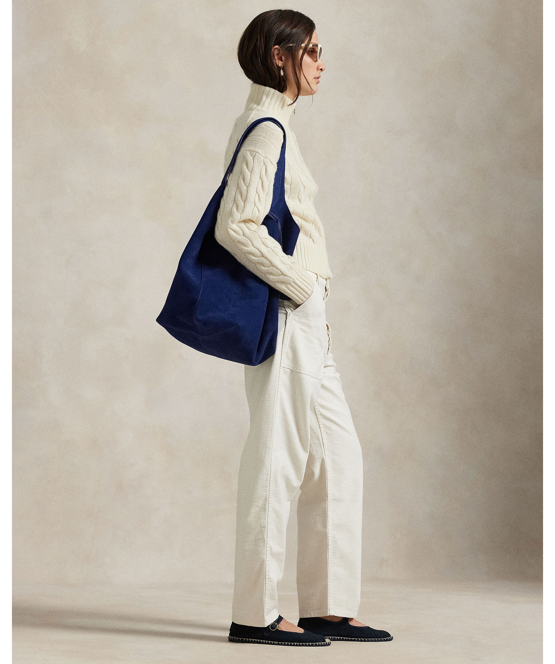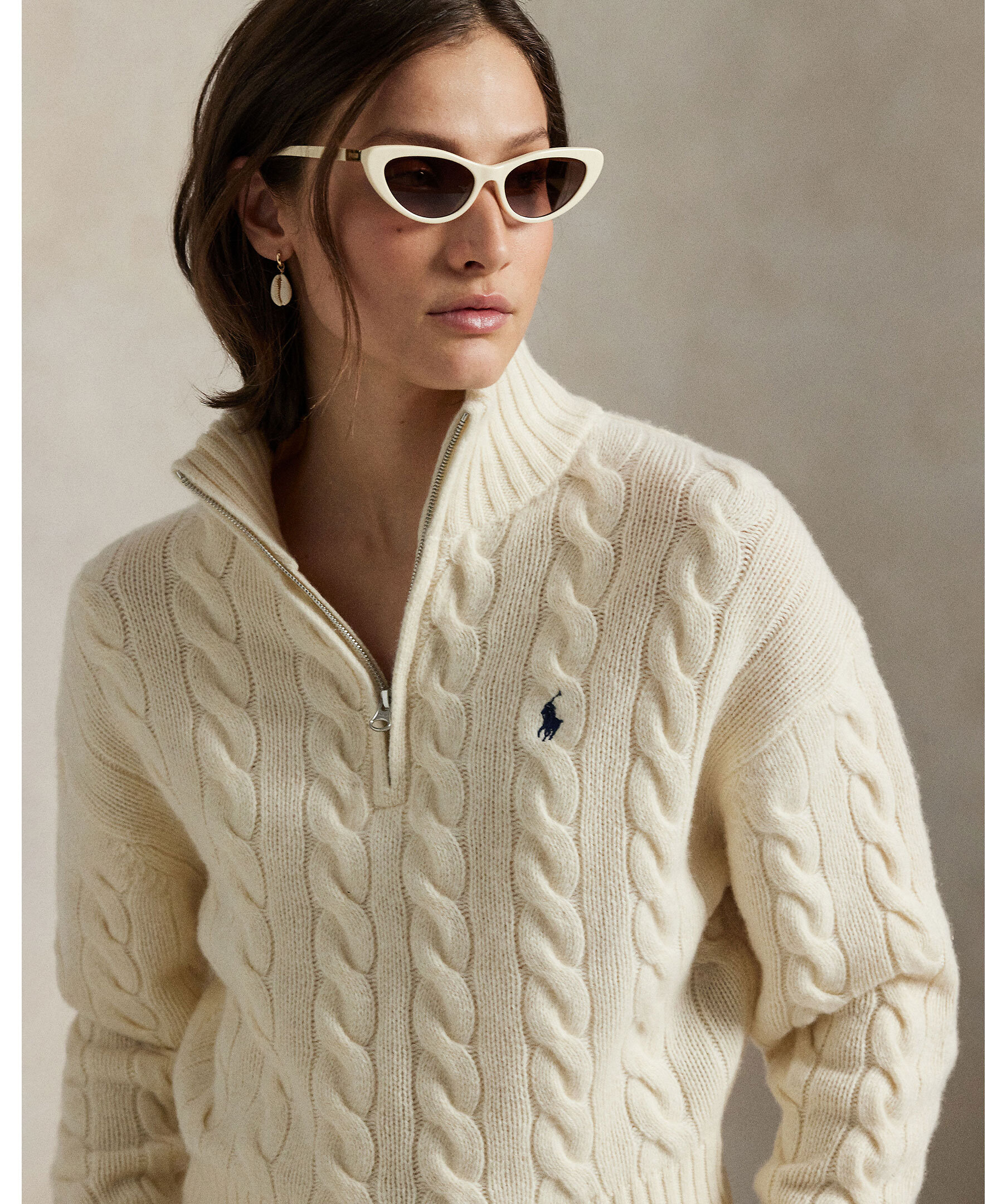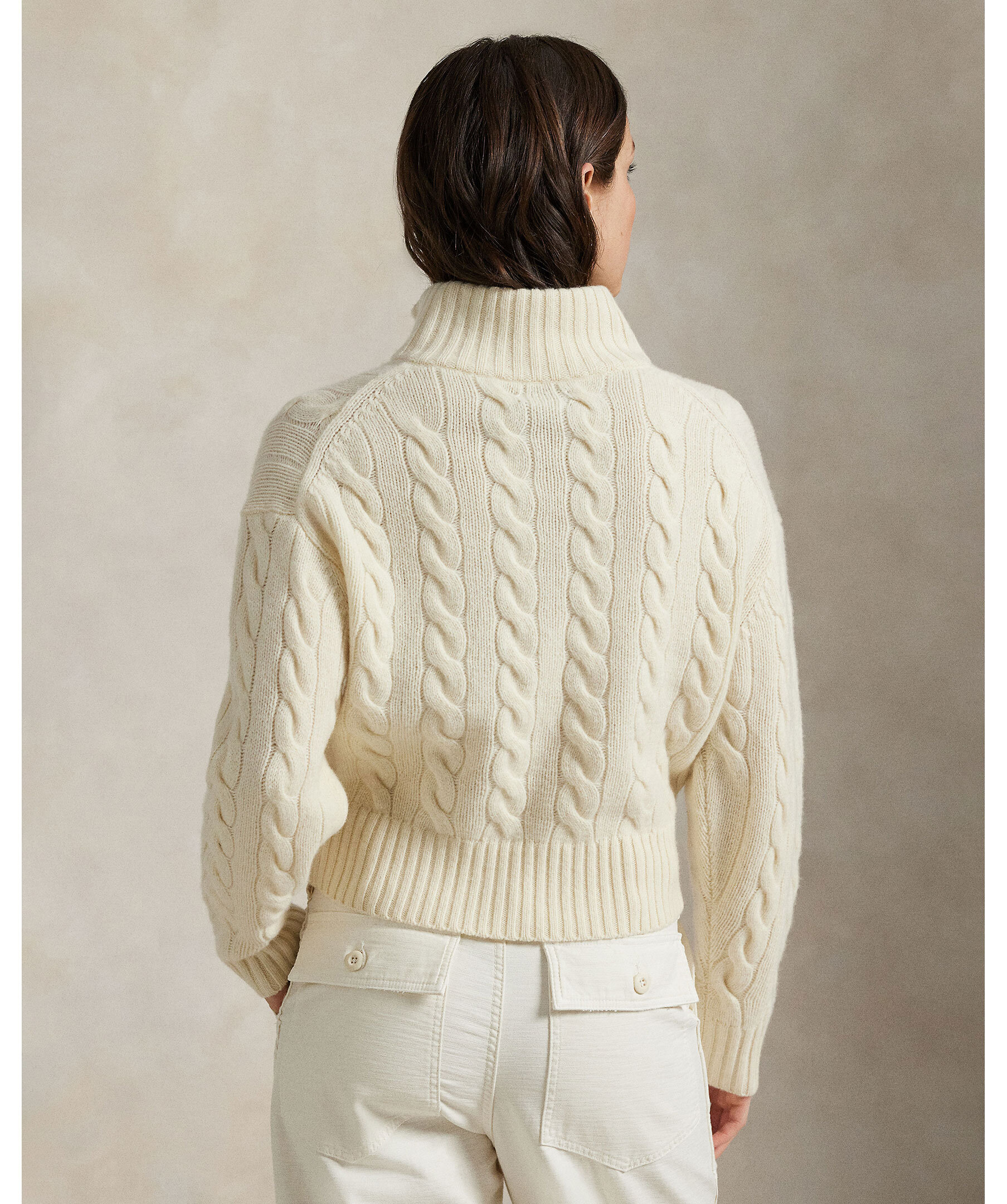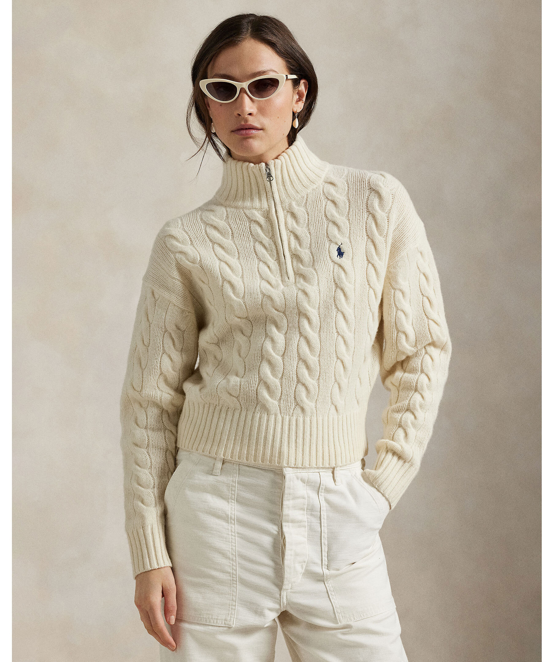 En avslappnad kabelstickad tröja från Polo Ralph Lauren. Gjord i italiensk ull och kashmir med mjuk, chunky textur. Designad med mockneck, halvdragkedja, ribbade muddar och fåll samt prydd med den ikoniska broderade Polohästen på bröstet.