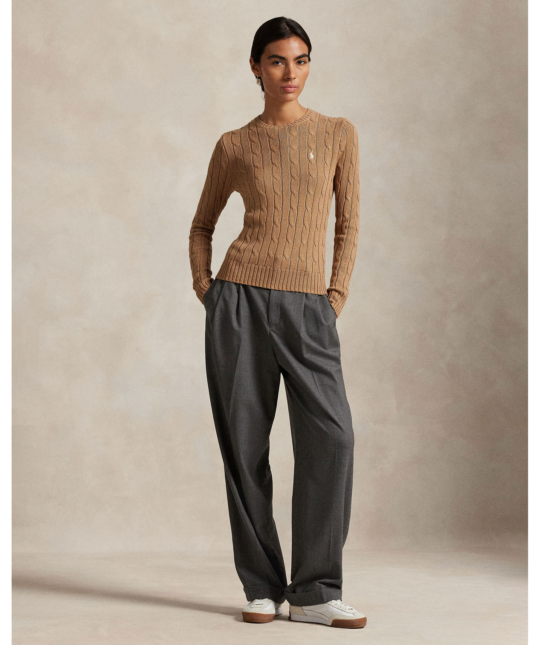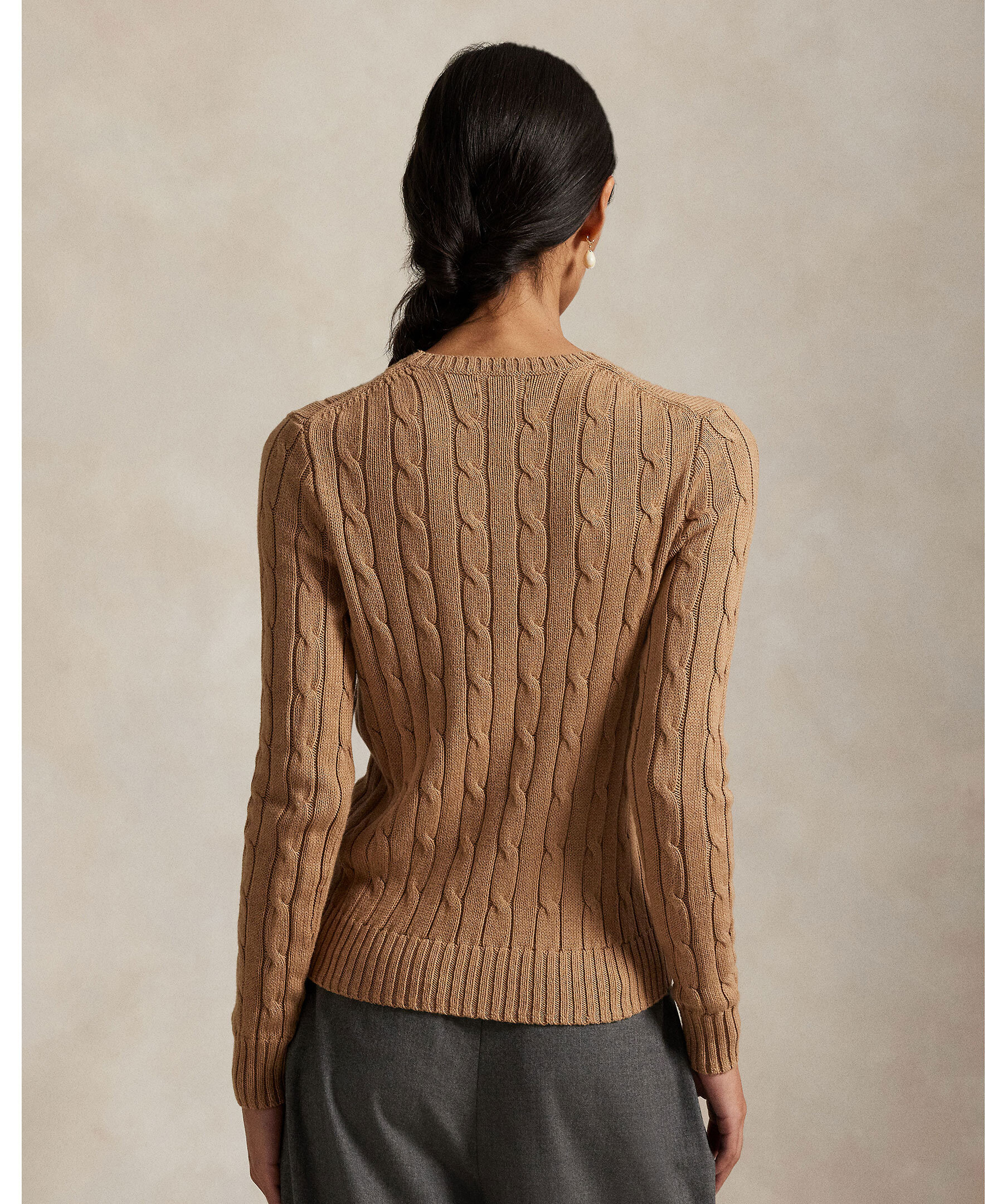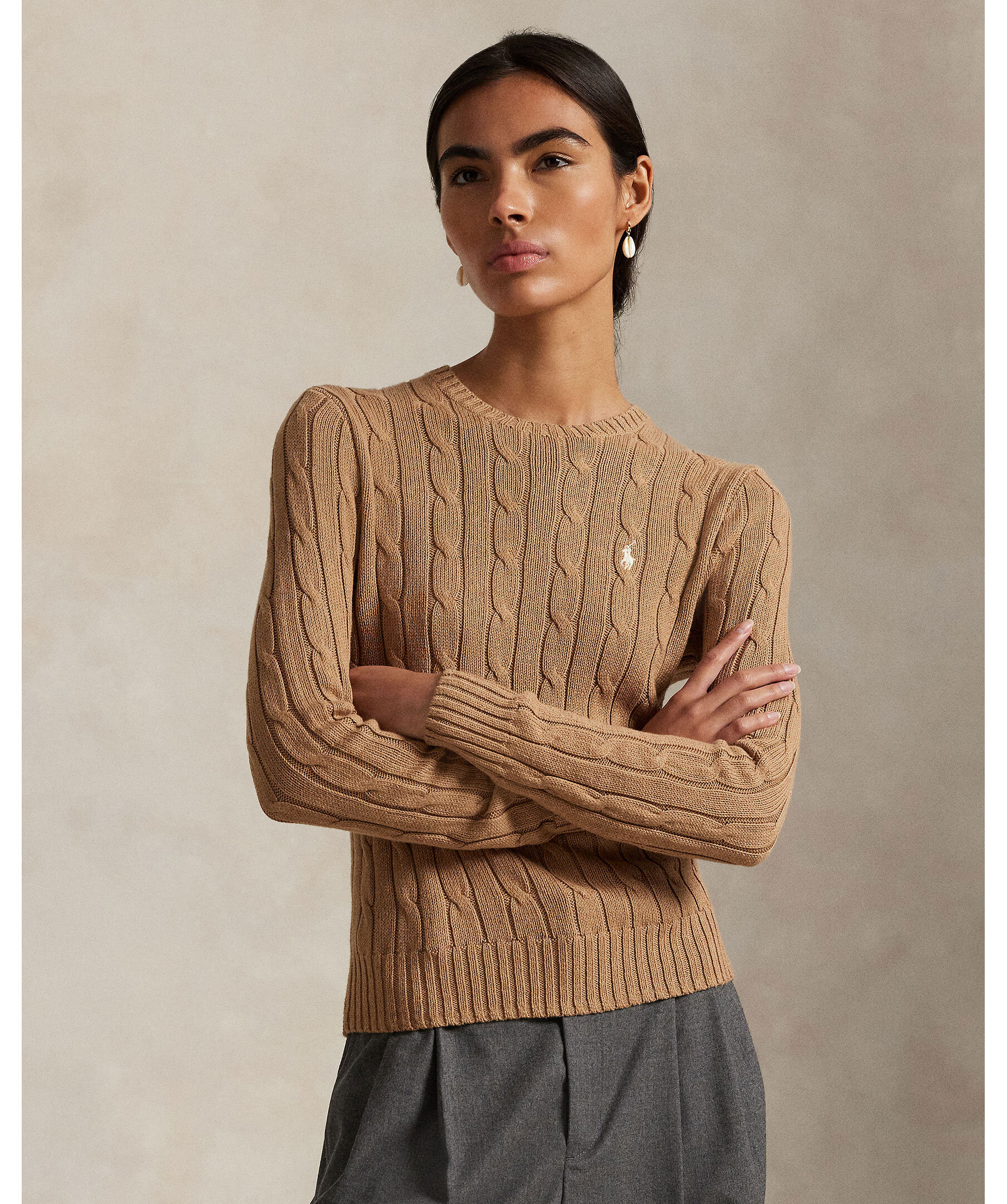 Beige, kabelstickad tröja från Polo Ralph Lauren. Slim fit passform och ribbstickade muddar. Broderad polo-häst på bröstet.