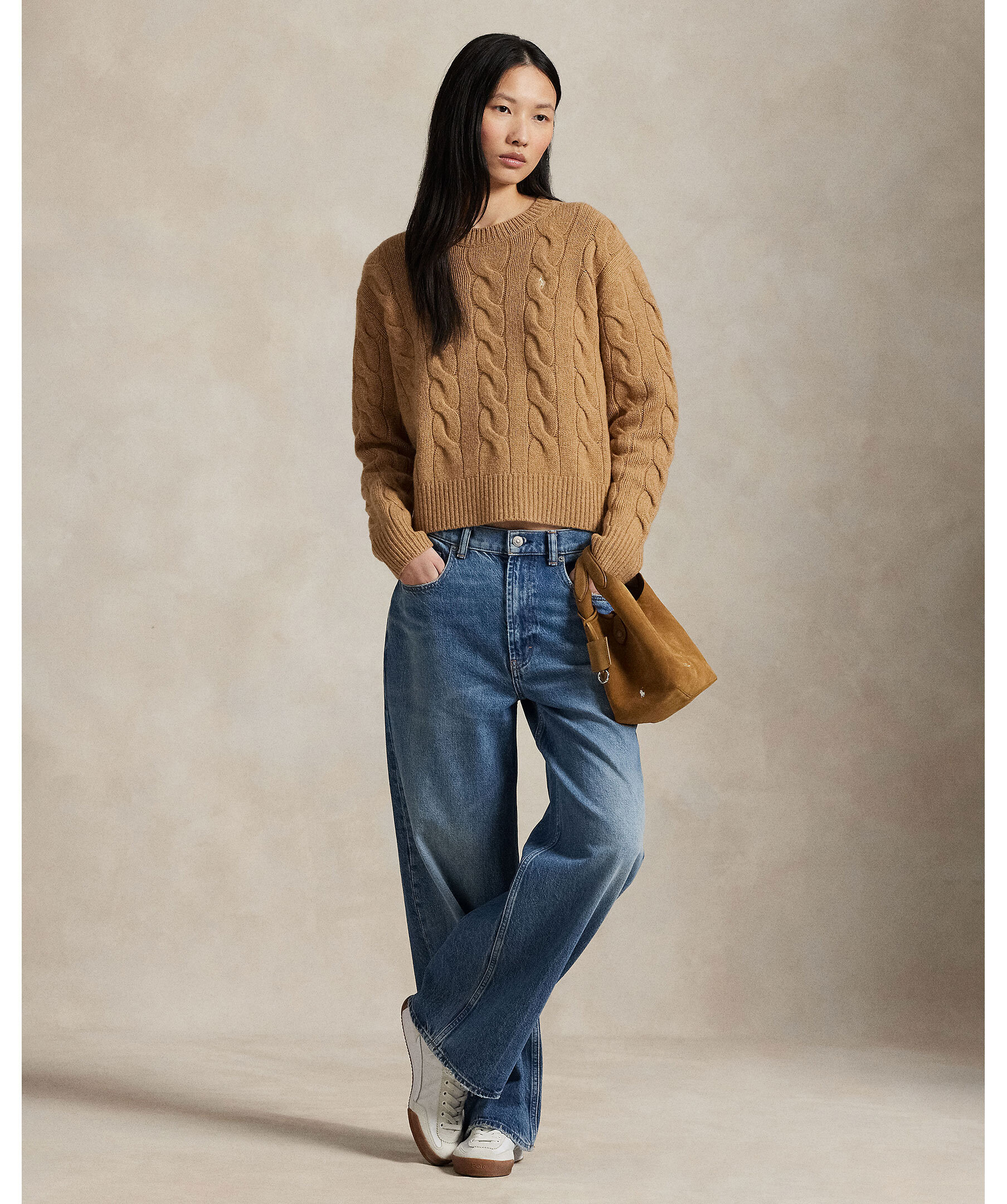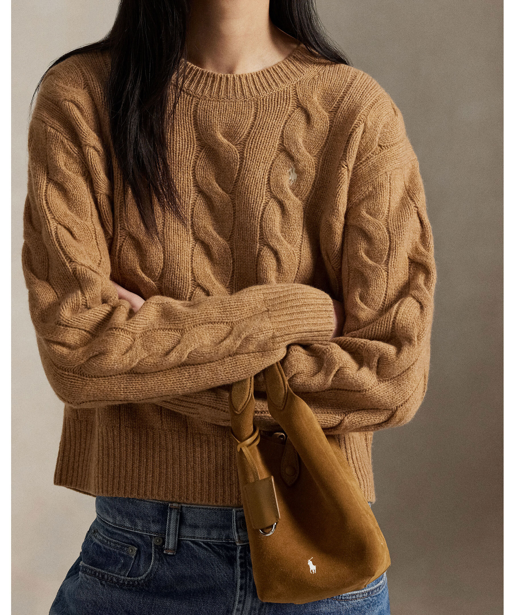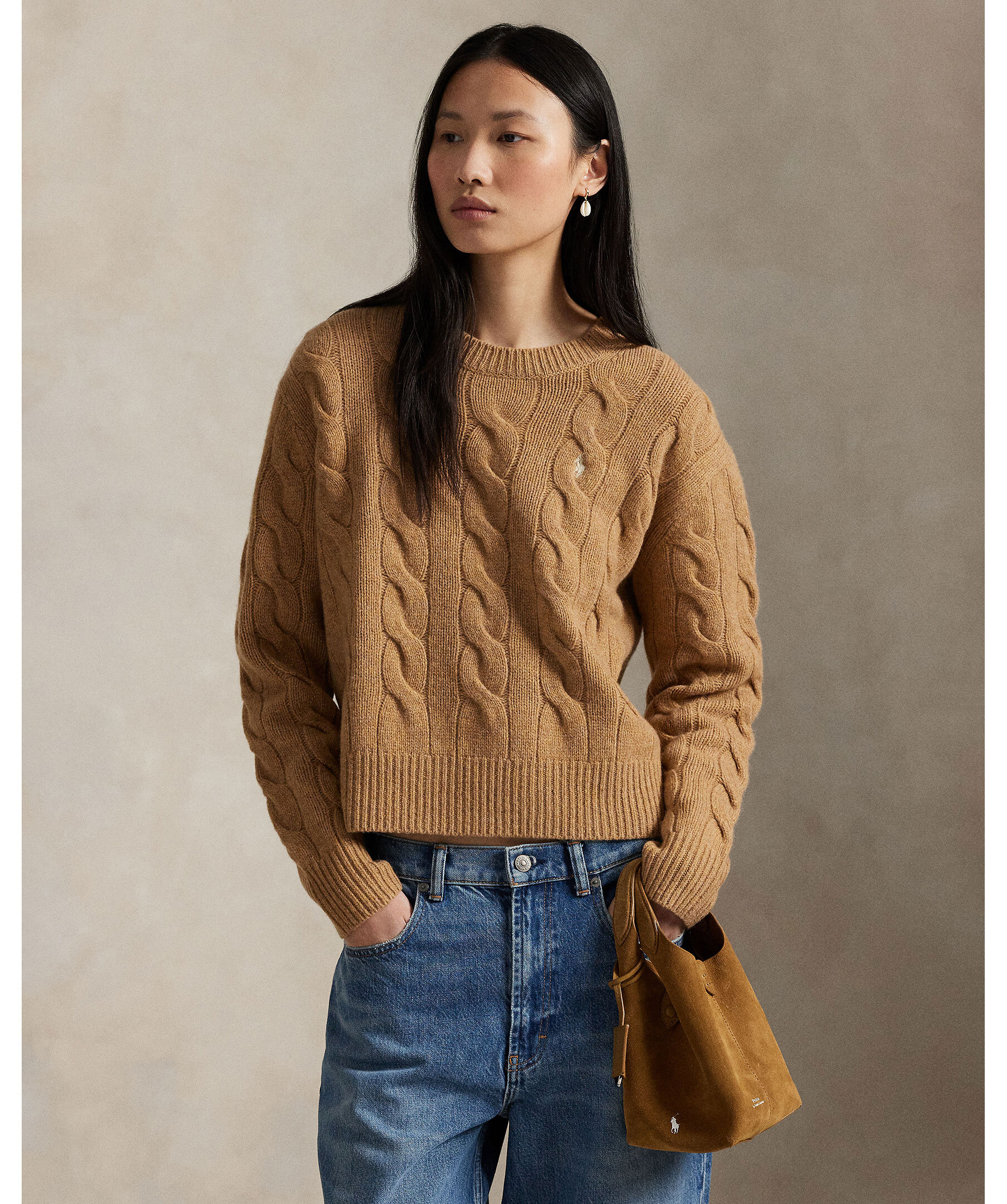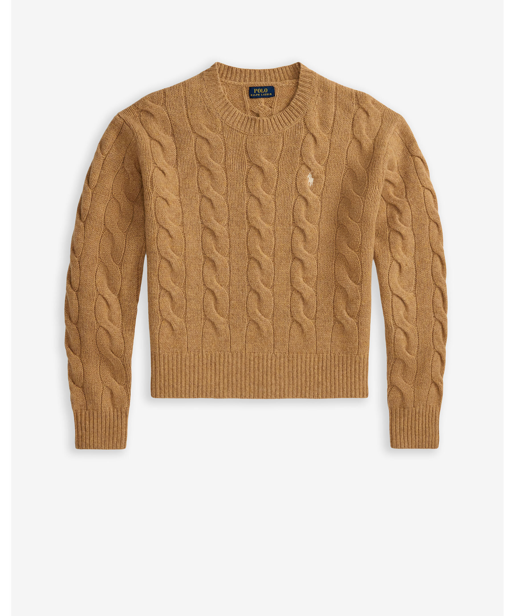 Beige, kabelstickad pullover från Polo Ralph Lauren. Tröjan har en något croppad passform och är gjord i en mjuk ull och kashmirblandning. Broderad polohäst på bröstet.