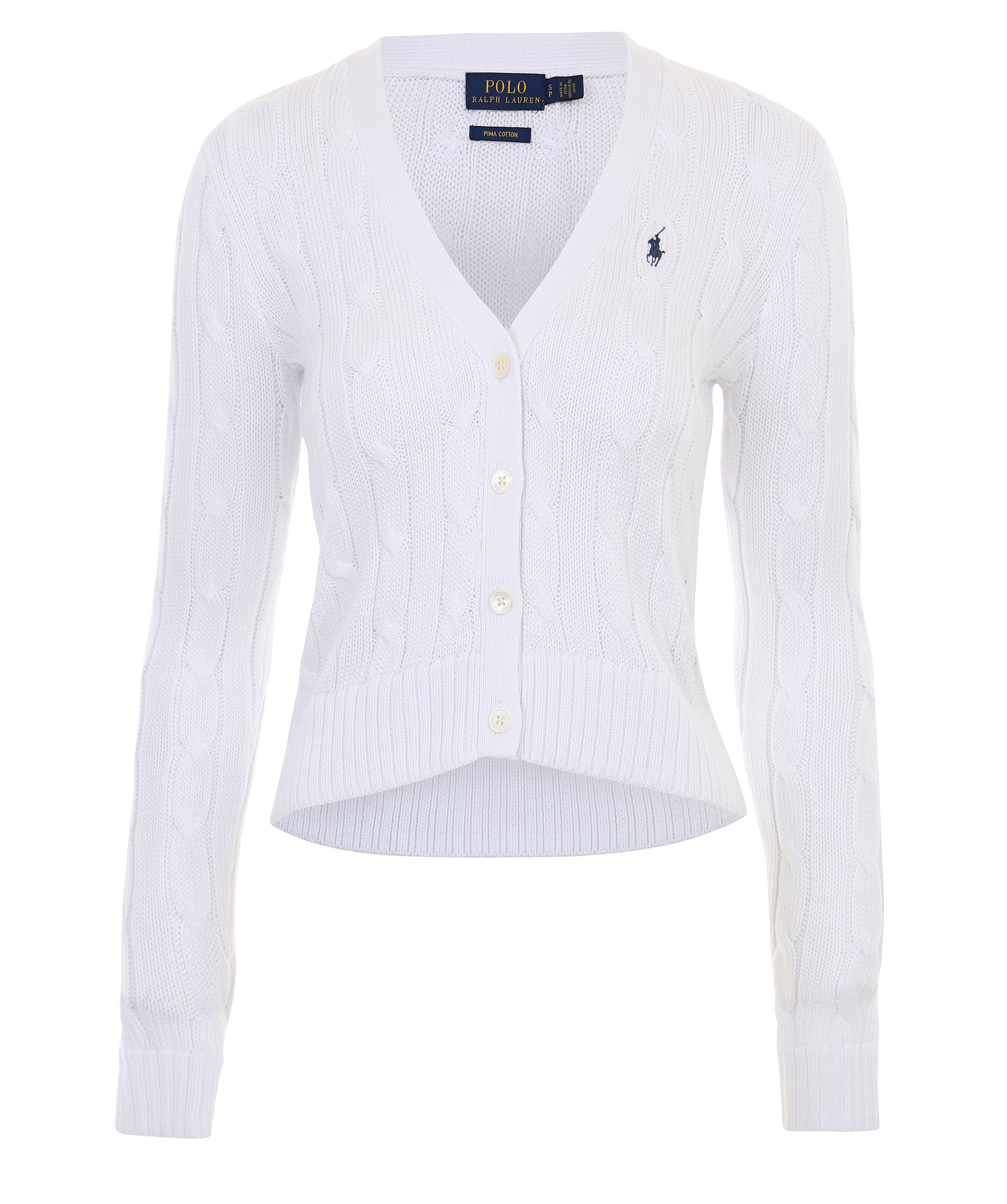 Grovt kabelstickad cardigan från Polo Ralph Lauren. Broderad polospelare på bröstet.