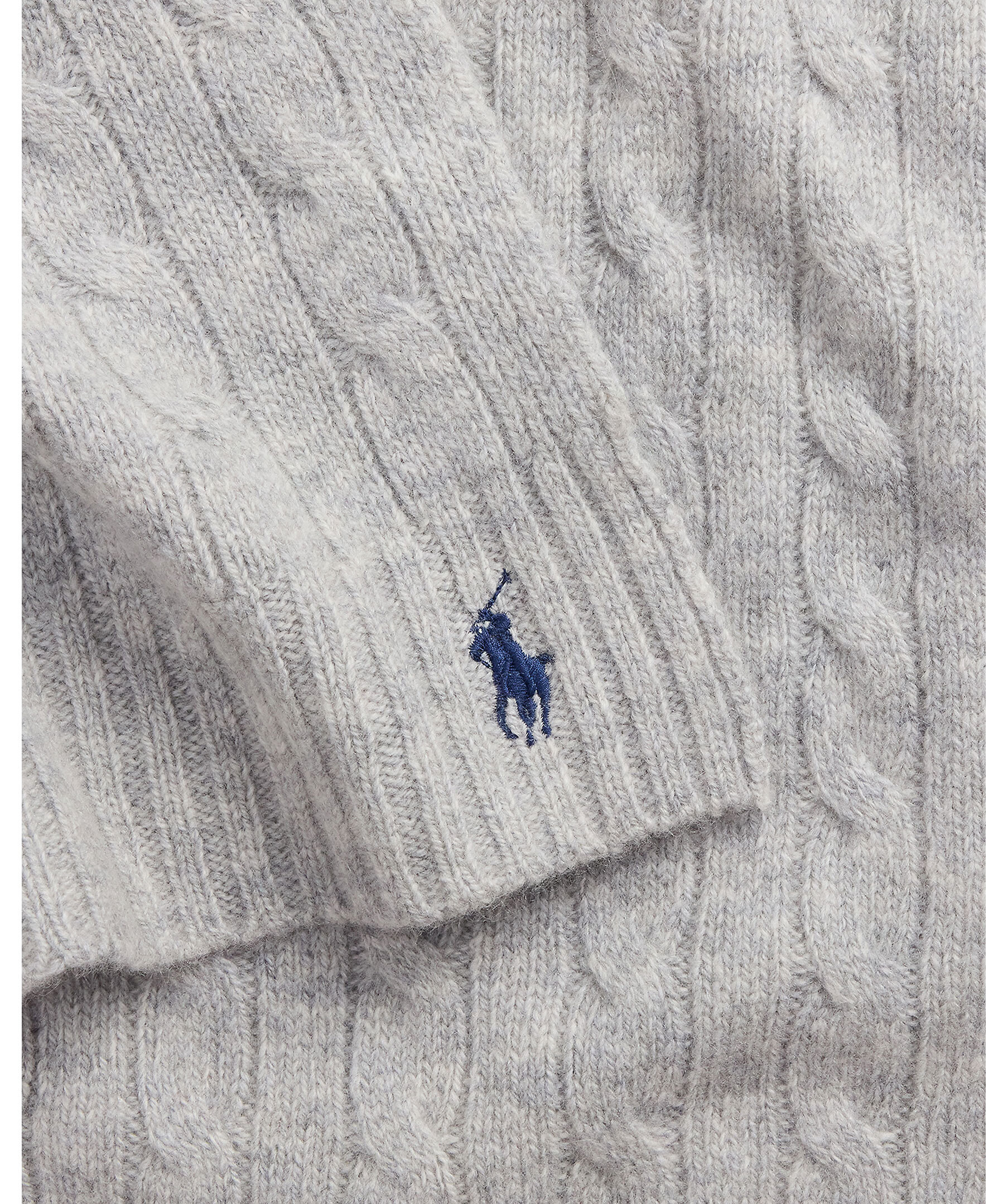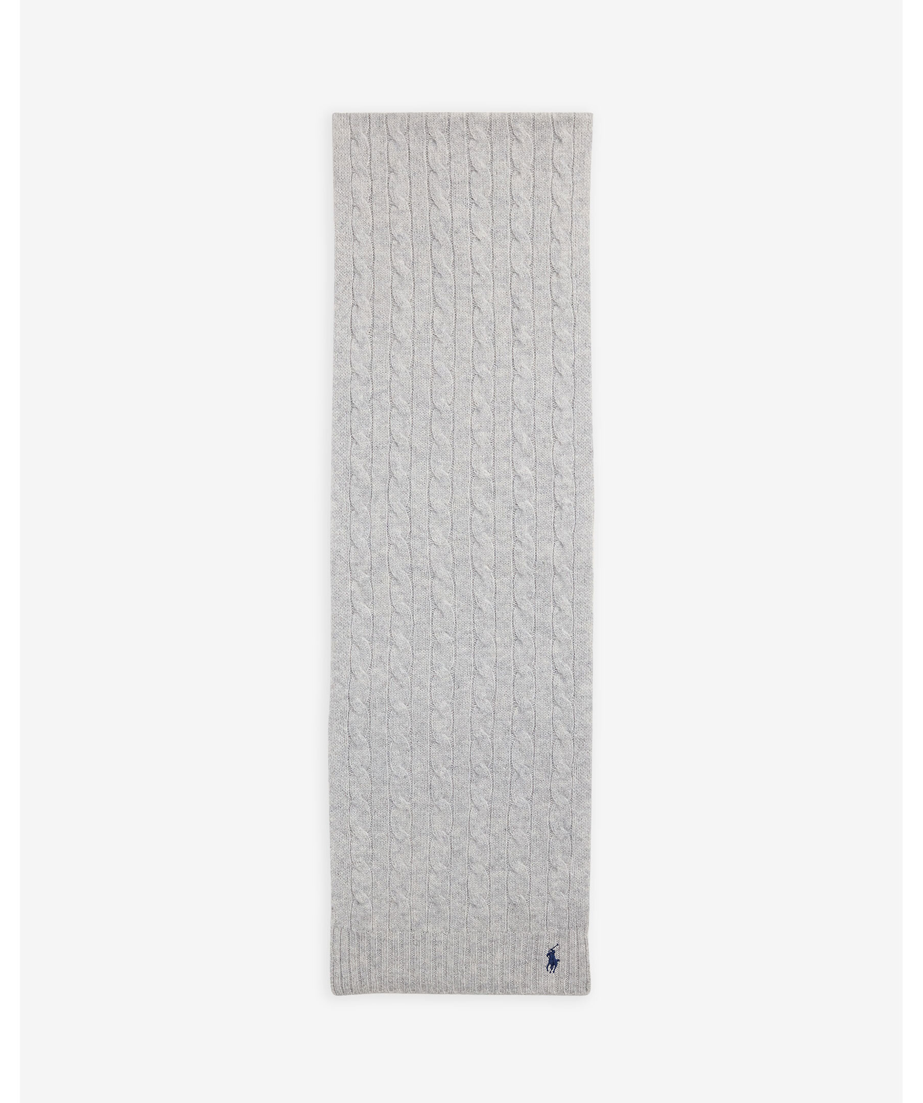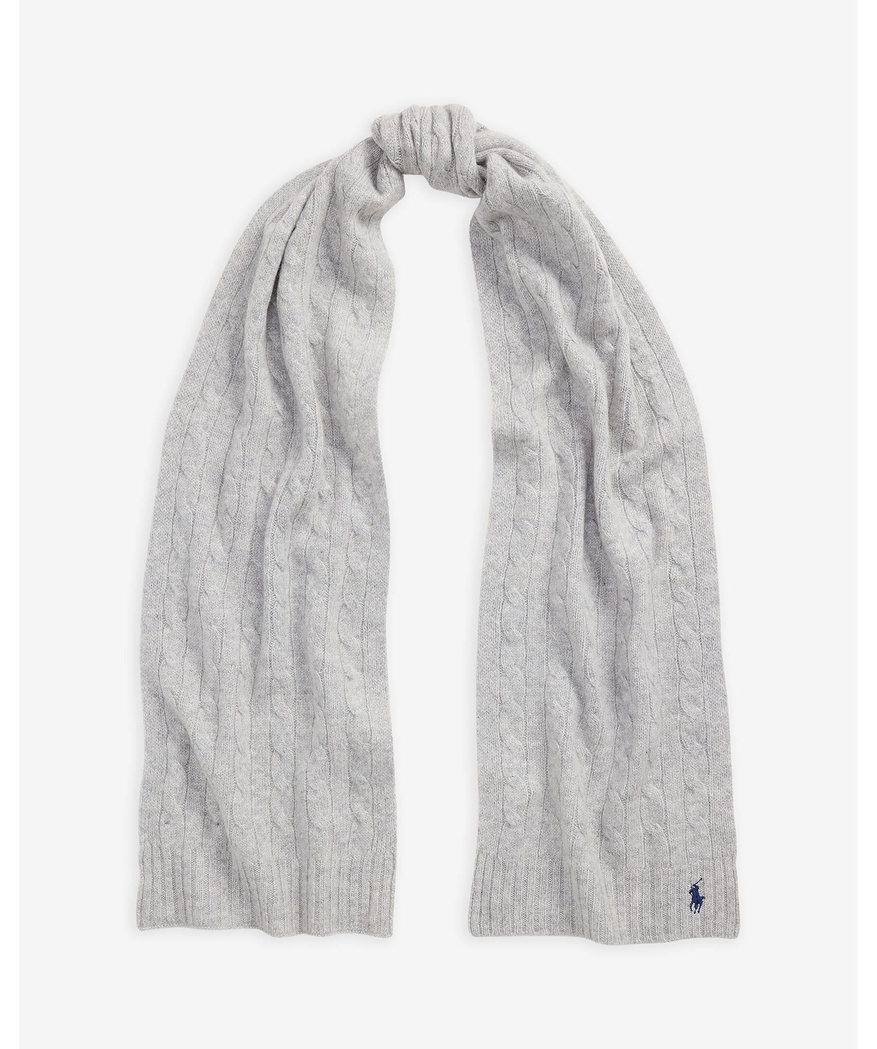 Grå, kabelstickad halsduk från Polo Ralph Lauren. Gjord i en mjuk ull och kashmirblandning. Mått: 182,9cm lång och 26,7cm bred.