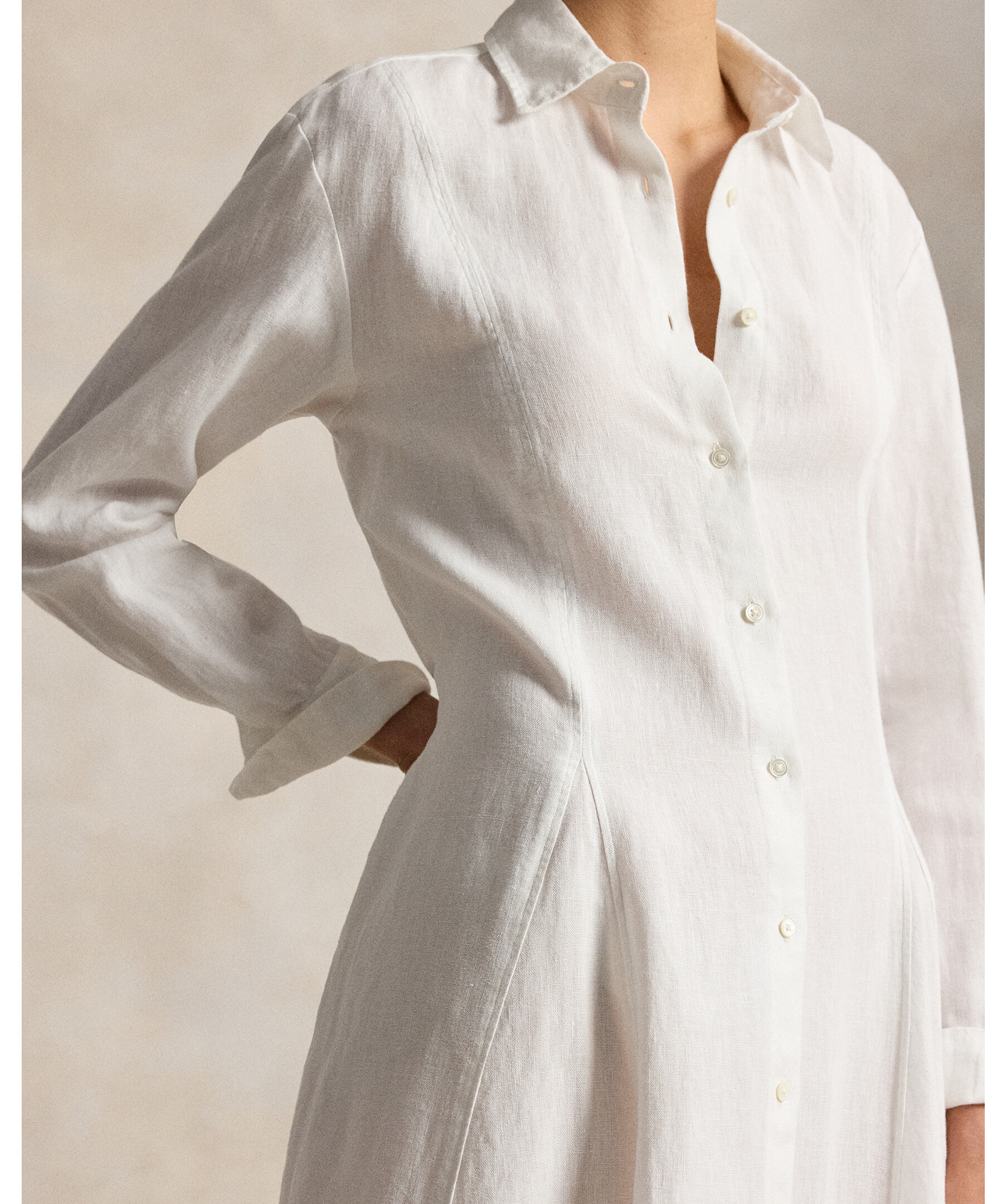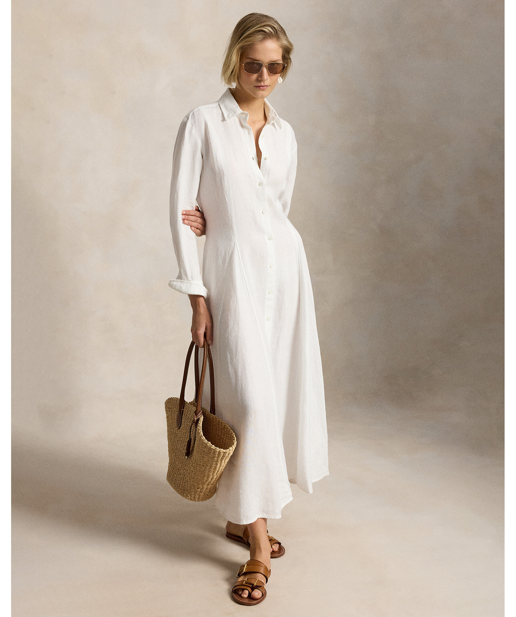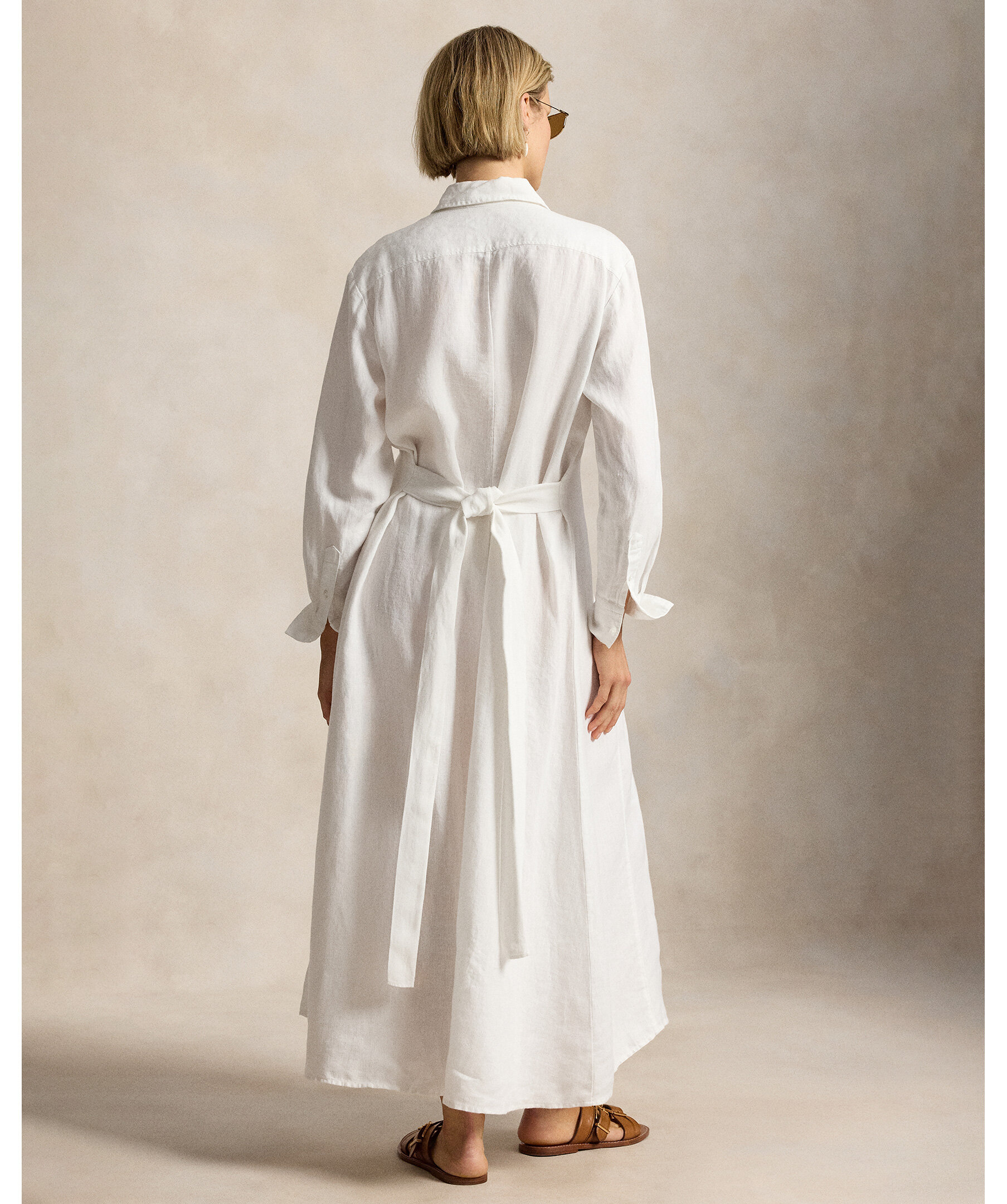 Vit skjortklänning från Polo Ralph Lauren. Designad för en svepande A-linjeform med rena prinsessömmar. Den är fint vävd med medeltjockt linne och har klassiska detaljer, som en spetsig krage och knappslå. Den är färdig med knytband i midjan som kan fästas fram eller bak.