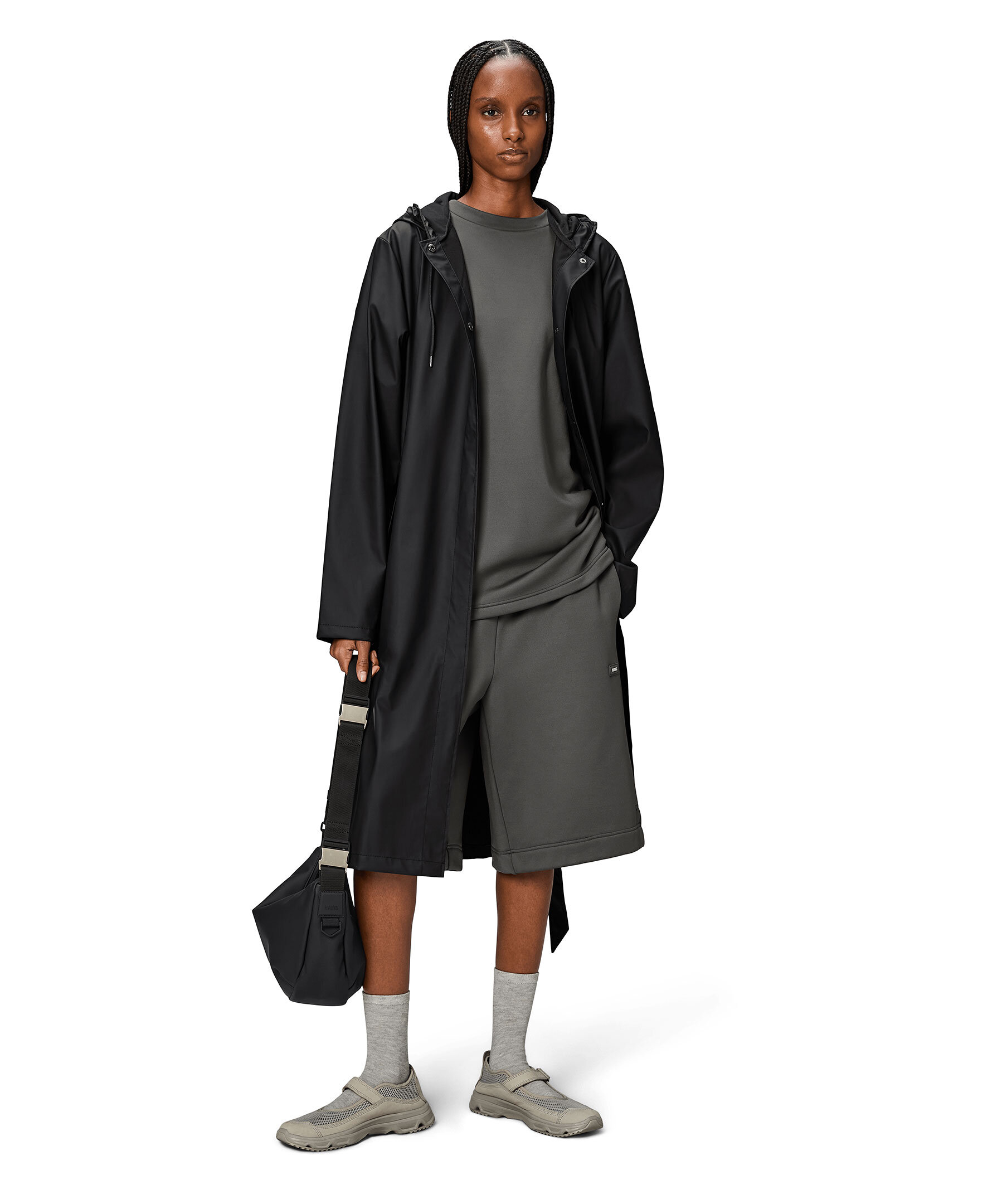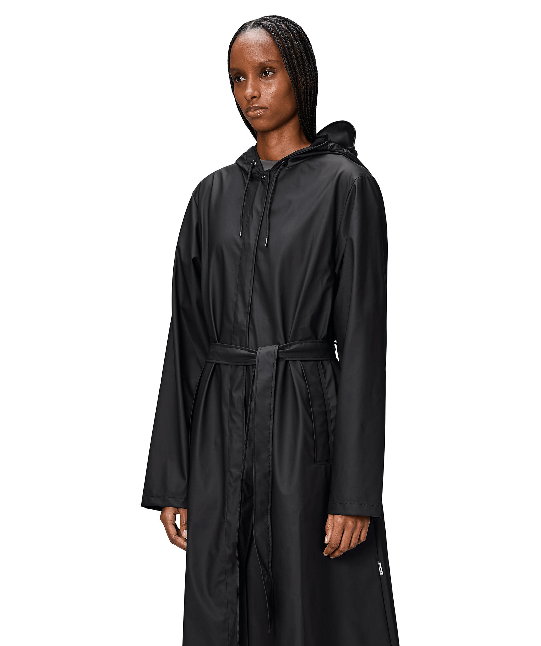 Svart regnjacka från Rains. A-Line Longer W Jacket kännetecknas av sin A-formade siluett och bälte som elegant framhäver midjan. Jackan har huva med dragsko med inbyggd keps, sidfickor, dolda tryckknappar för stängning och justerbara ärmslut. Tillverkad i Rains signaturtyg av PU.