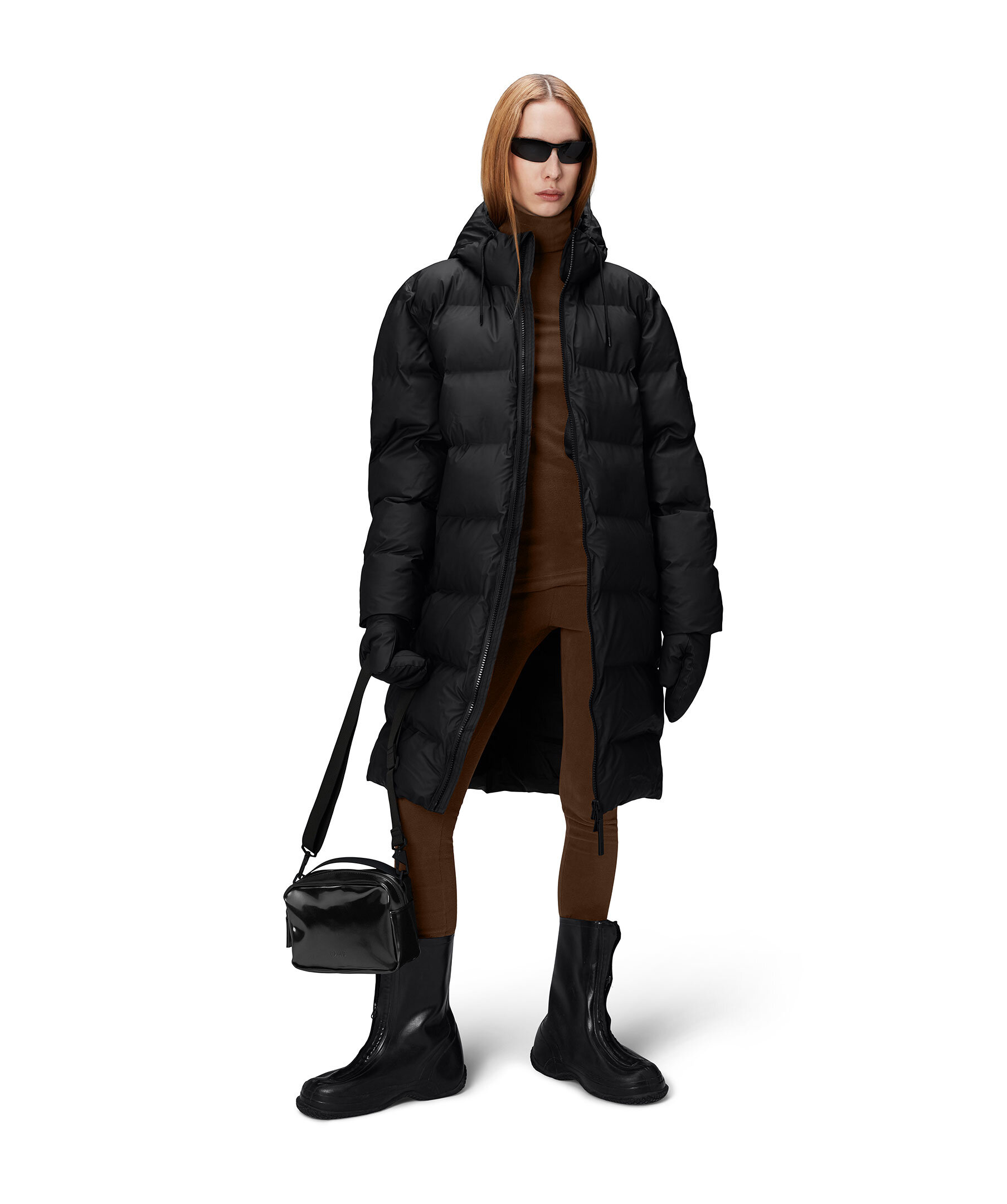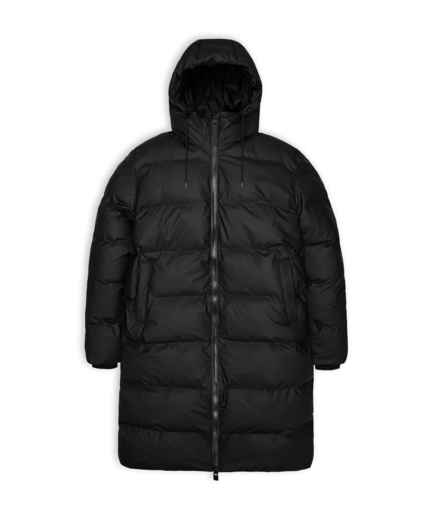 Svart längre pufferjacka från Rains. Jackan stängs med tvåvägs dragkedja framtill och har dragsko i huvan, två fleecefodrade sidfickor, en invändig bröstficka med dragkedja samt är designad i Rains signaturtyg av PU.