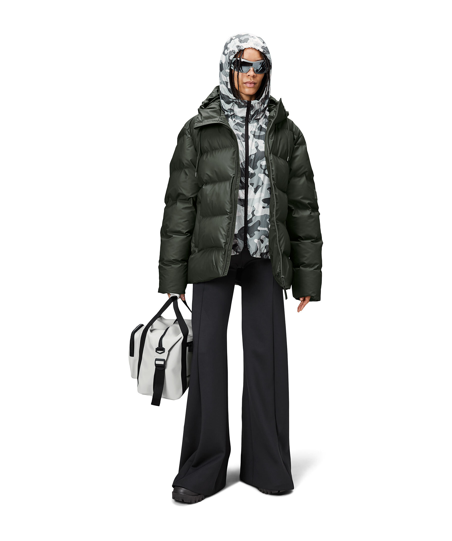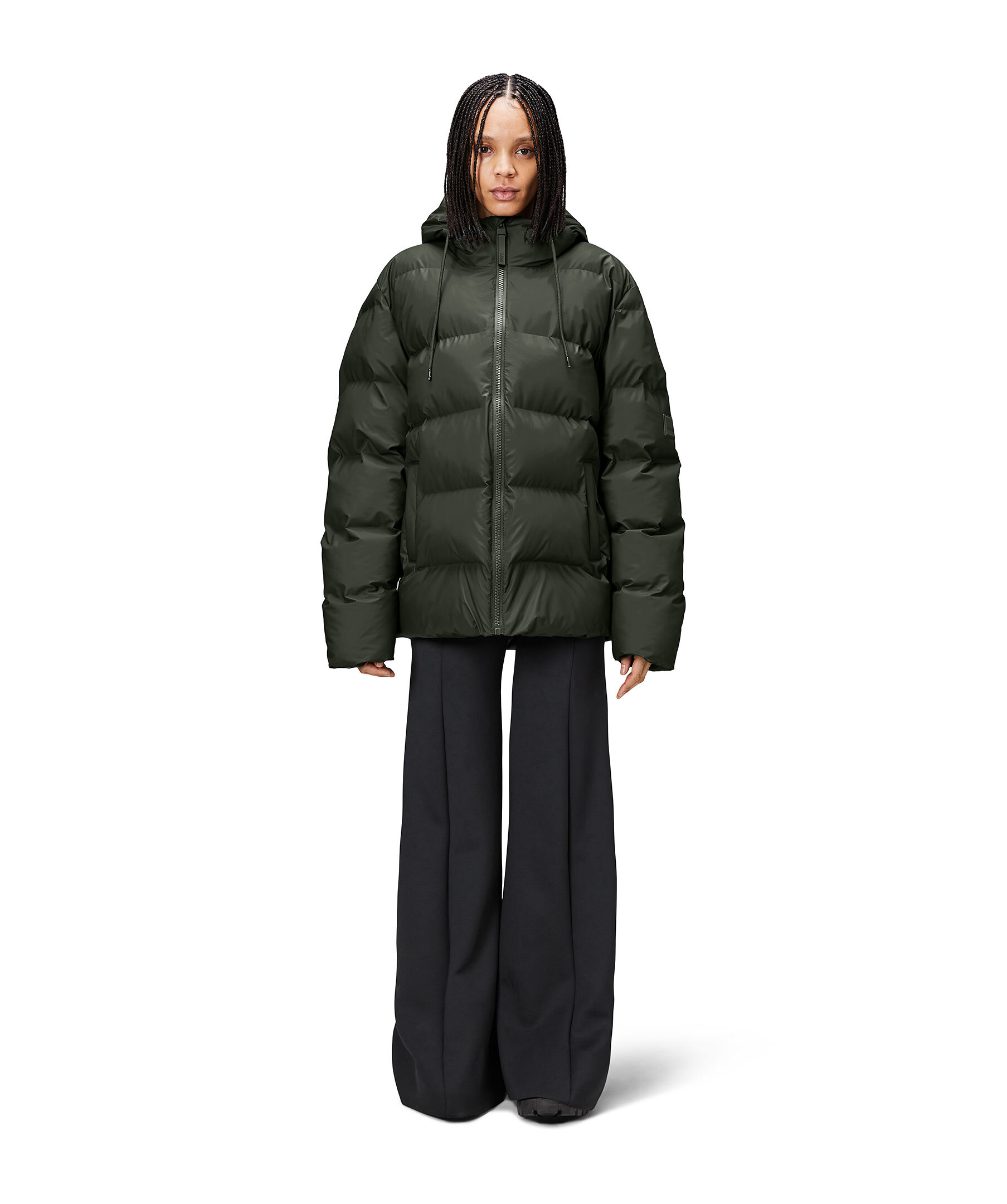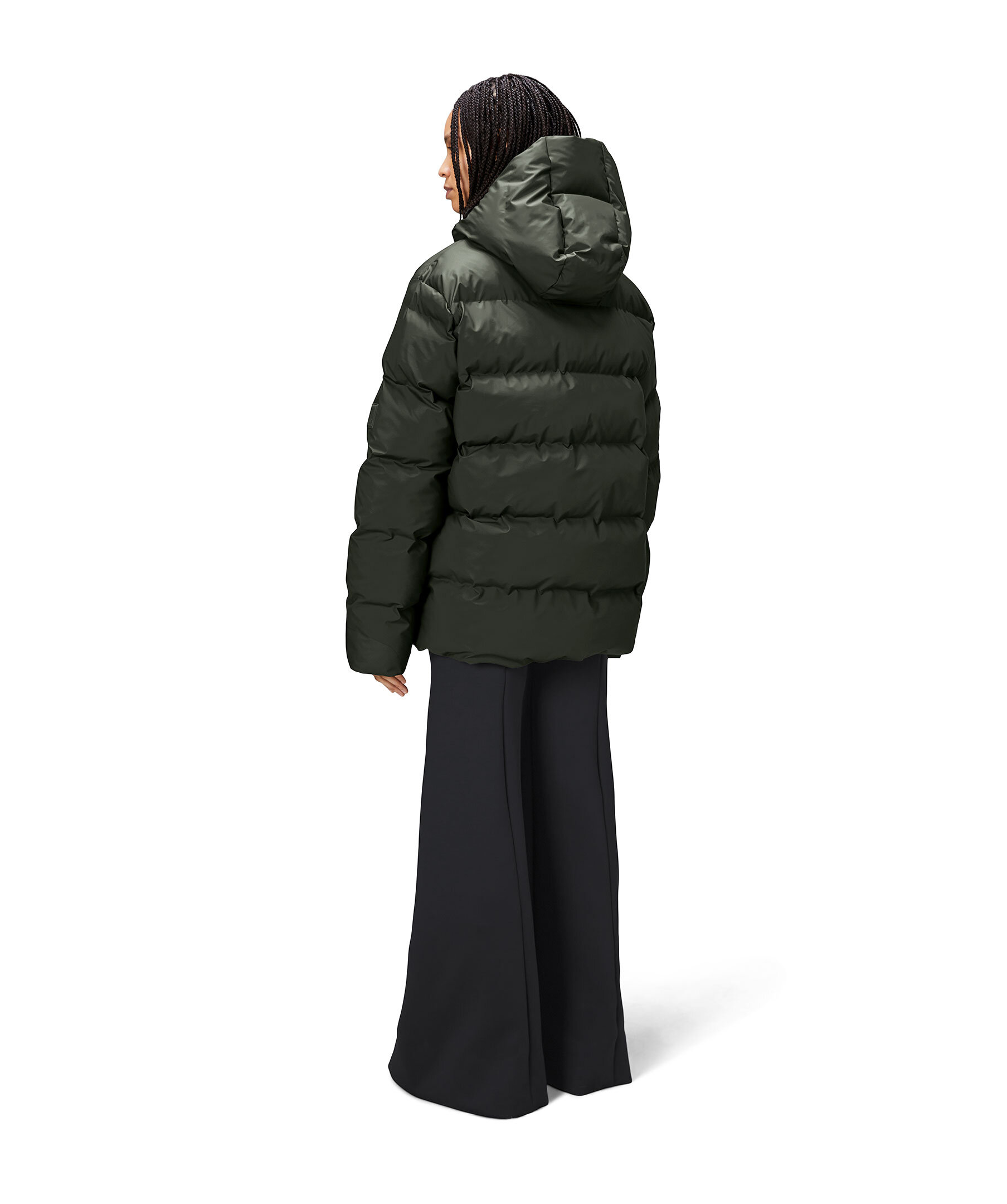 Mörkgrön Puffer jacka från Rains. En vattentät vinterjacka med en ren, lättburen puffer-estetik. Som en del av Alta Puffer-serien kännetecknas plagget av en raffinerad silhuett, breda signaturkammare och avskalade detaljer. Den här lyxiga puffern i vattentätt signaturtyg som andas bygger på fjäderlös kammarteknologi som håller dig varm och bekväm i de kallaste vädren. Jackan har gummerat tvåvägsblixtlås, ultraljudsgjutna sömmar, rymliga fleecefodrade sidfickor, dolda stormmanschetter och inre bröstficka. Silhuetten har fodrad huva med dragsko.