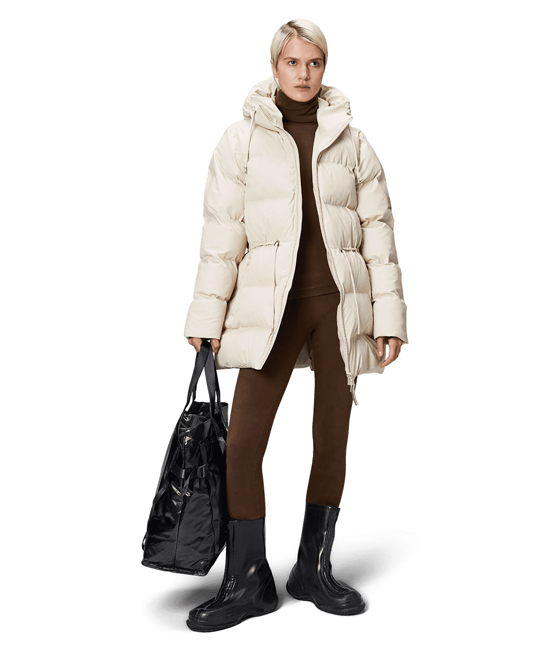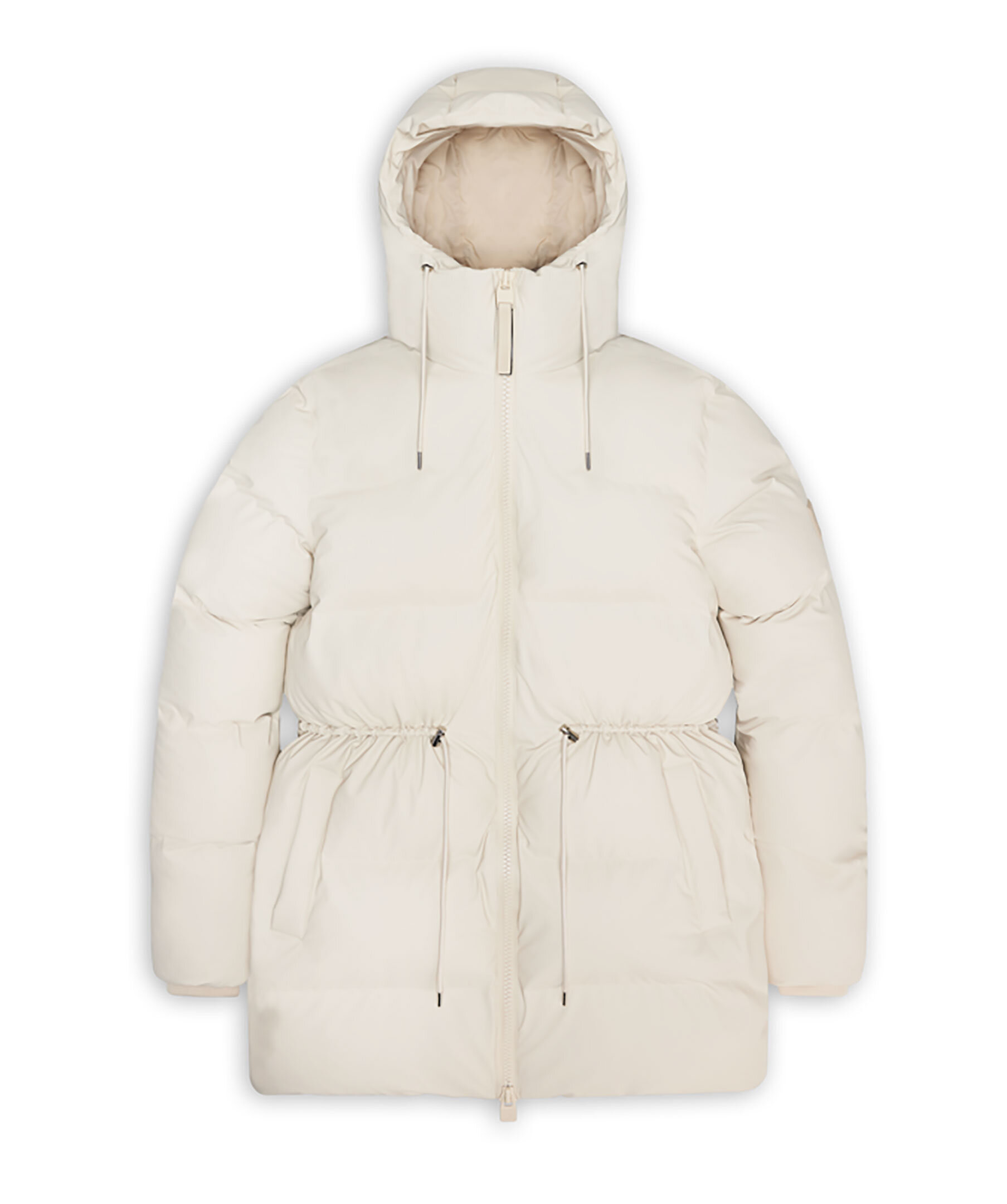 Krämvit pufferjacka från Rains. Jackan stängs med tvåvägs dragkedja framtill och har dragsko i huvan, två fleecefodrade sidfickor, en invändig bröstficka med dragkedja samt är designad i Rains signaturtyg av PU. Dragsko i midjan för en mer formad siluett. Tillverkad av polyester.