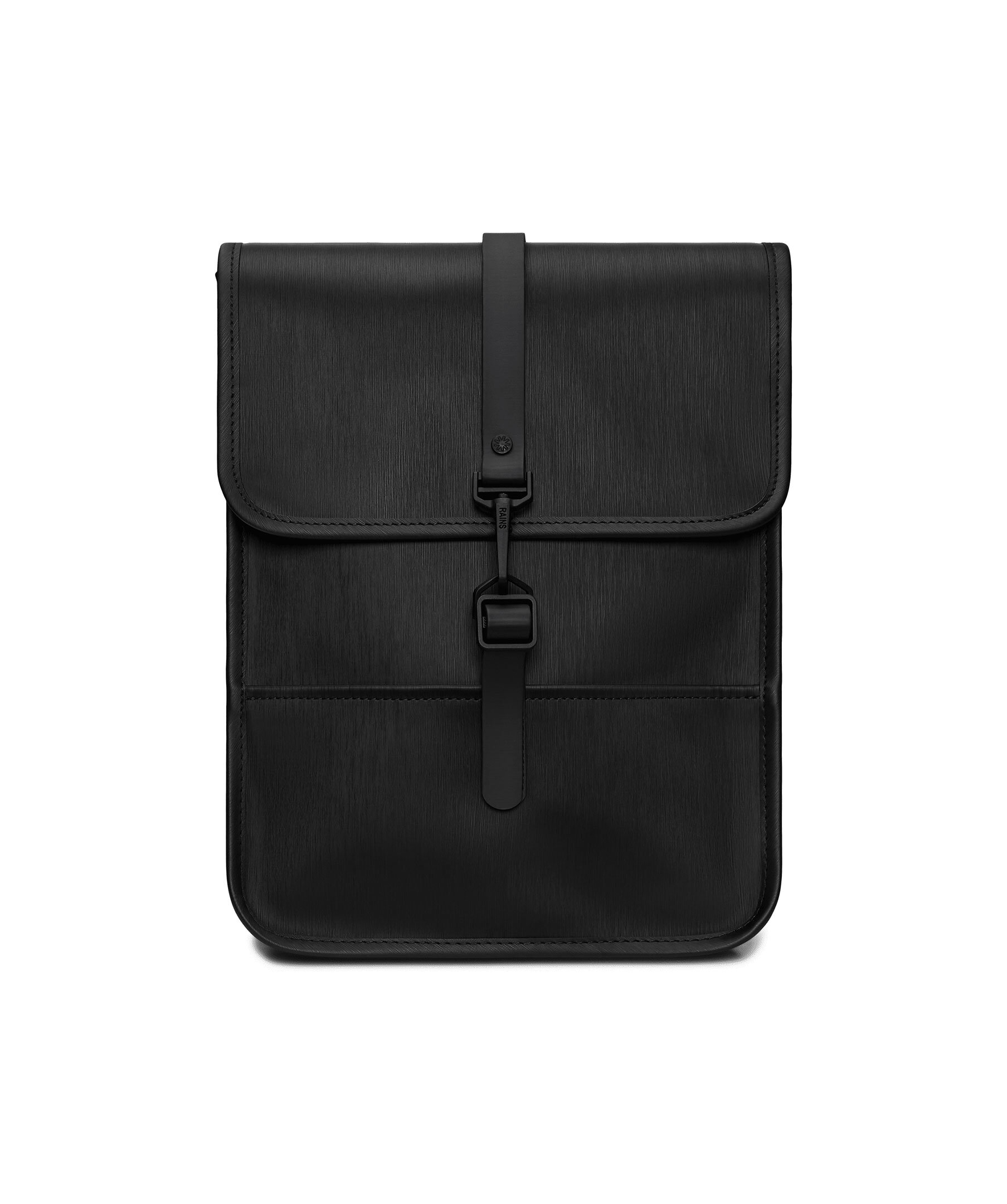 Svart, liten ryggsäck med subtil textur från Rains. Designen kännetecknas av sin fyrkantiga form och flik med magnetsnäpplås. Väskan har en invändig laptopficka som passar 11-tums bärbar dator med fodral och ett rymligt huvudfack. Mått: H35 x D7,5 x B27,5 cm. Rymmer 7L.