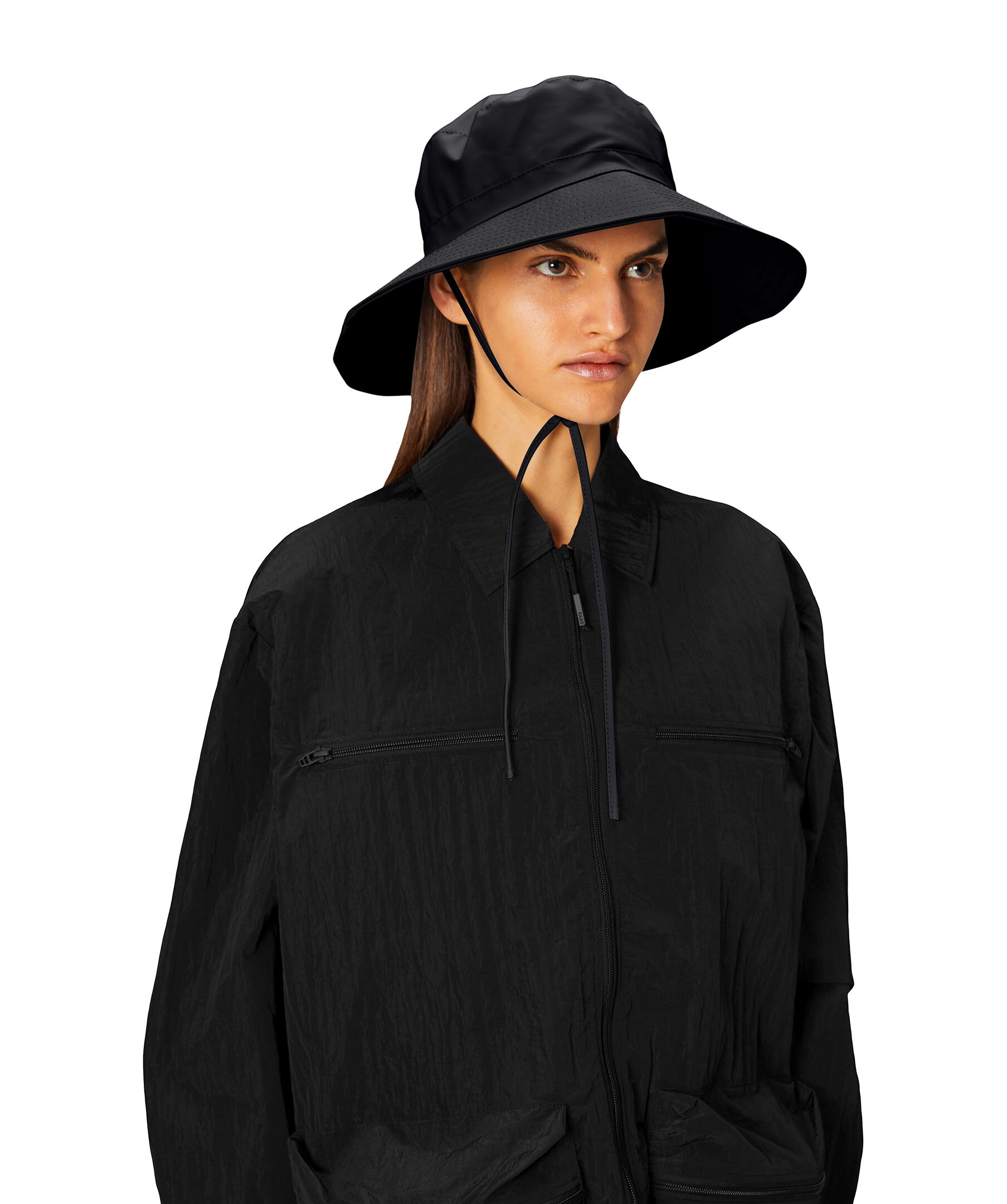 Svart vattenavstötande bucket hat från Rains. Silhuetten har ett brett brätte och ett snöre i matchande färg som knyts under hakan för en säker passform. Modellen har ett mjukt tygfoder som andas för bättre komfort. Boonie Hat tillverkas i Rains vattentäta PU-signaturtyg, som designats för mjuk känsla.