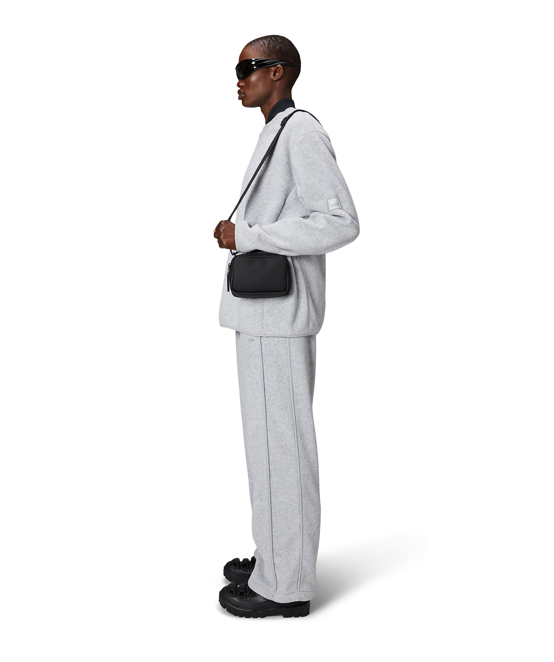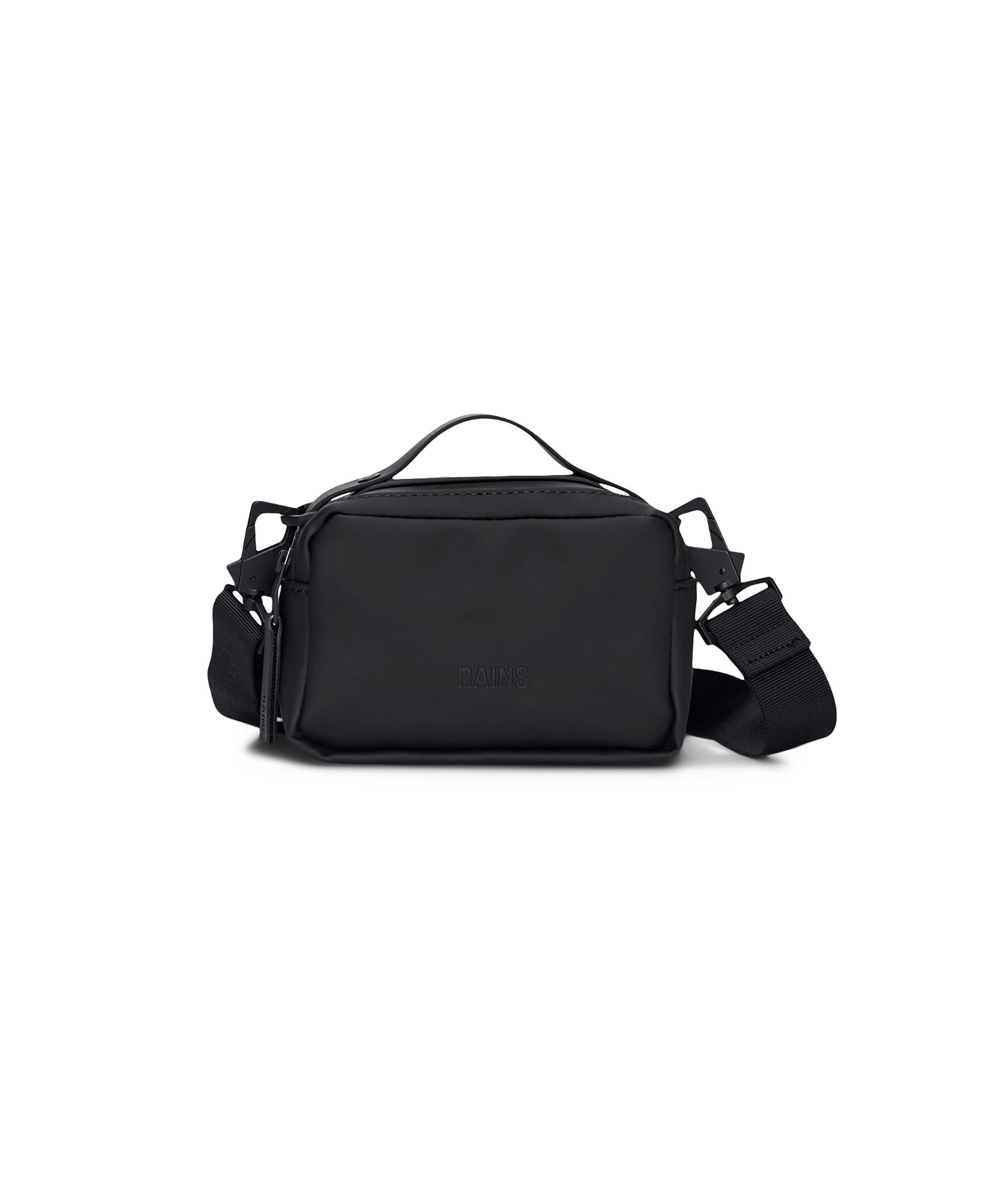 Svart liten Vattentät väska från Rains. Kan bäras över axeln eller tvärs över kroppen. Huvudfacket stängs med dragkedja. Justerbar vävd axelrem med karbinhakar. Handtag i gummi. Embossad logotyp på väskans framsida. Väskans mått: H 11 x B 16 x D 7,5 cm. Väskan rymmer 1L.